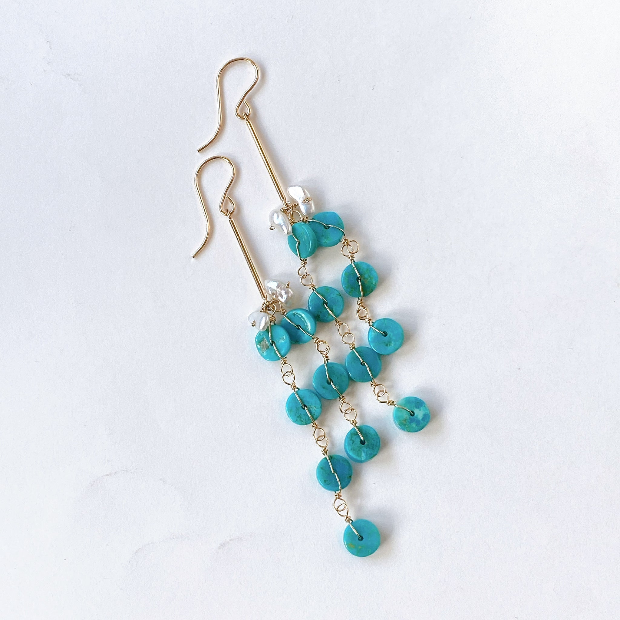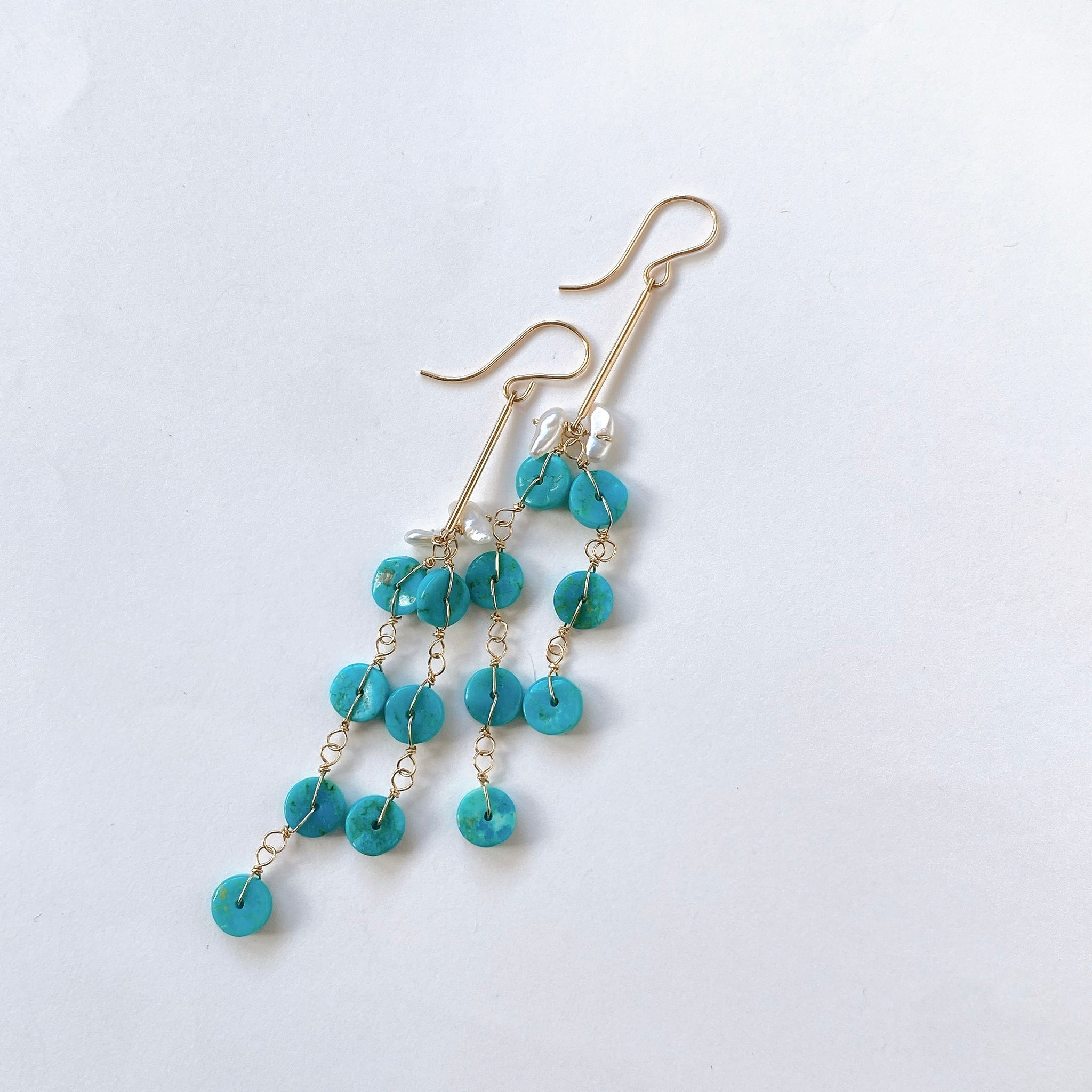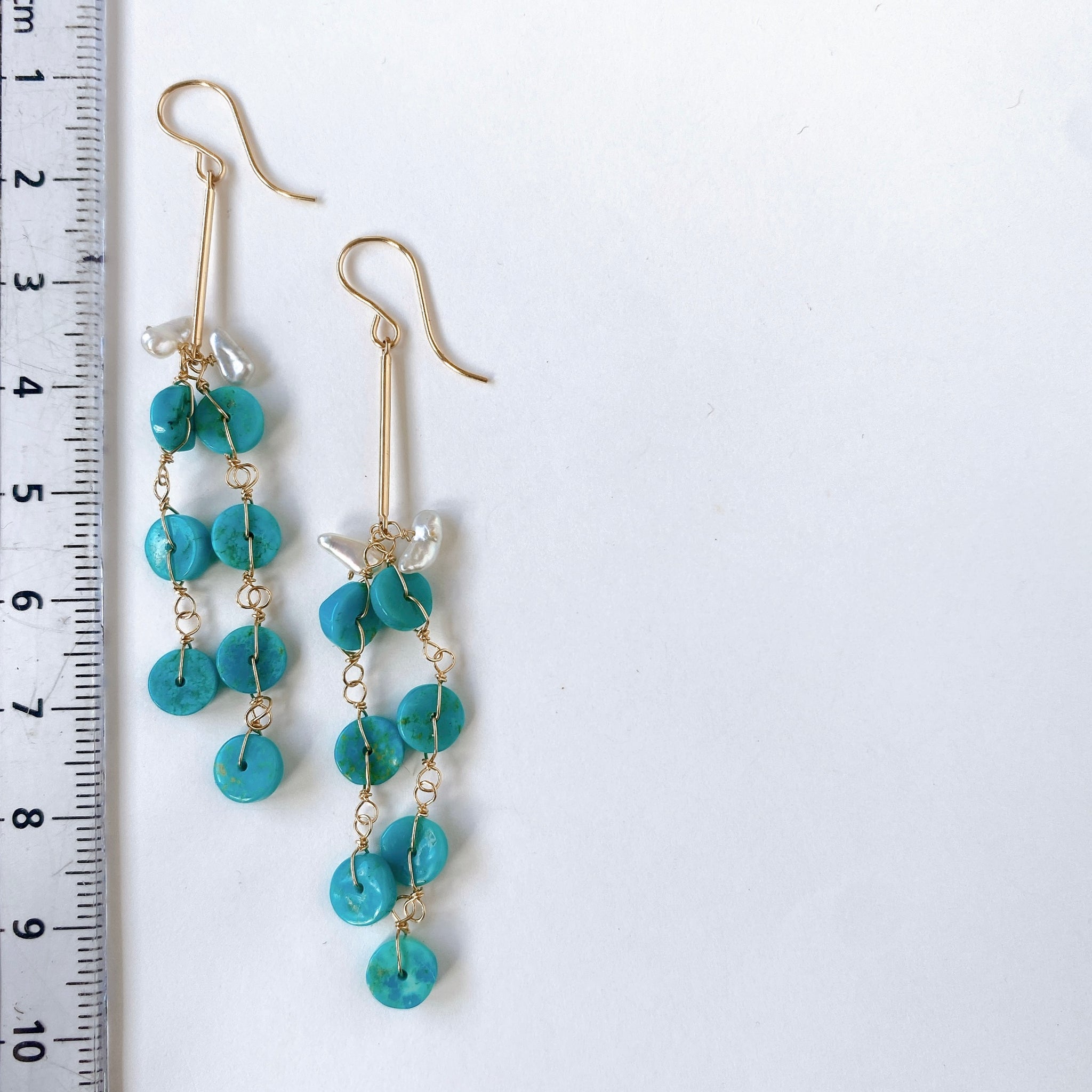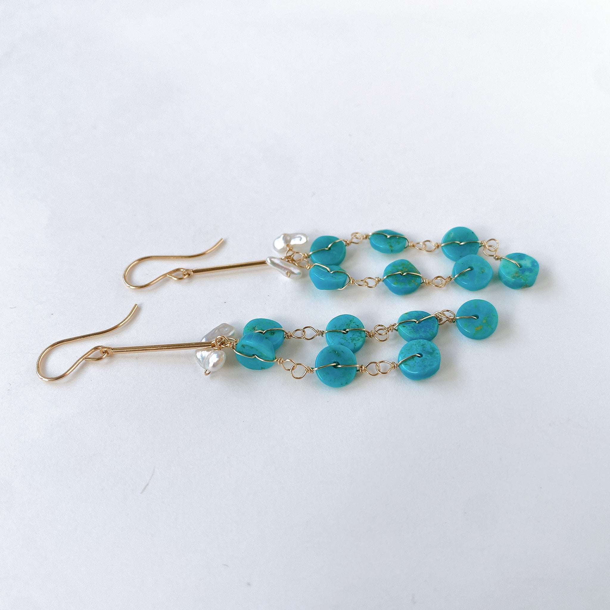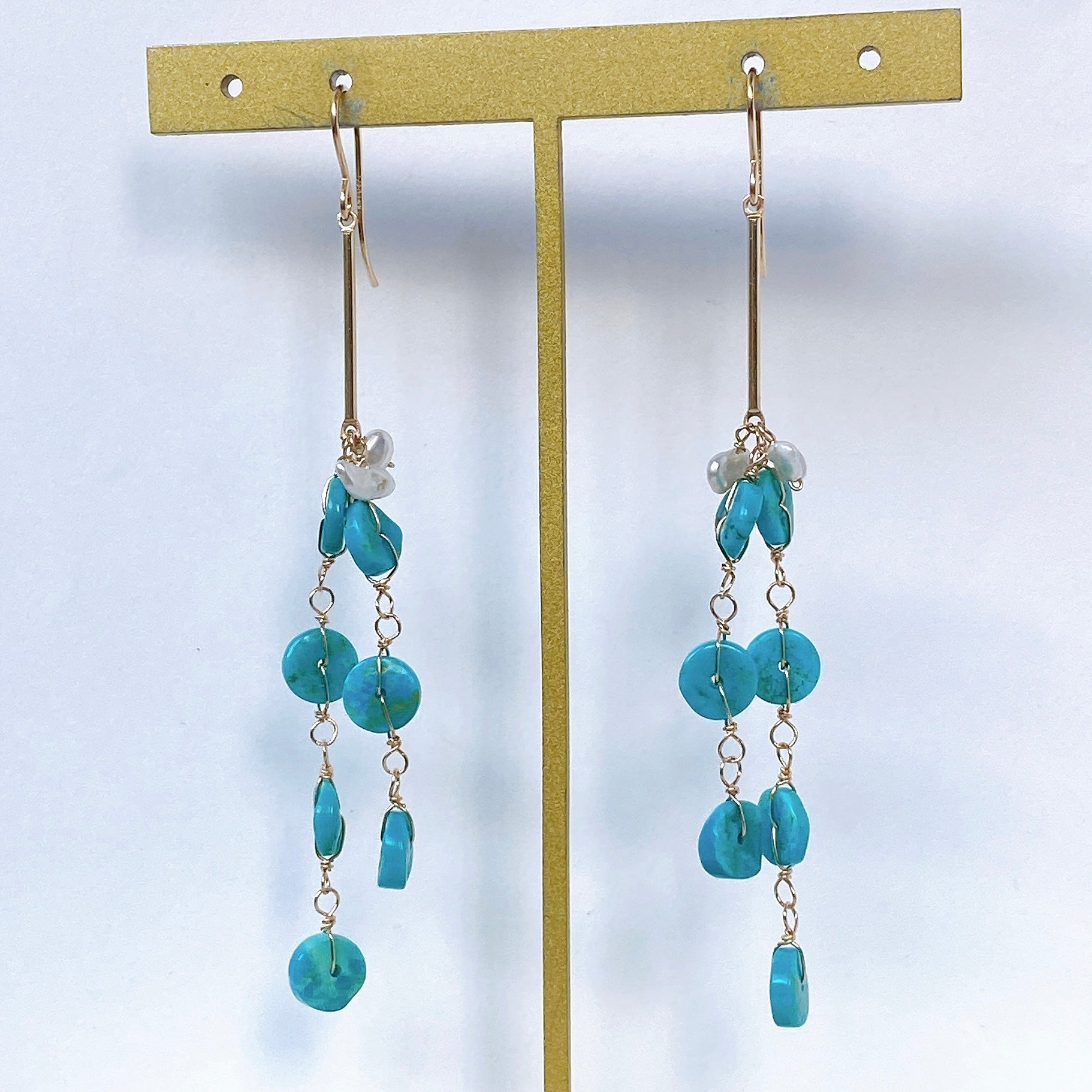 細長い形のアコヤケシパールとソノランターコイズを使ってデザインした耳飾りです。