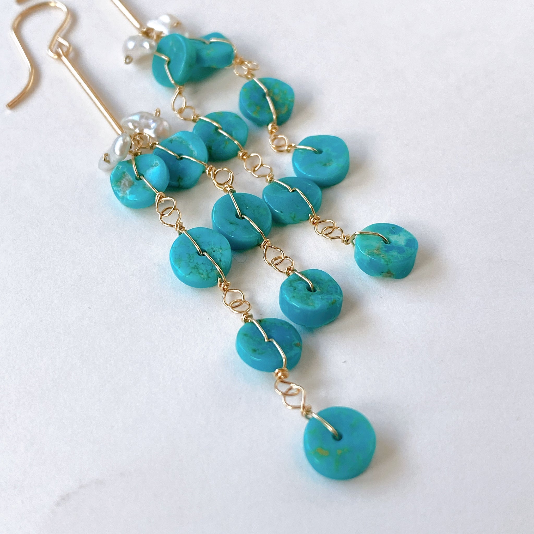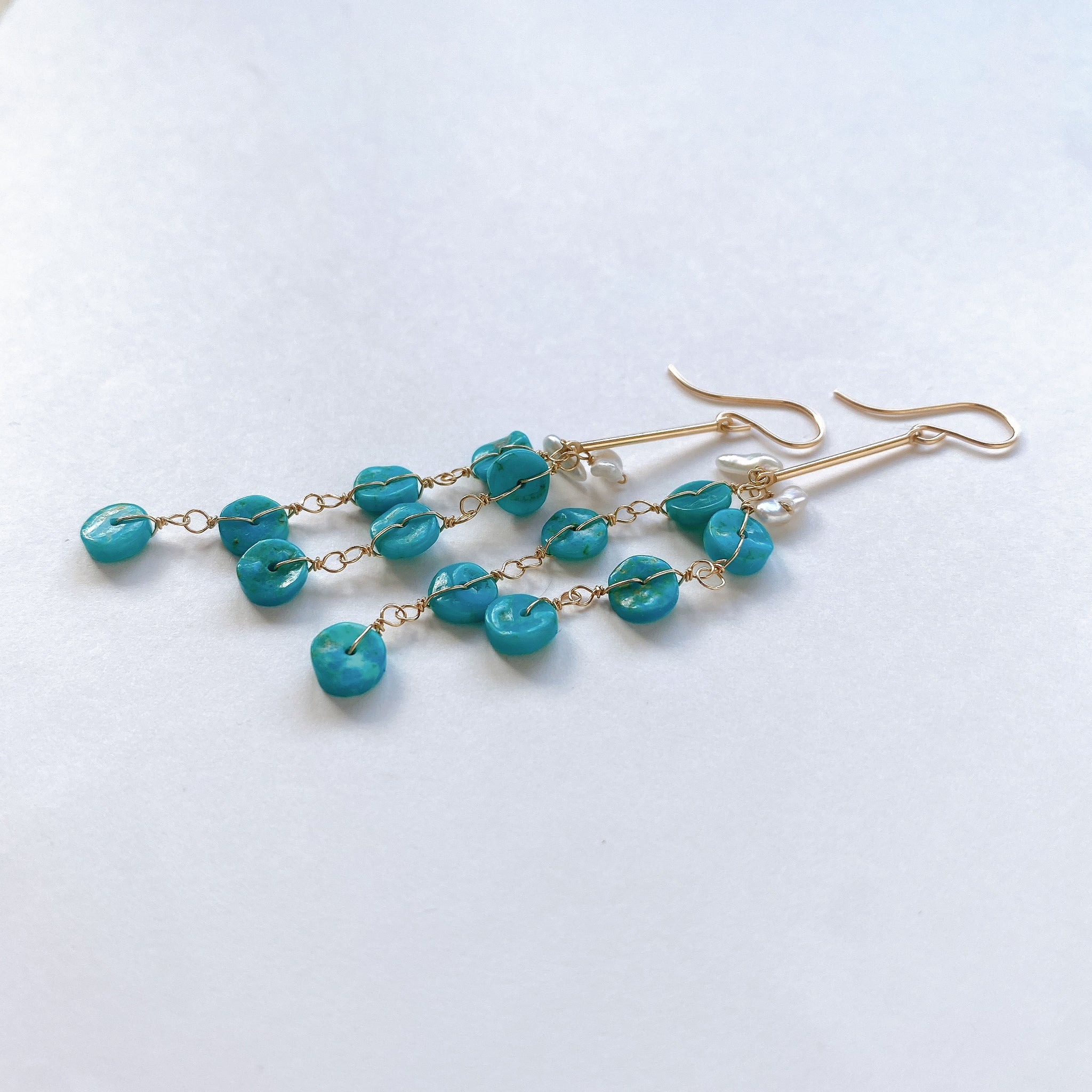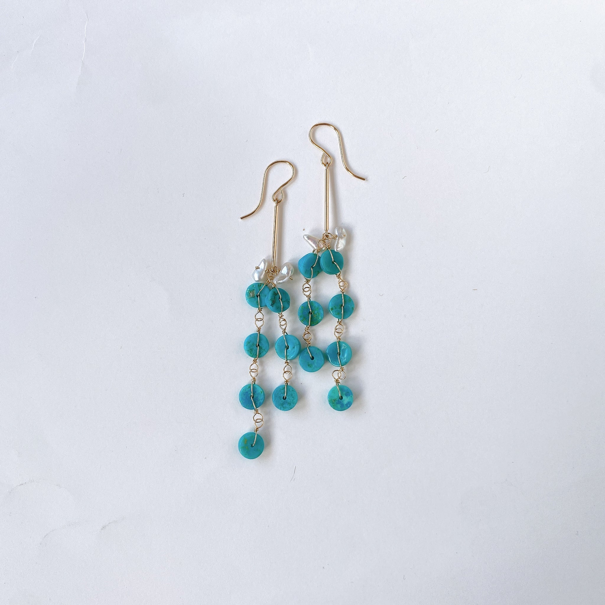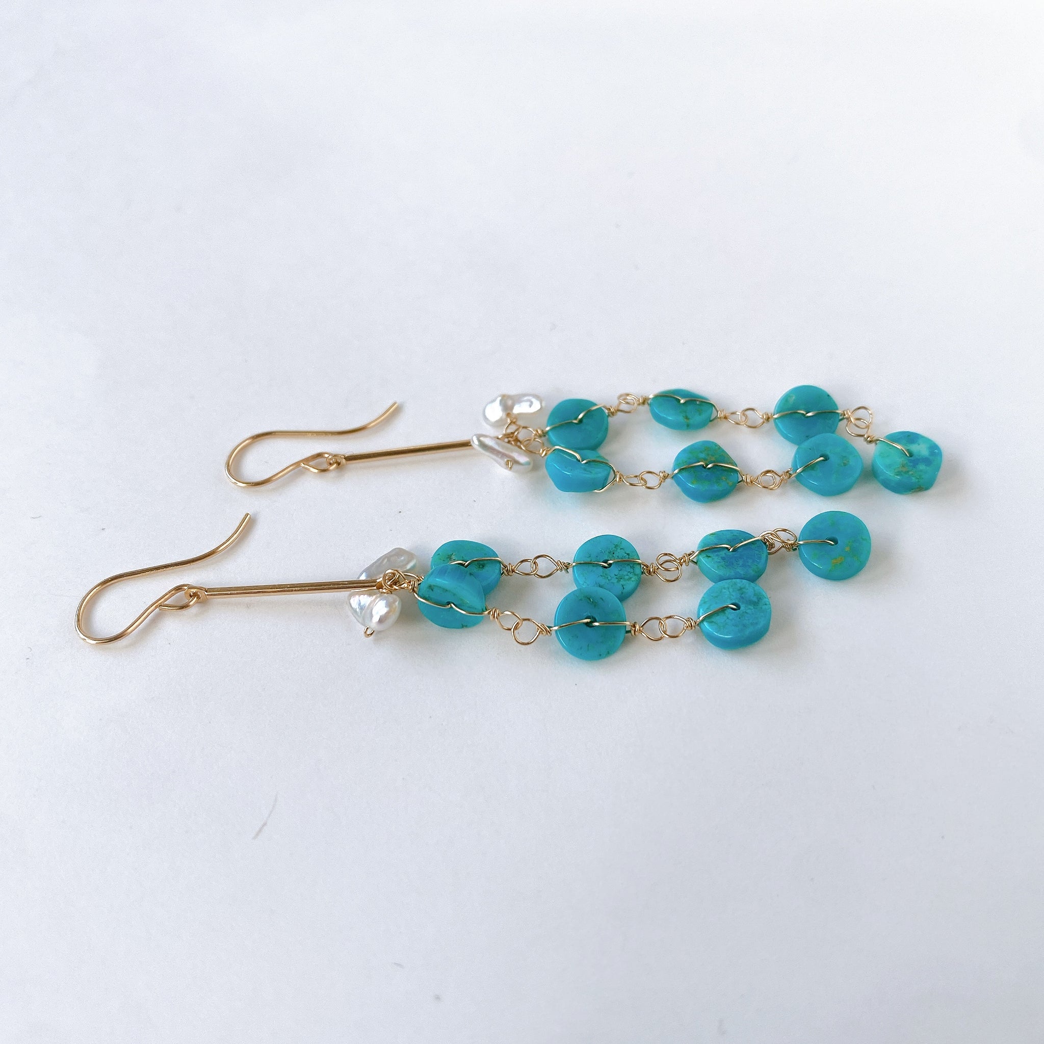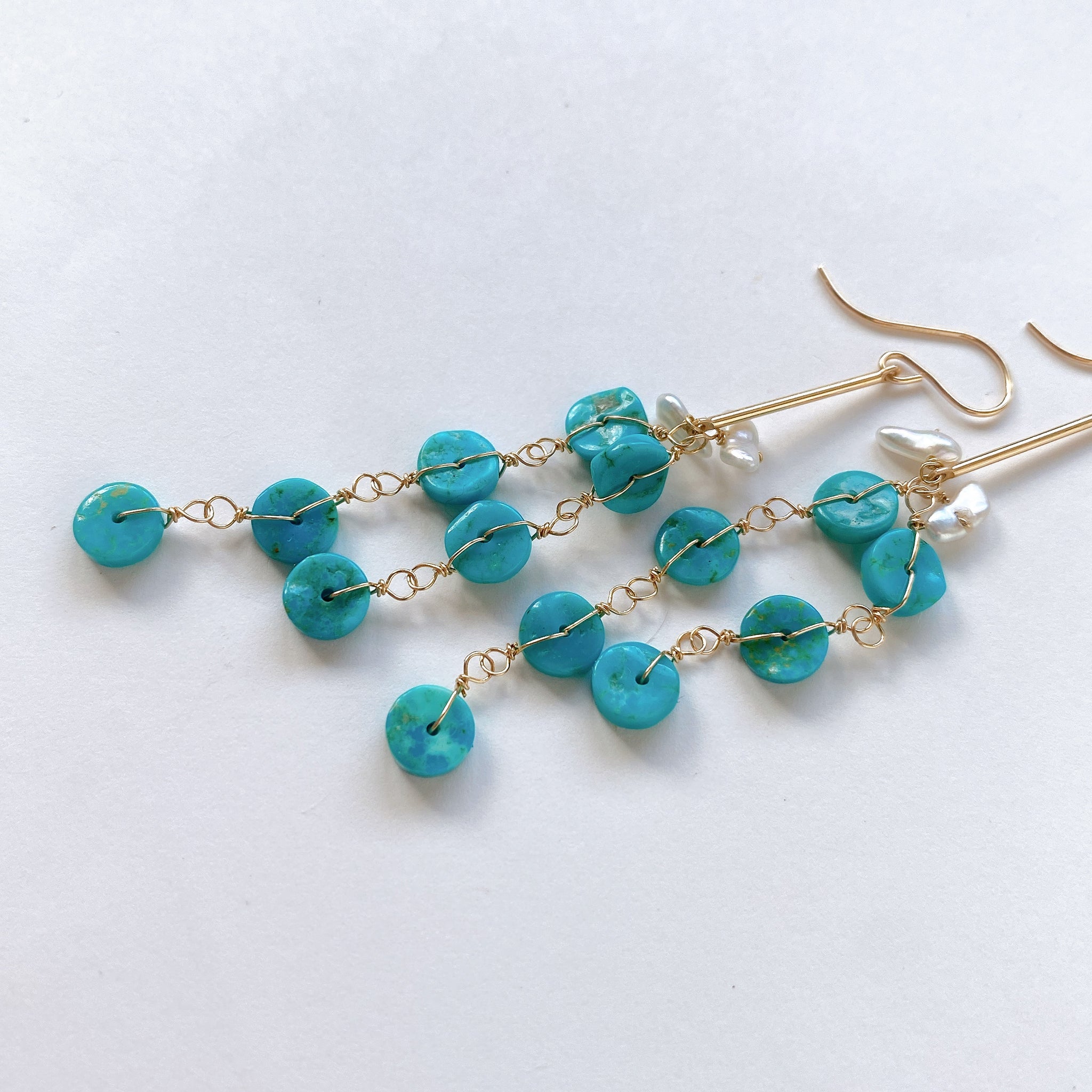 歪な円盤型のカットがカジュアルなソノランターコイズです。2連でつないだソノランターコイズに、ナチュラルなアコヤケシパールを二粒添えたロングタイプのデザインです。