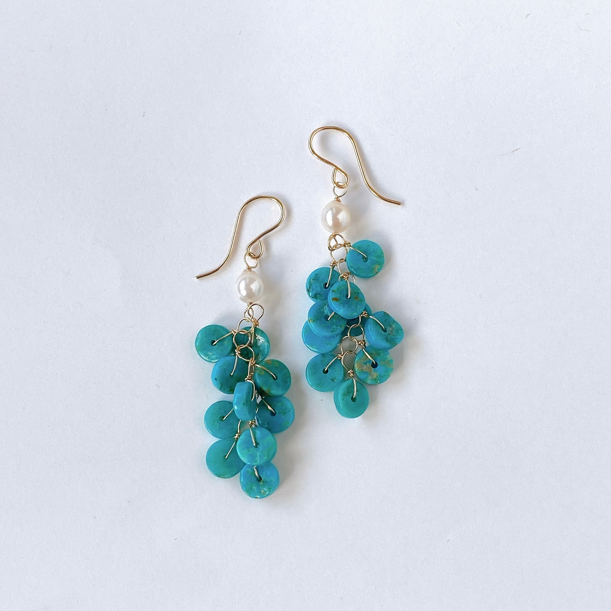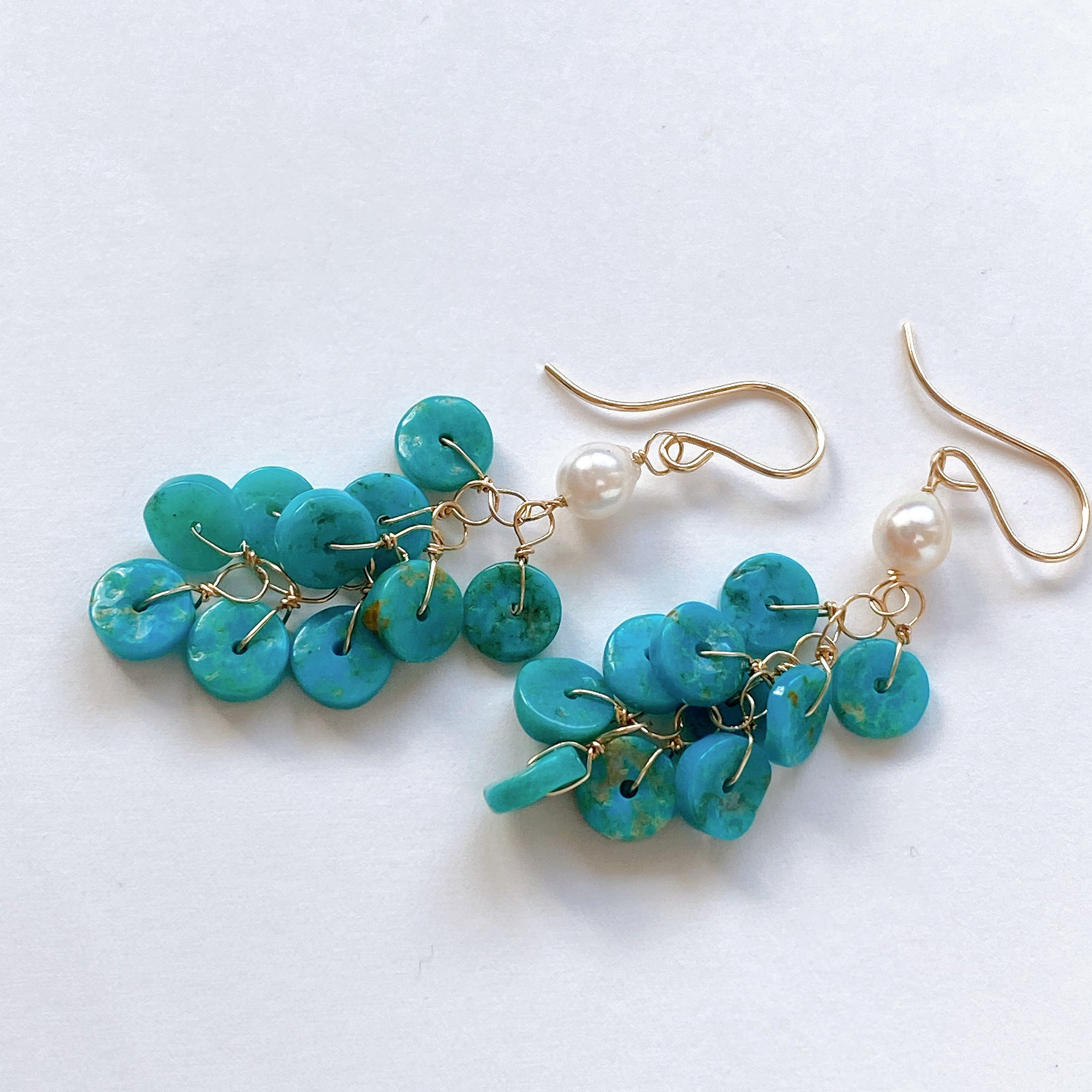 歪な円盤型のカットがカジュアルなソノランターコイズです。贅沢にしゃらしゃらとつないだボリューミーなピアスです。