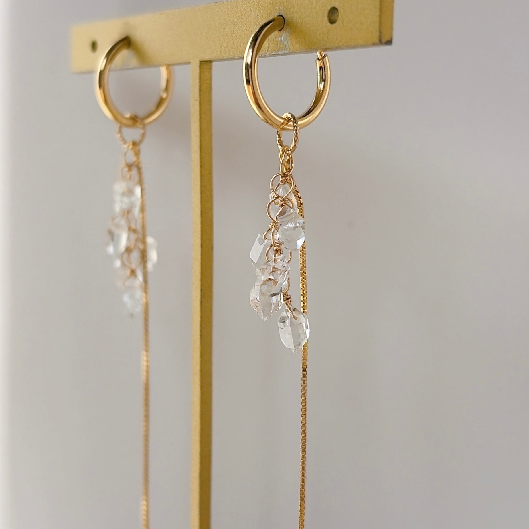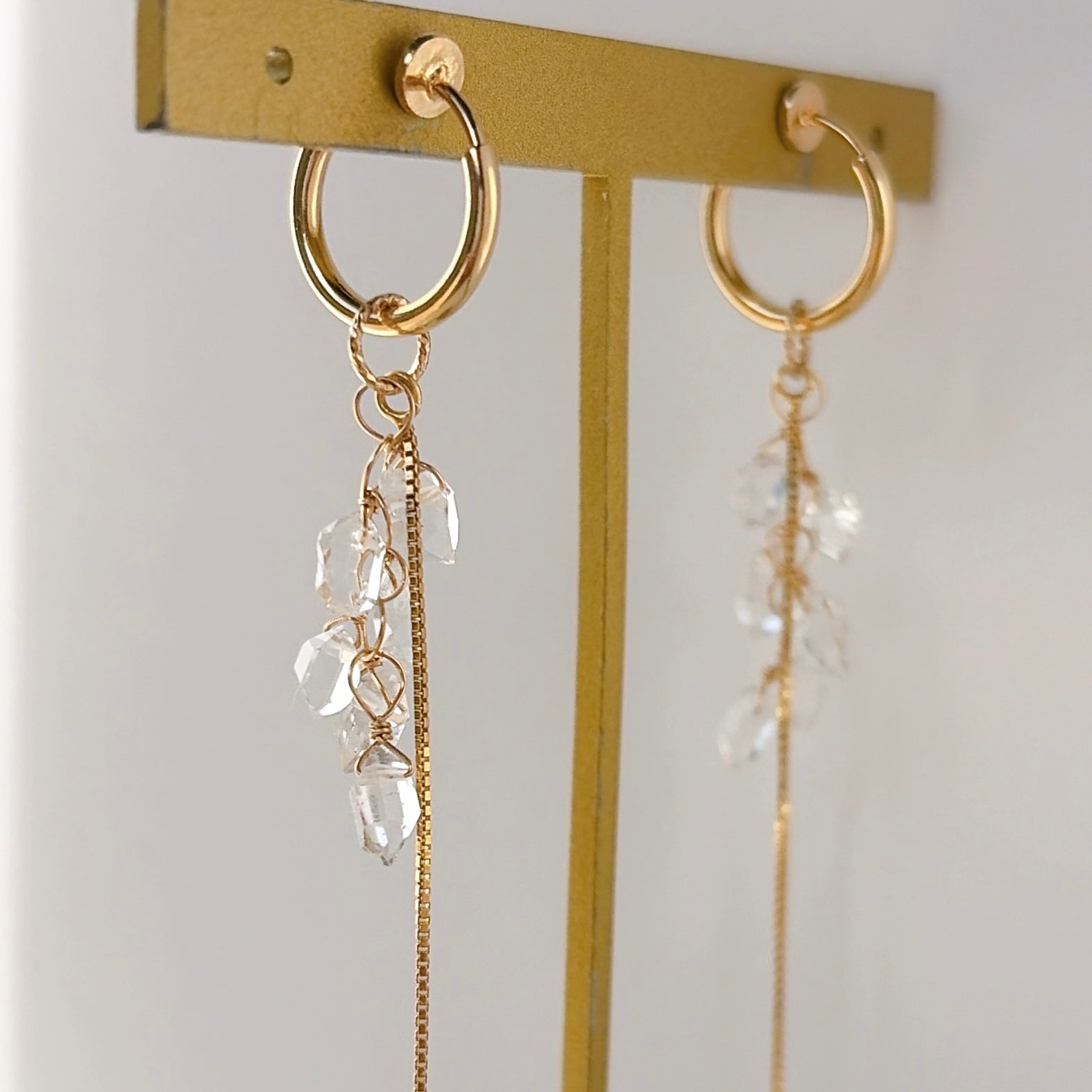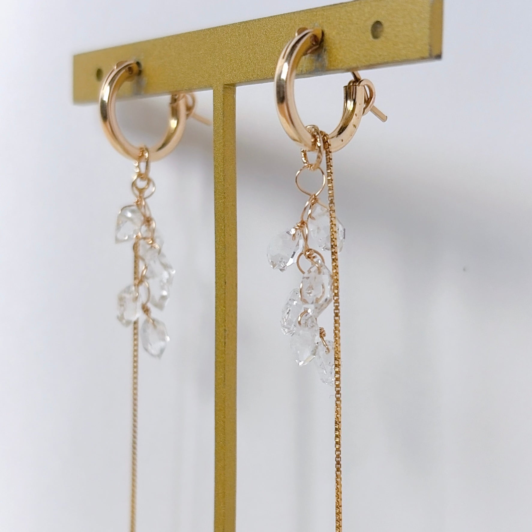 こちらはアメリカンピアスとしてお仕立てしておりますが、チェーンとハーキマークォーツの間のリング(直径約5mm)をフープピアスやフープイヤリングに通してチャームとしてお使いいただくこともできる2wayタイプです。