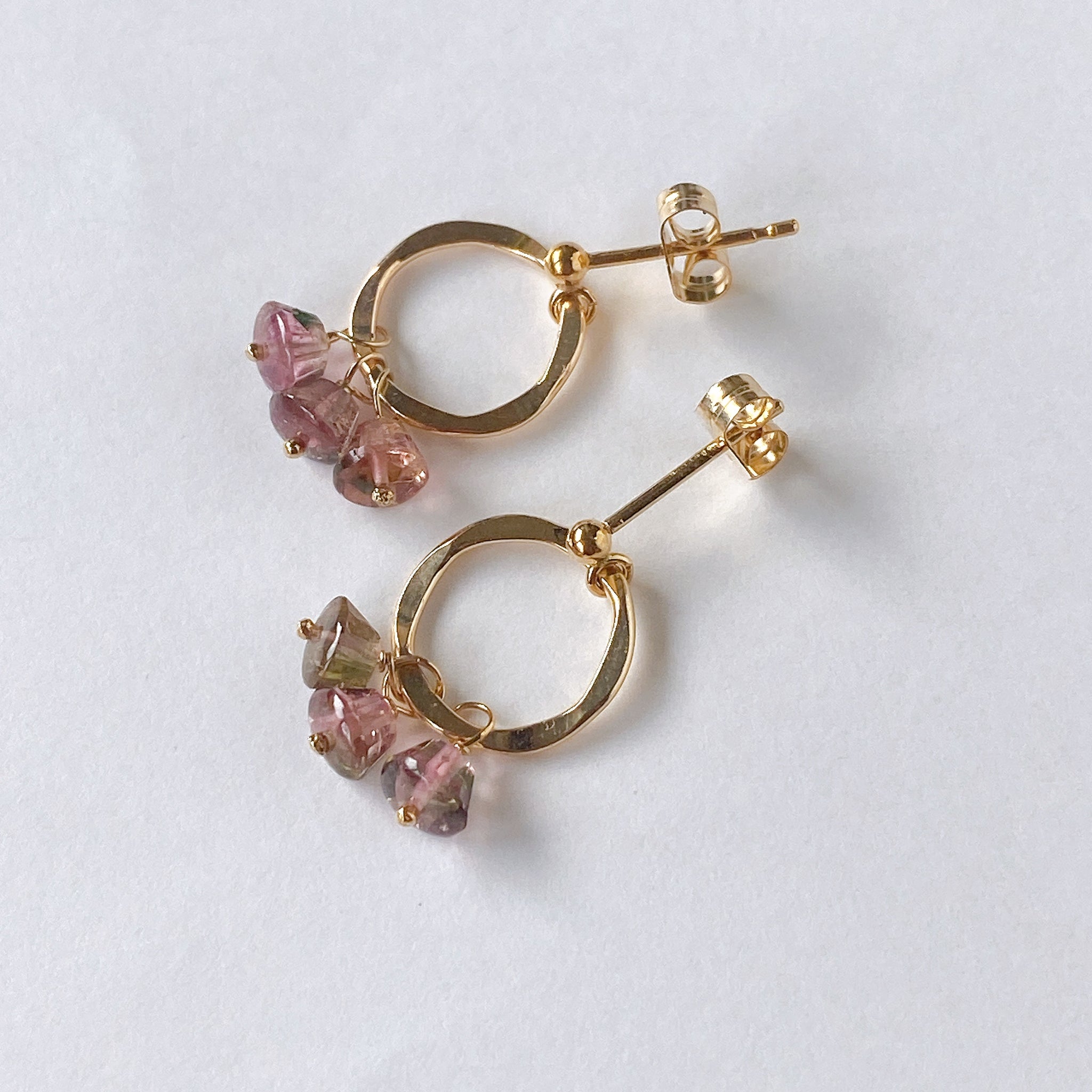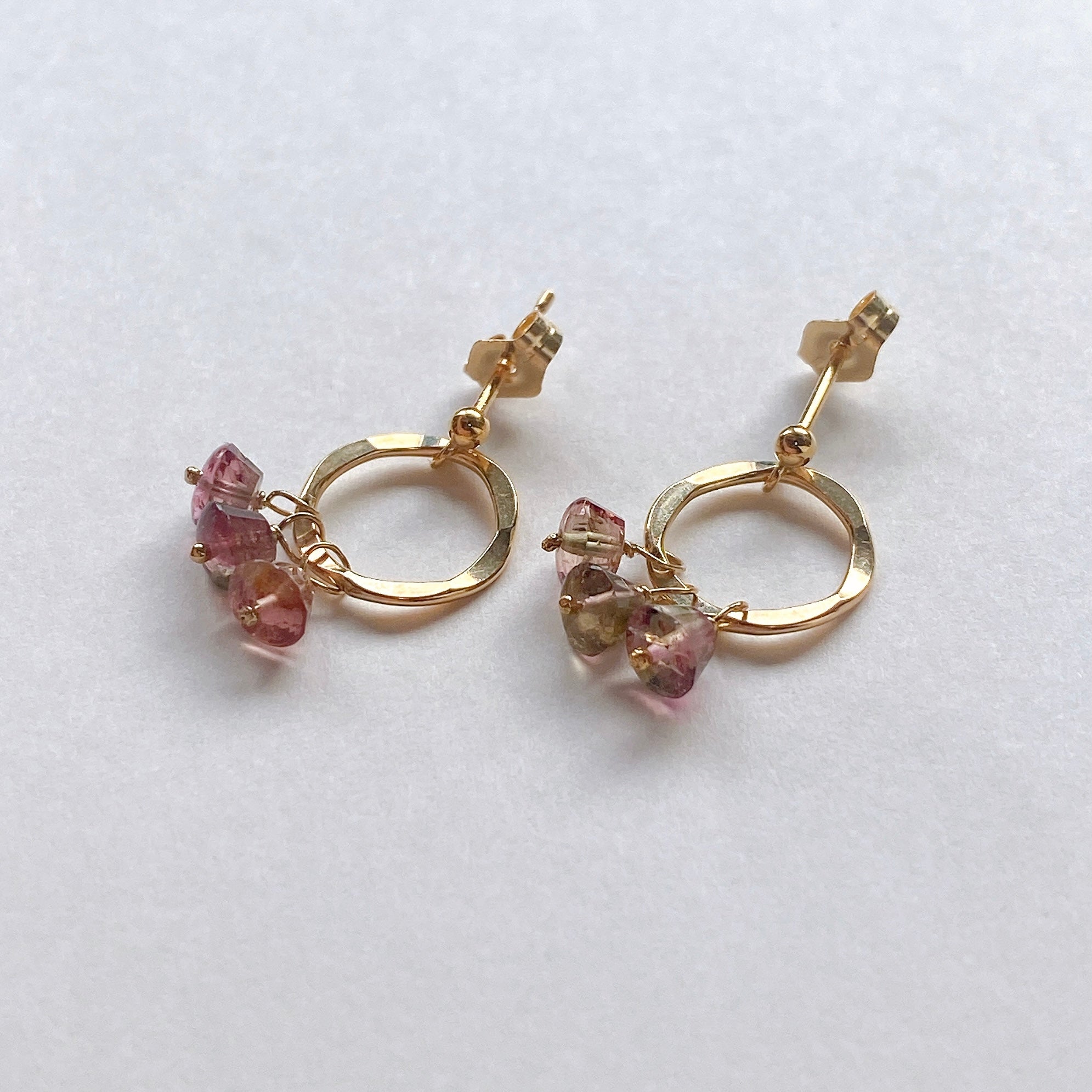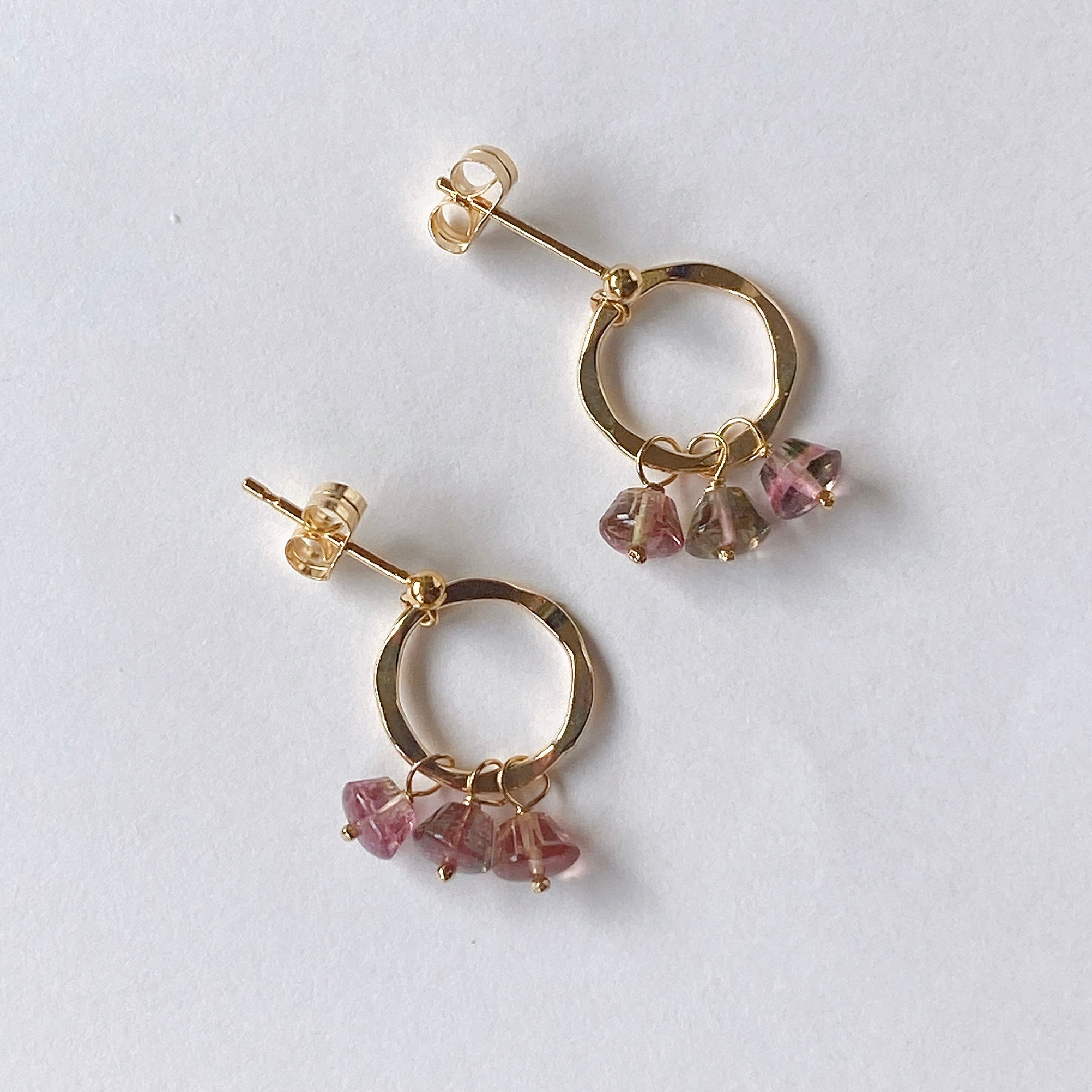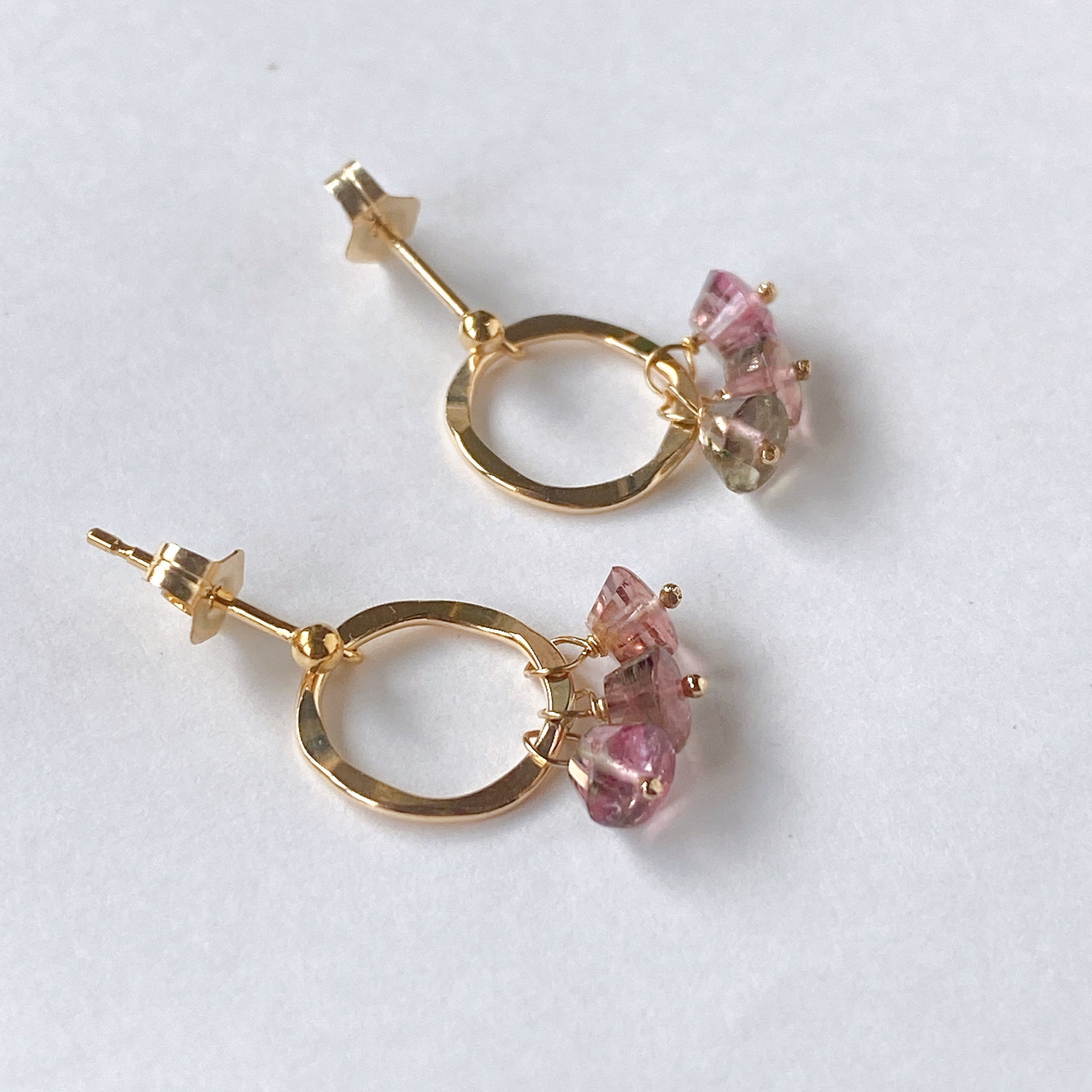 プリンのようなカットのトルマリンを片耳3粒ずつ、14kgf製のリングパーツに留めたポストピアスです。