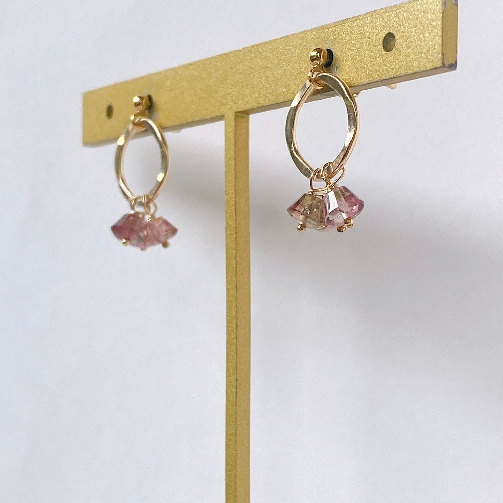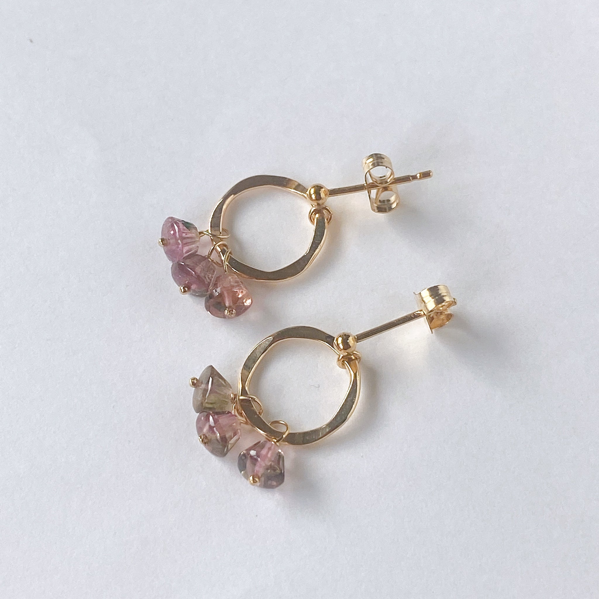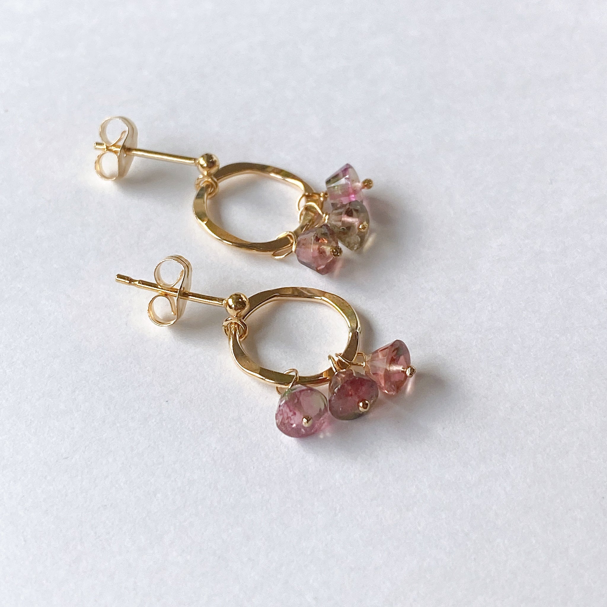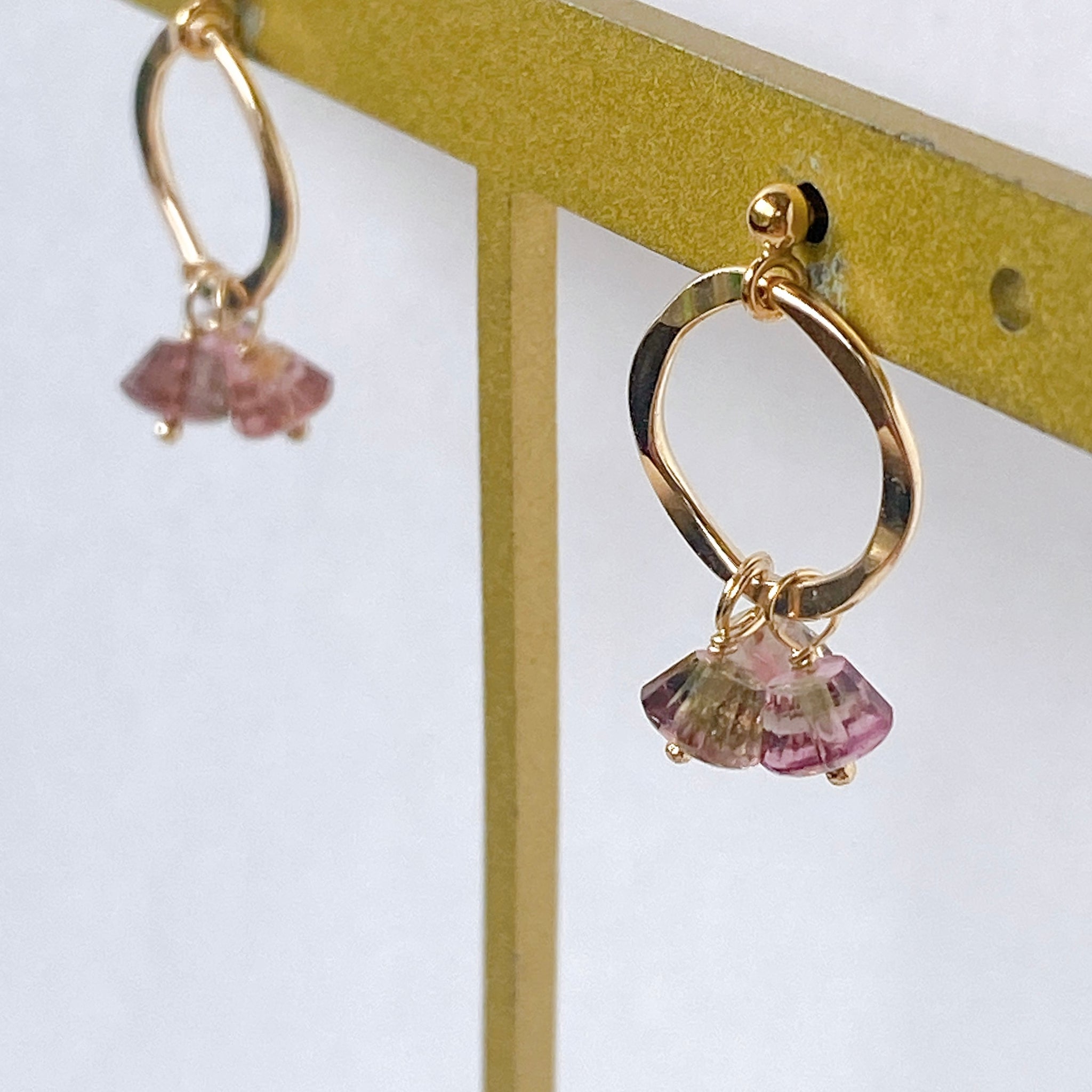 プリンのようなカットのトルマリンを片耳3粒ずつ、14kgf製のリングパーツに留めたポストピアスです。