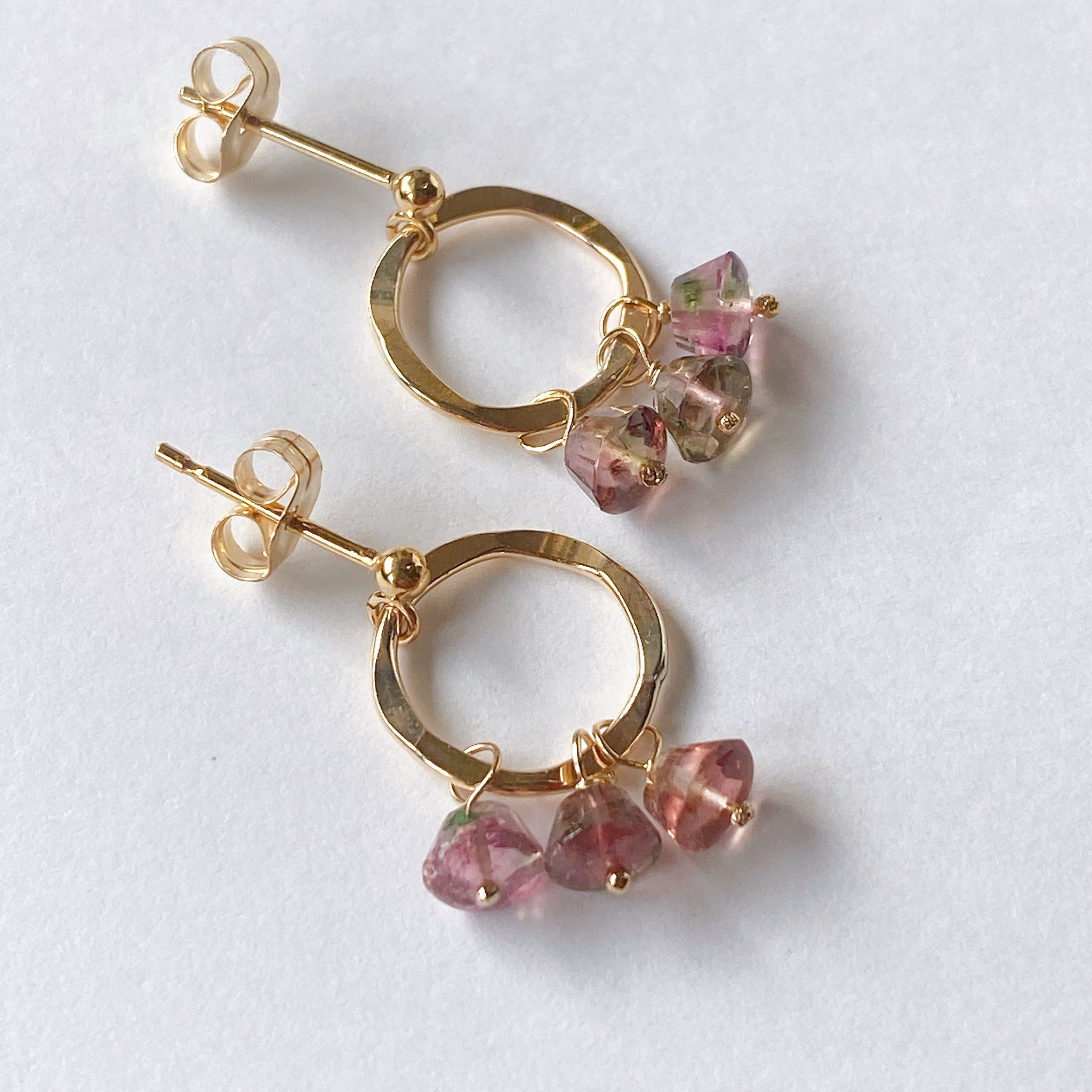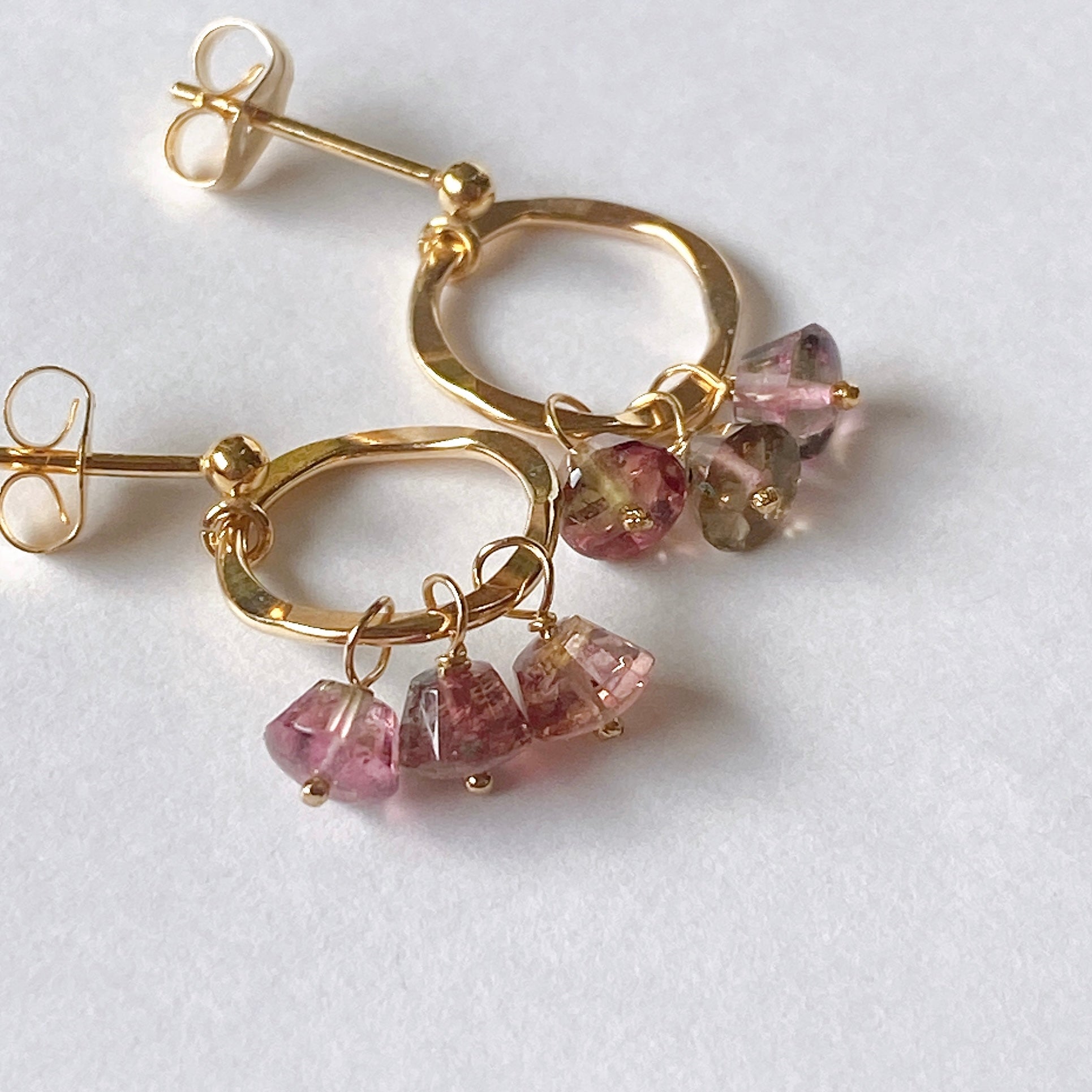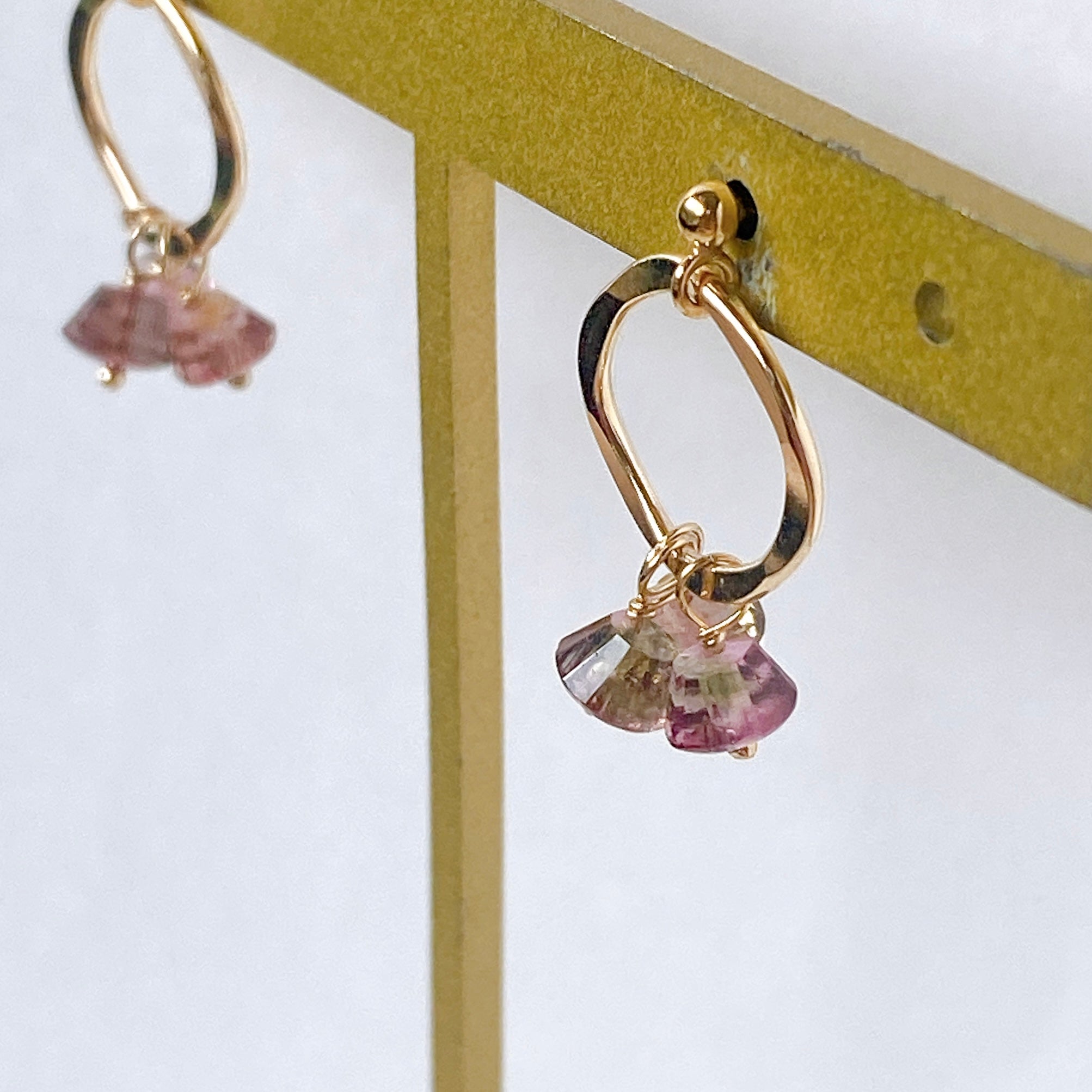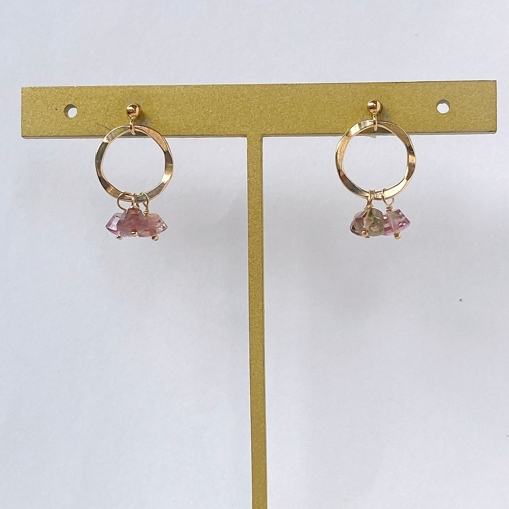 プリンのようなカットのトルマリンを片耳3粒ずつ、14kgf製のリングパーツに留めたポストピアスです。