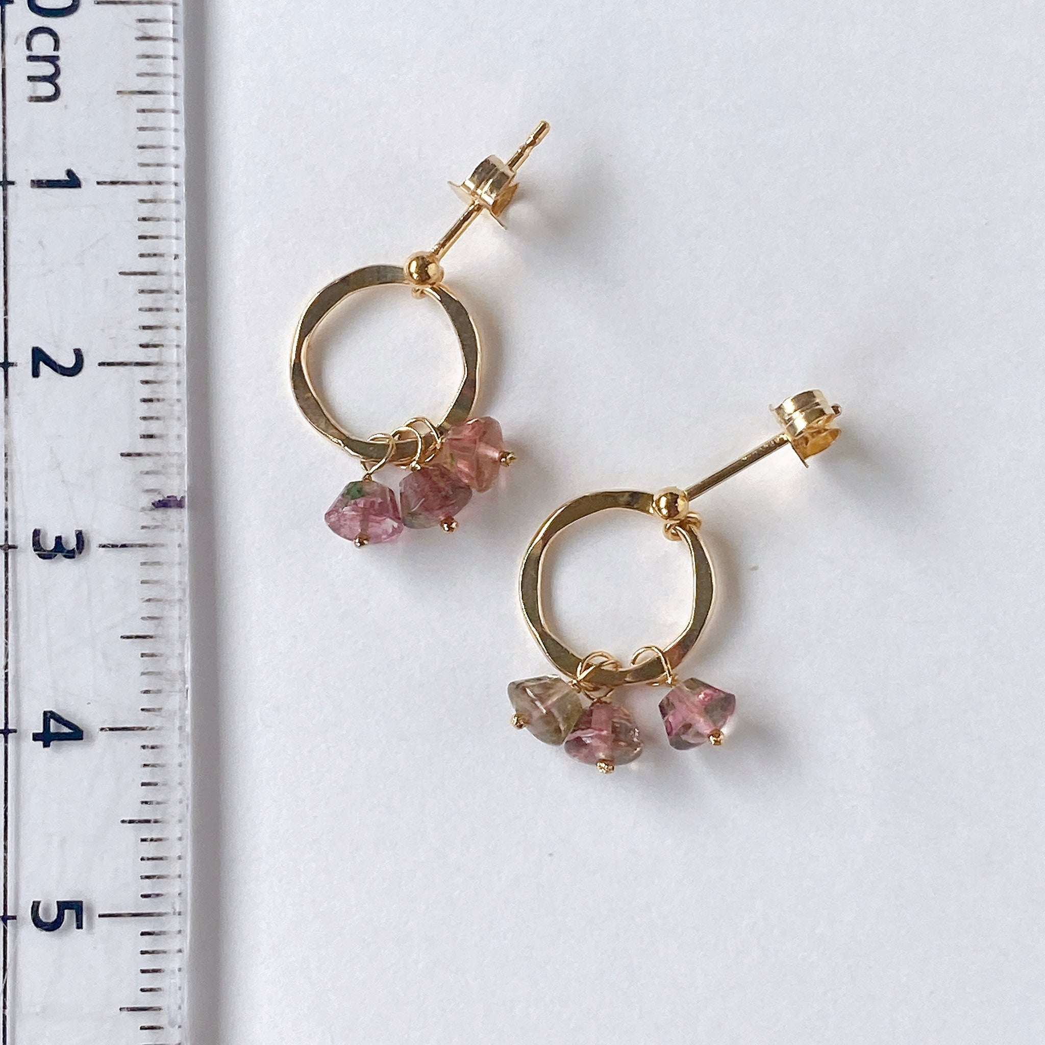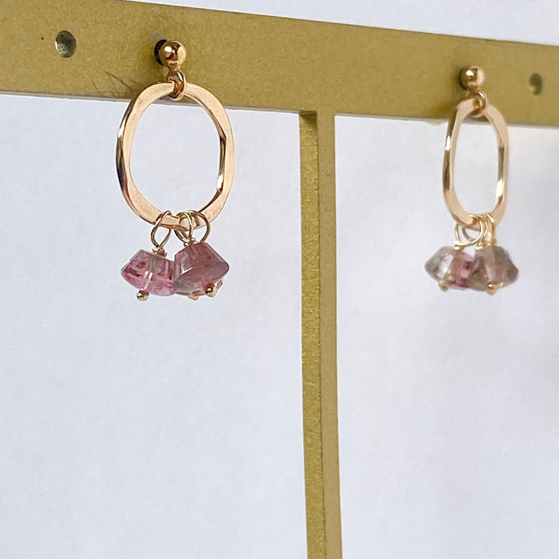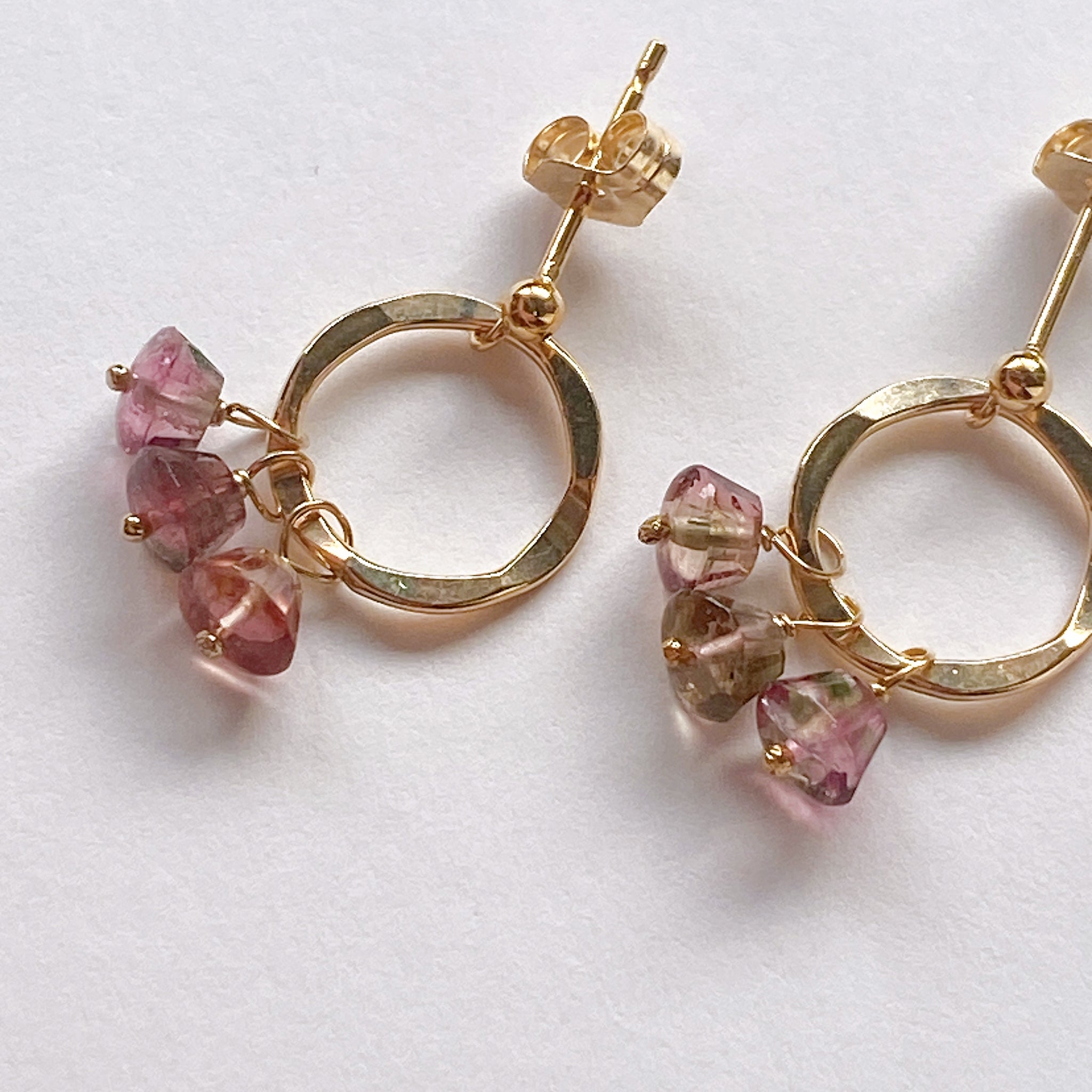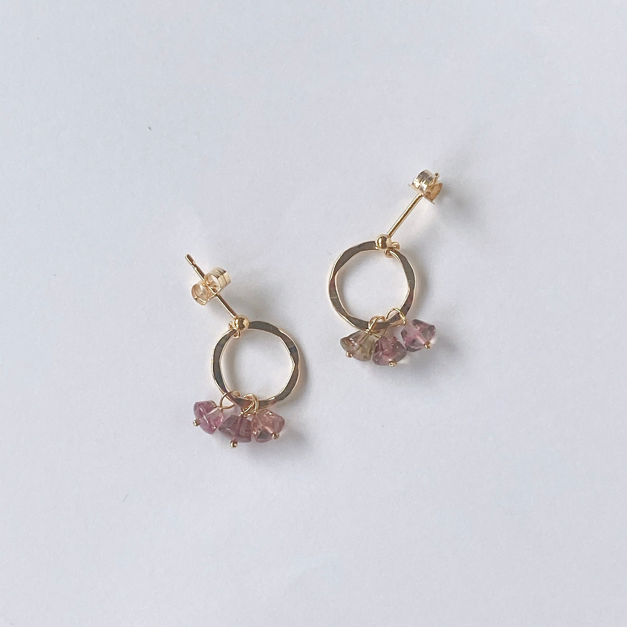 プリンのようなカットのトルマリンを片耳3粒ずつ、14kgf製のリングパーツに留めたポストピアスです。