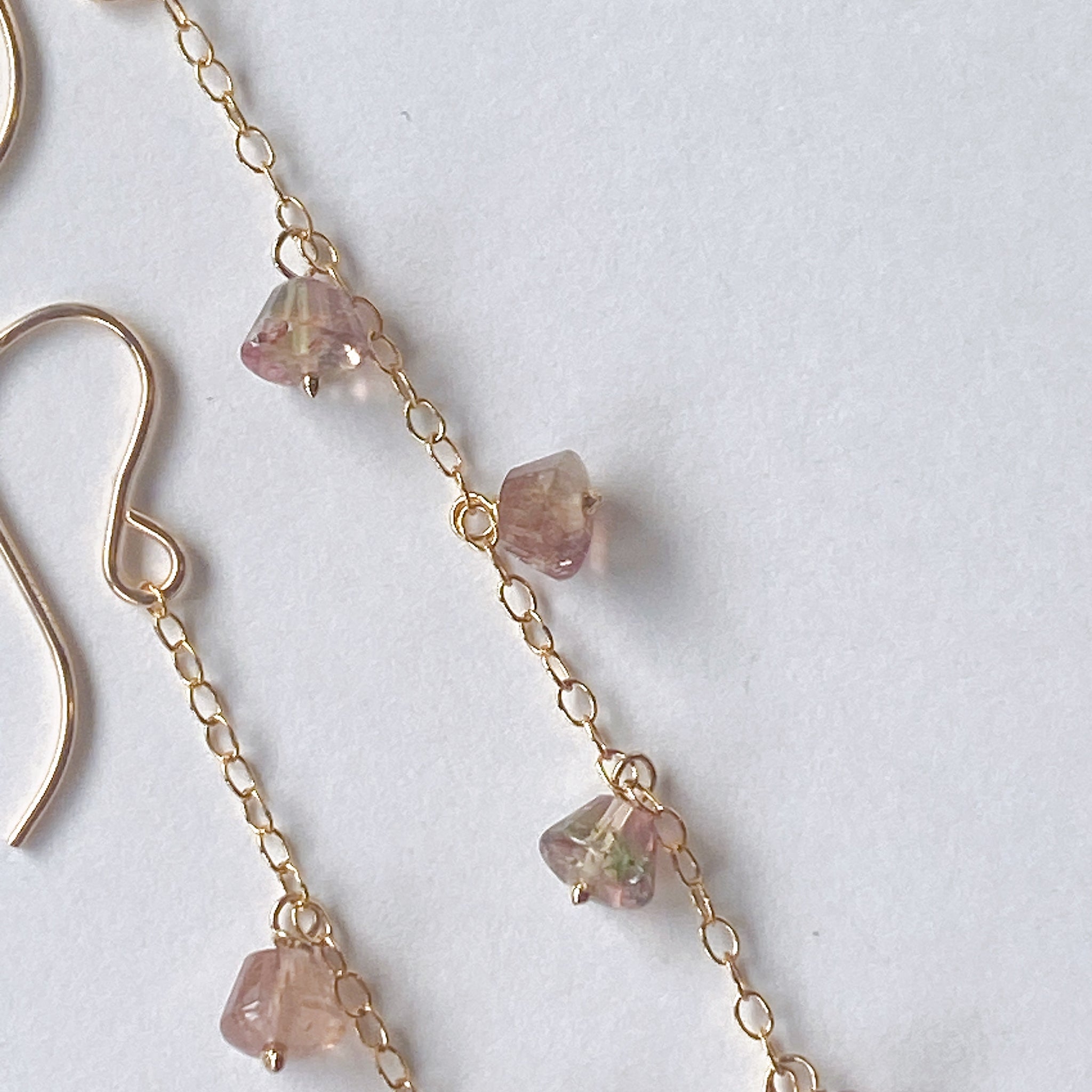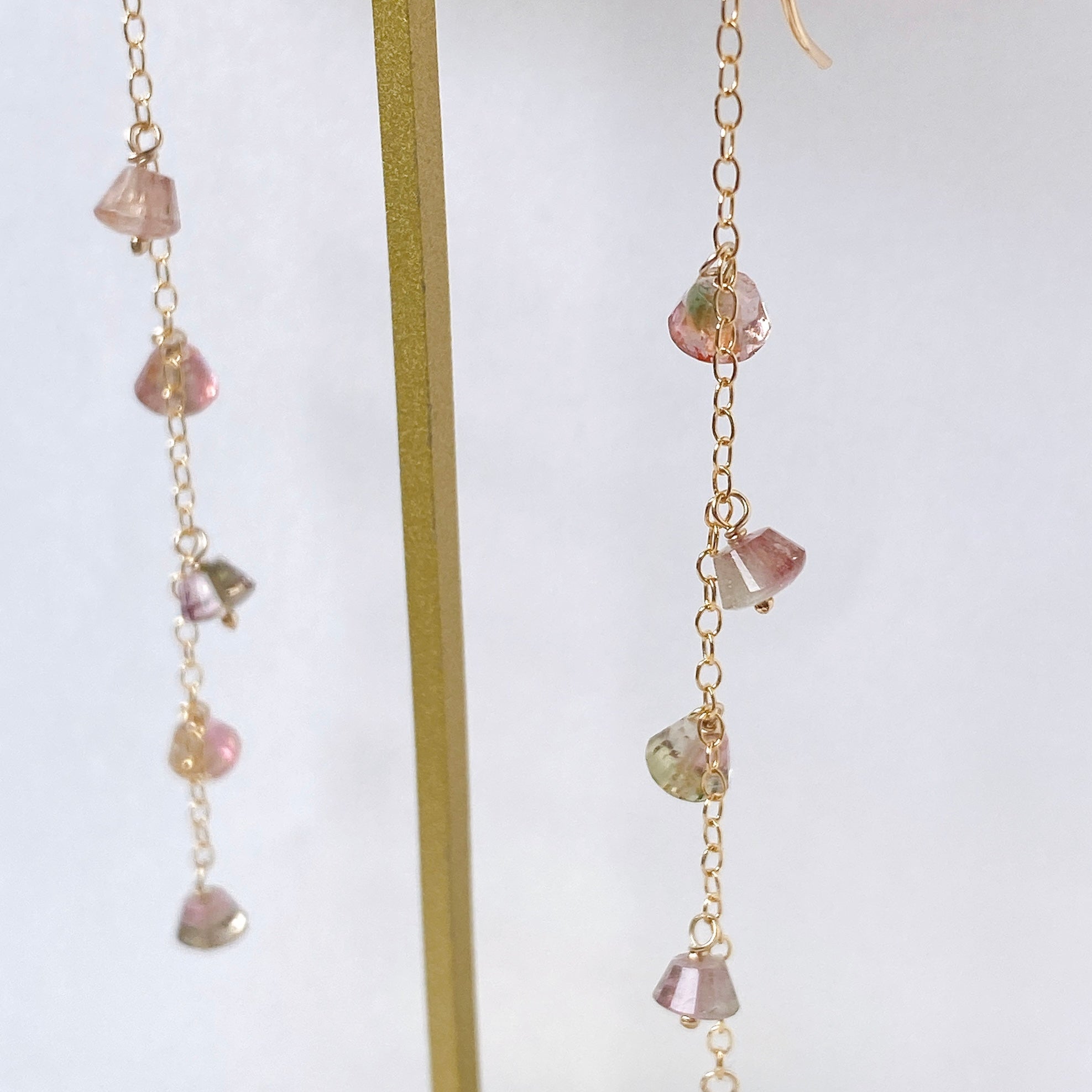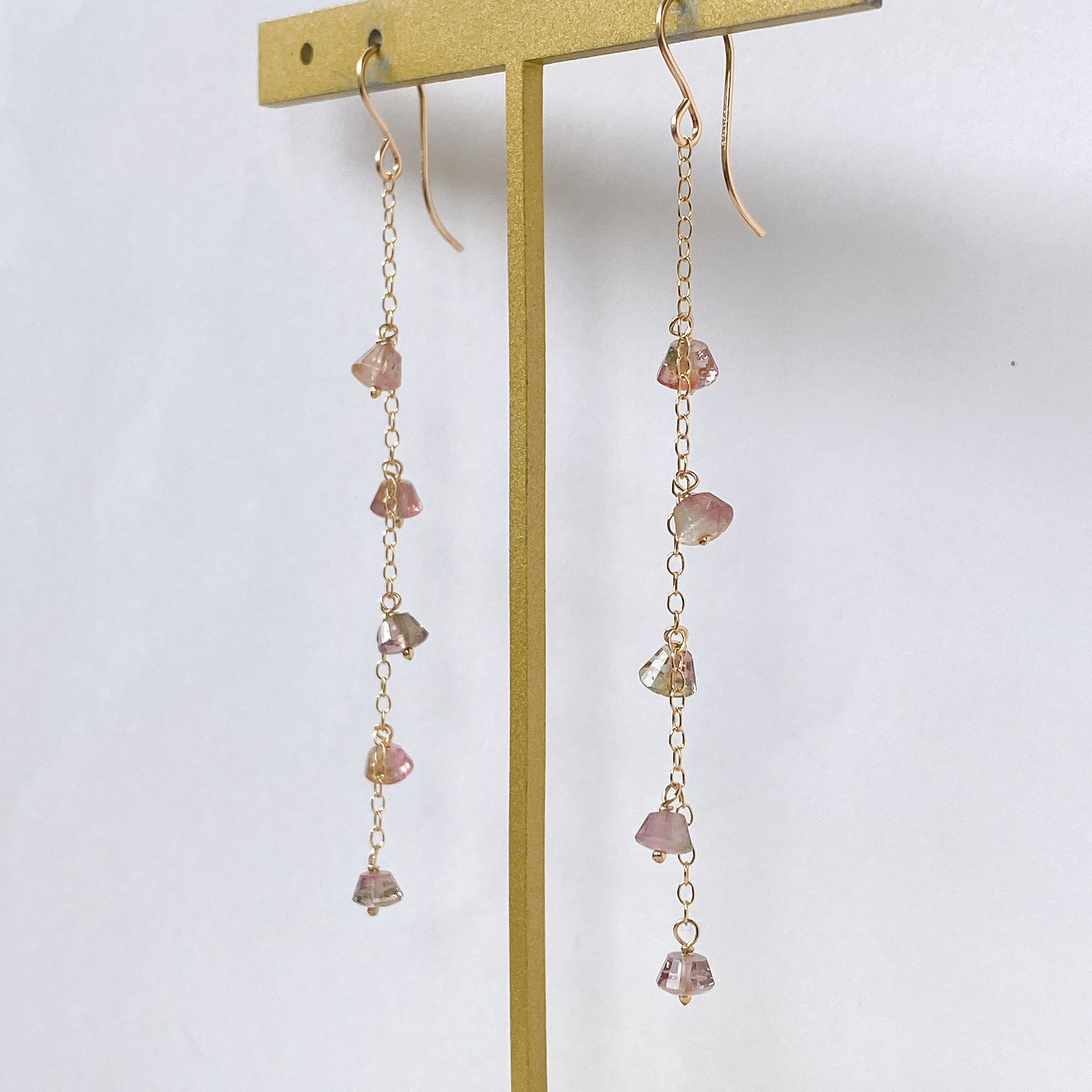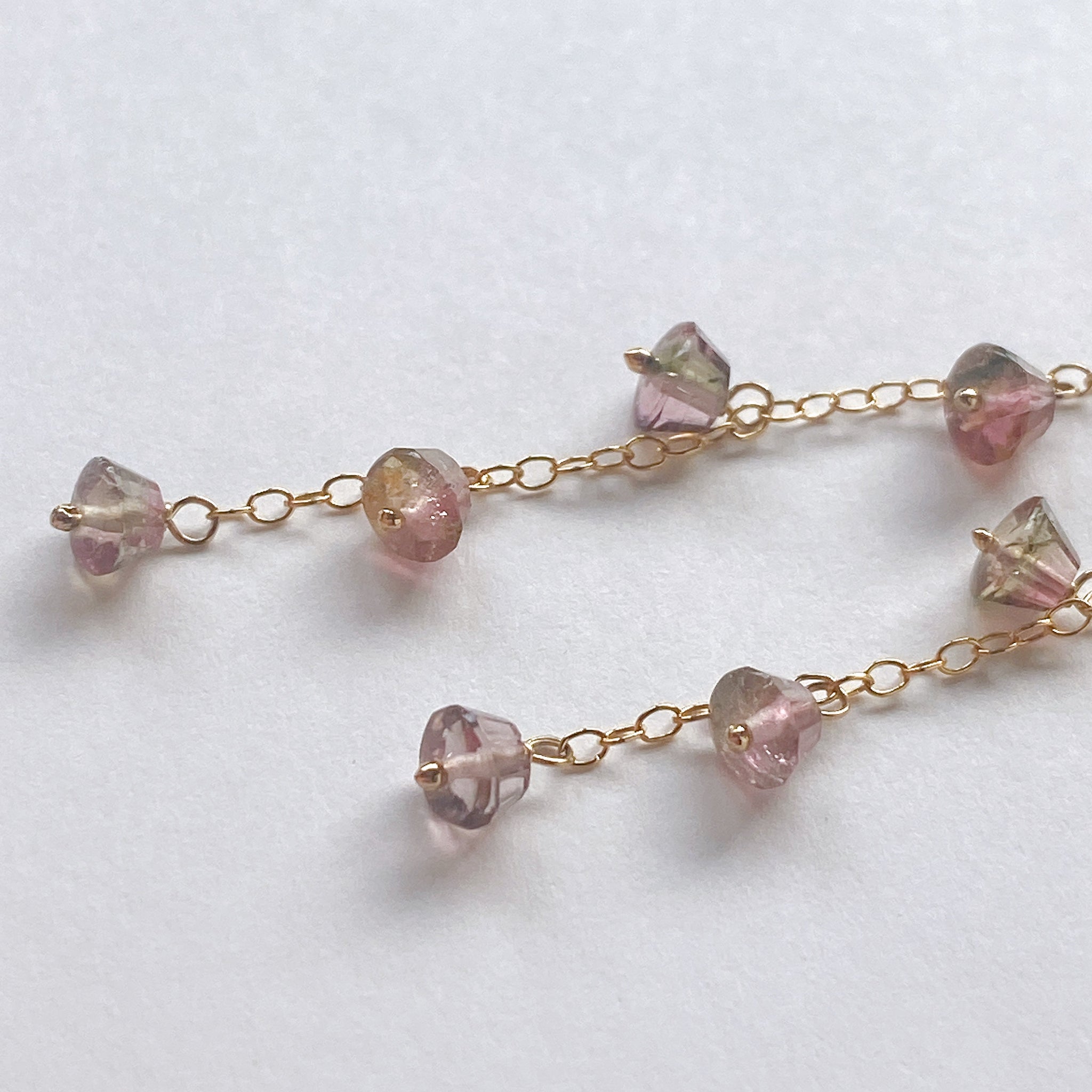 プリンのようなカットのトルマリンを片耳5粒ずつ、14kgf製の華奢なチェーンに留めたデザインです。