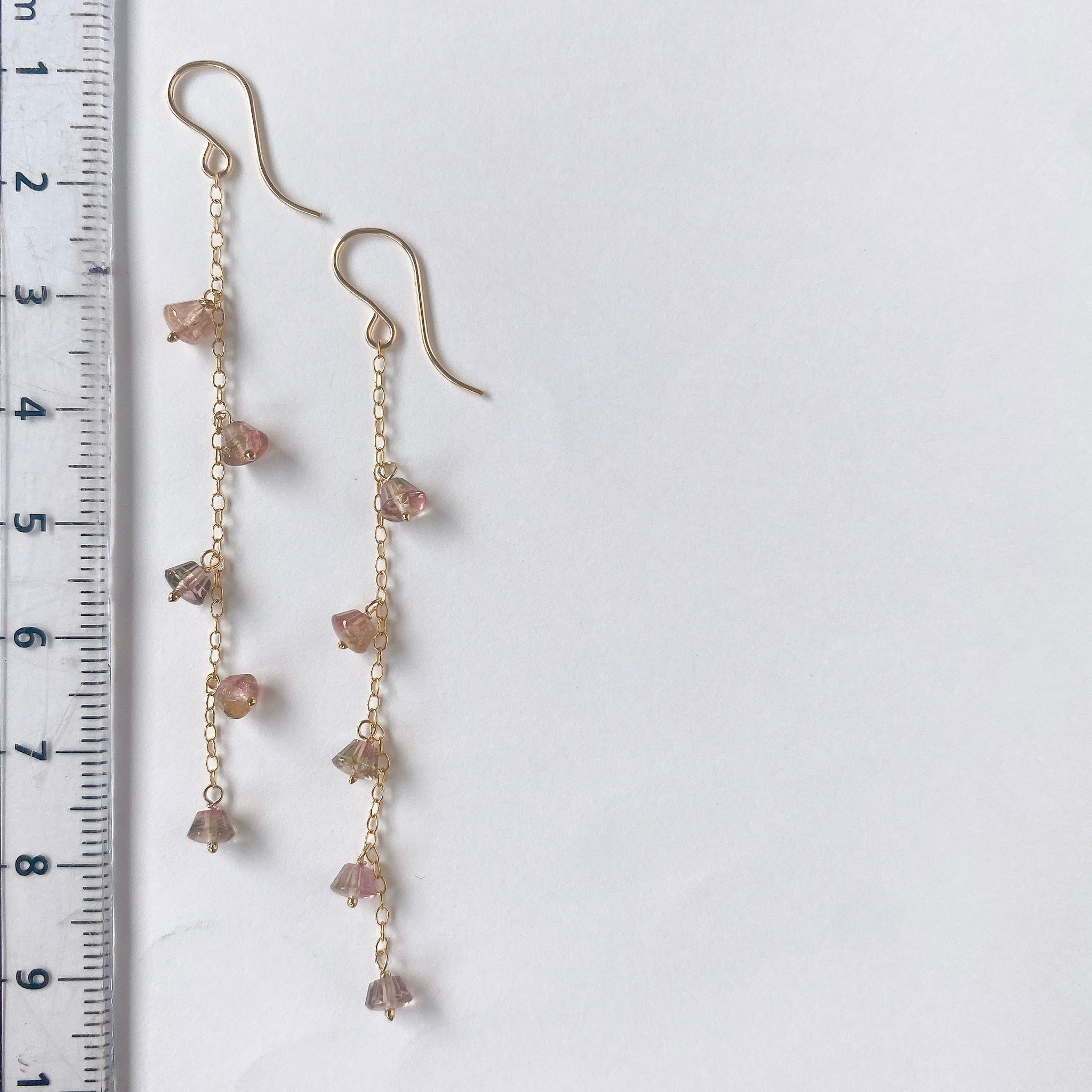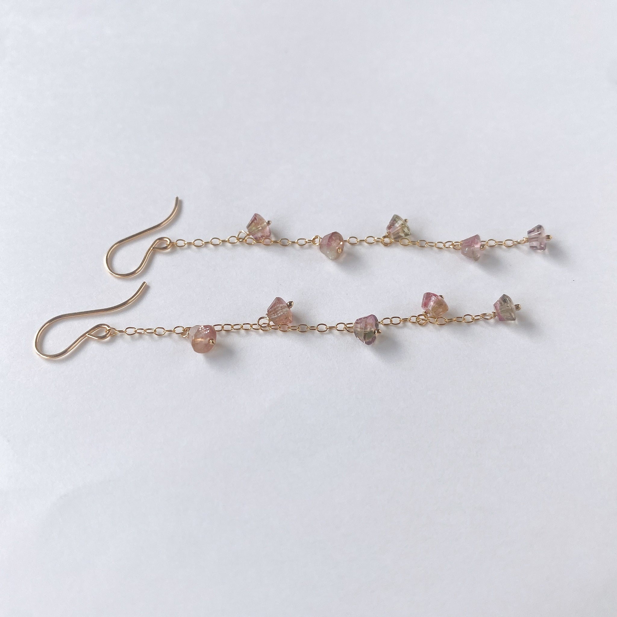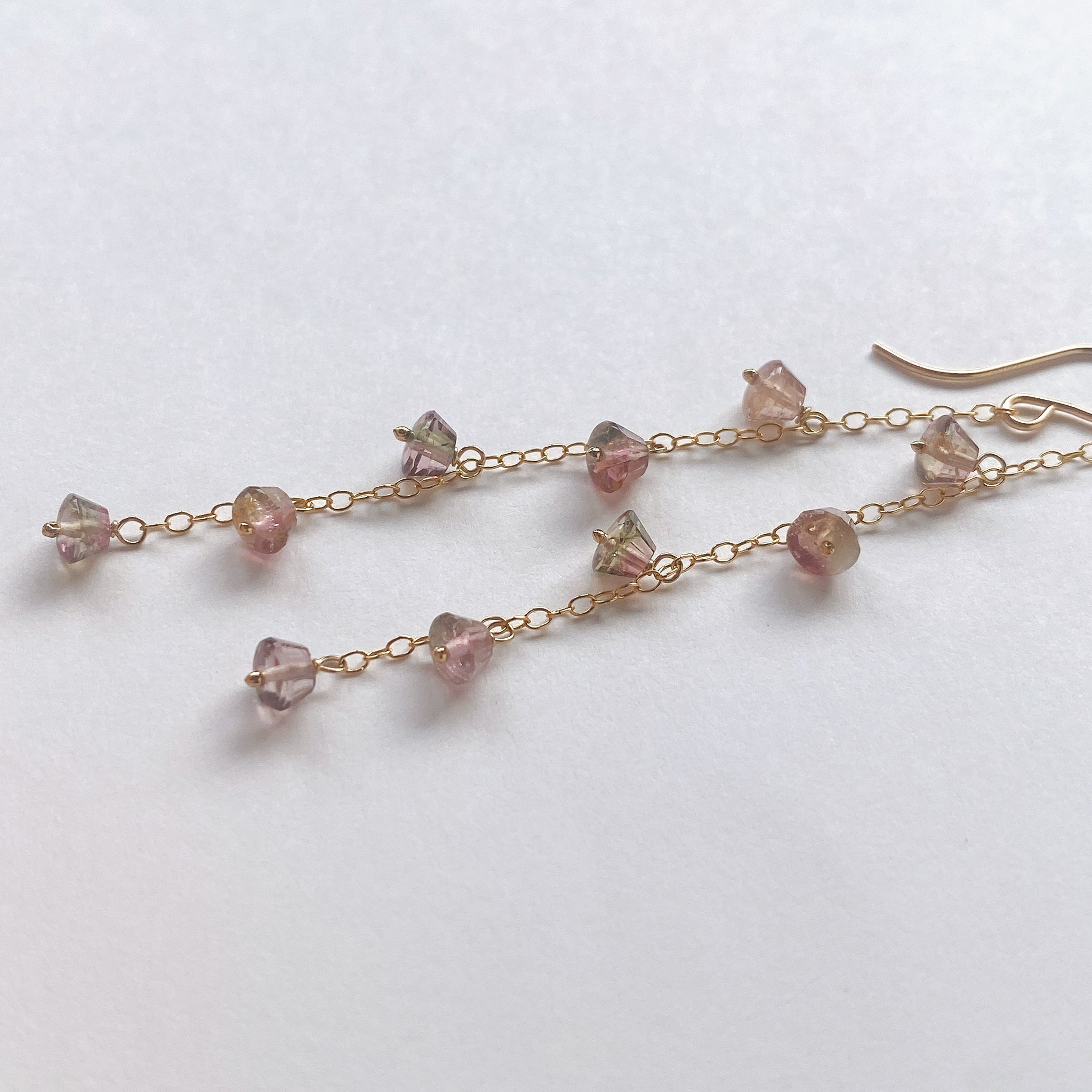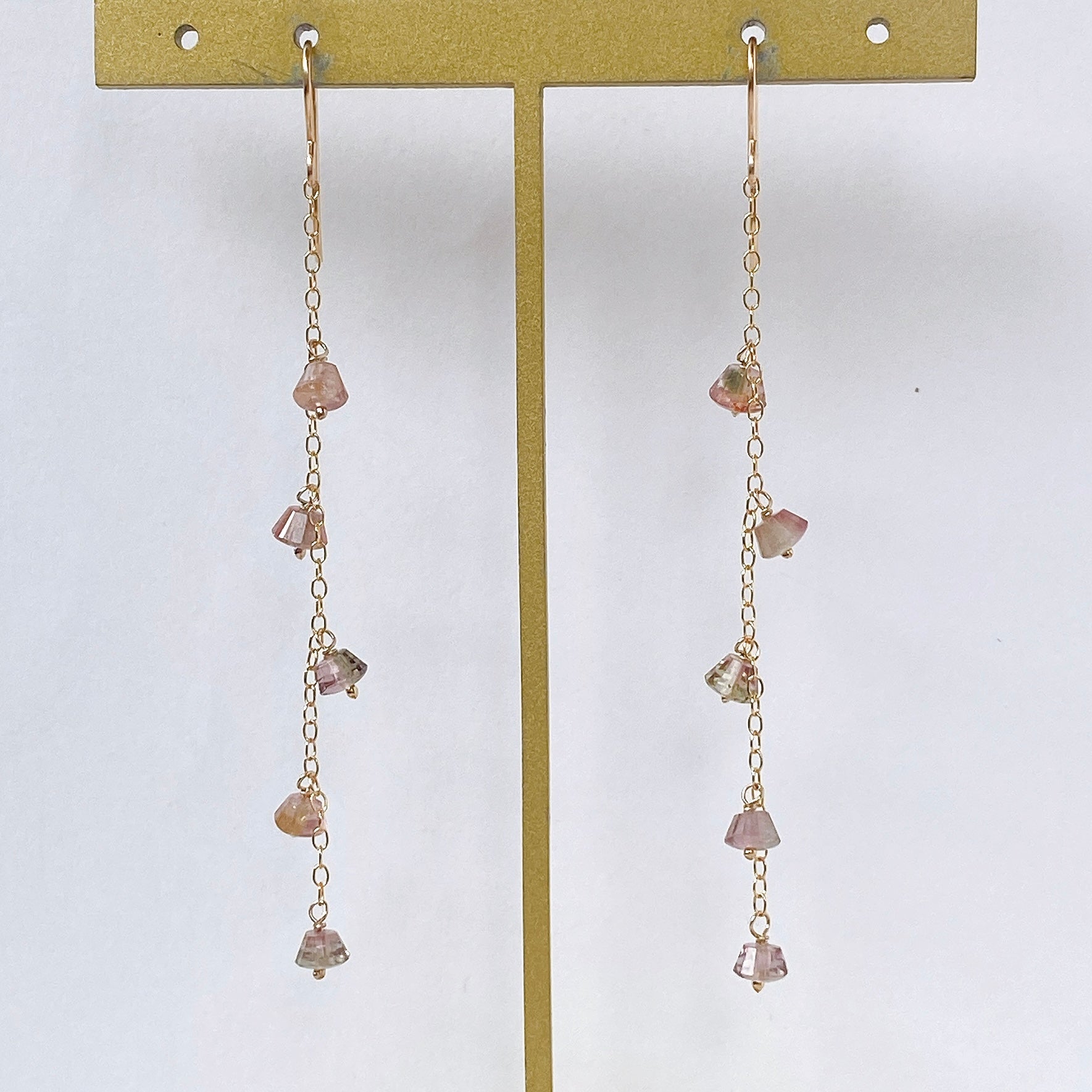 プリンのようなカットのトルマリンを片耳5粒ずつ、14kgf製の華奢なチェーンに留めたデザインです。