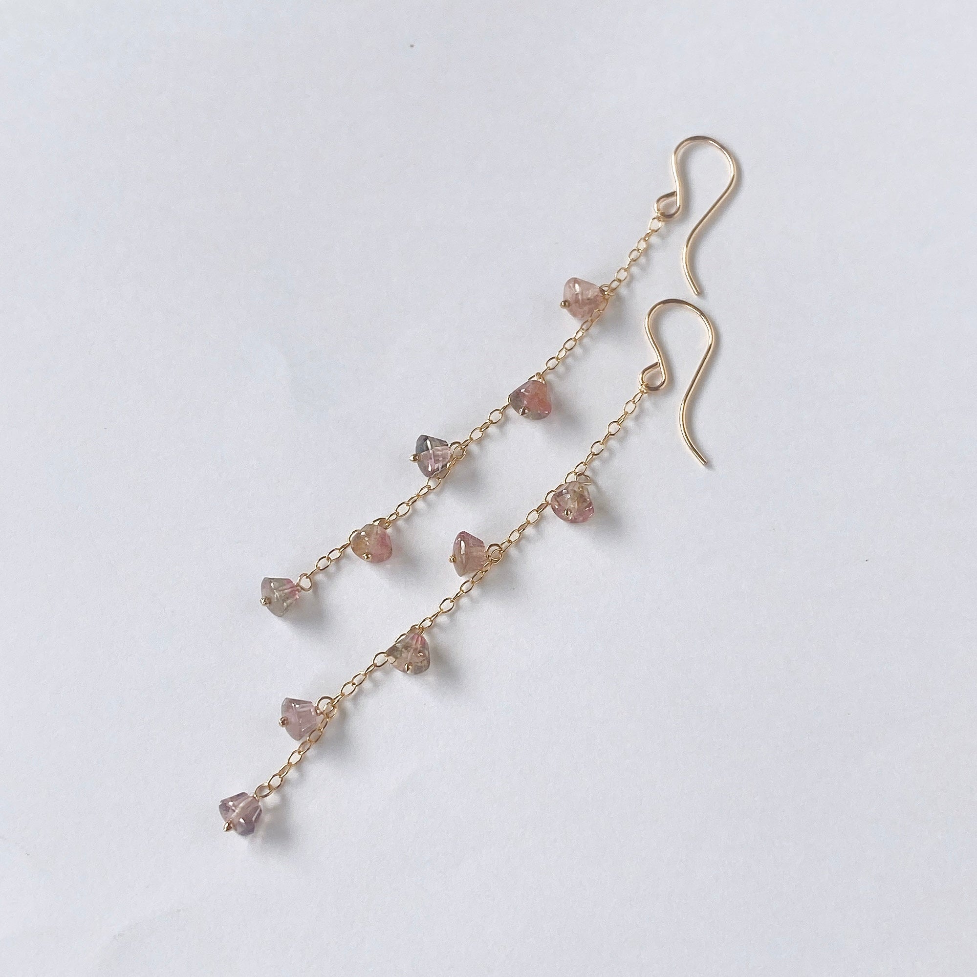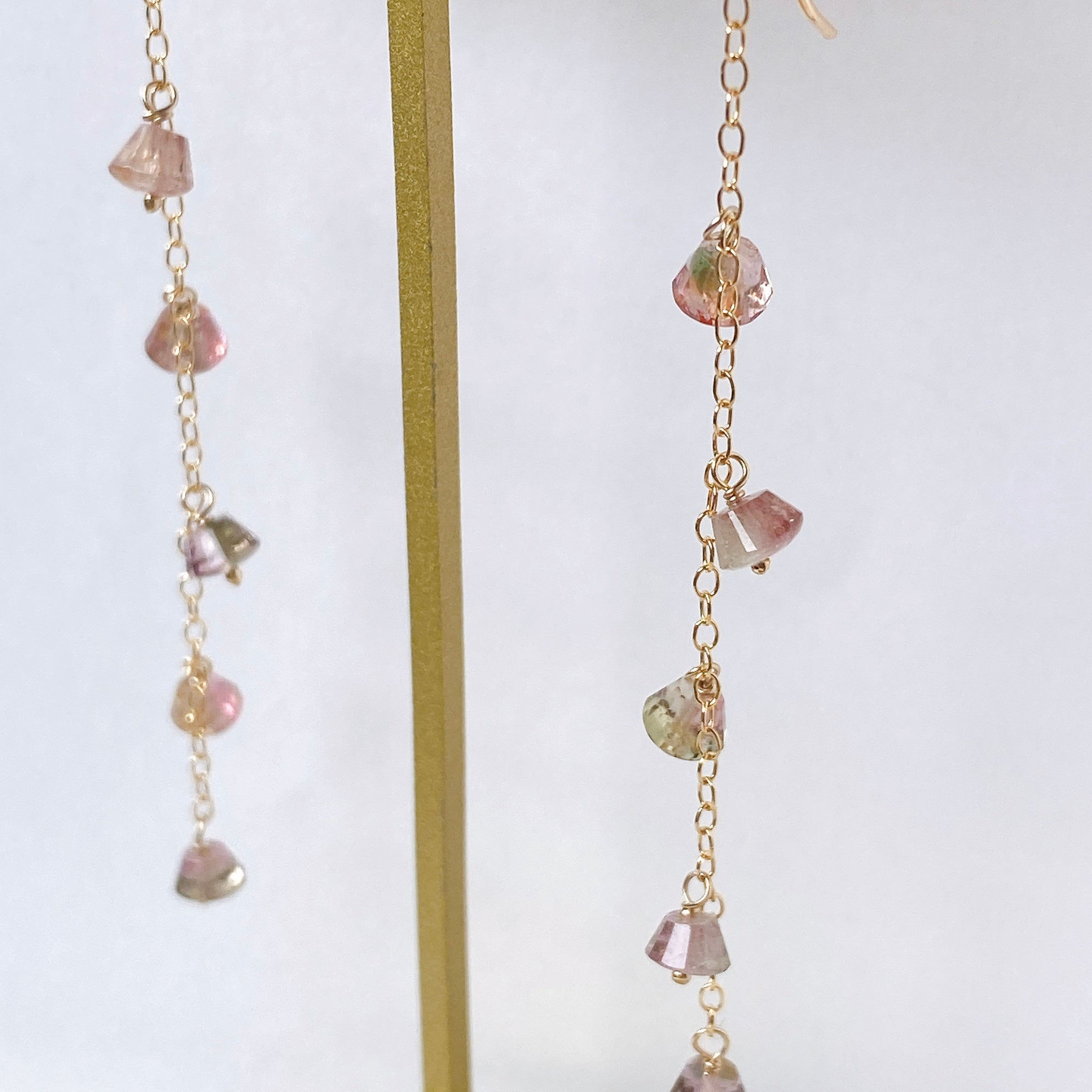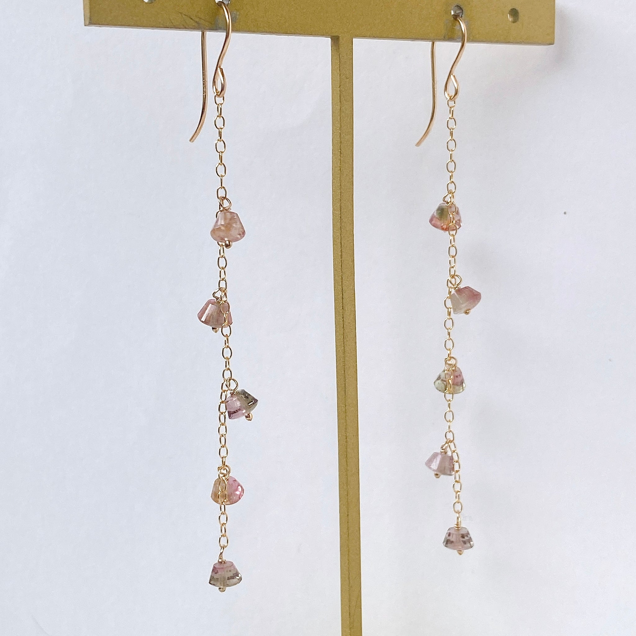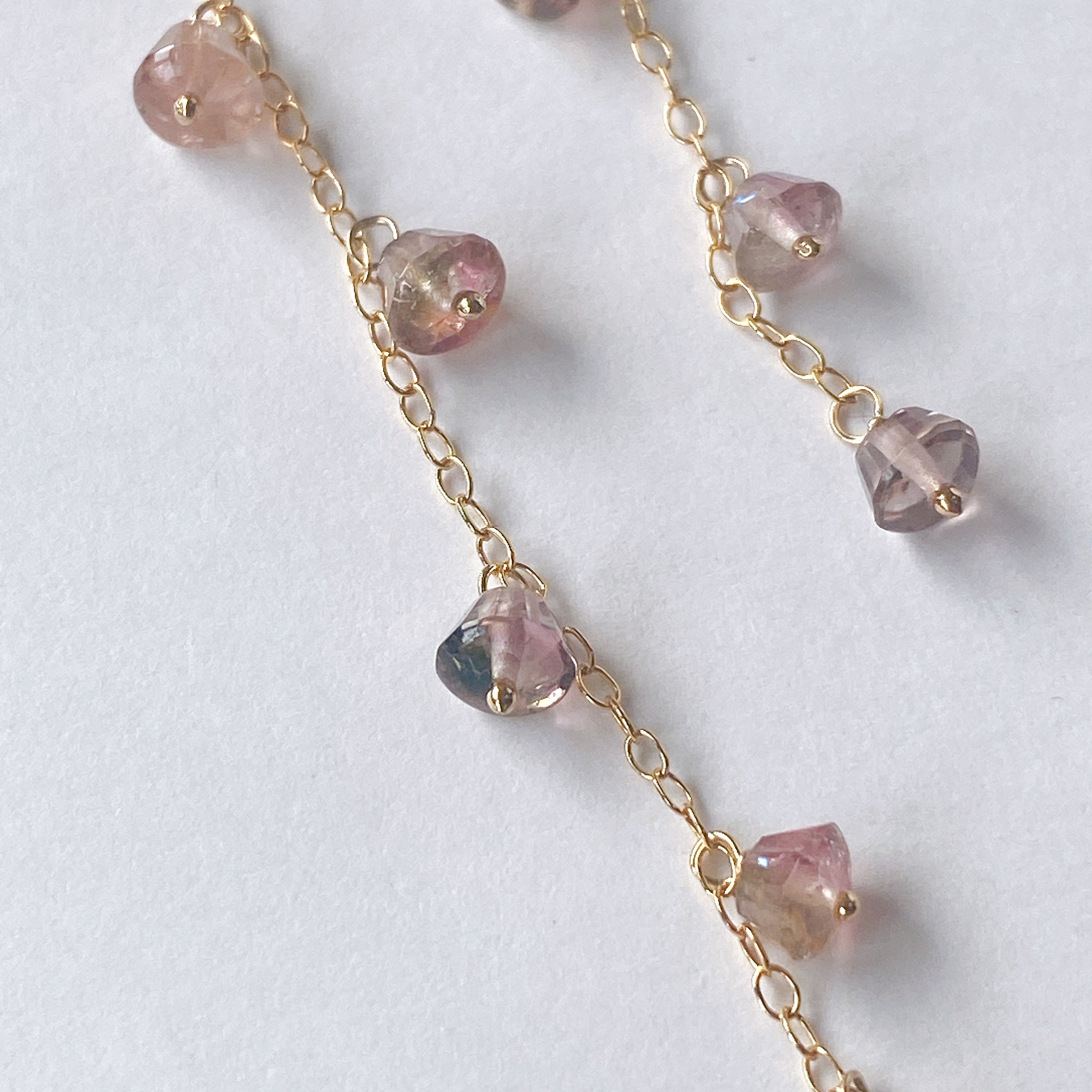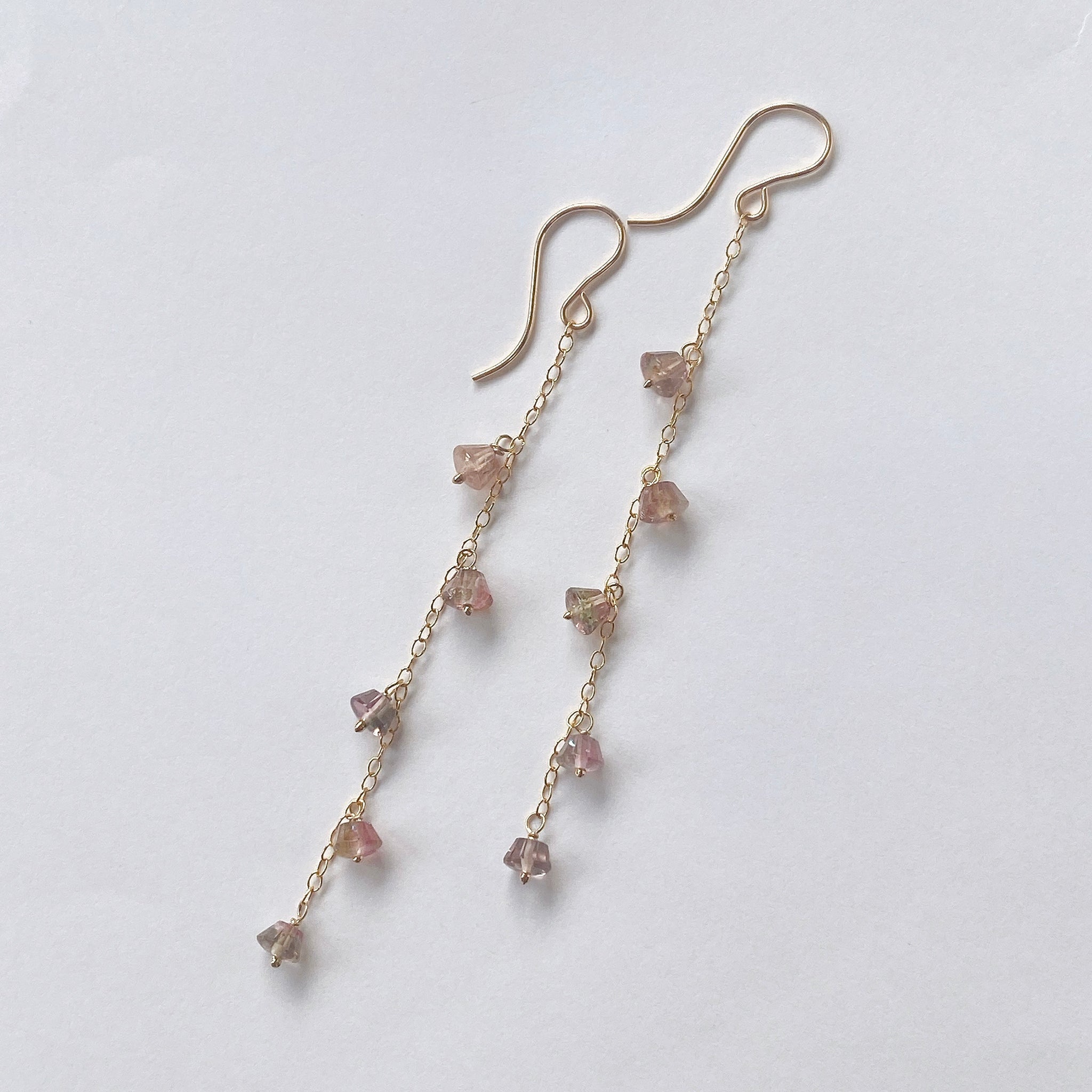 プリンのようなカットのトルマリンを片耳5粒ずつ、14kgf製の華奢なチェーンに留めたデザインです。