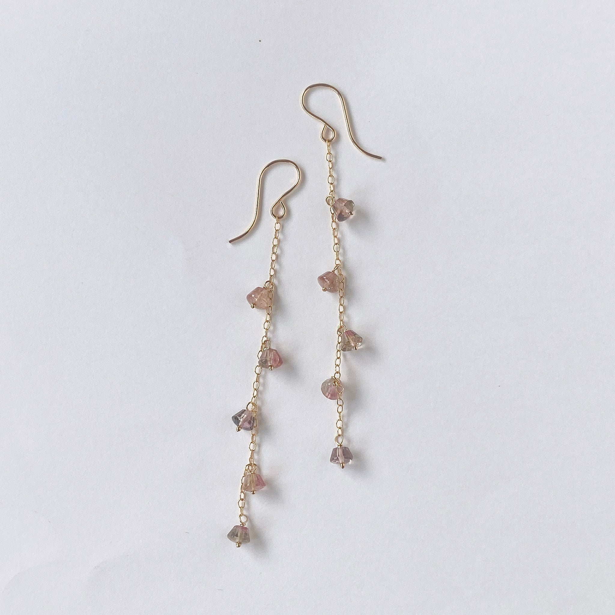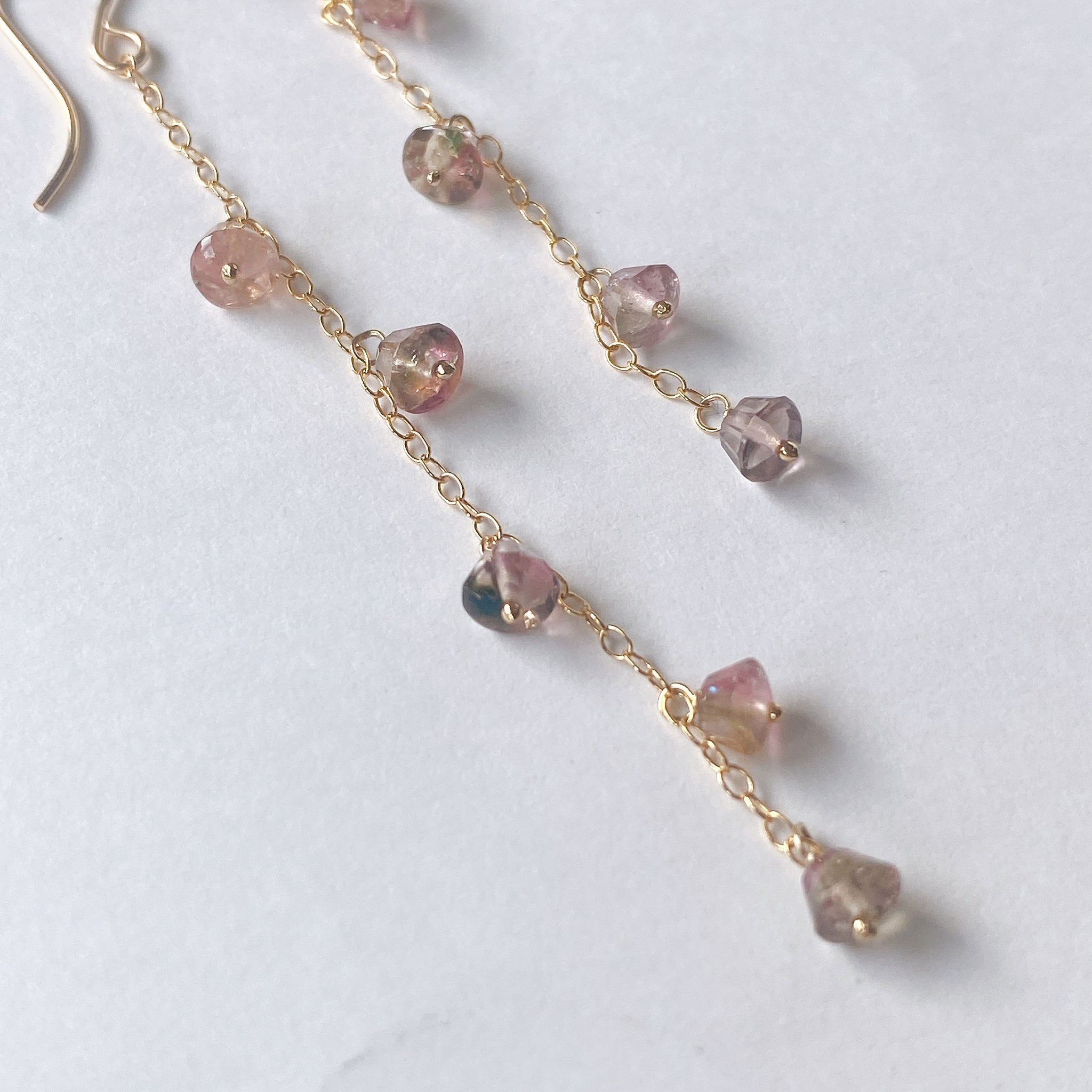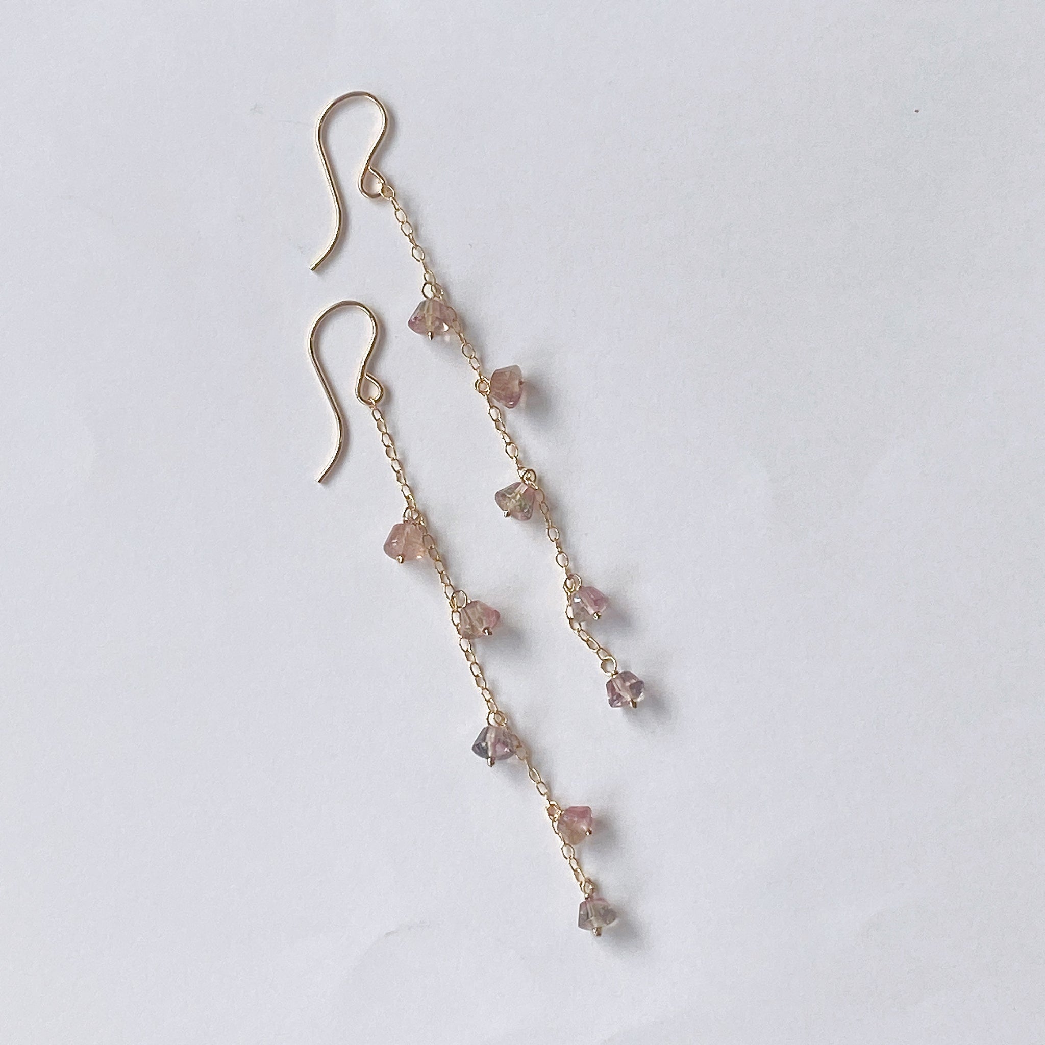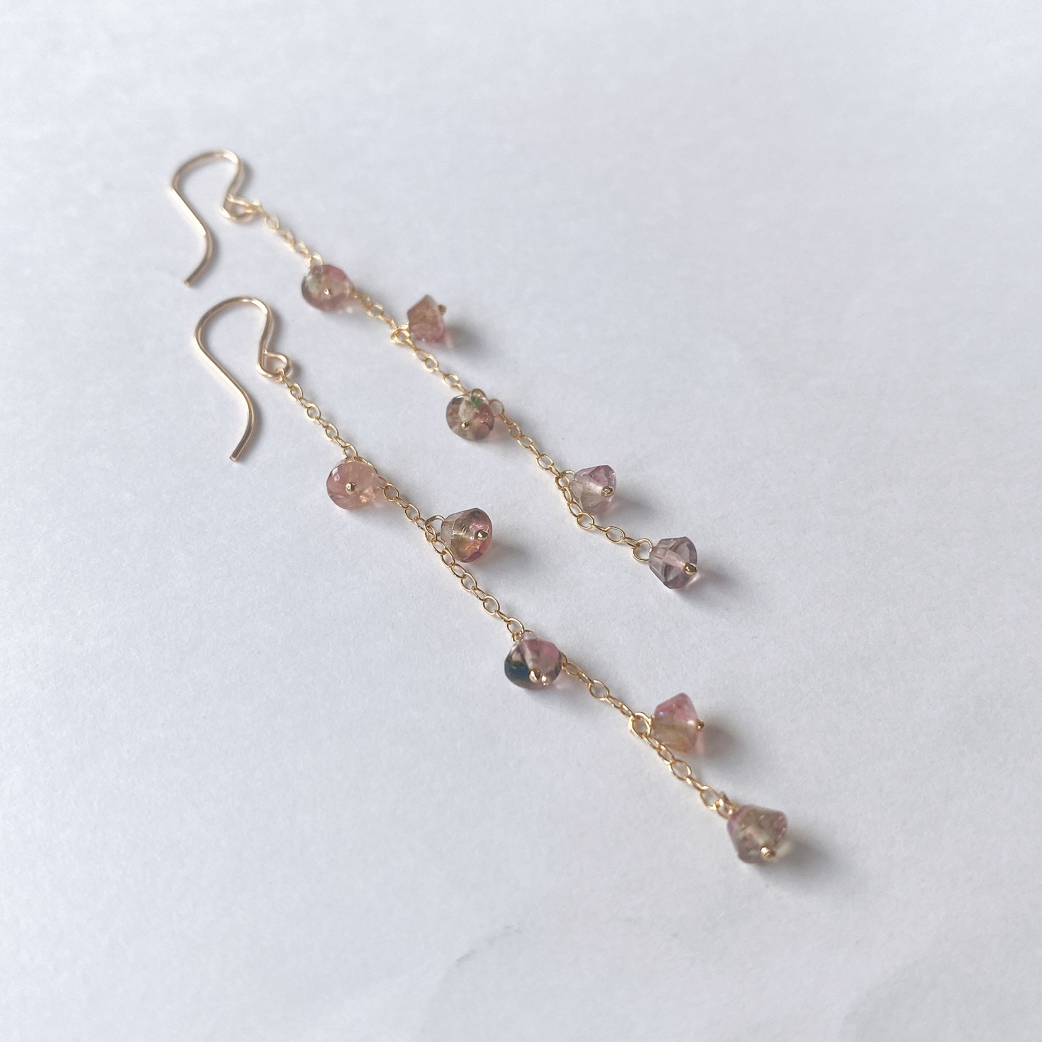 プリンのようなカットのトルマリンを片耳5粒ずつ、14kgf製の華奢なチェーンに留めたデザインです。