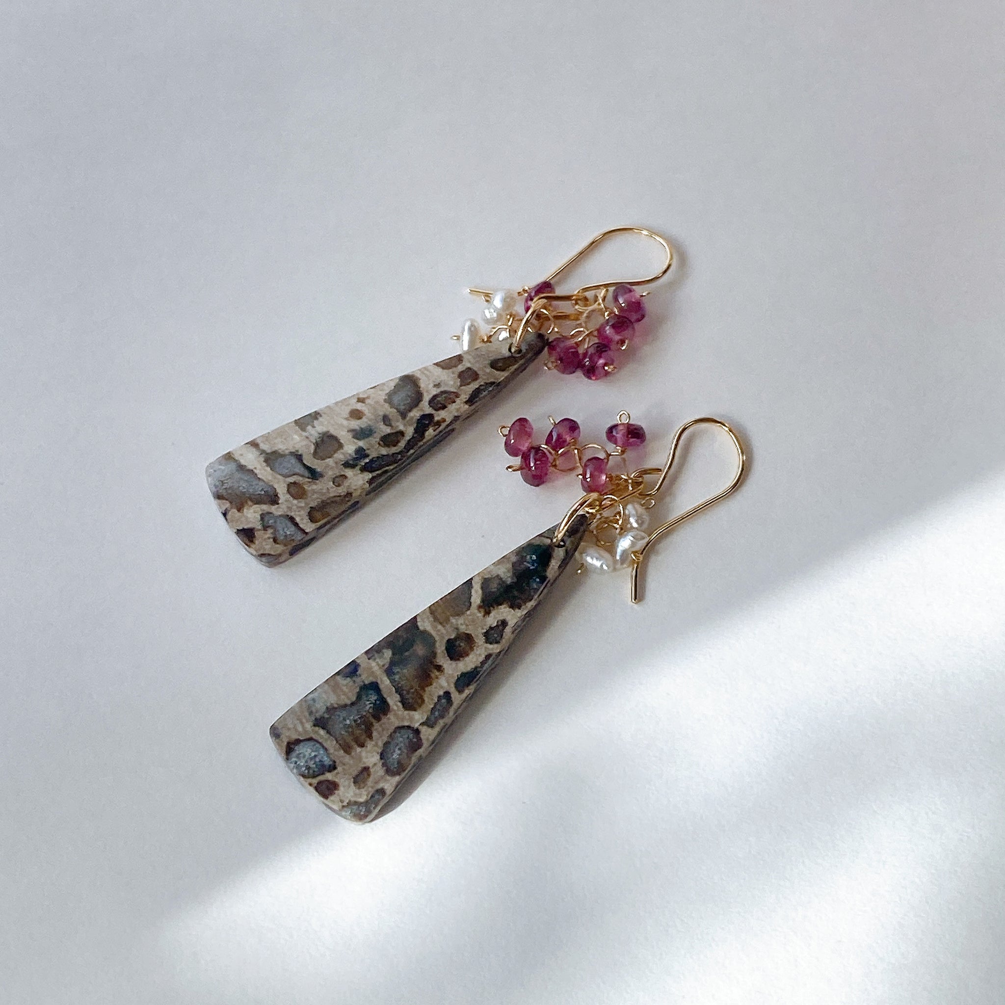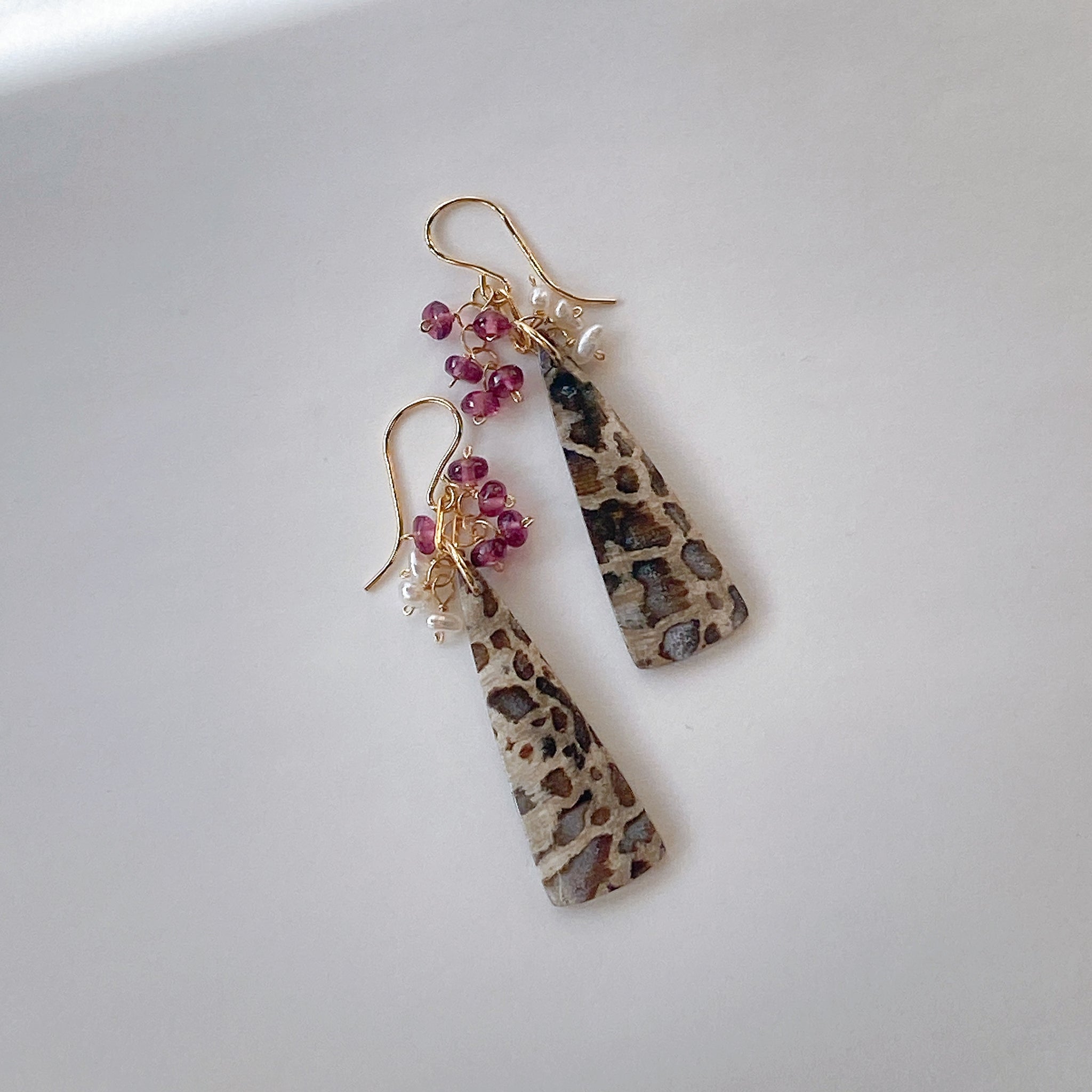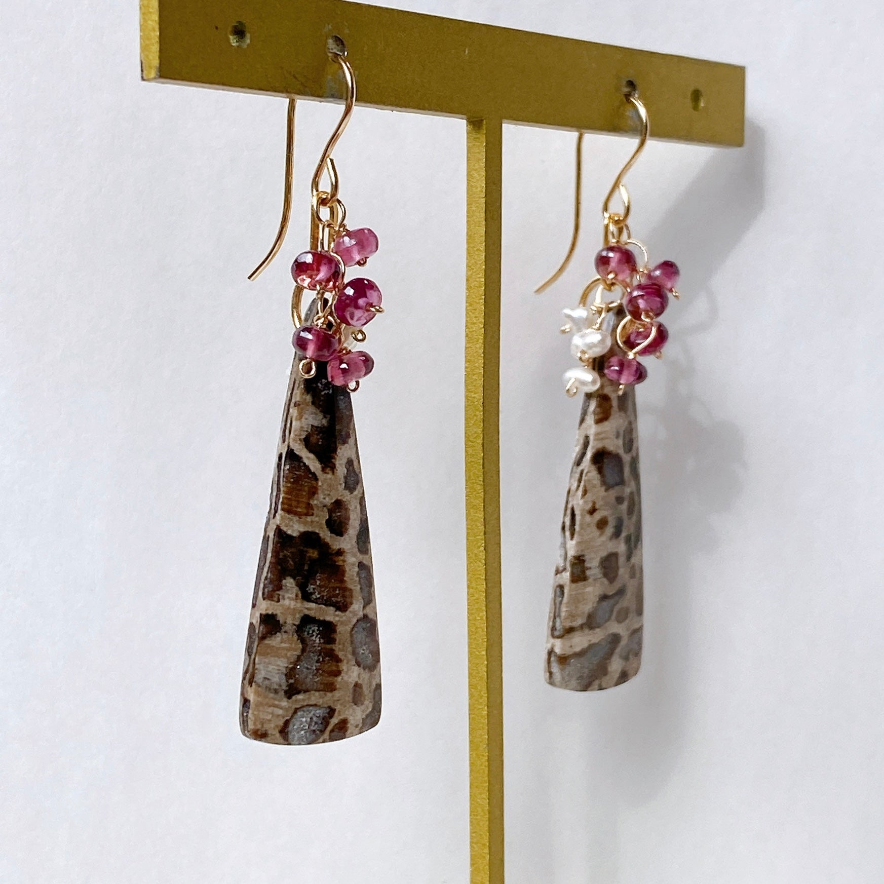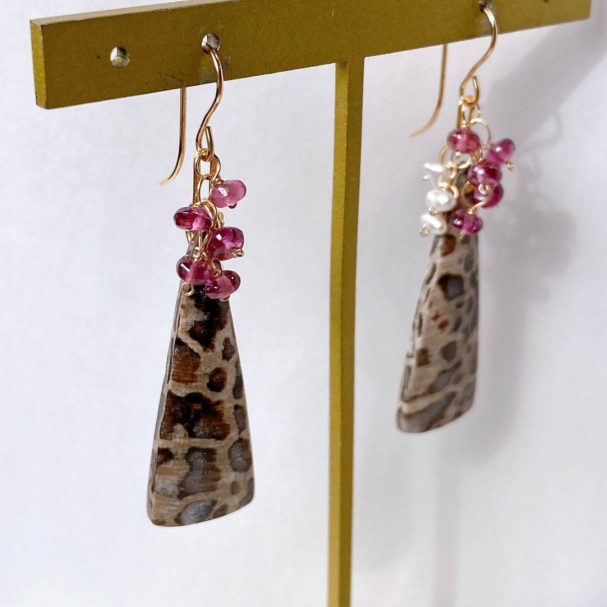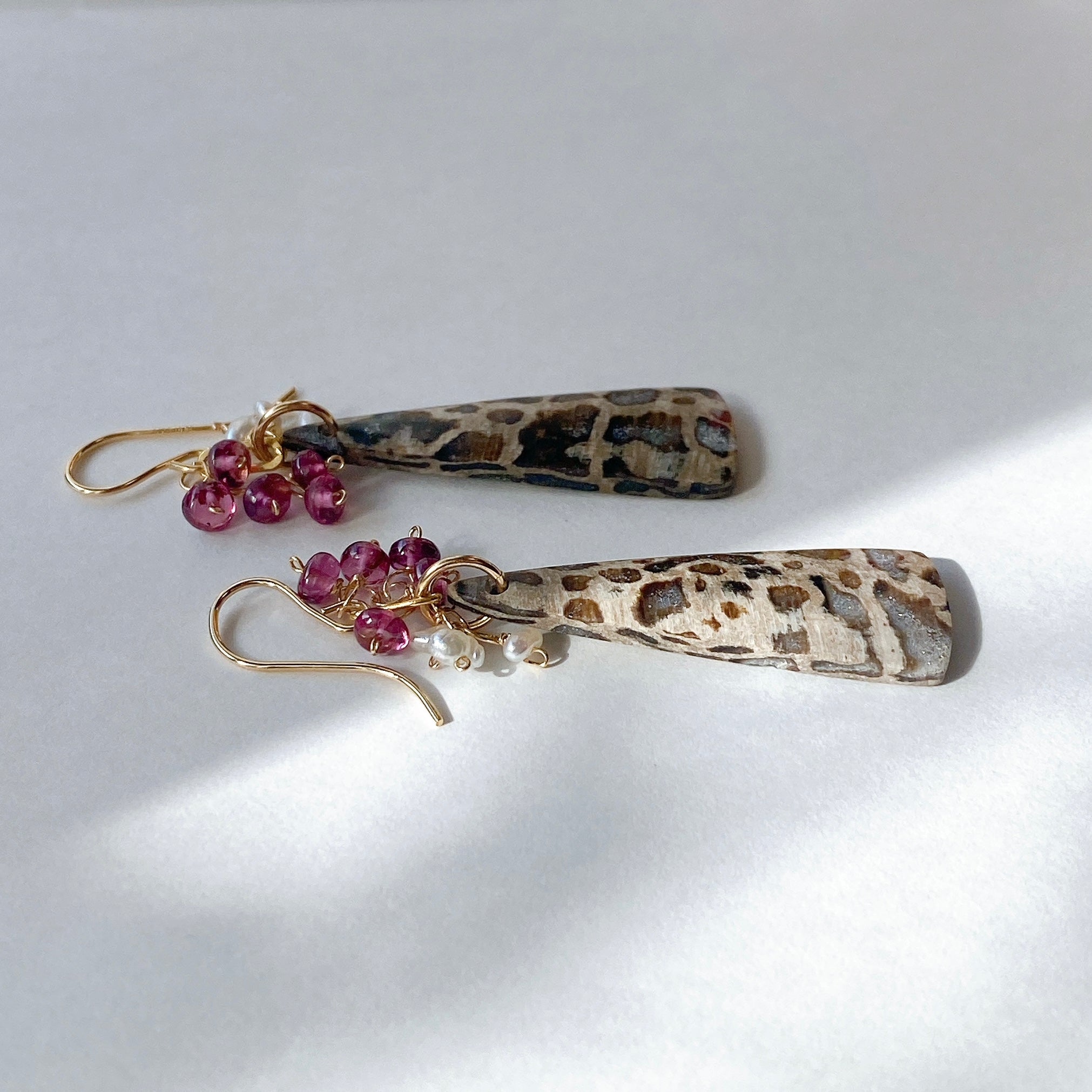 パームルートフォッシルとロードライトガーネット、アコヤケシパールを使ってデザインした耳飾りです。