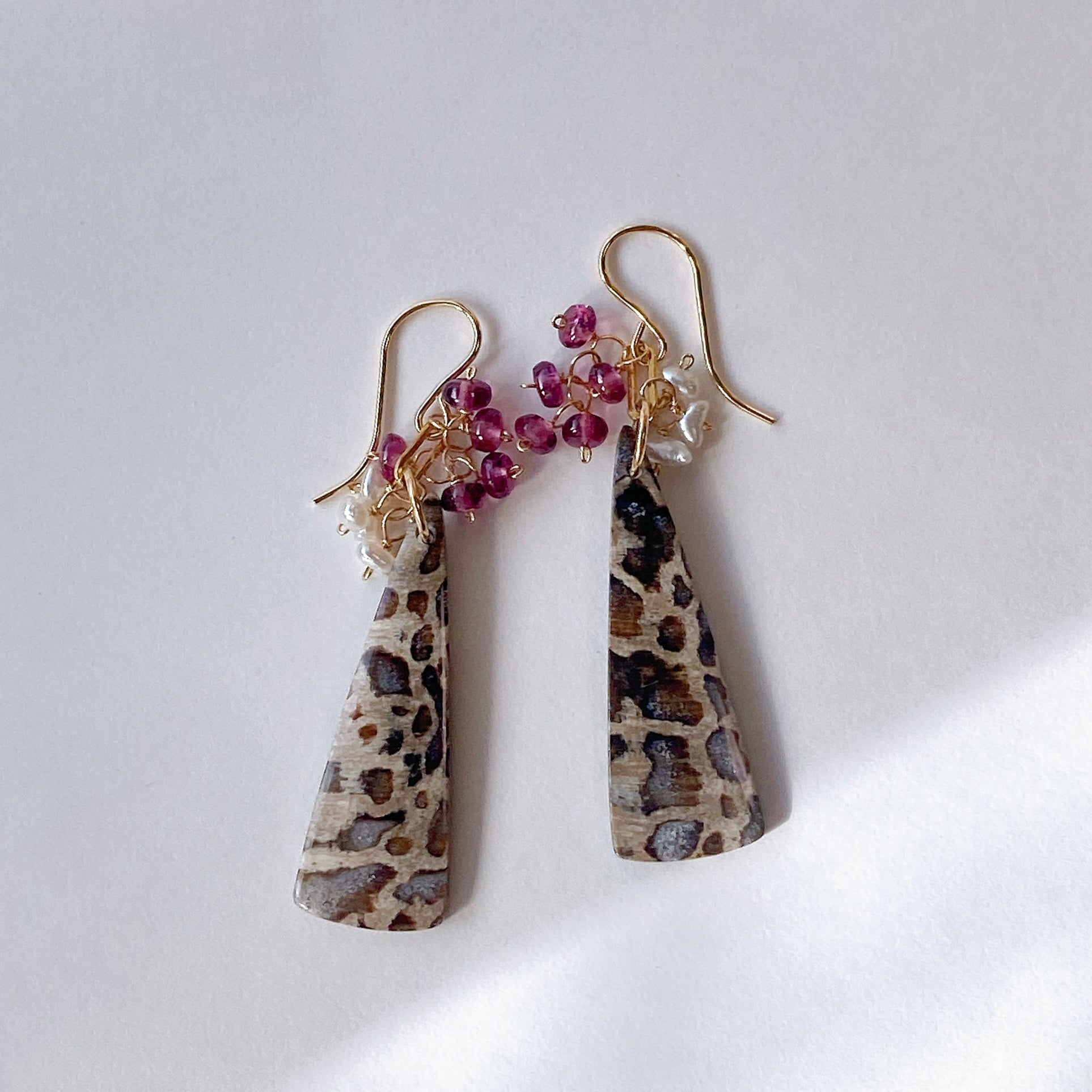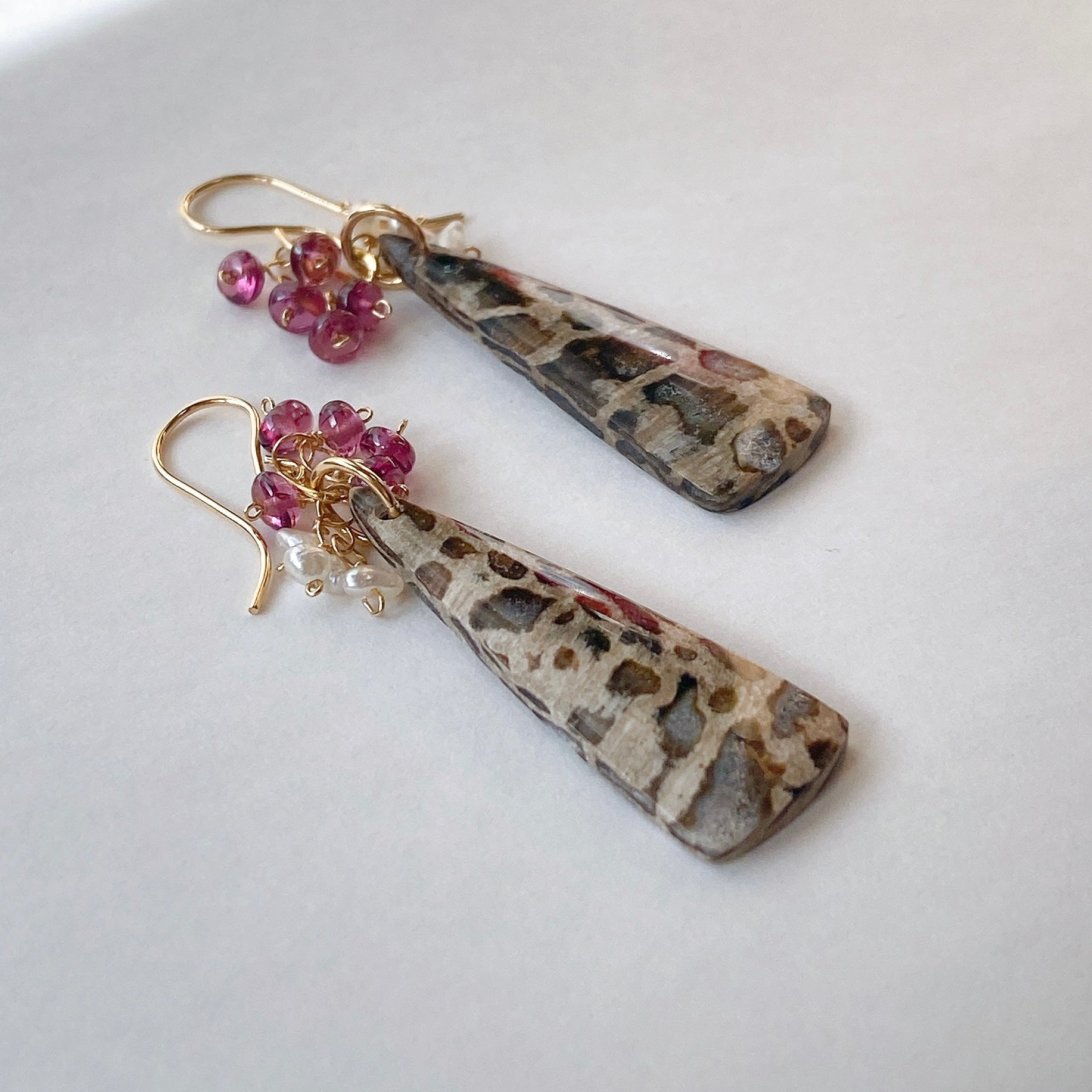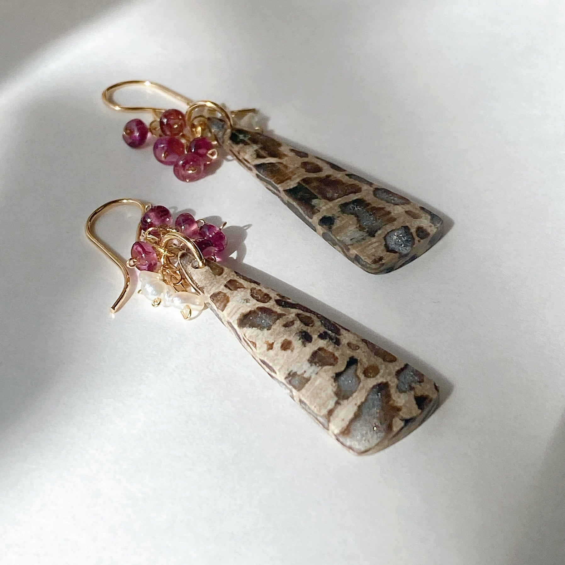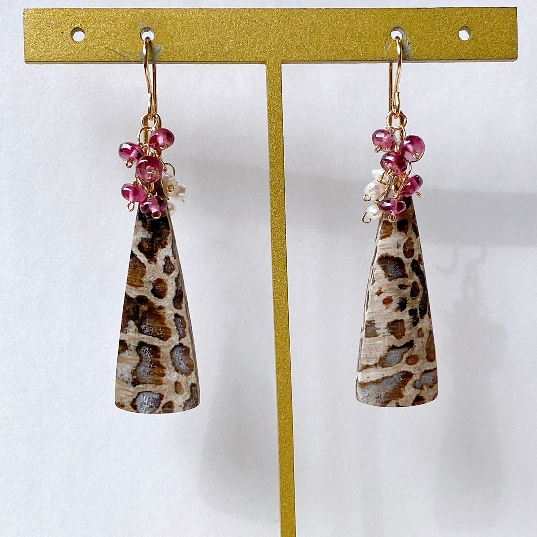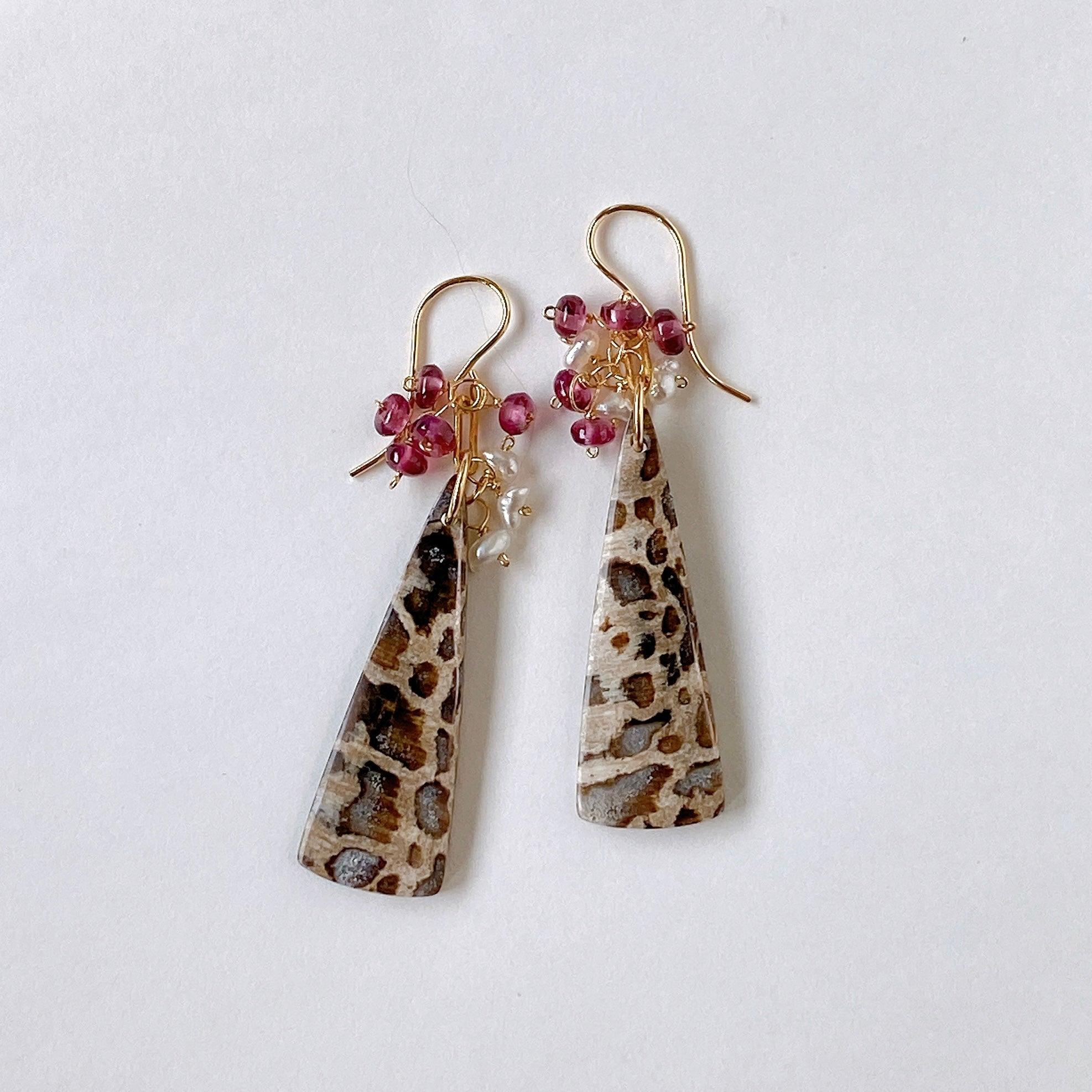 パームルートフォッシルとロードライトガーネット、アコヤケシパールを使ってデザインした耳飾りです。
