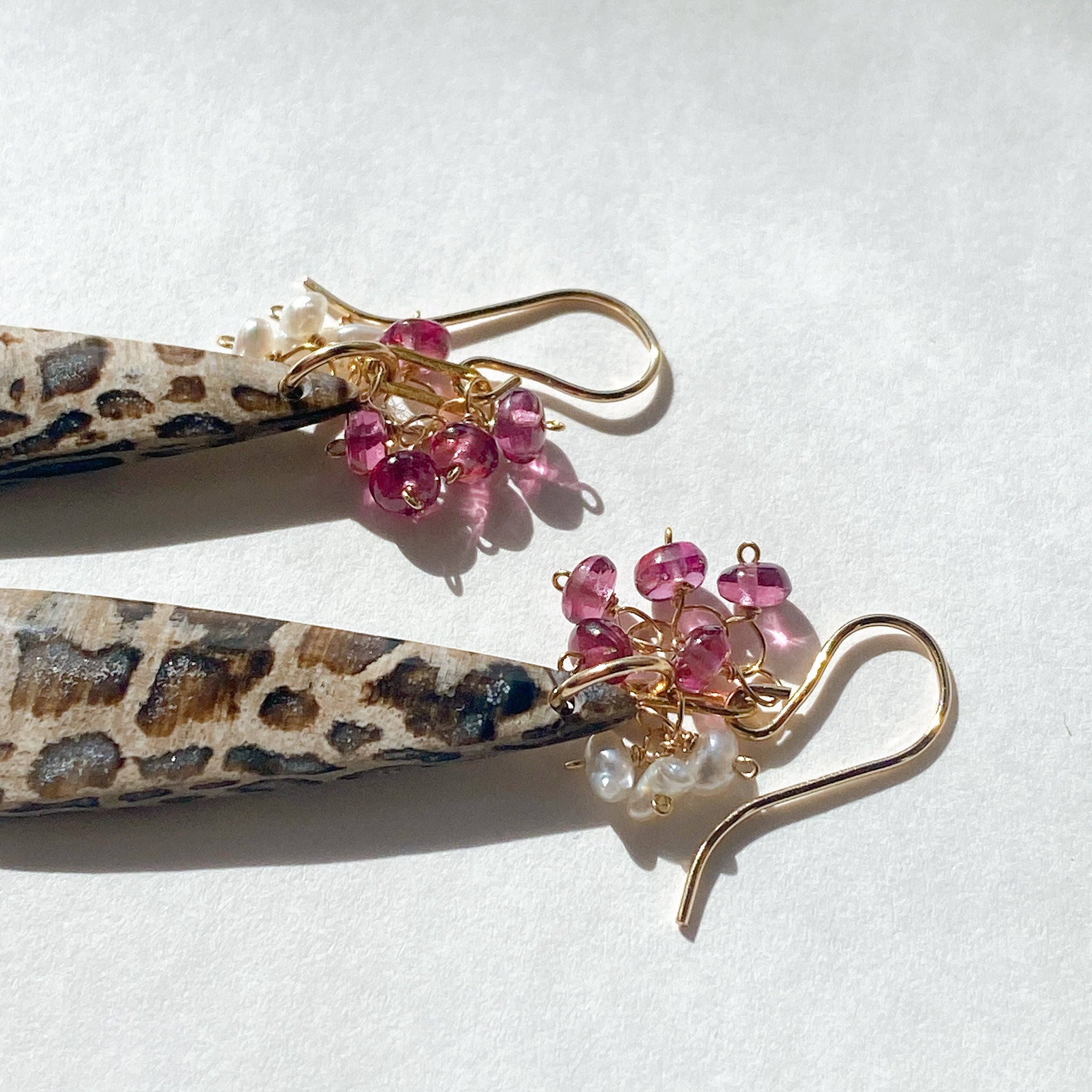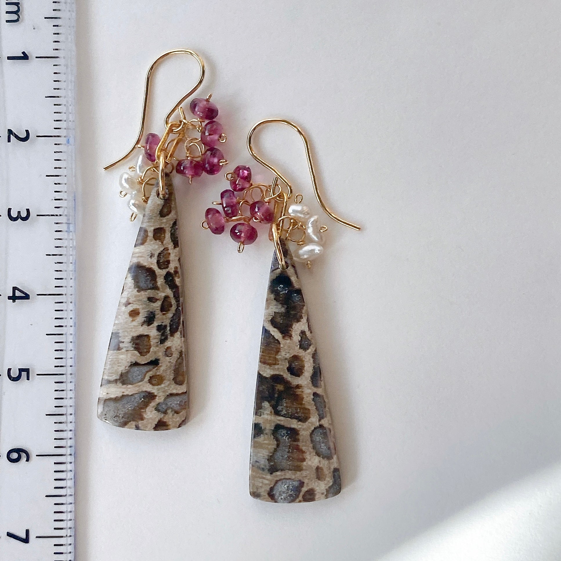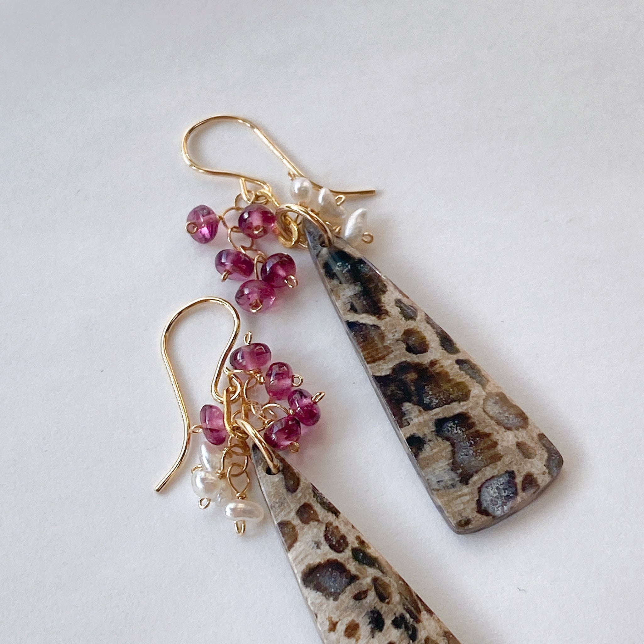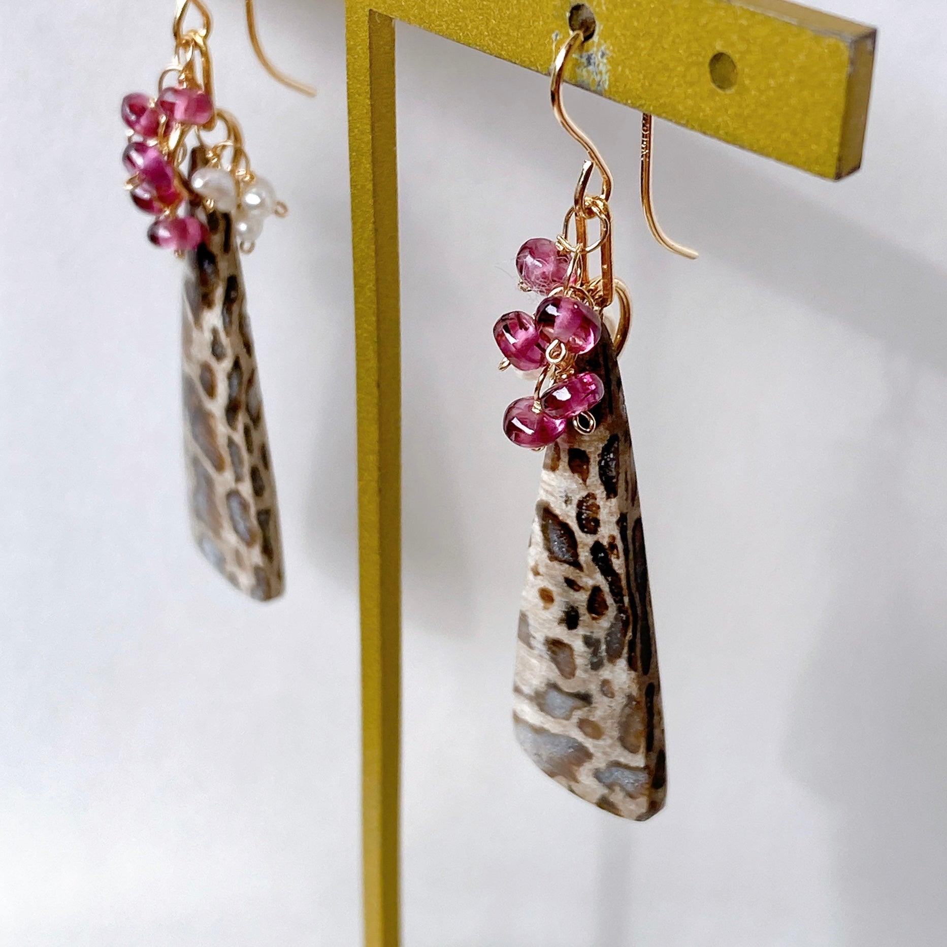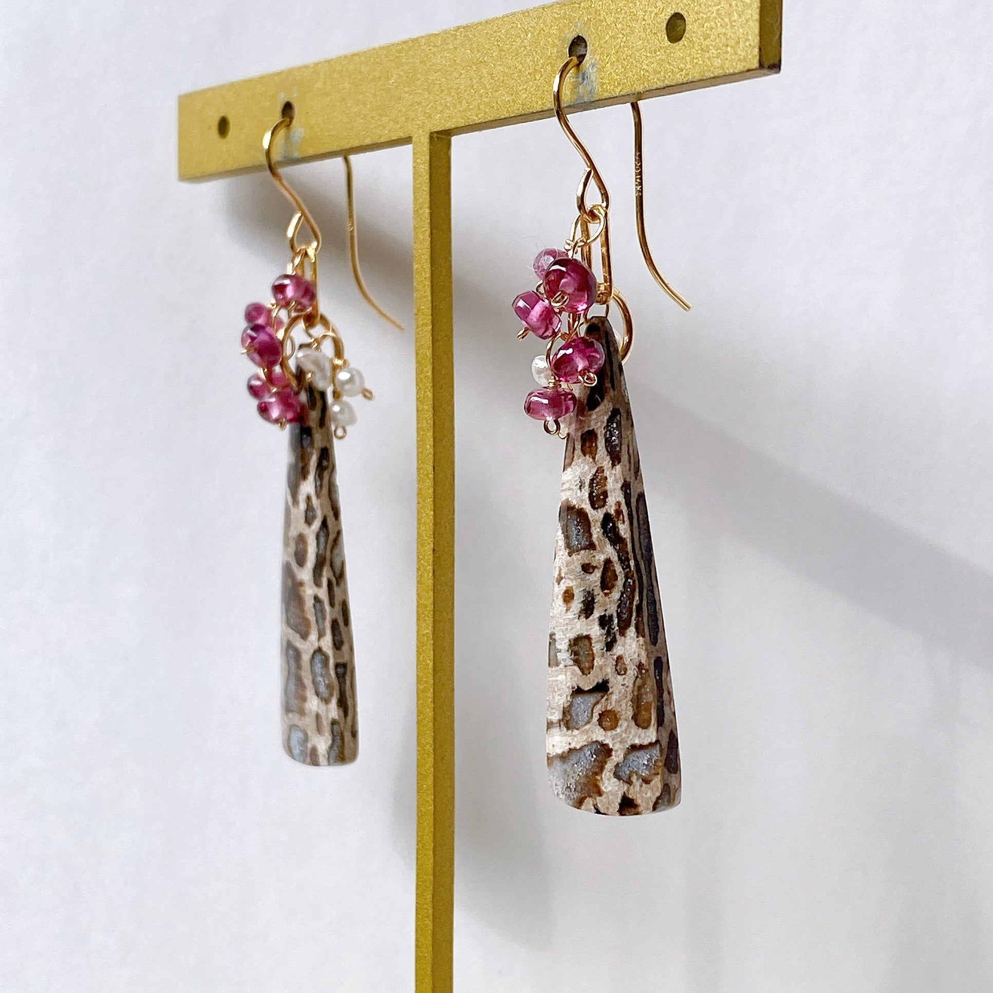 パームルートフォッシルとロードライトガーネット、アコヤケシパールを使ってデザインした耳飾りです。