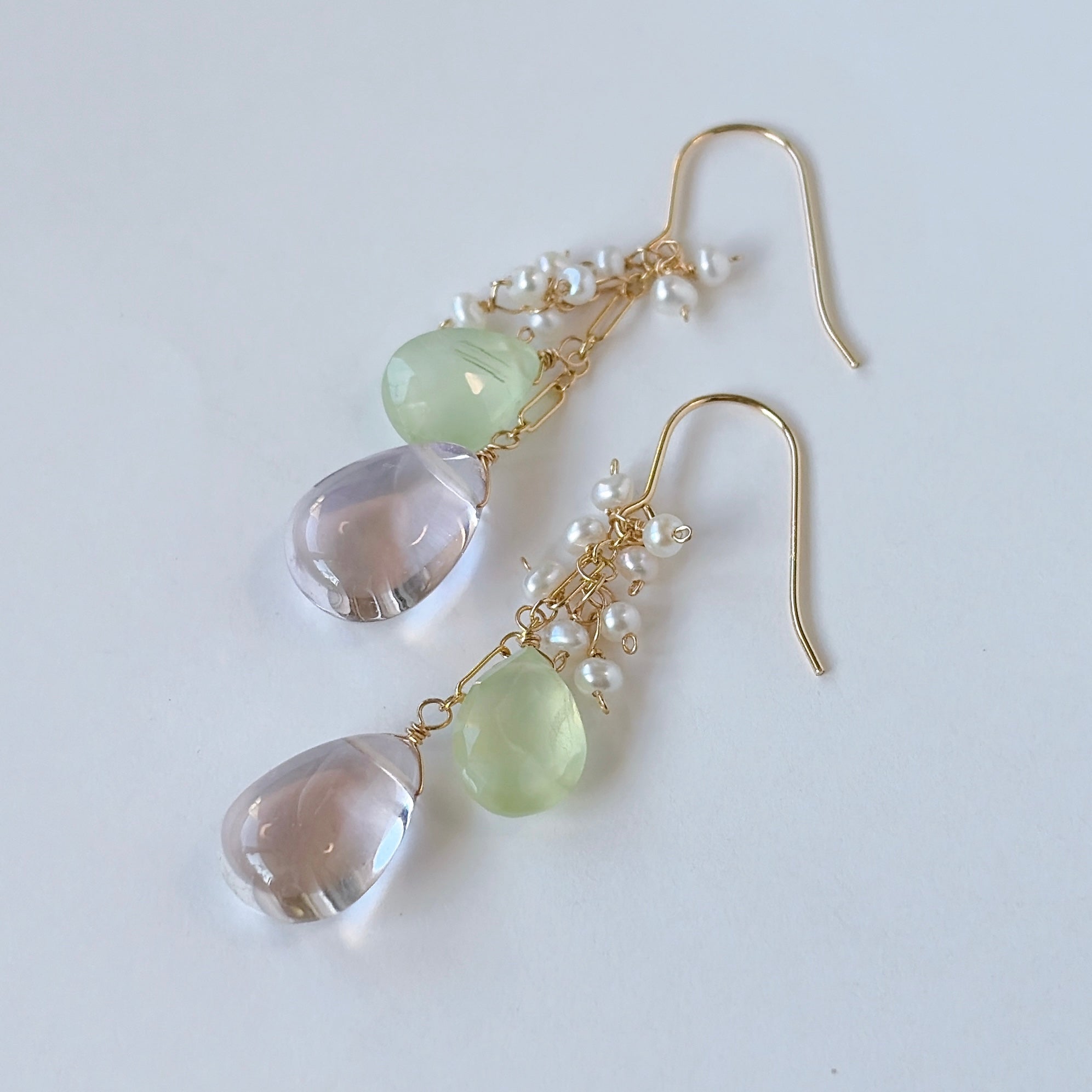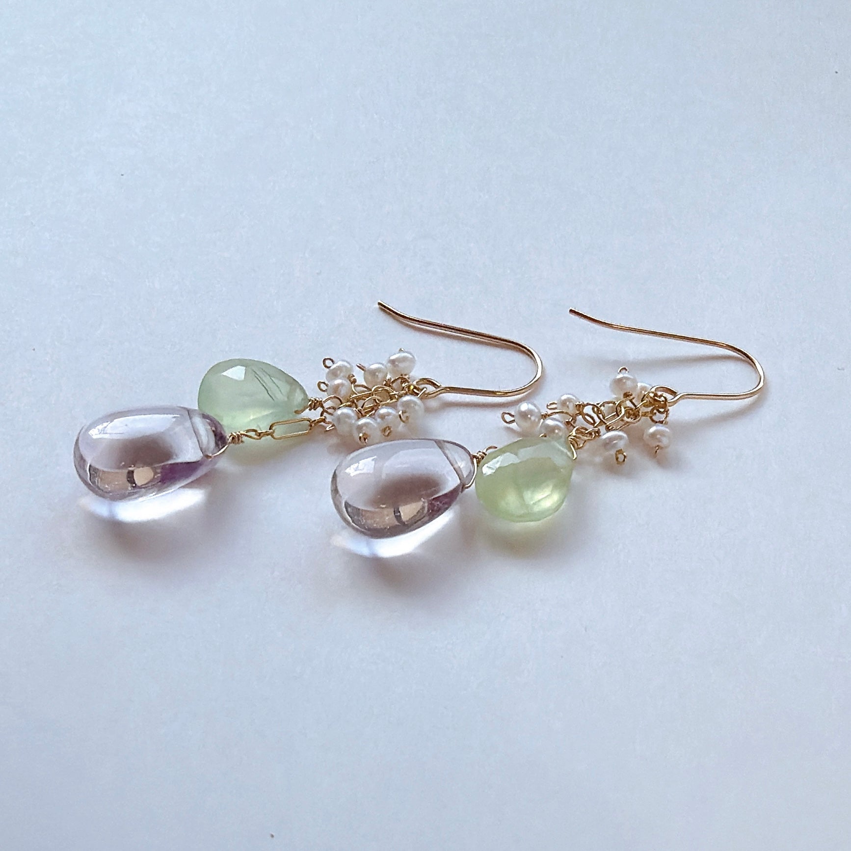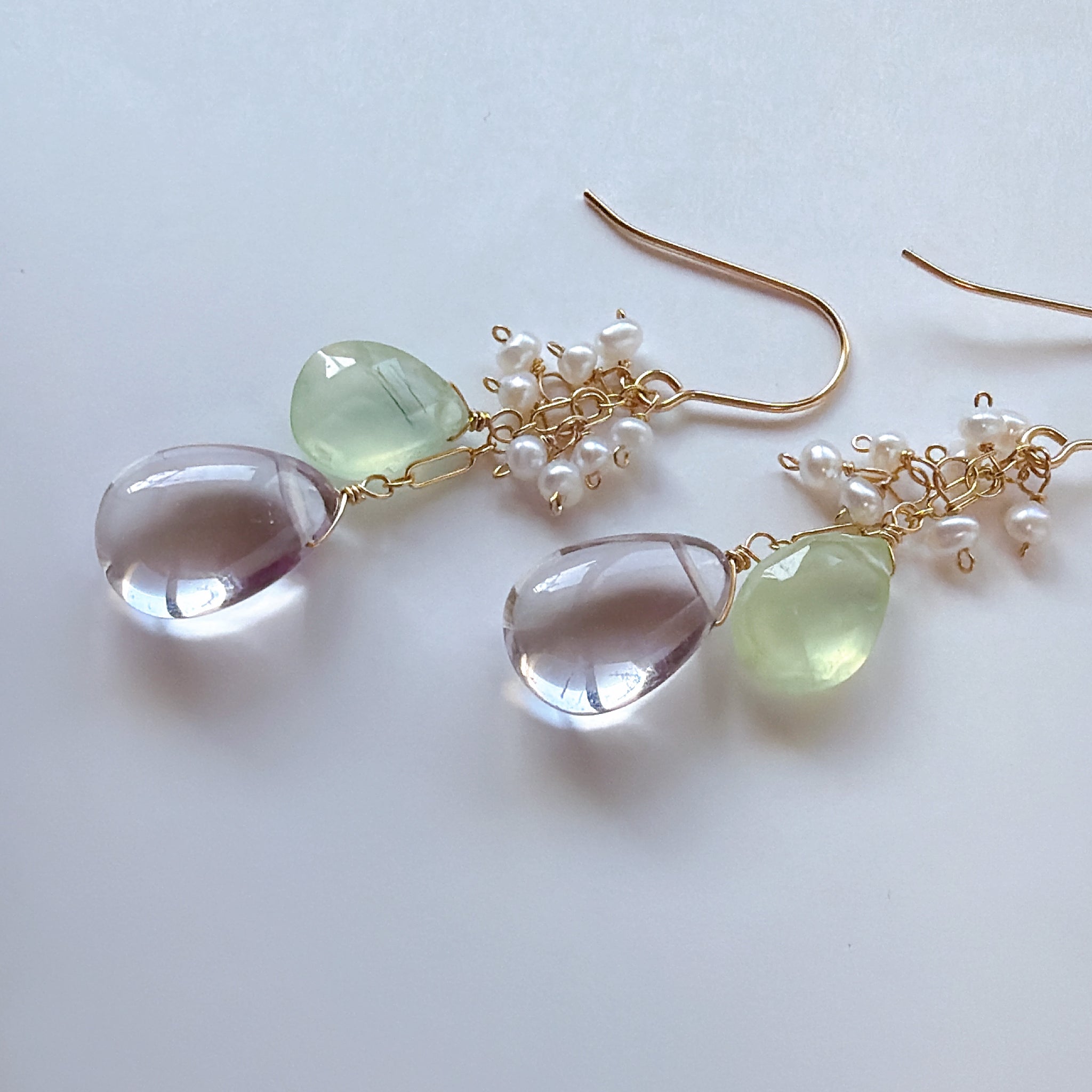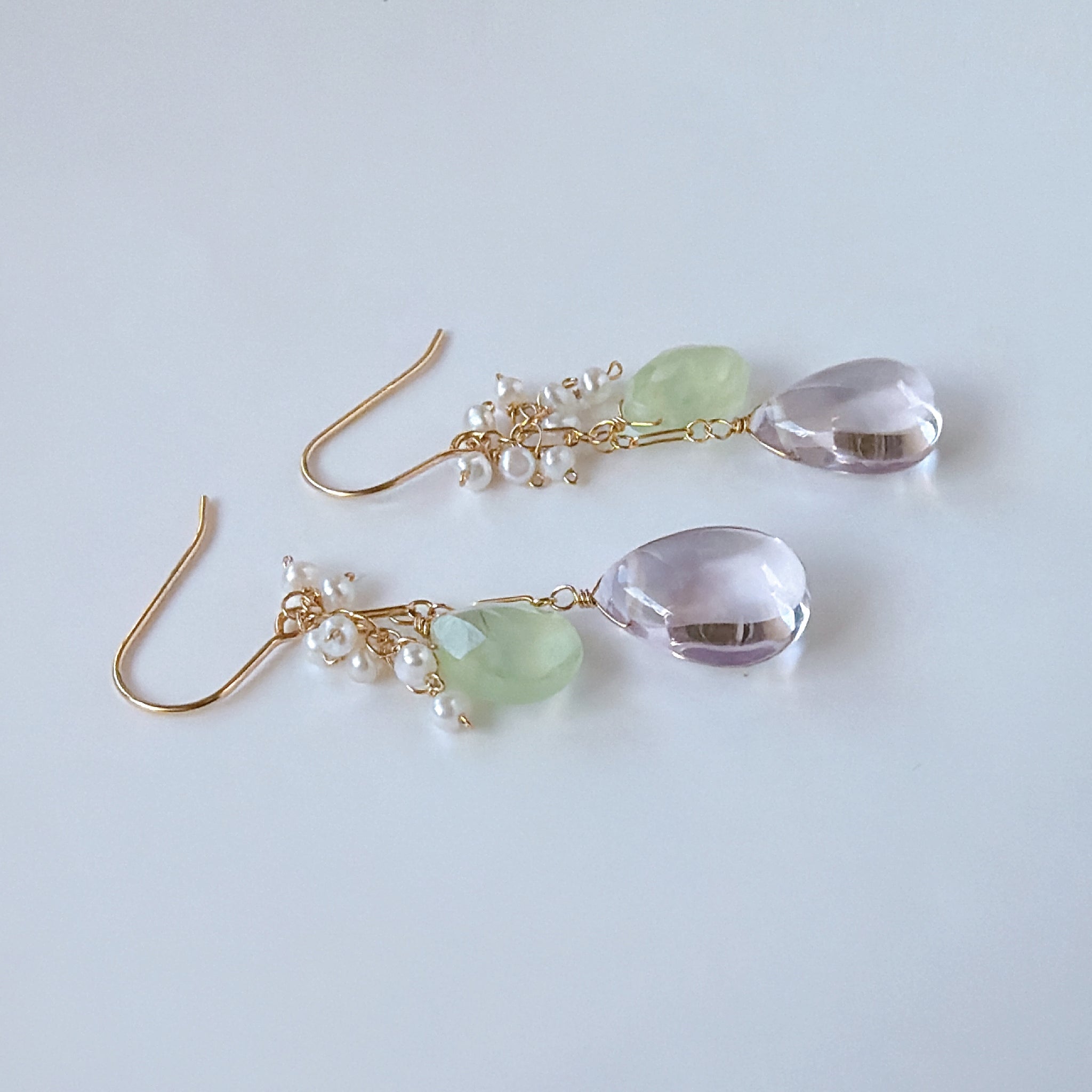ペアシェイプカットのピンクアメジストとプレナイトと小さな淡水パールを使ってデザインしたピアスです。