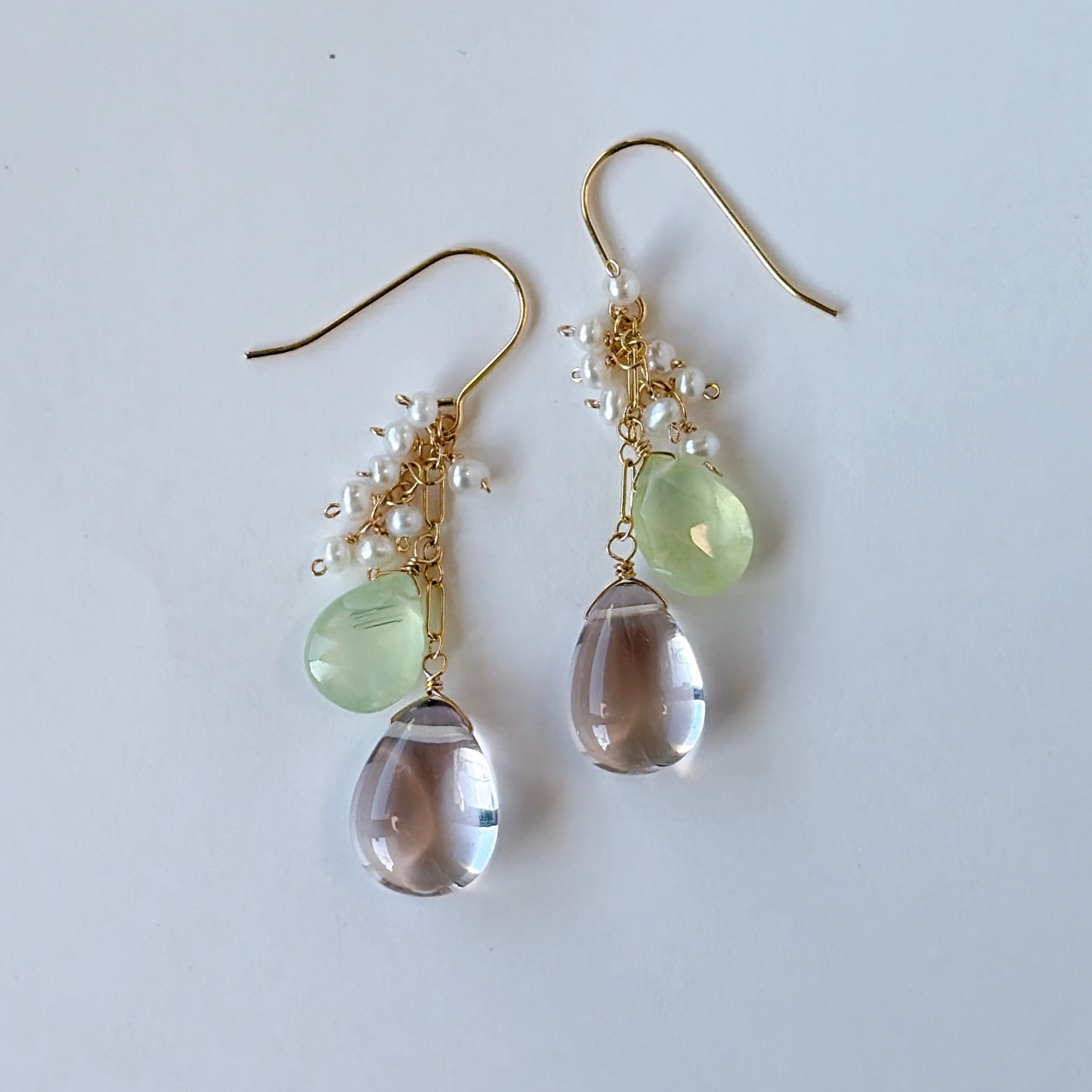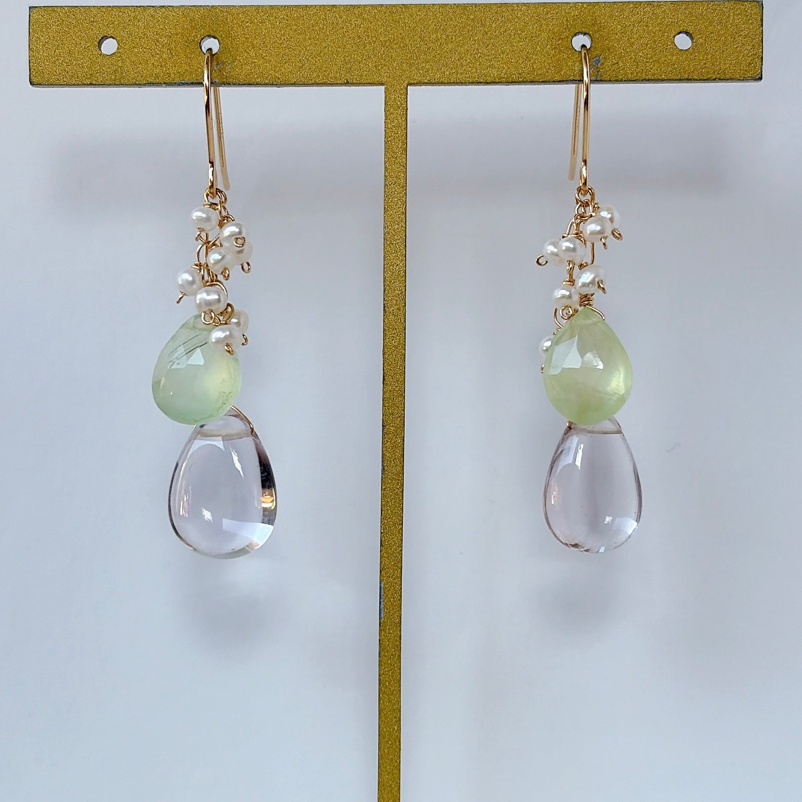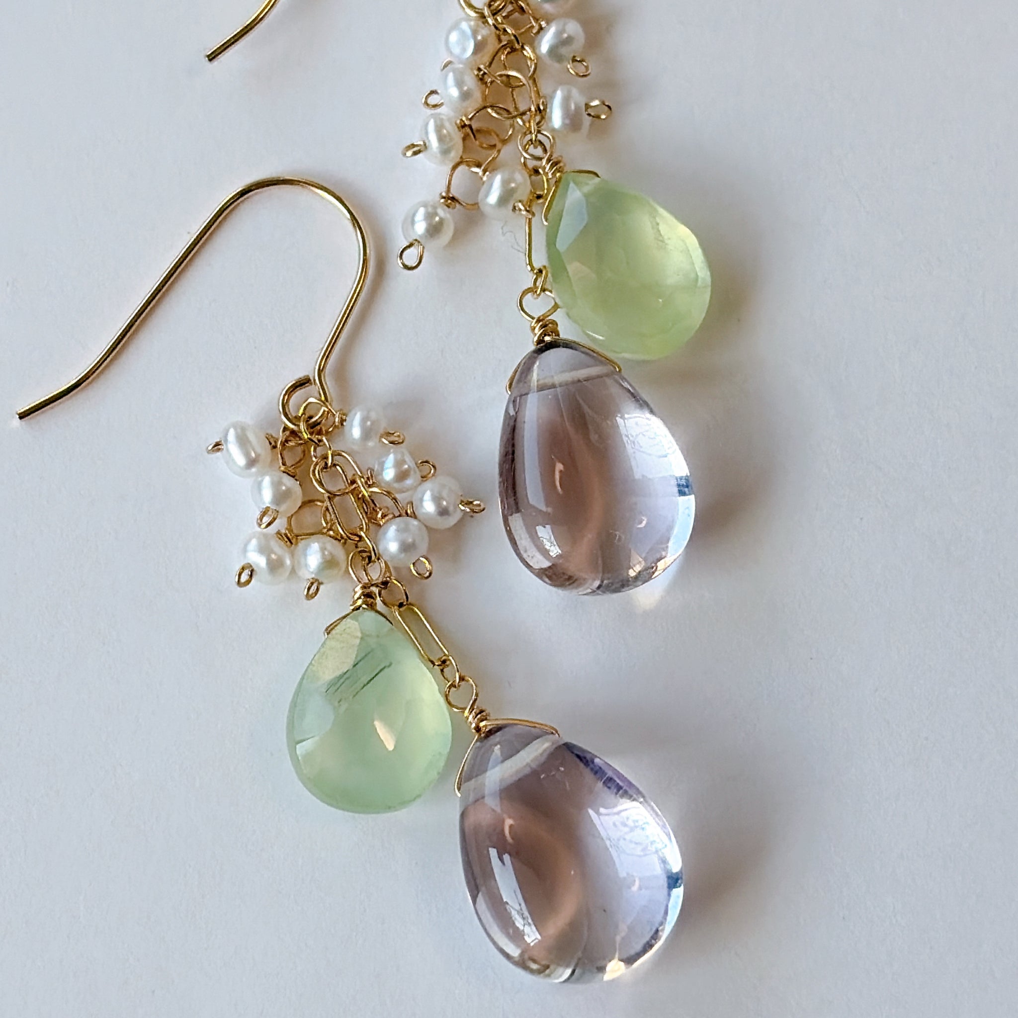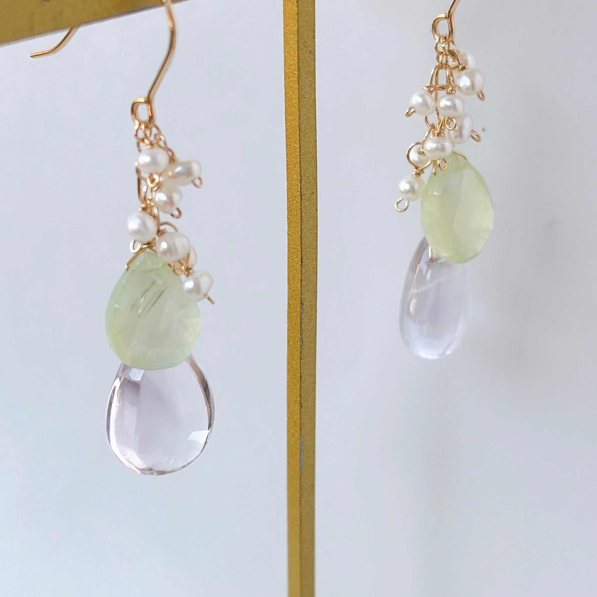 ペアシェイプカットのピンクアメジストとプレナイトと小さな淡水パールを使ってデザインしたピアスです。