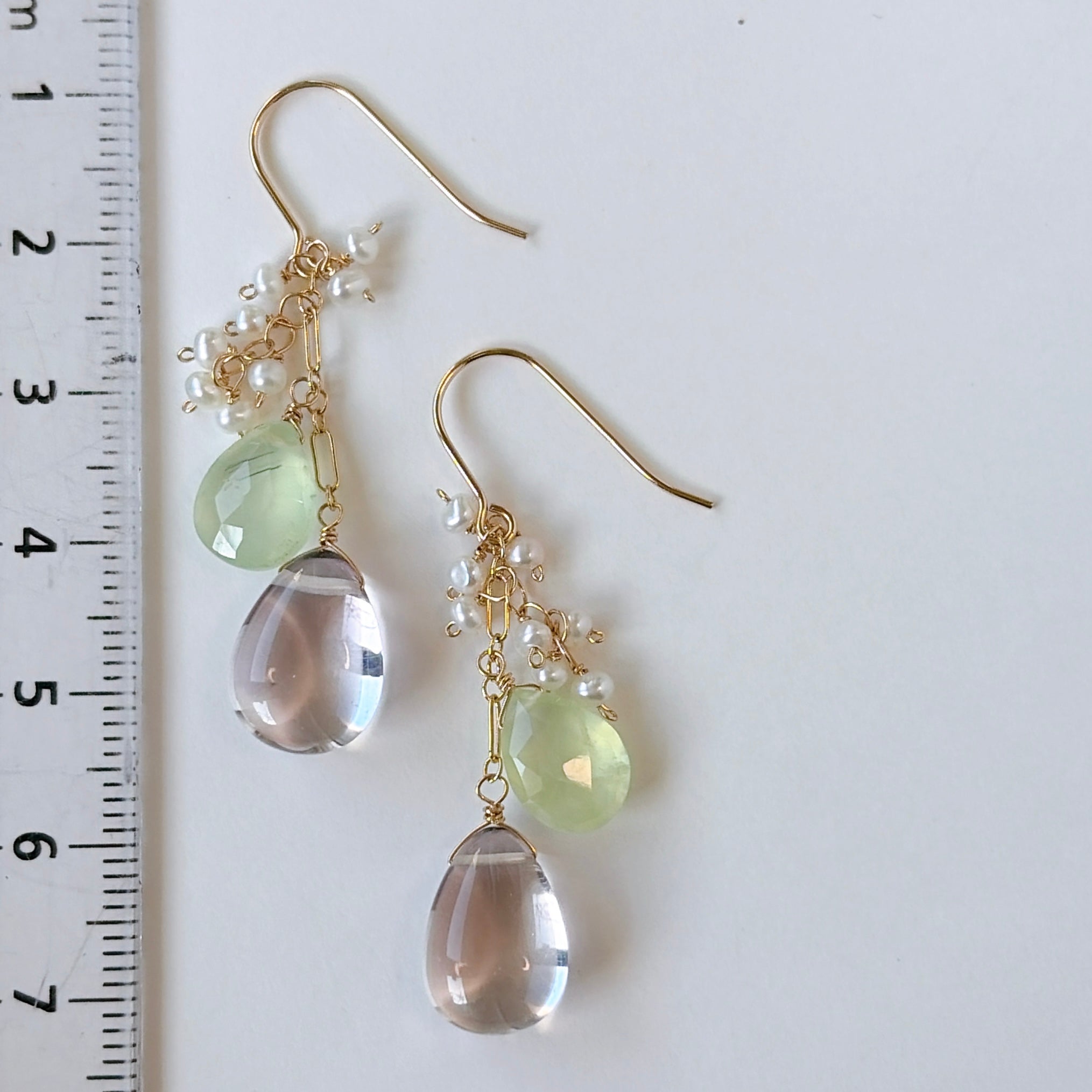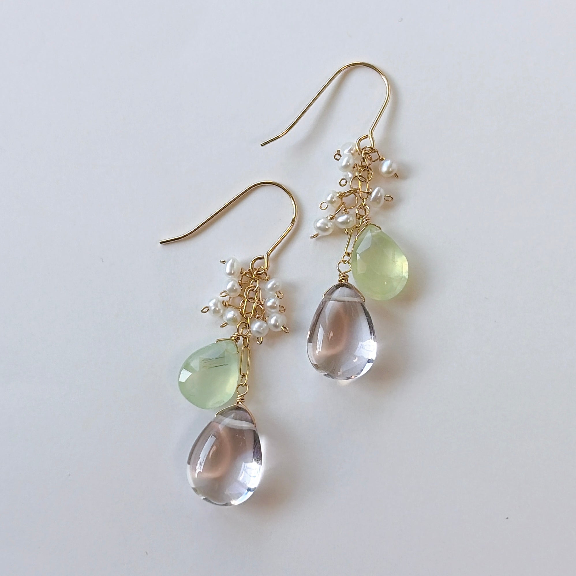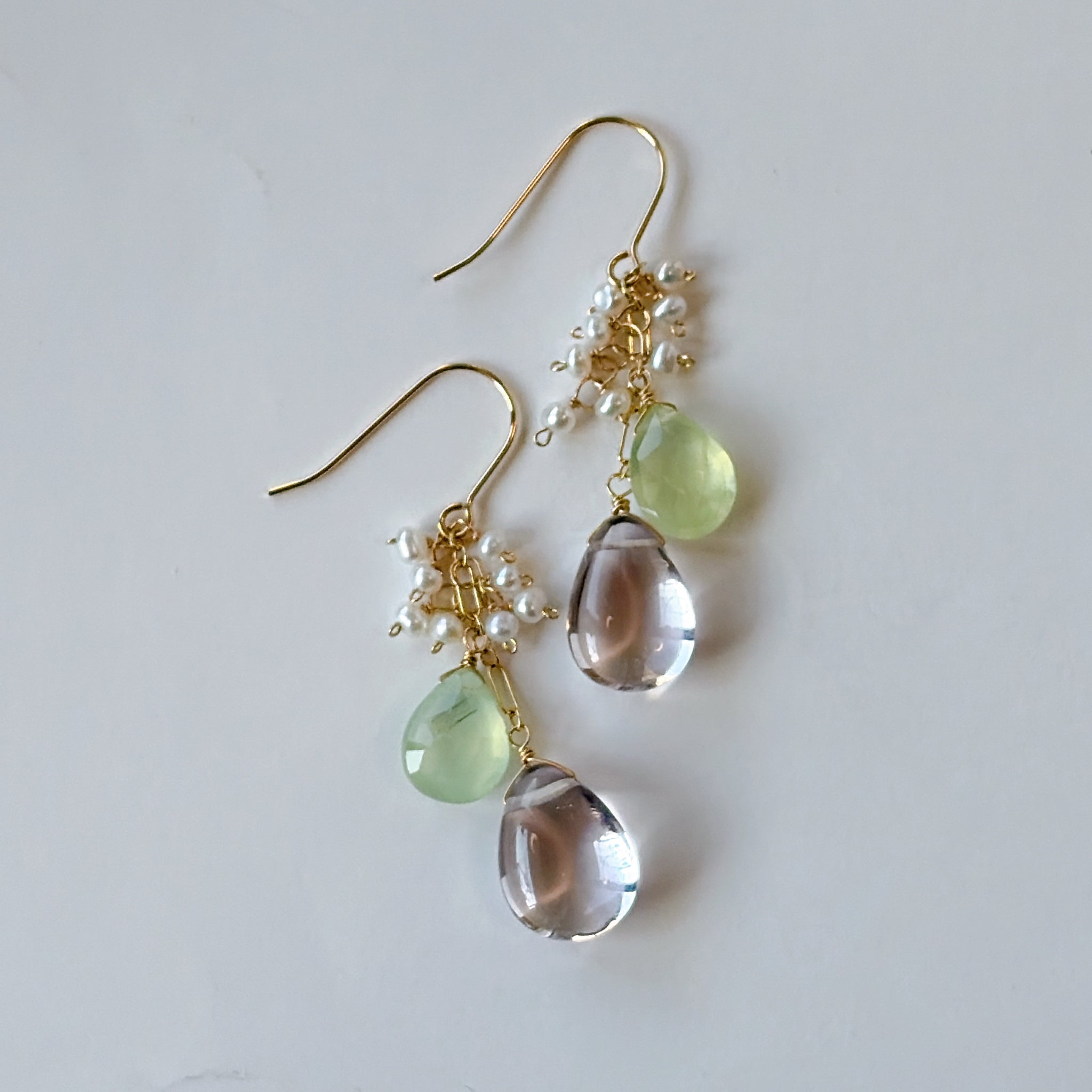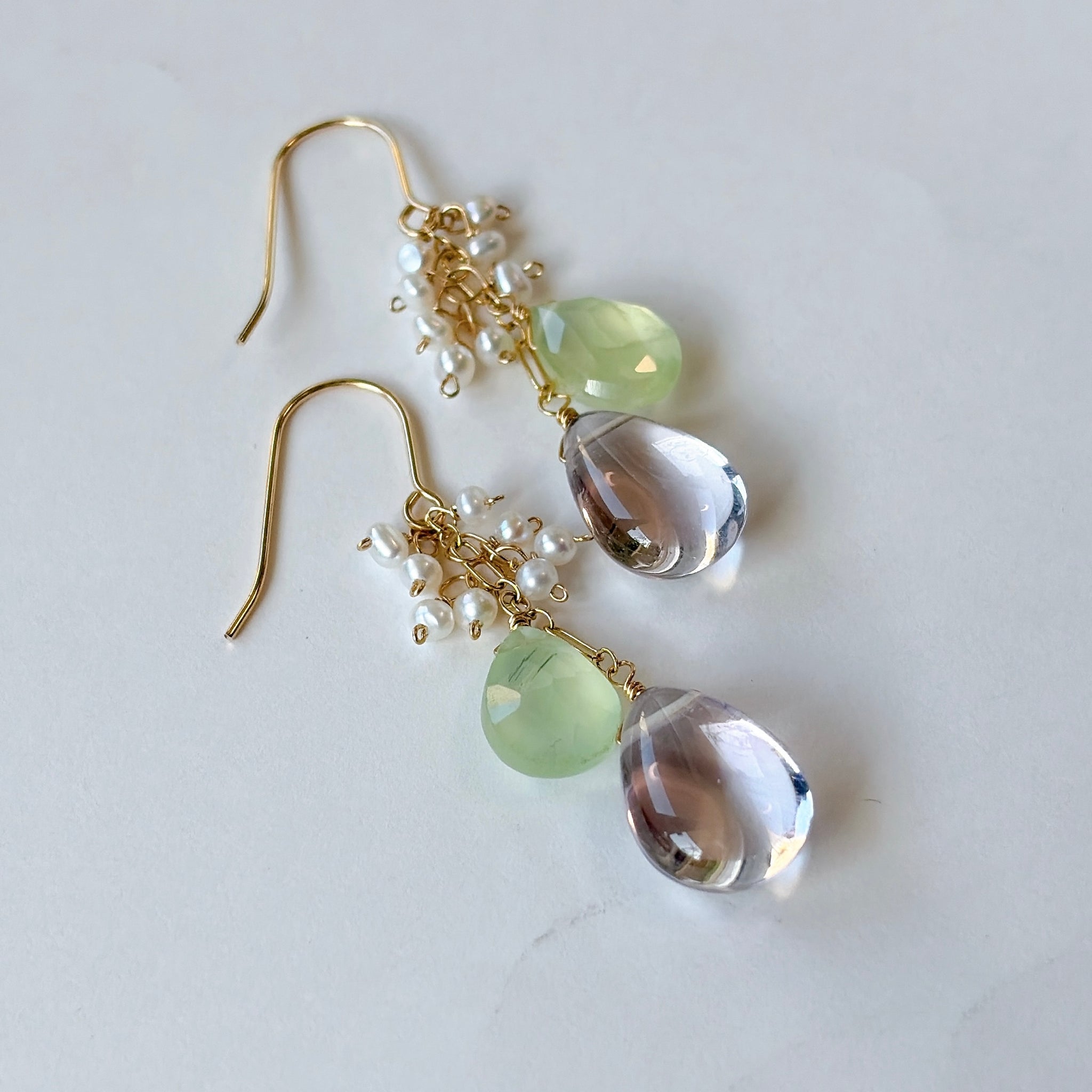 ペアシェイプカットのピンクアメジストとプレナイトと小さな淡水パールを使ってデザインしたピアスです。