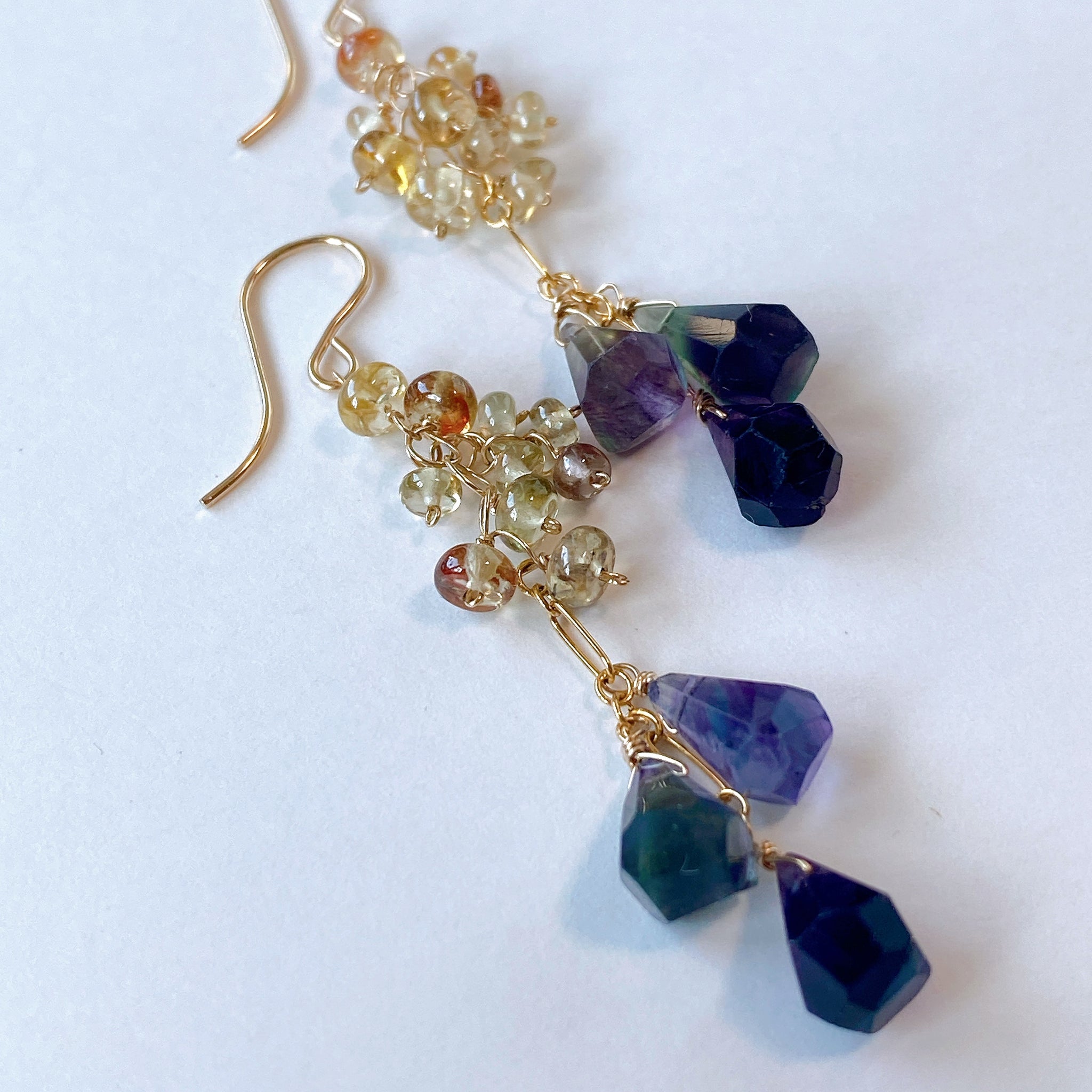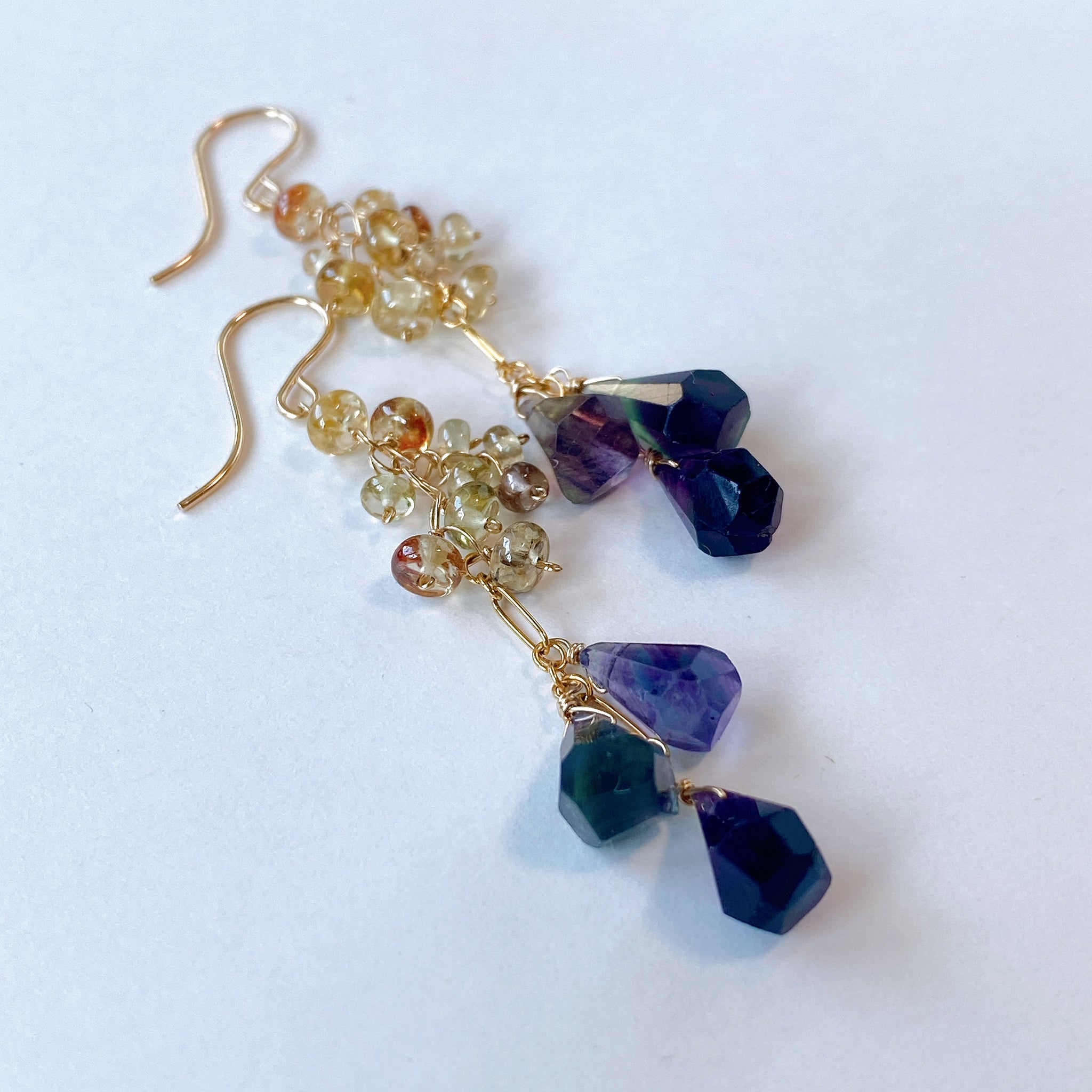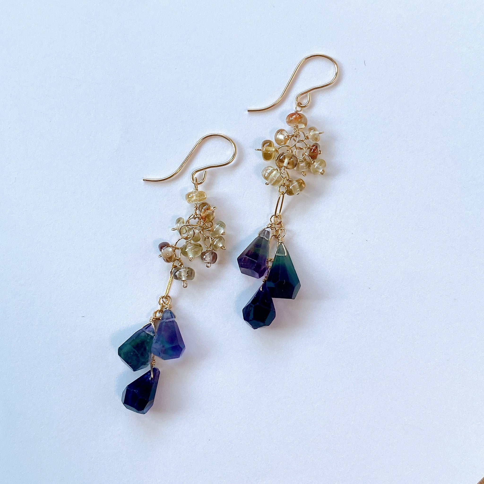 タンブルドロップカットのフローライトとつるんとしたロンデルカットのジルコンを使ってデザインした耳飾りです。