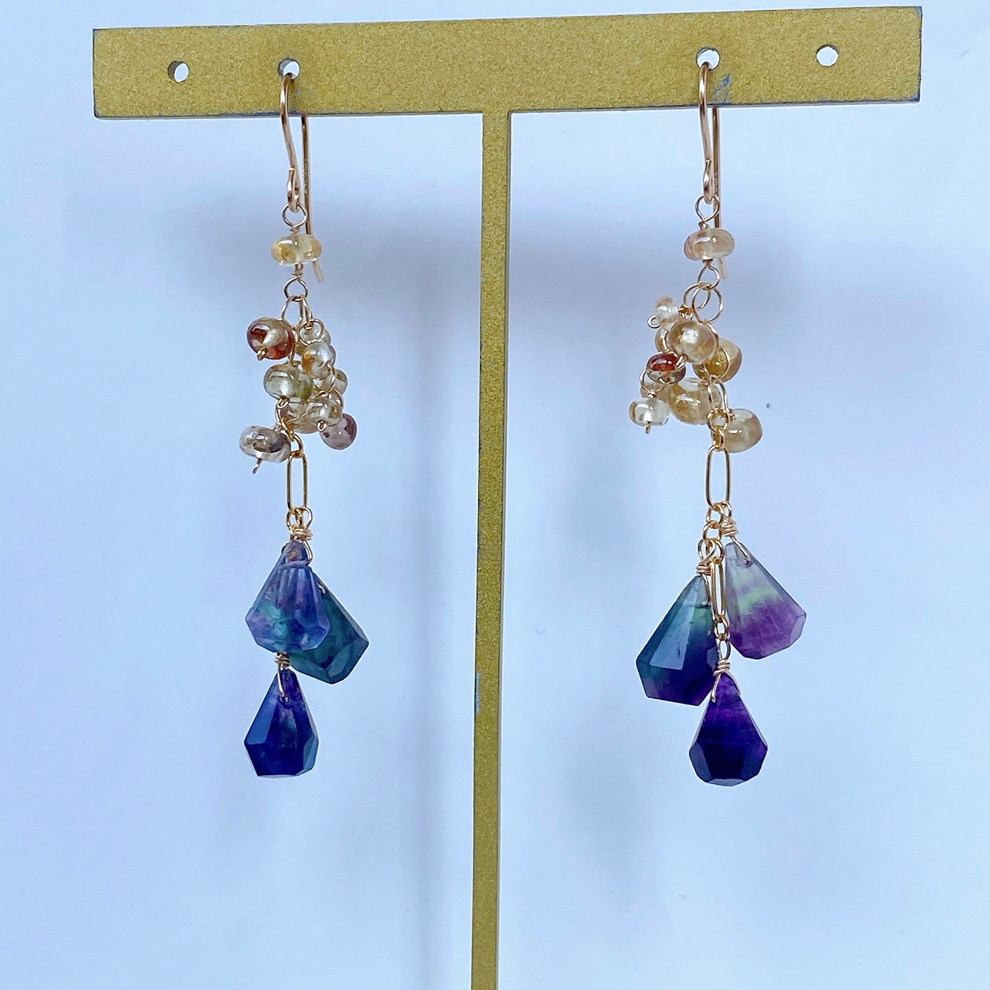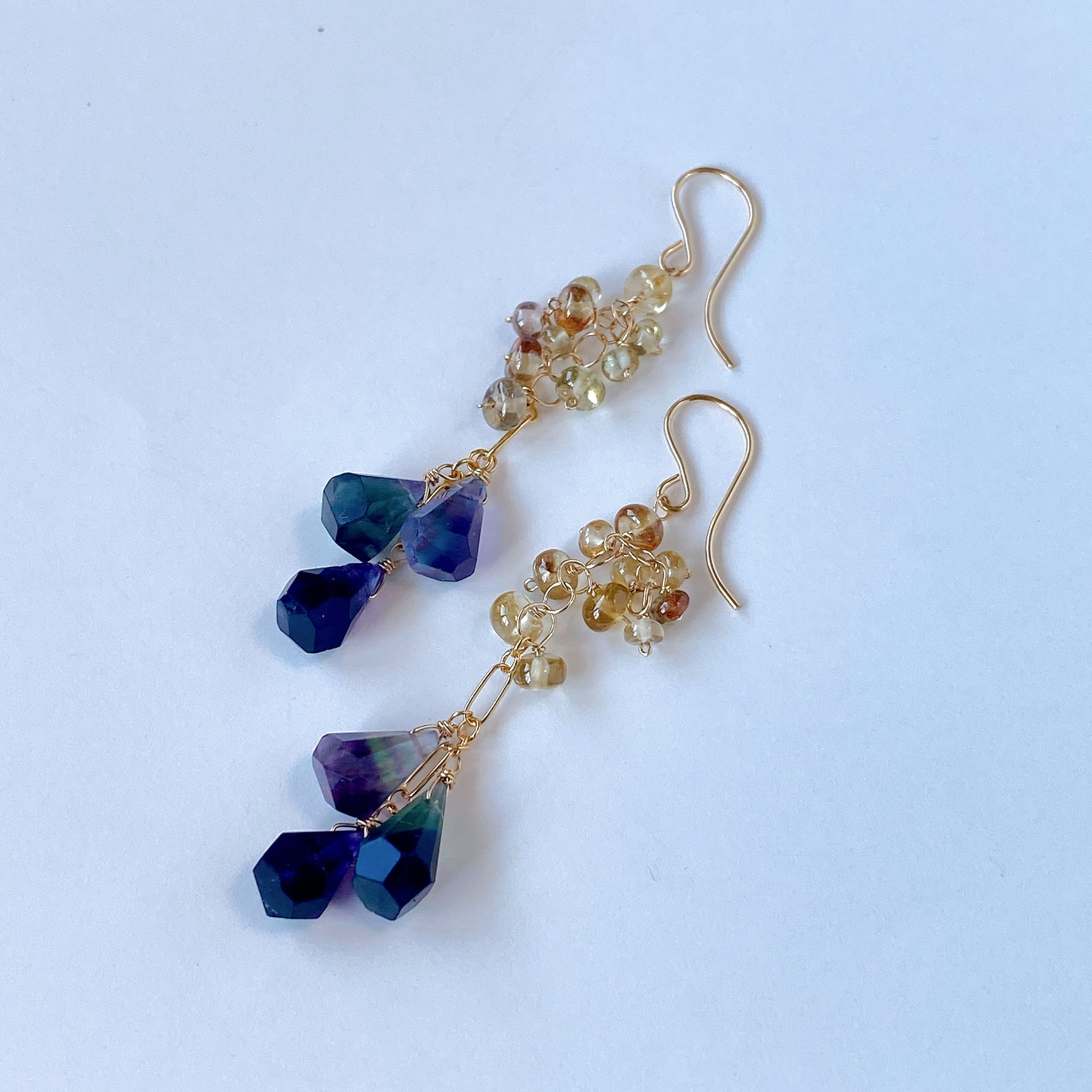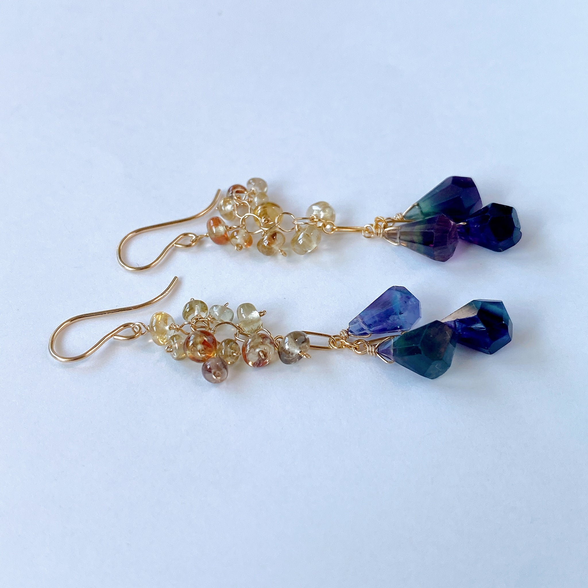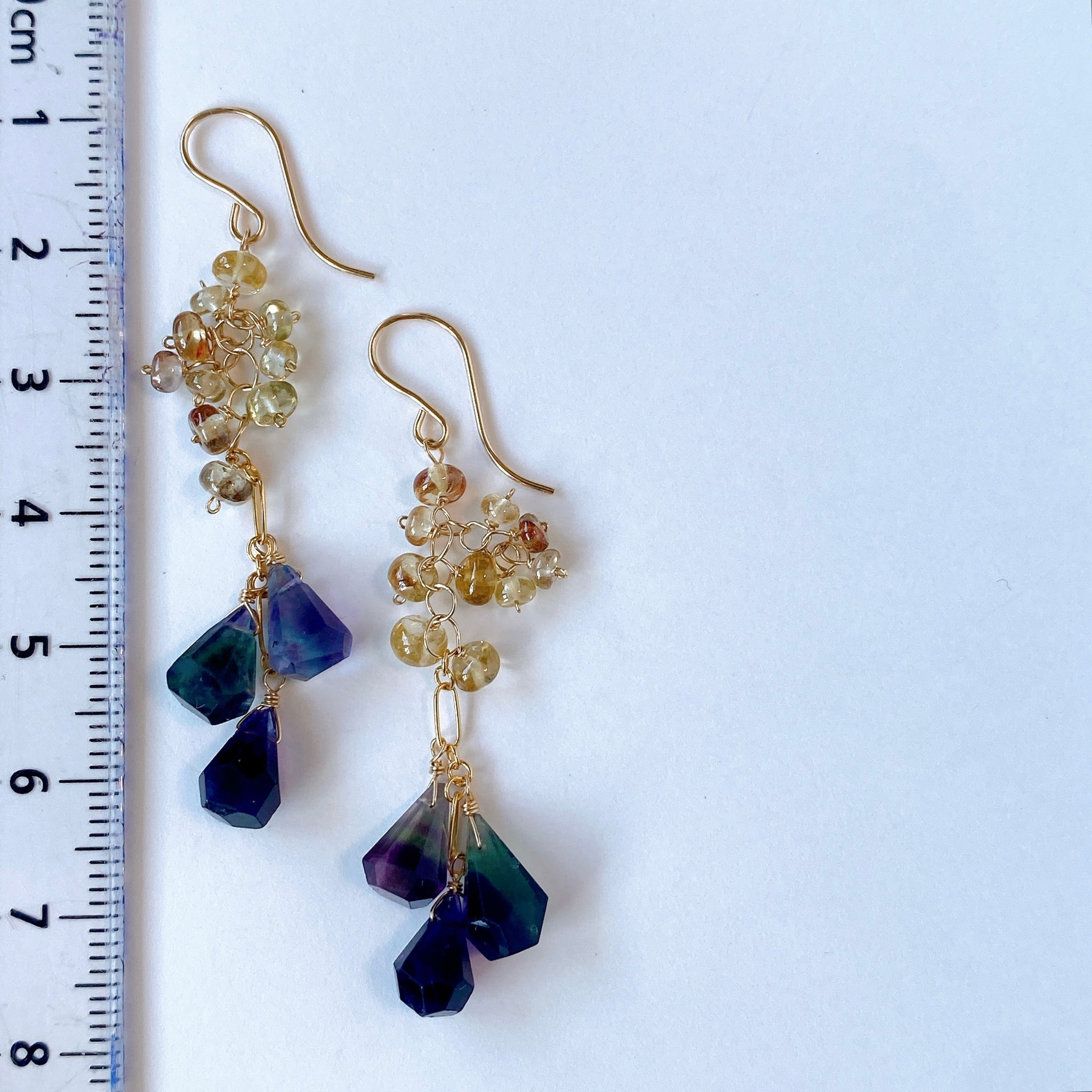 タンブルドロップカットのフローライトとつるんとしたロンデルカットのジルコンを使ってデザインした耳飾りです。