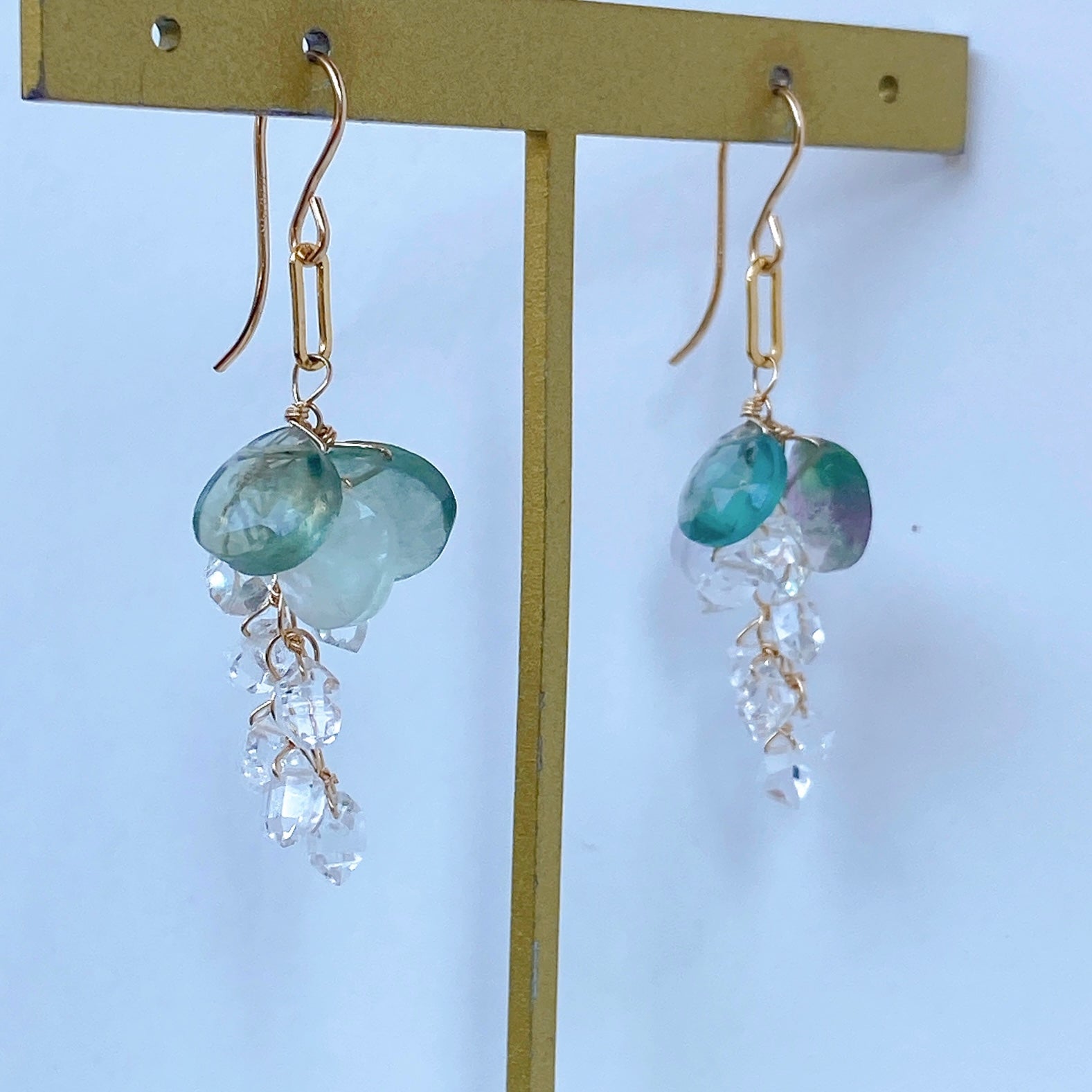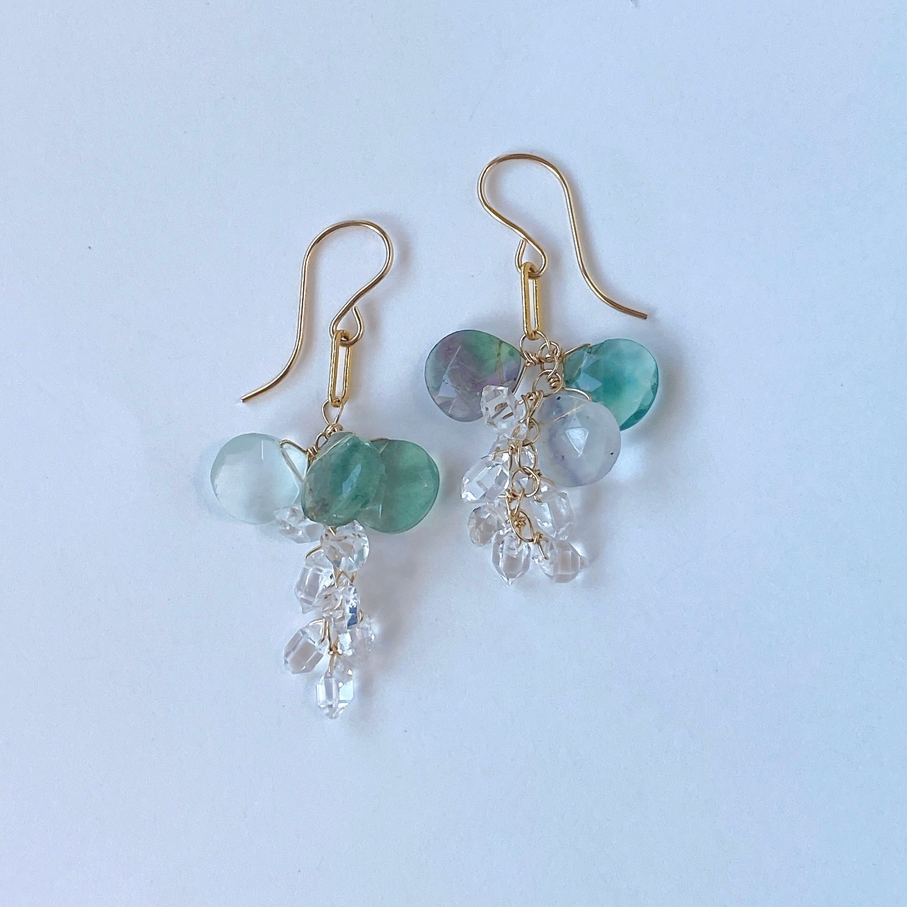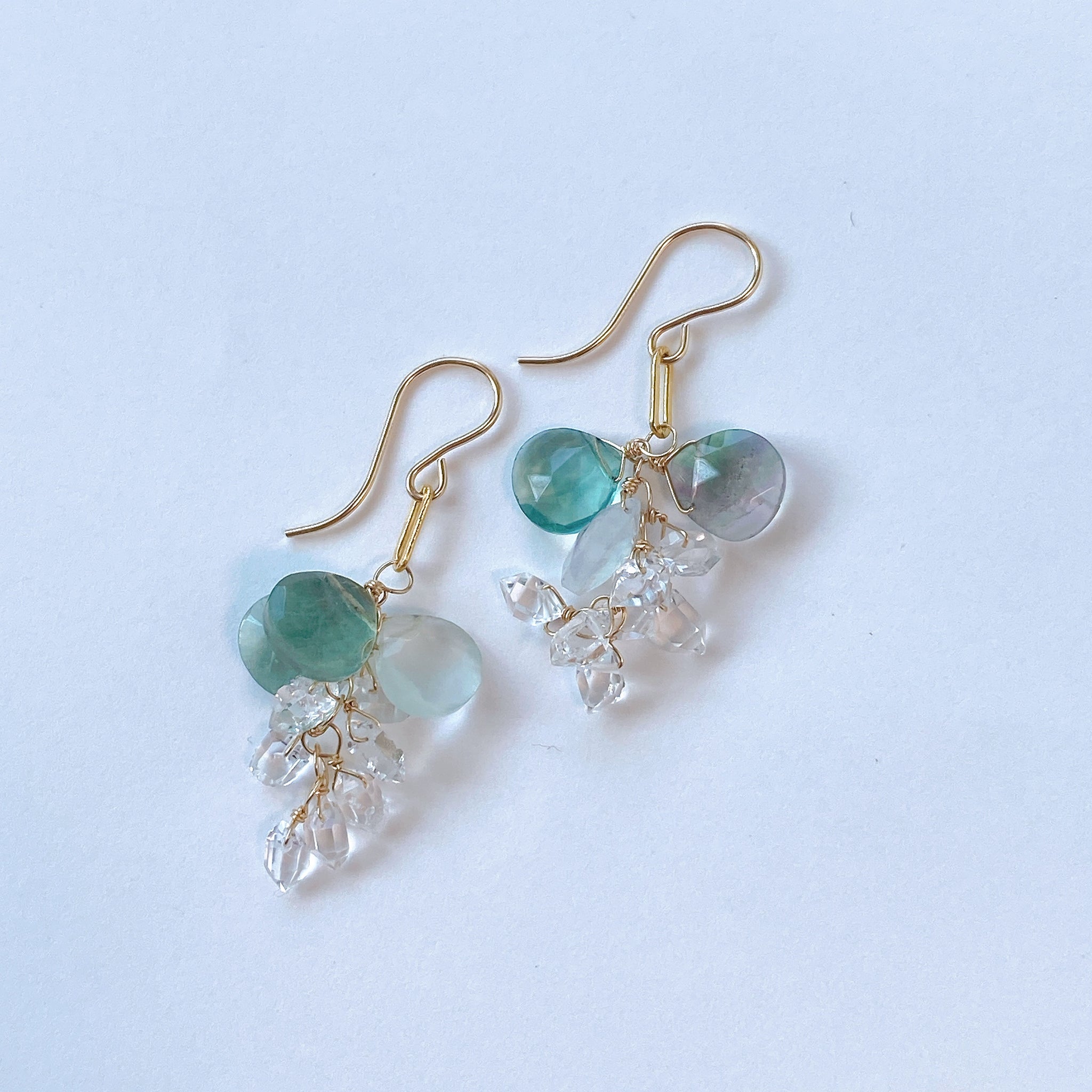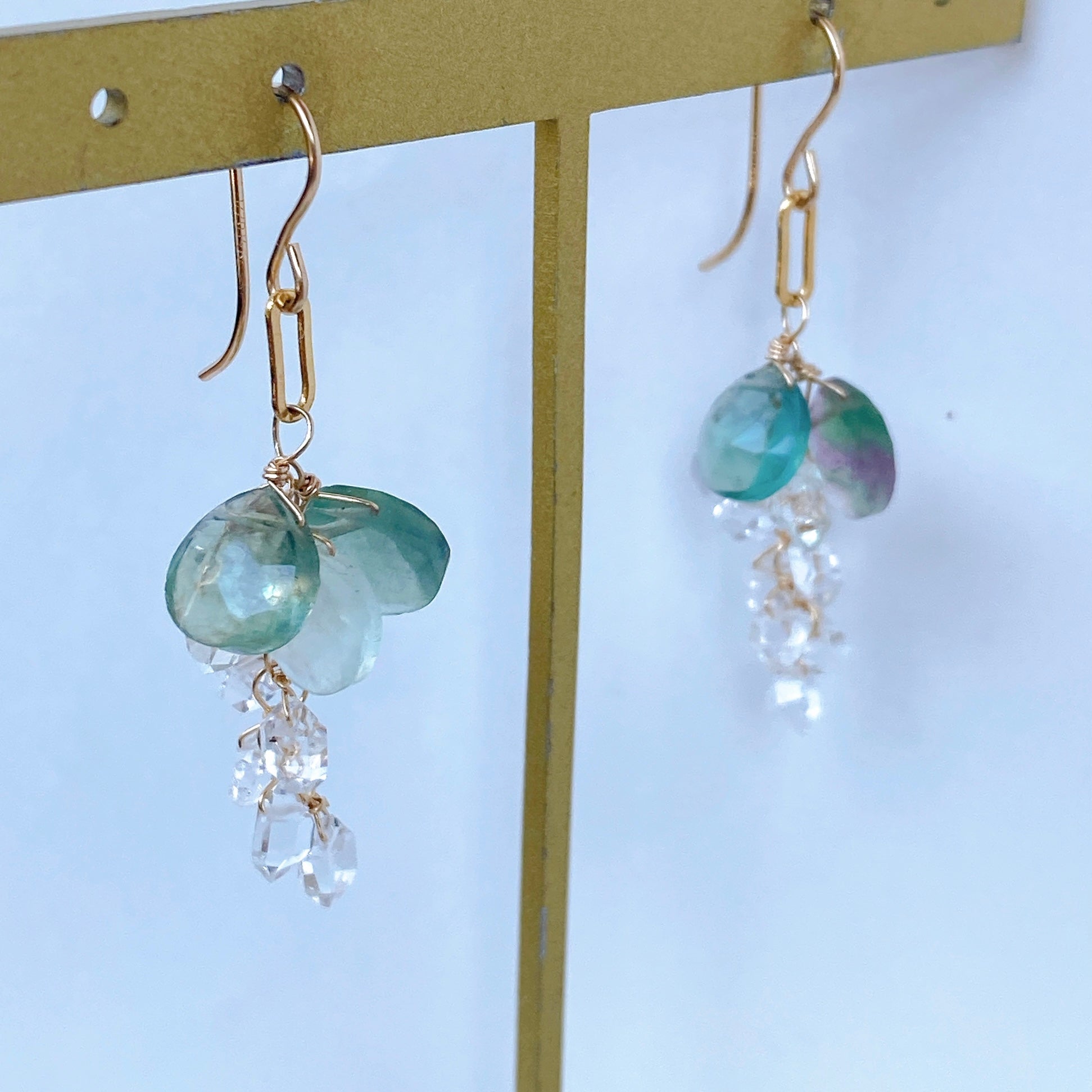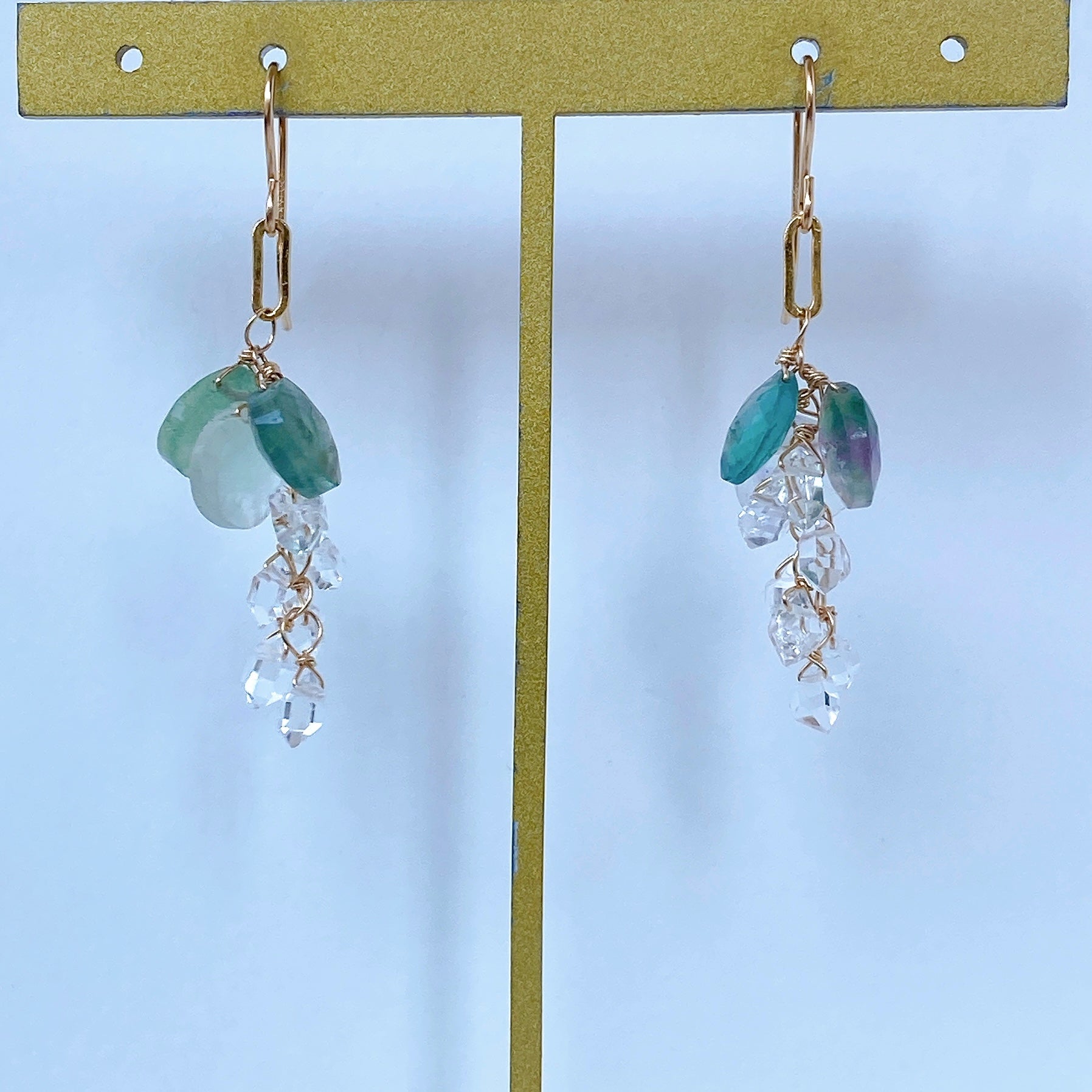 マロンカットのフローライトとハーキマークォーツを使ってデザインした耳飾りです。