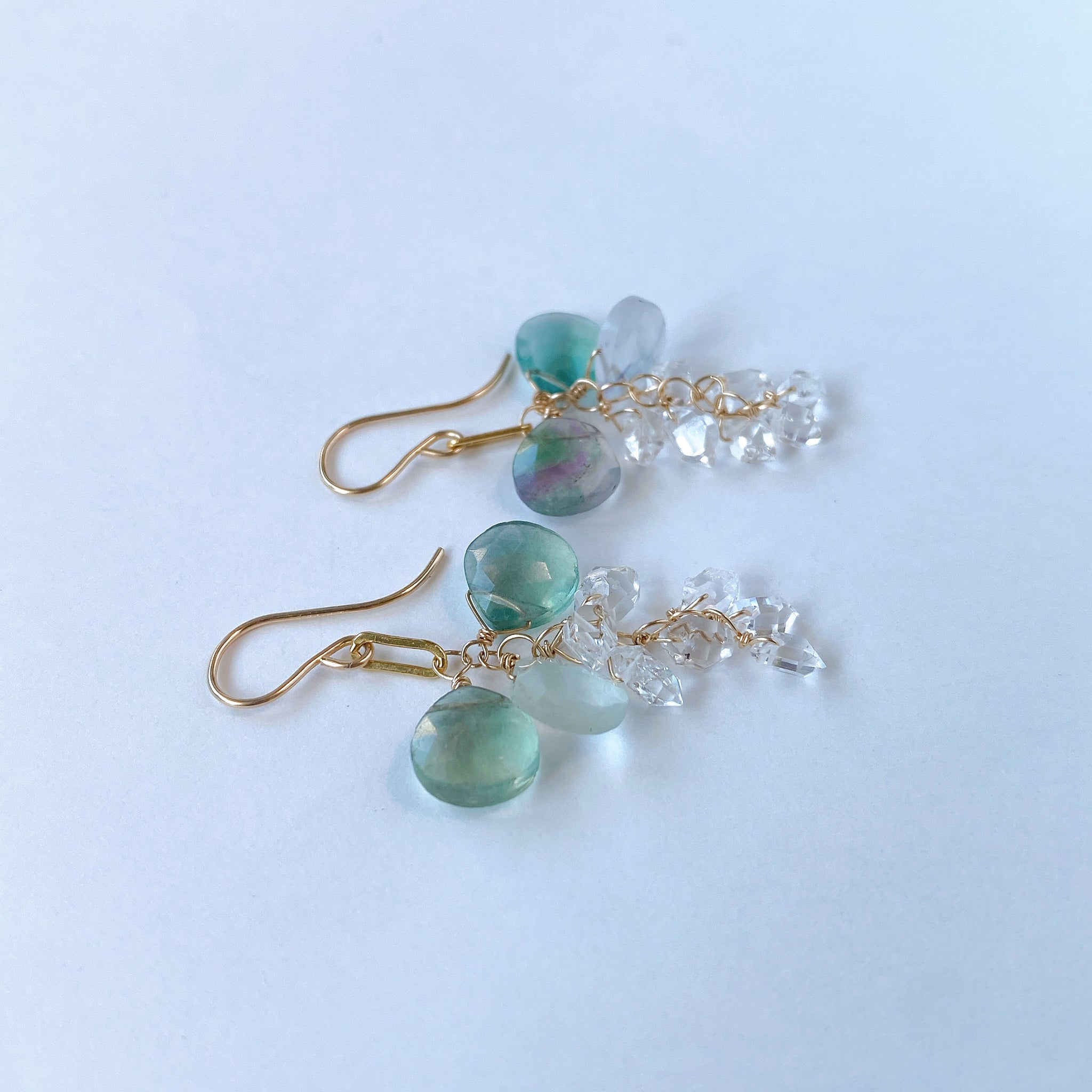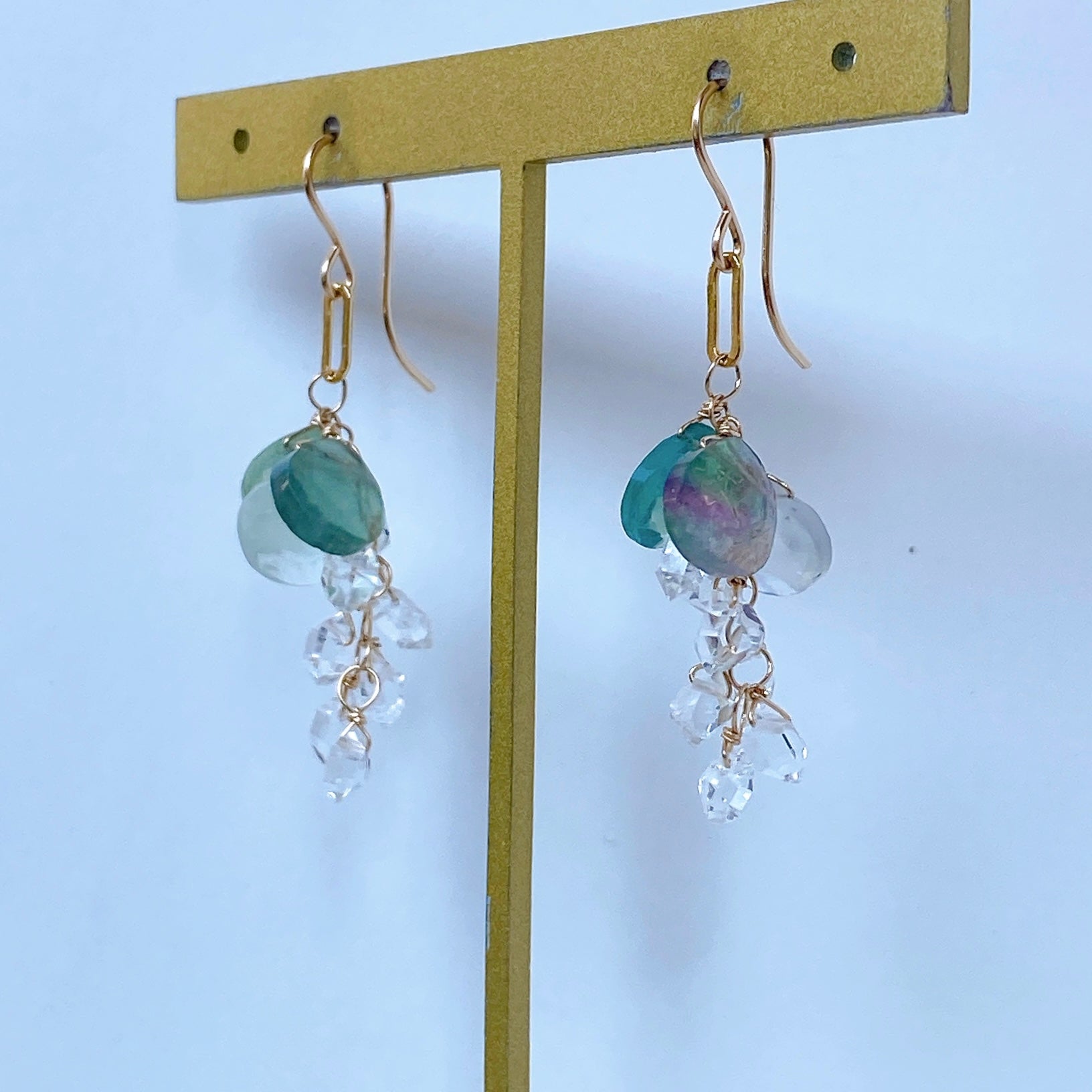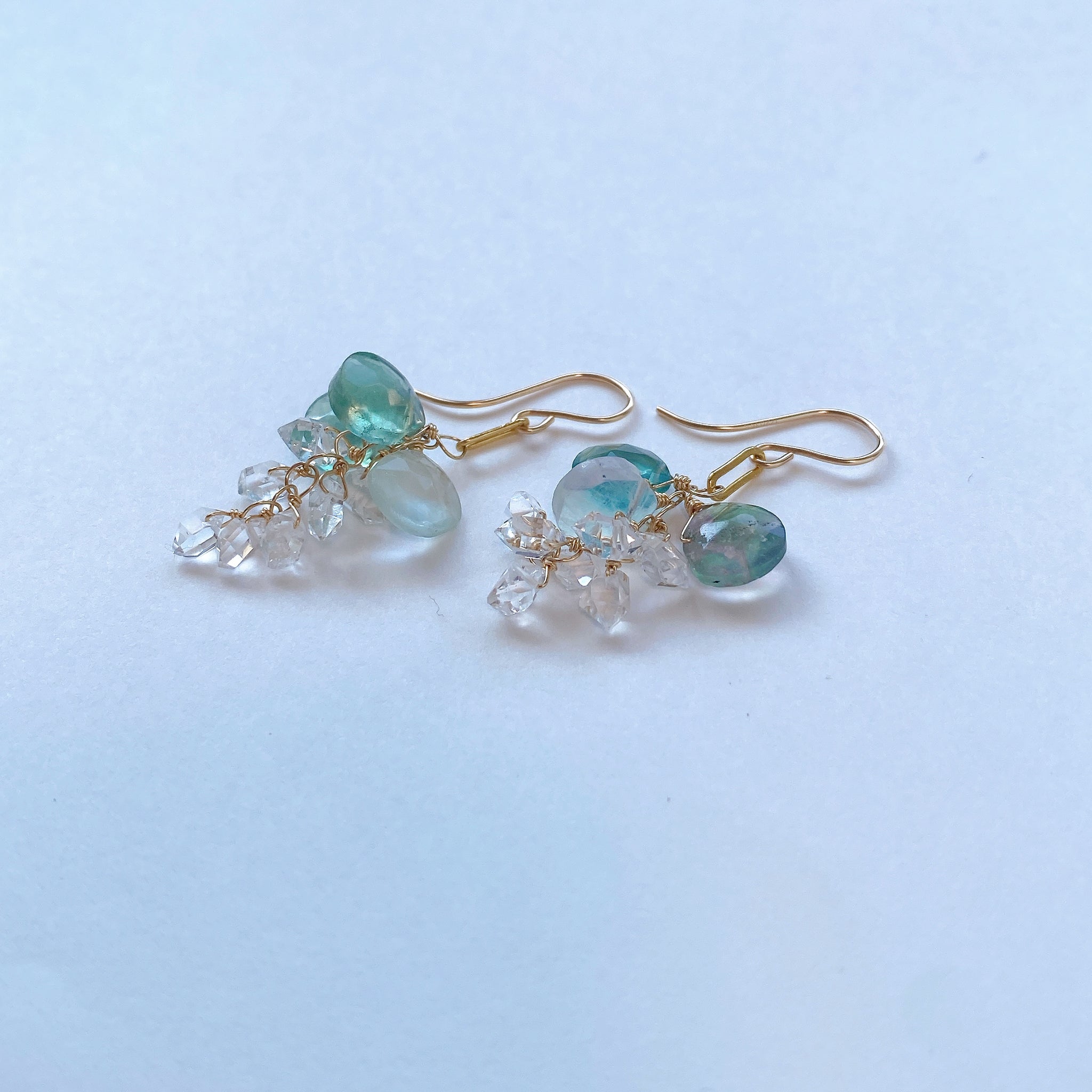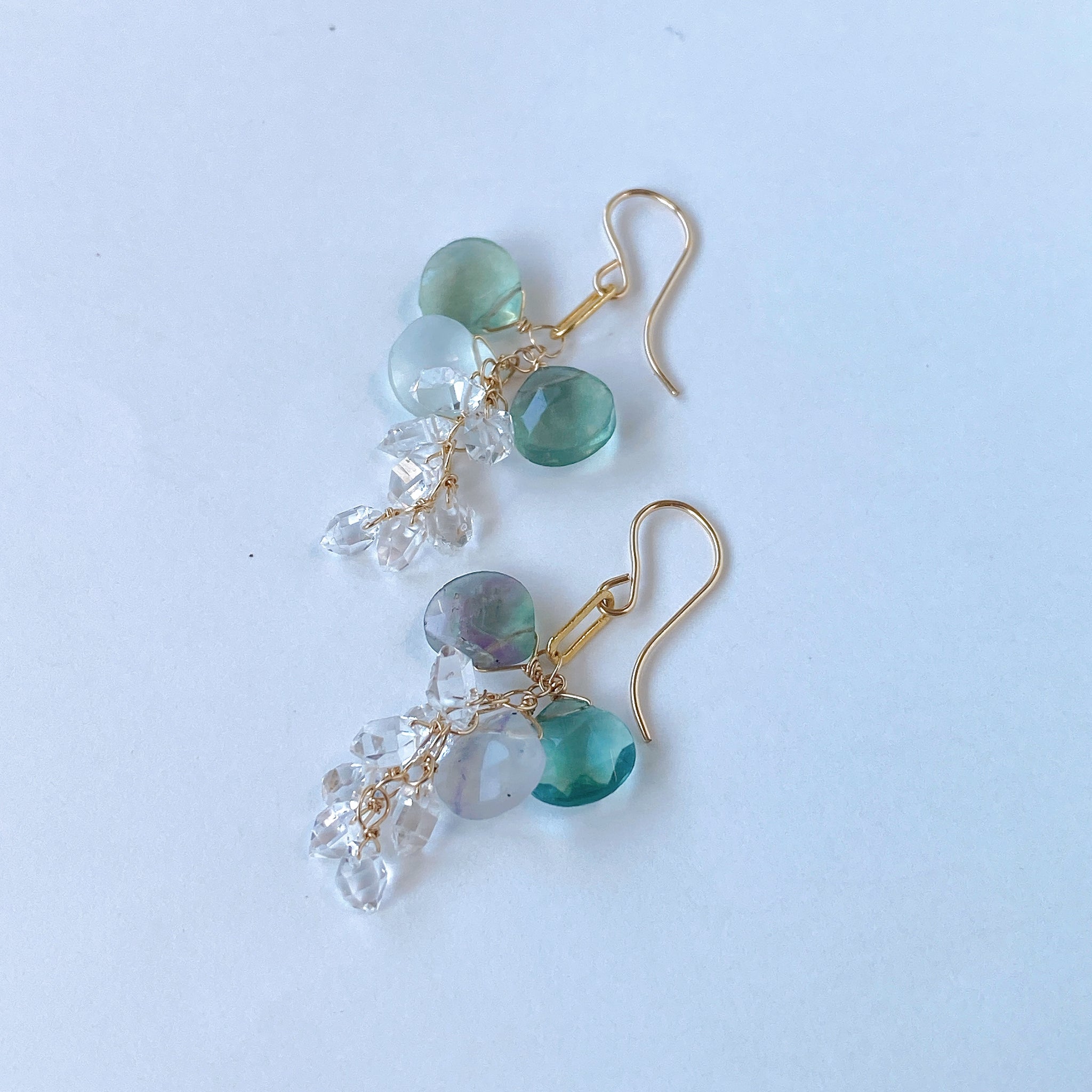マロンカットのフローライトとハーキマークォーツを使ってデザインした耳飾りです。