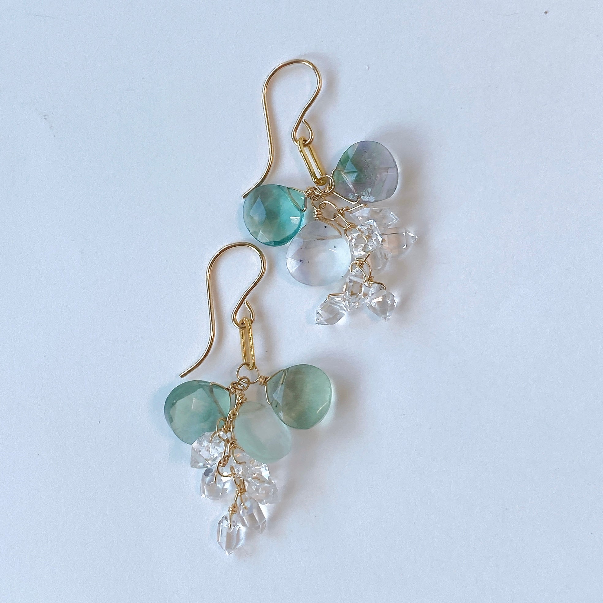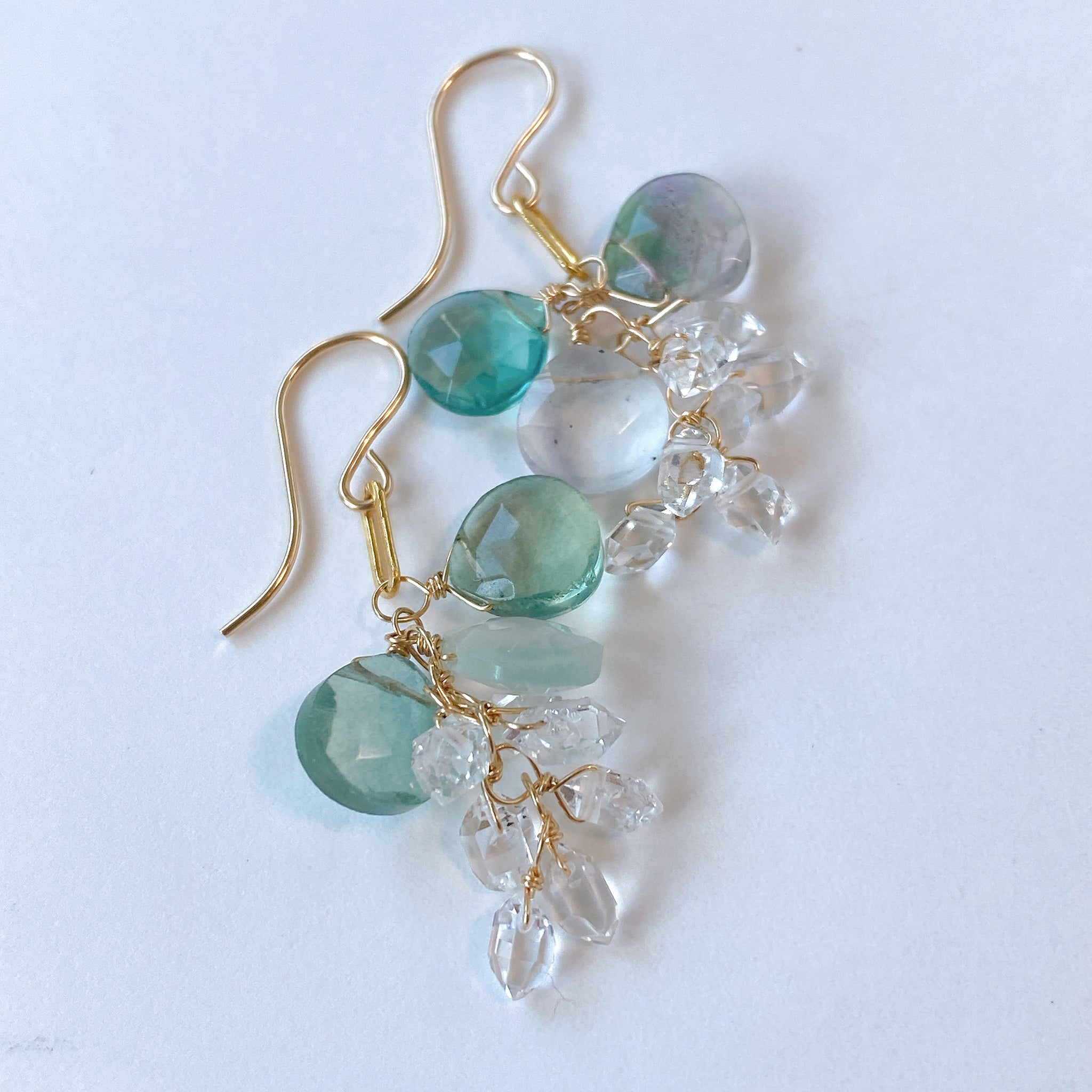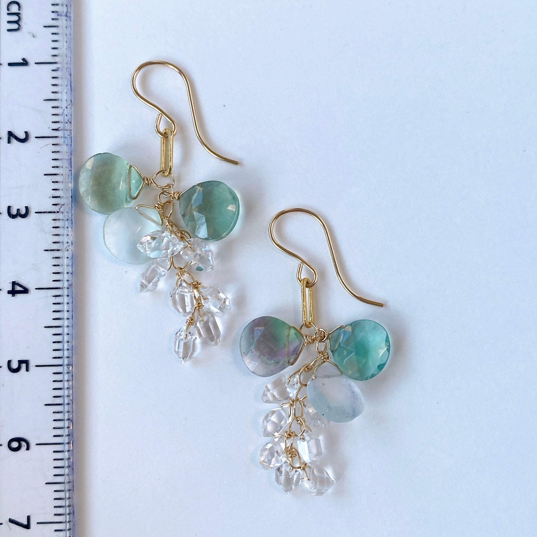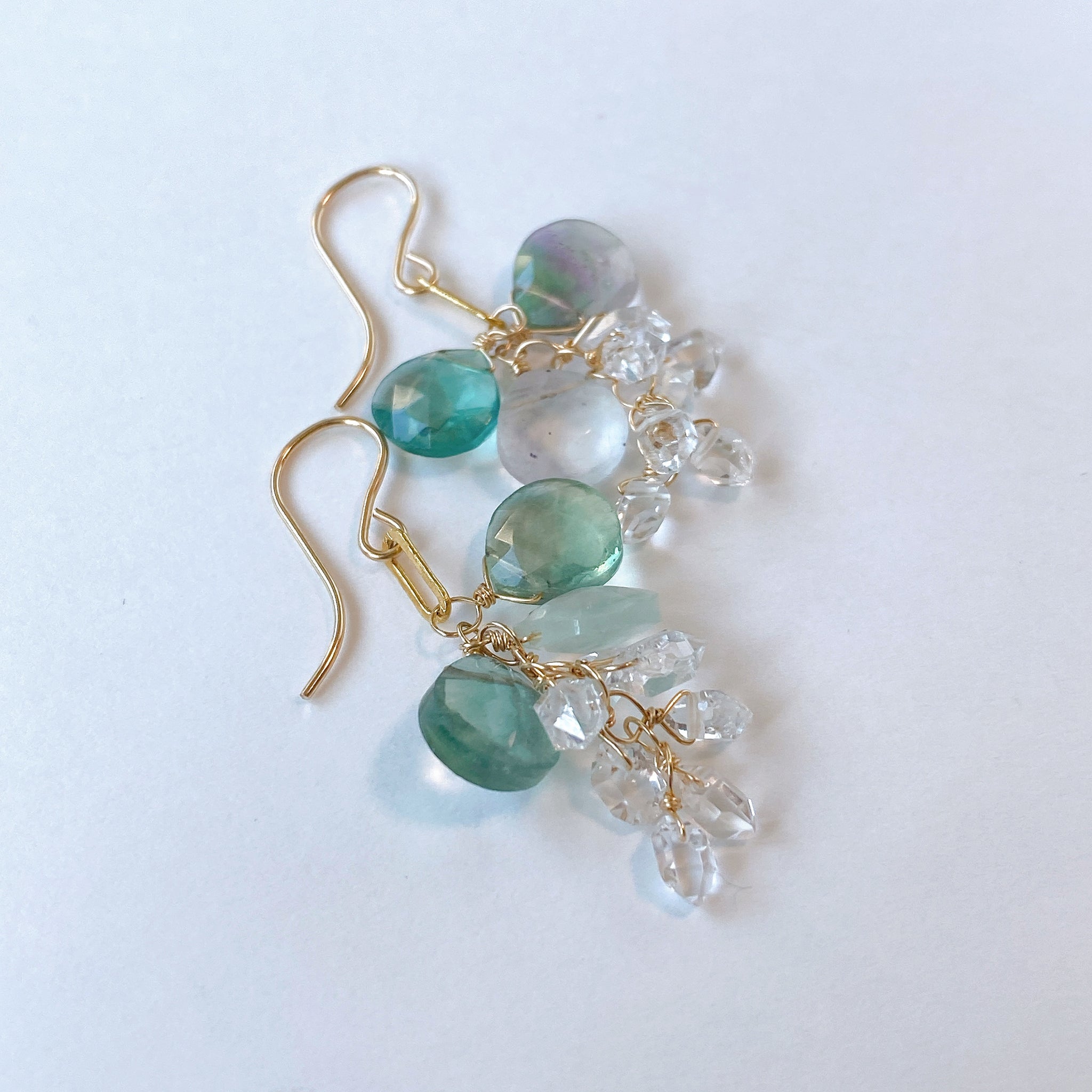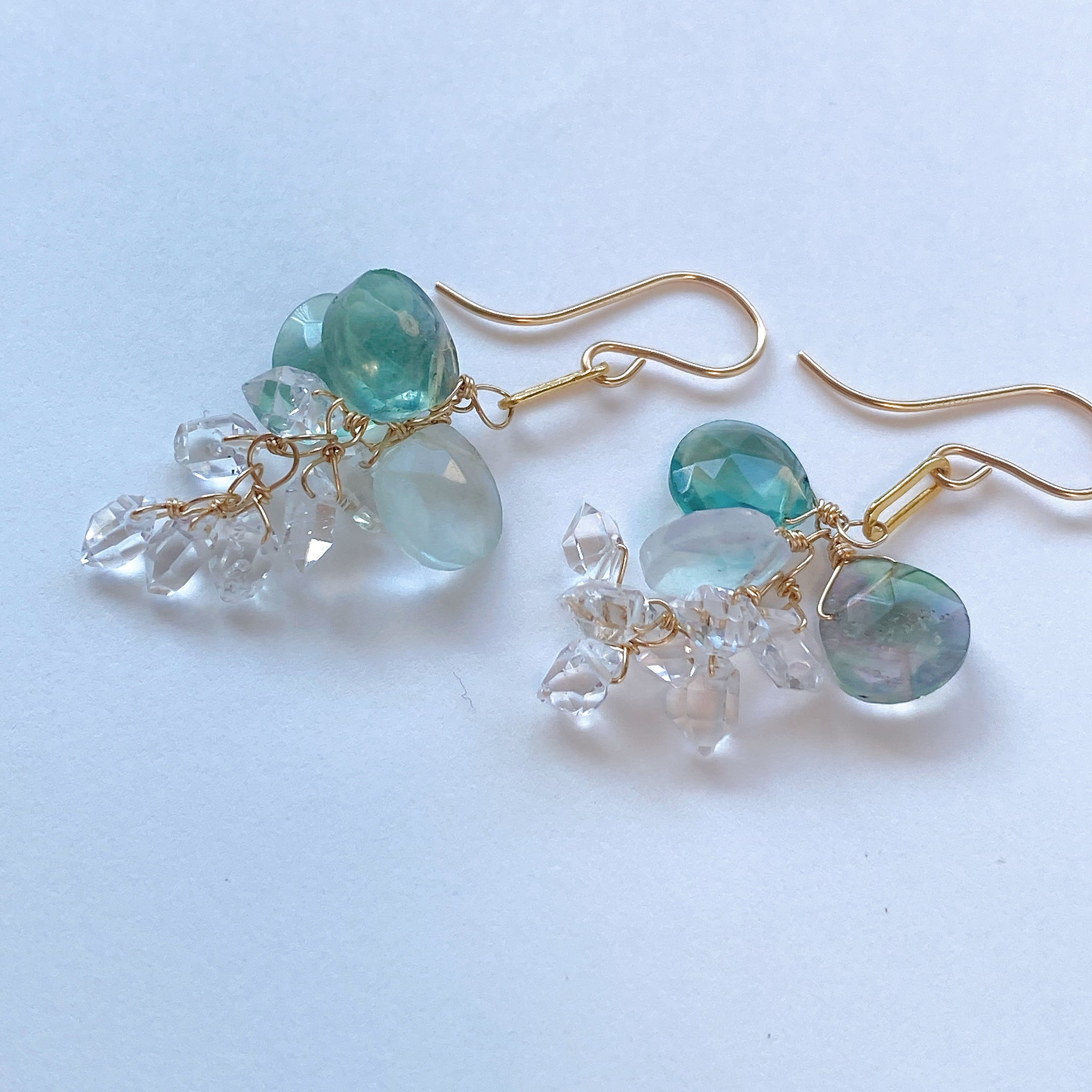 マロンカットのフローライトとハーキマークォーツを使ってデザインした耳飾りです。