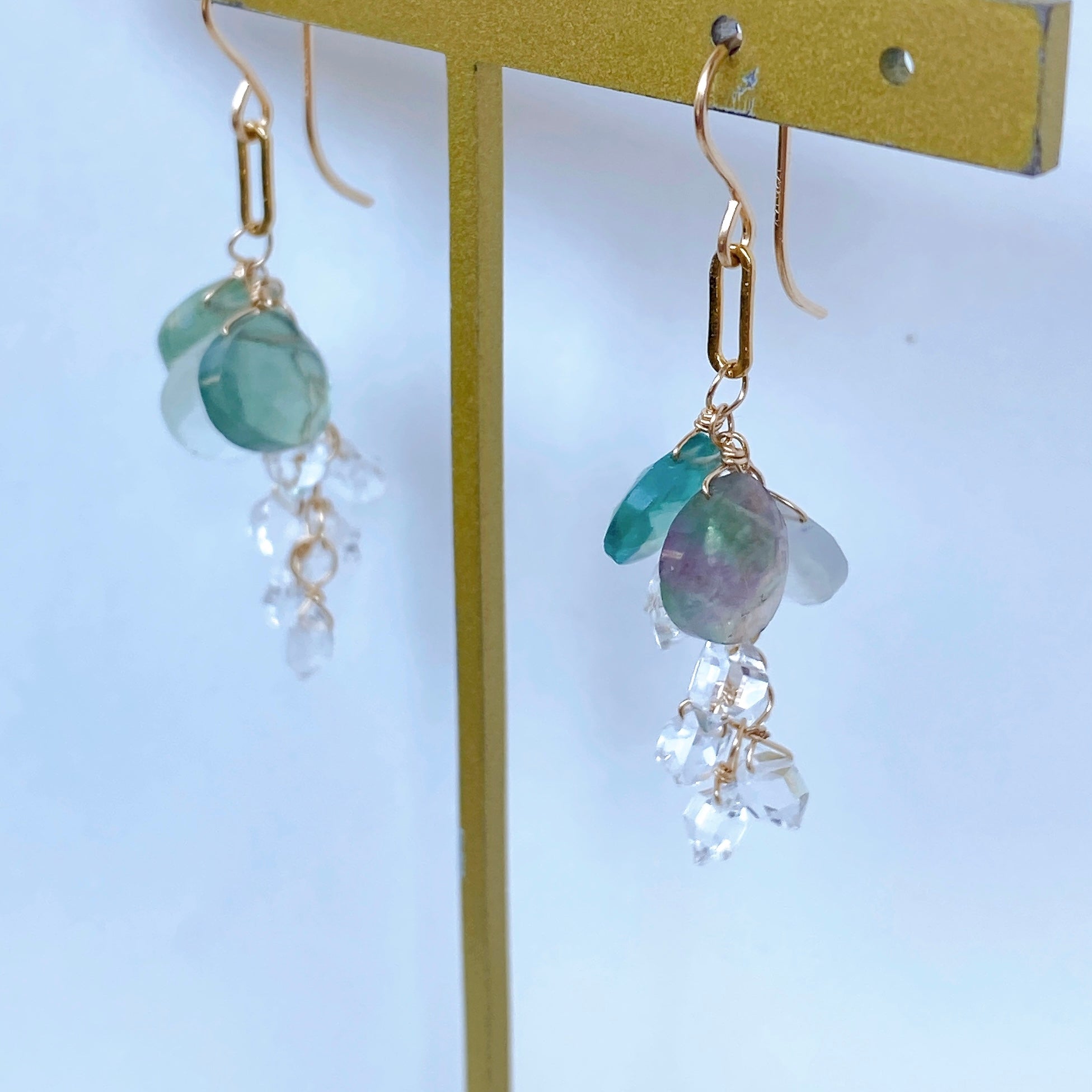グリーン系の粒をグラデーションにし、クリアな両剣水晶を合わせた透明感のあるピアスです。