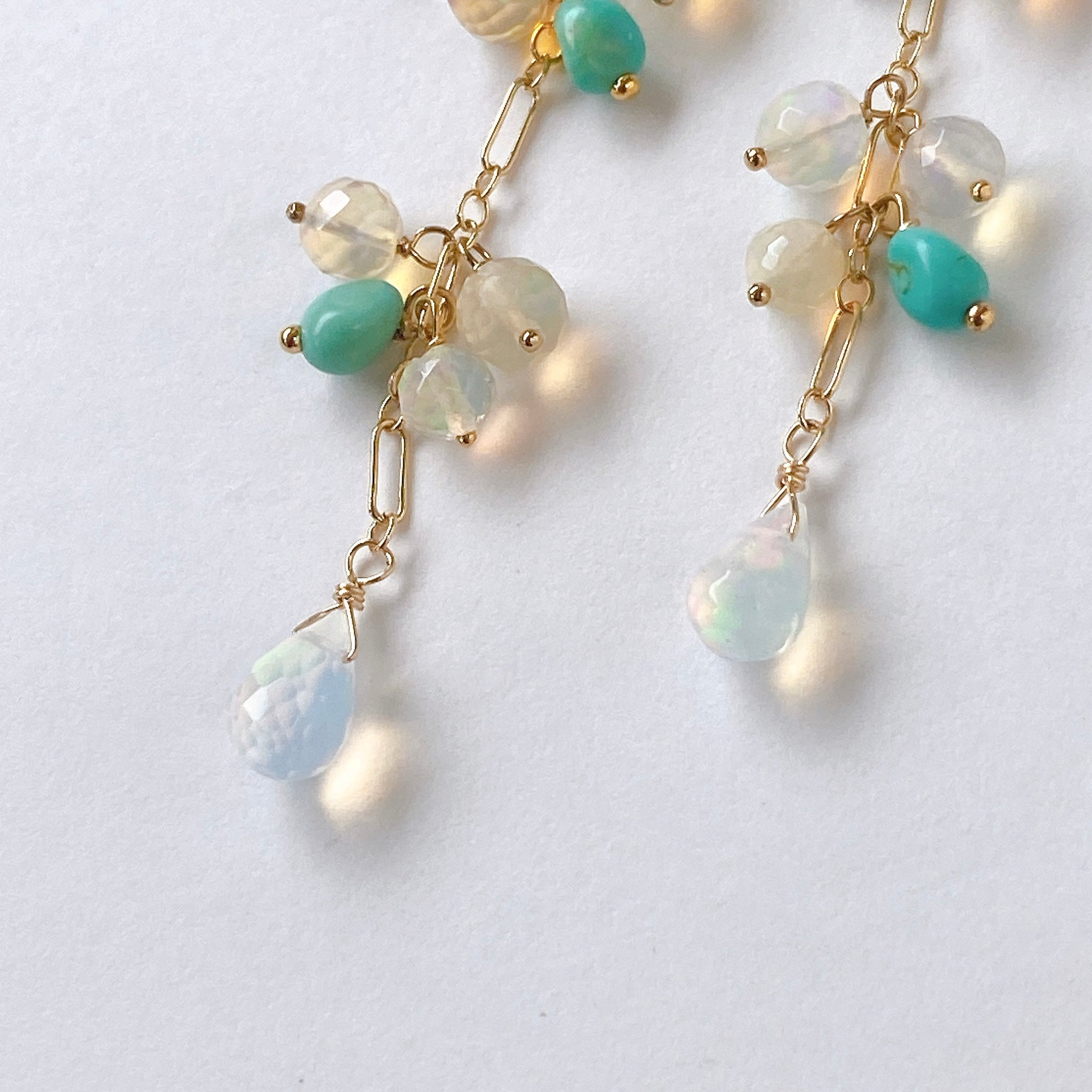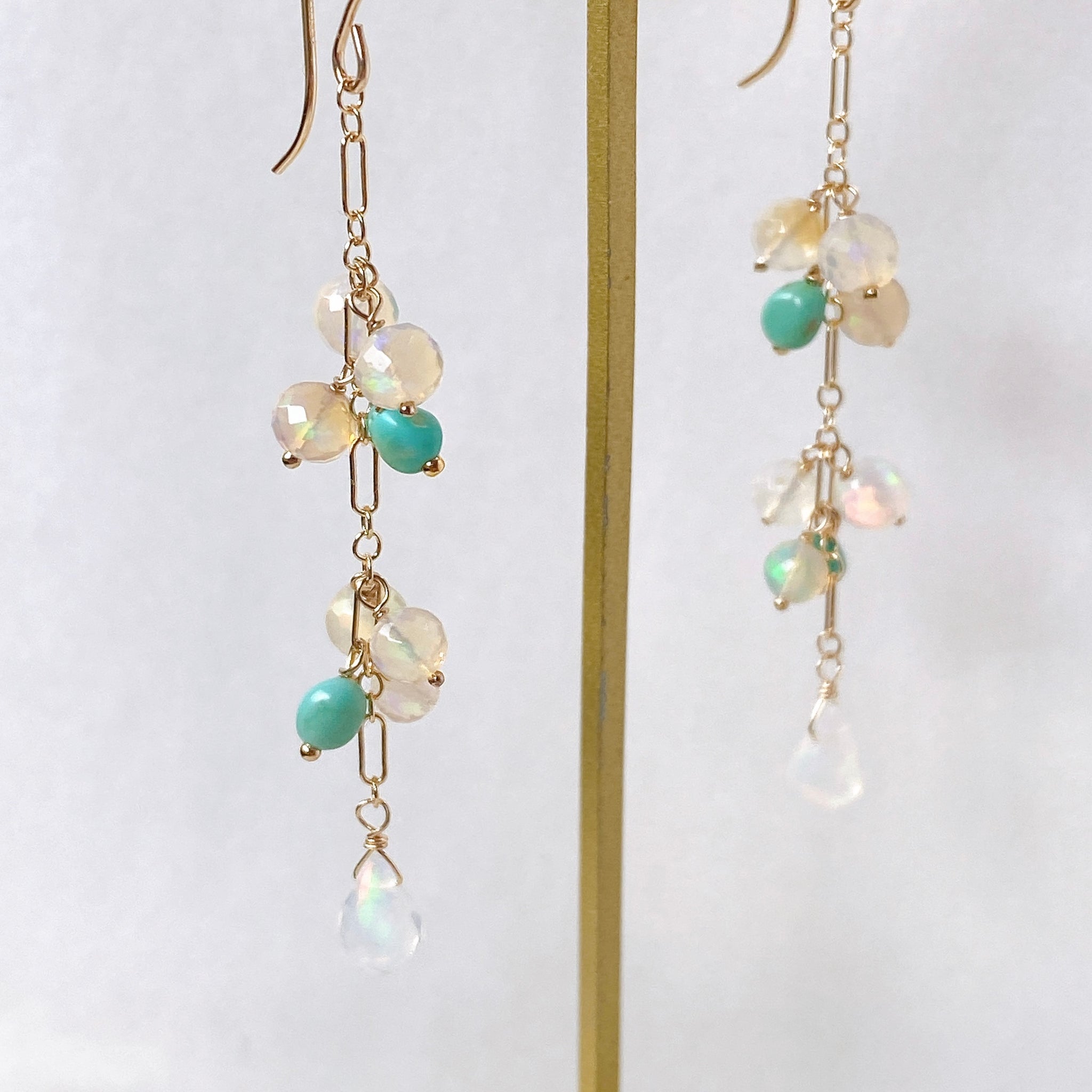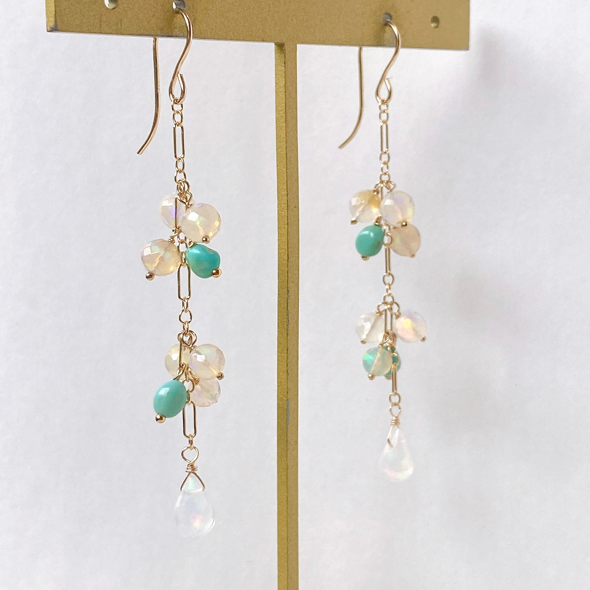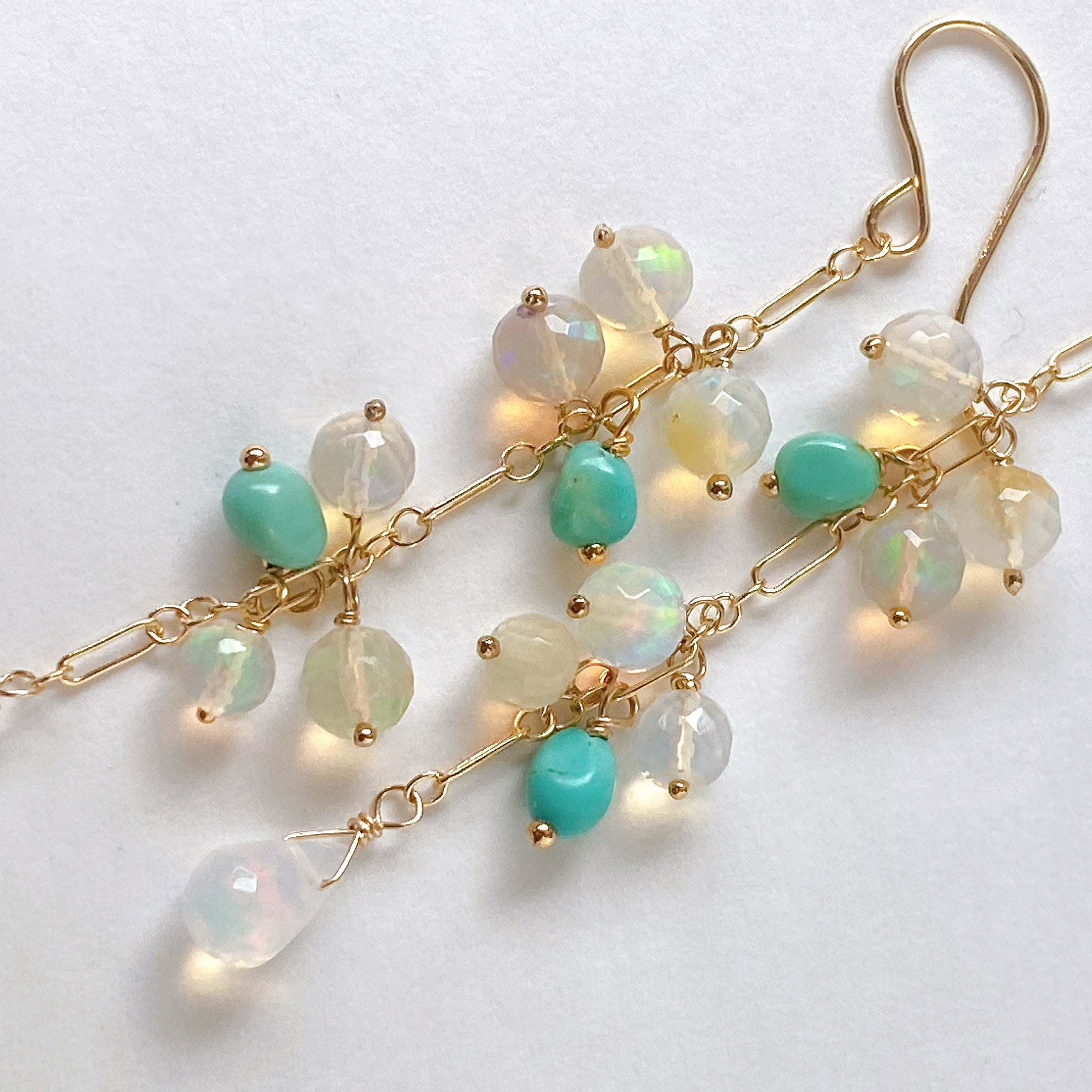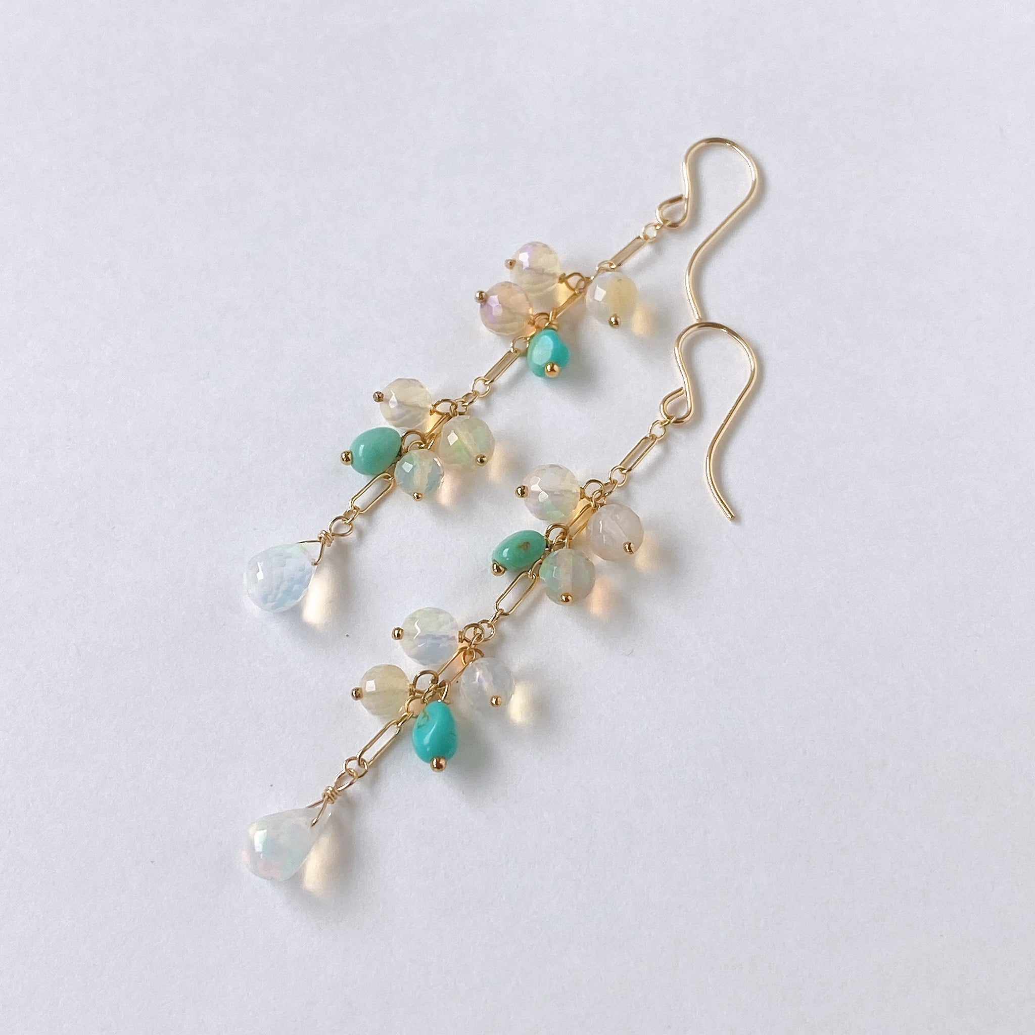 表面にカットの入ったミラーボールのようなオパールとグリーンがかったカラーのソノランターコイズをギュッとまとめ、一番下には遊色の眩しいドロップカットのオパールを14kgf製のチェーンに留めたピアスです。