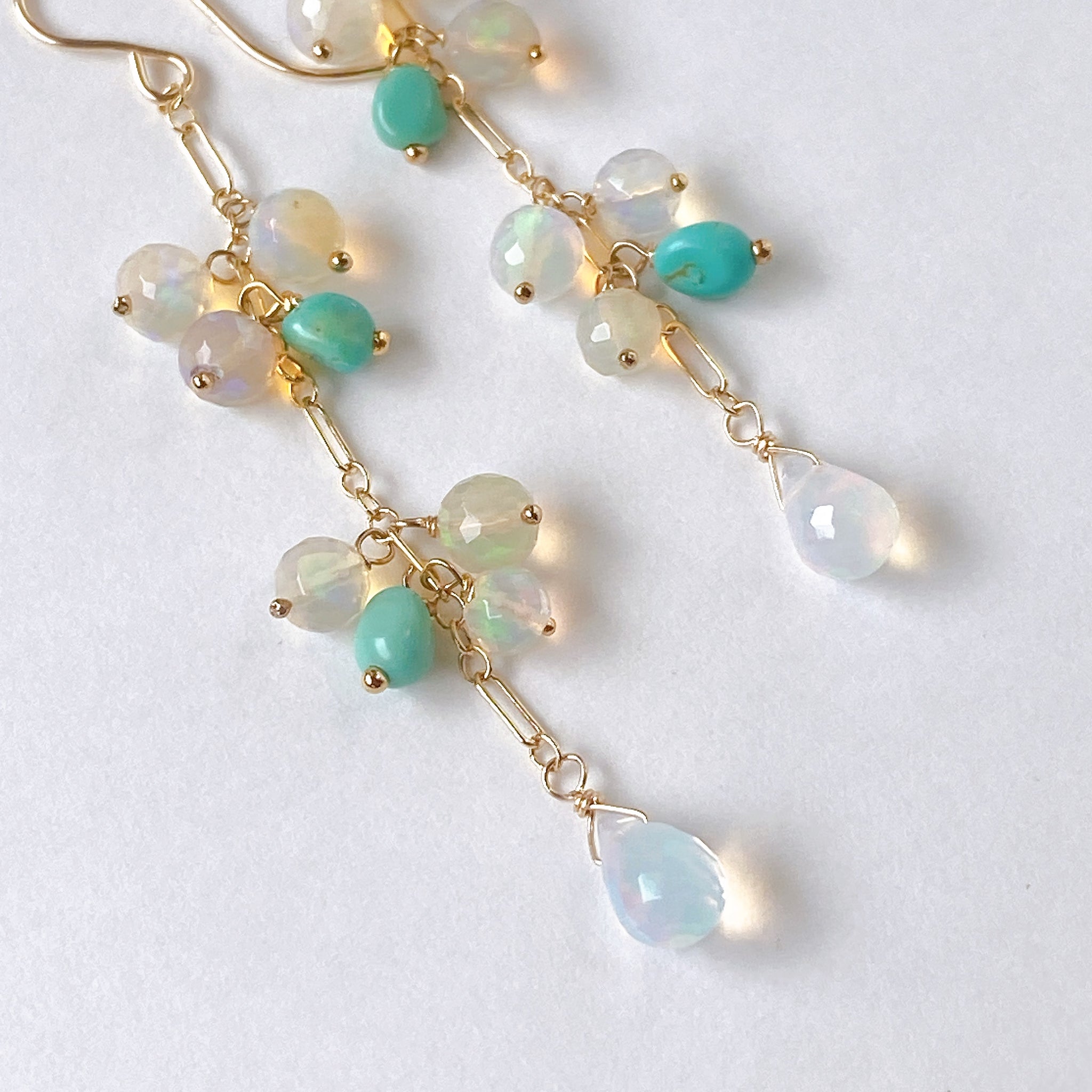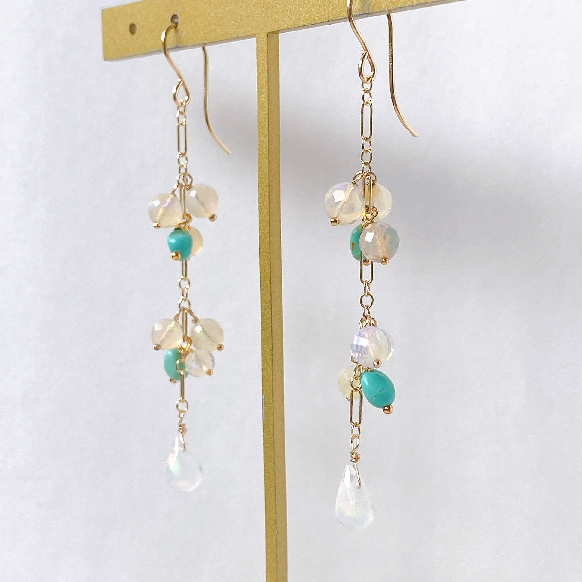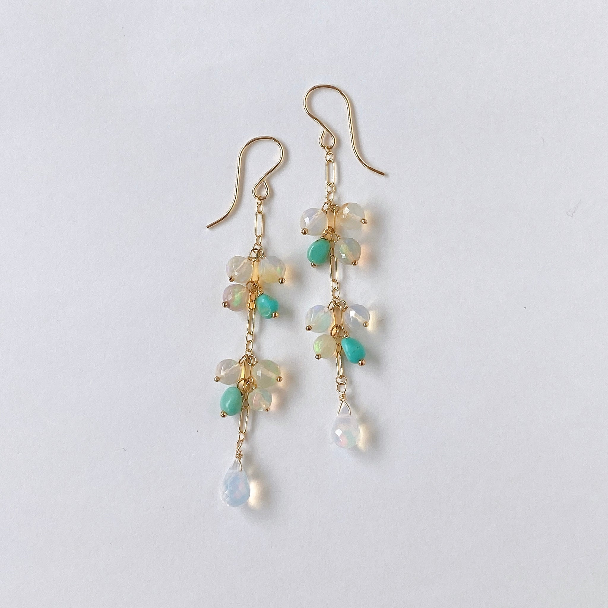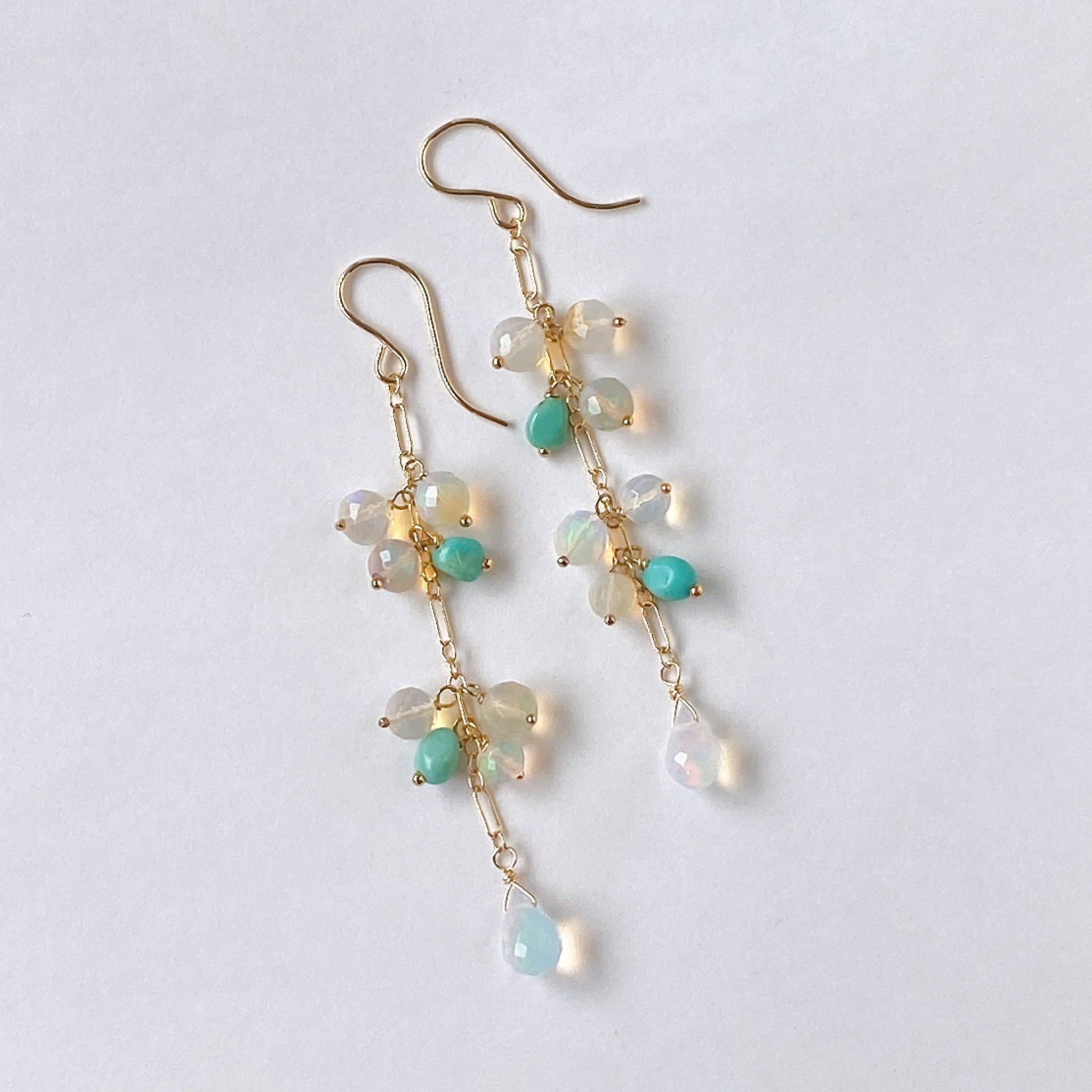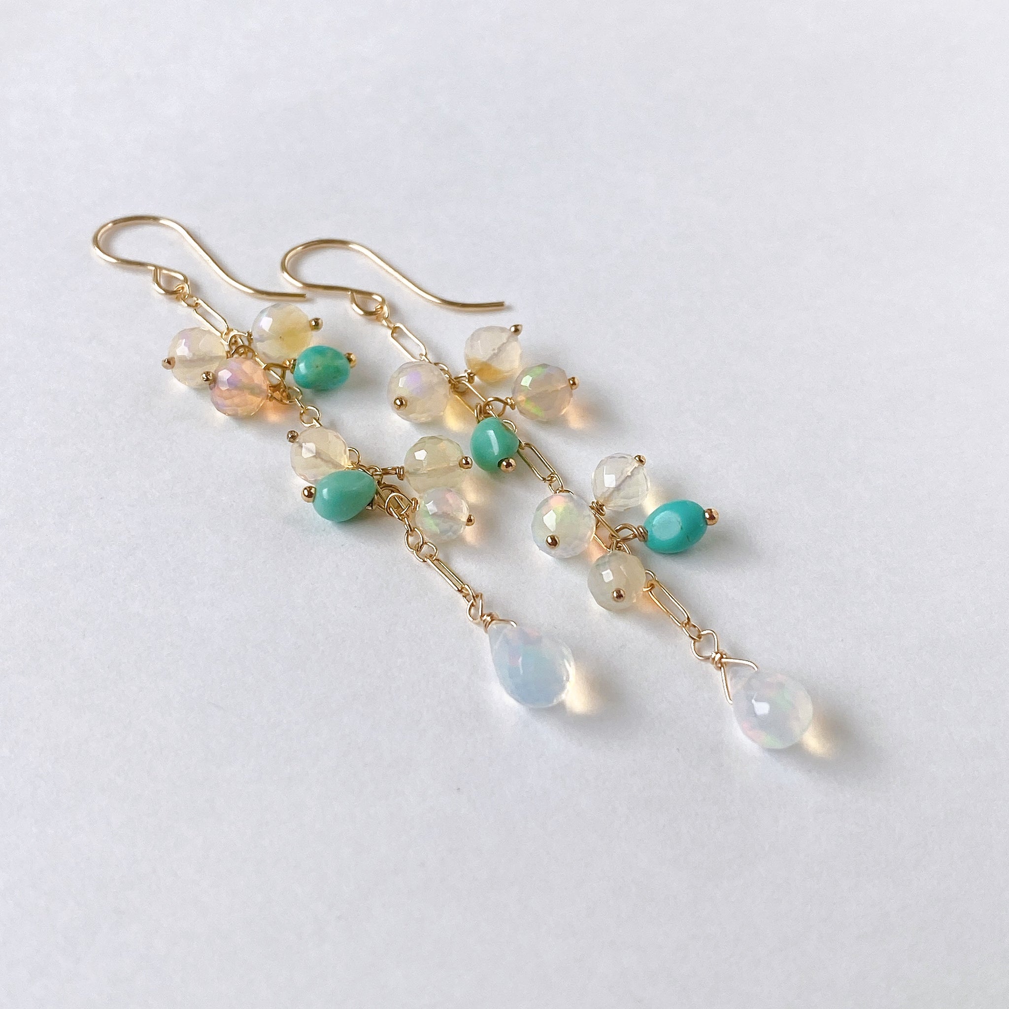 表面にカットの入ったミラーボールのようなオパールとグリーンがかったカラーのソノランターコイズをギュッとまとめ、一番下には遊色の眩しいドロップカットのオパールを14kgf製のチェーンに留めたピアスです。