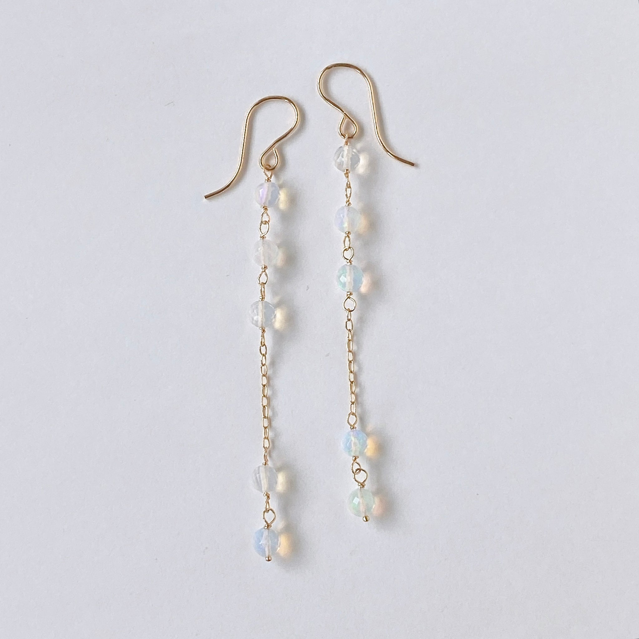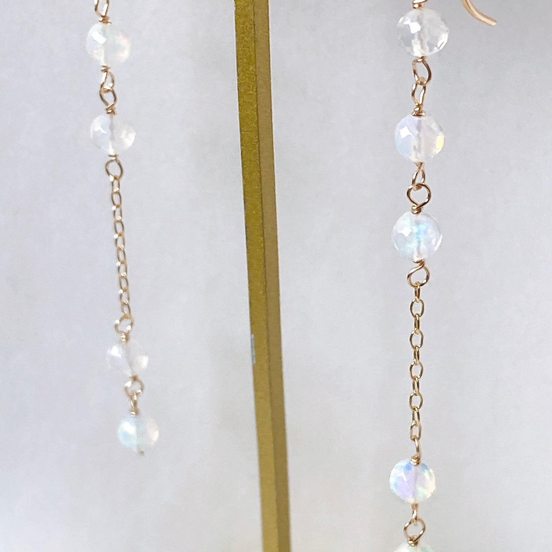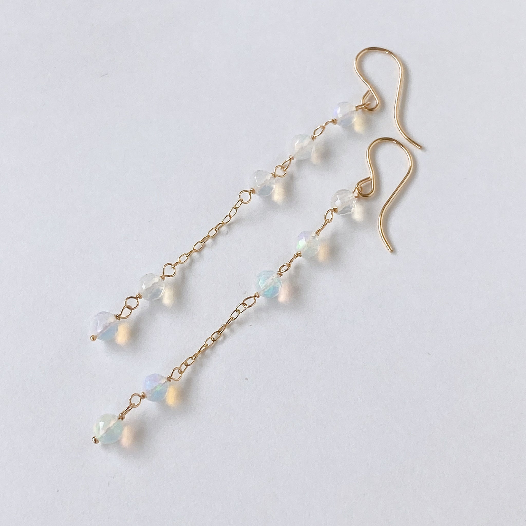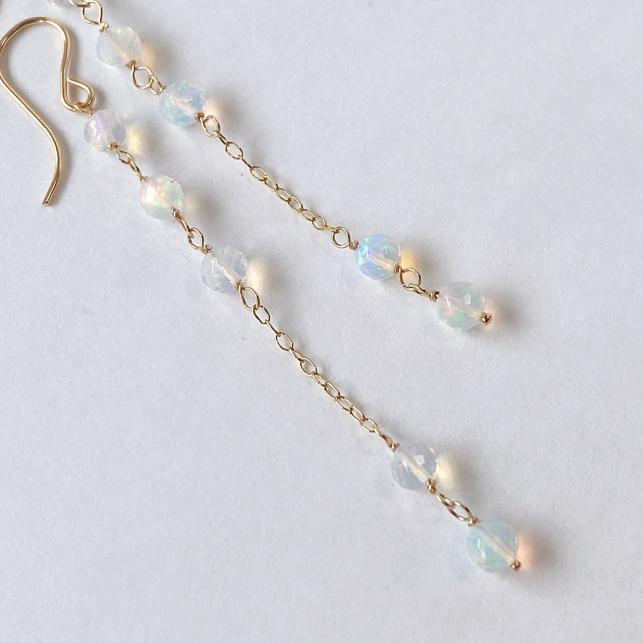 表面にカットの入ったミラーボールのようなオパールを片耳5粒ずつ、14kgf製の華奢なチェーンに繋いでデザインしました。