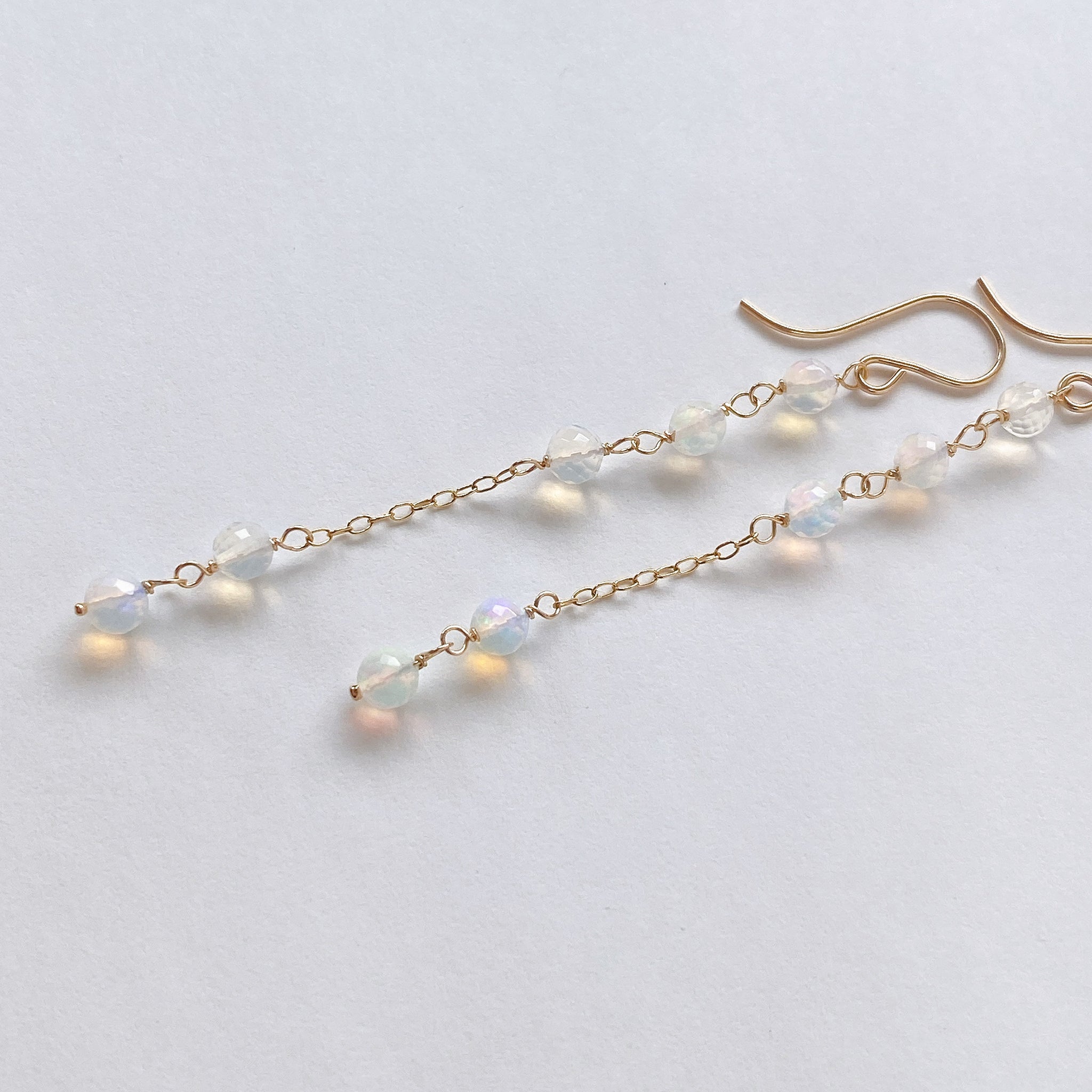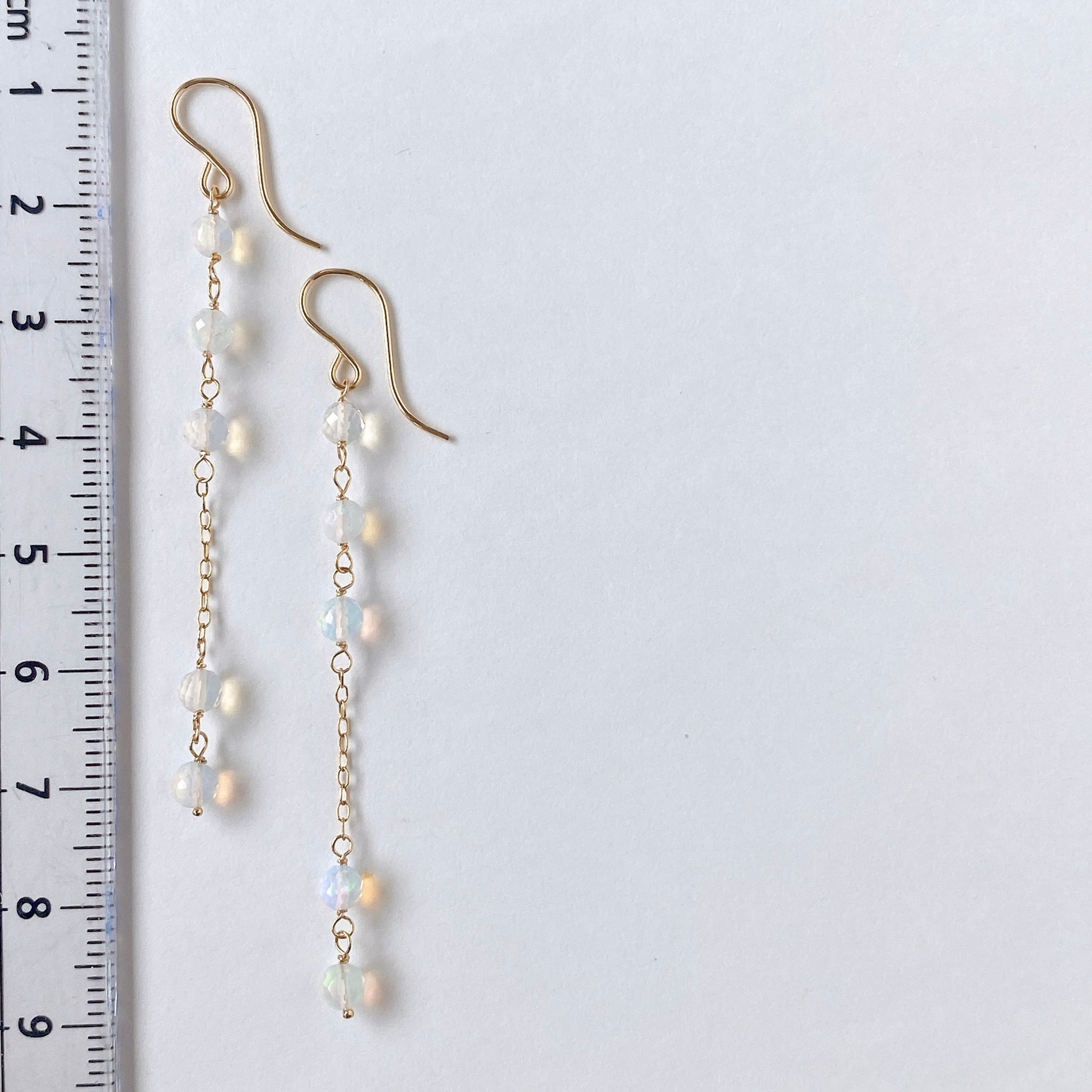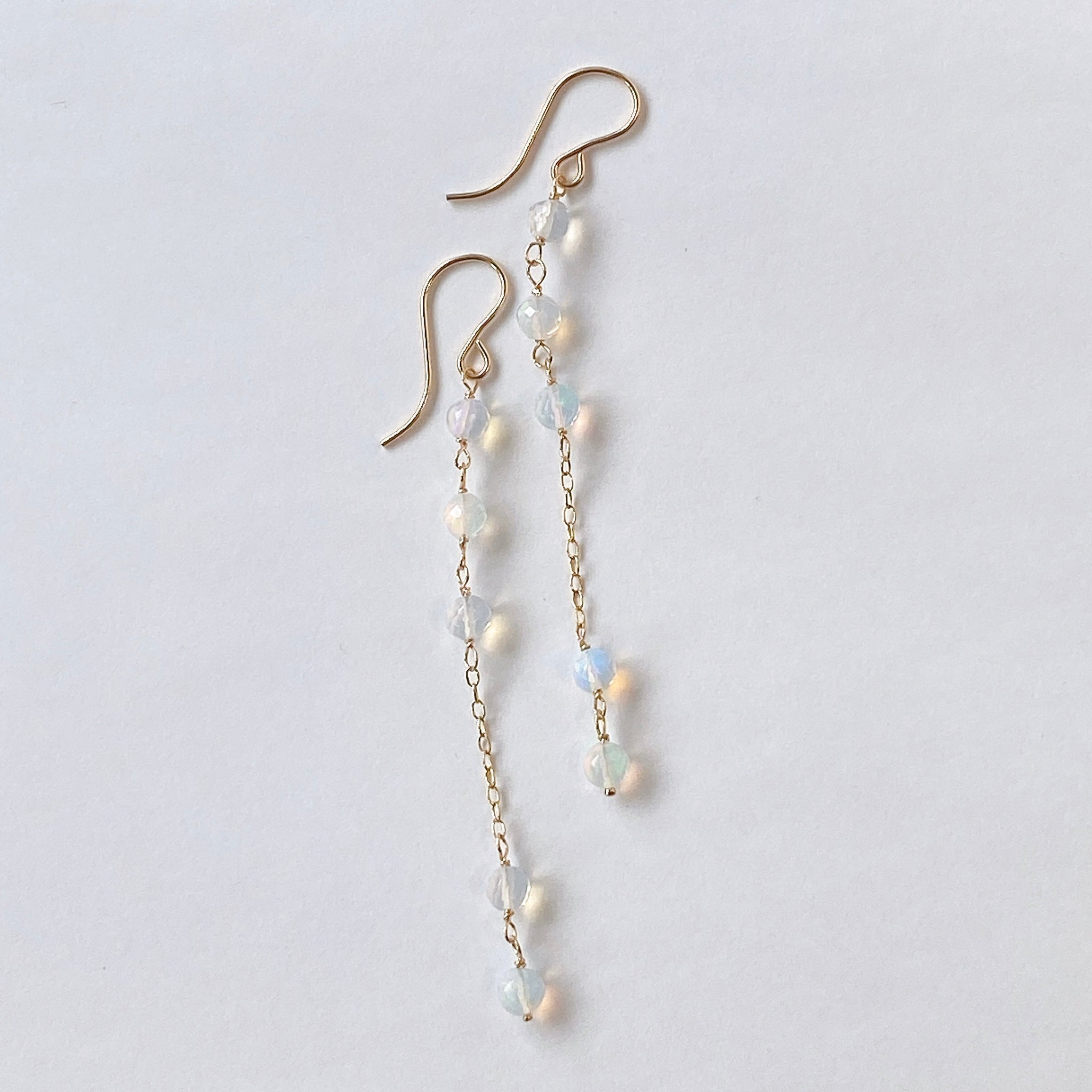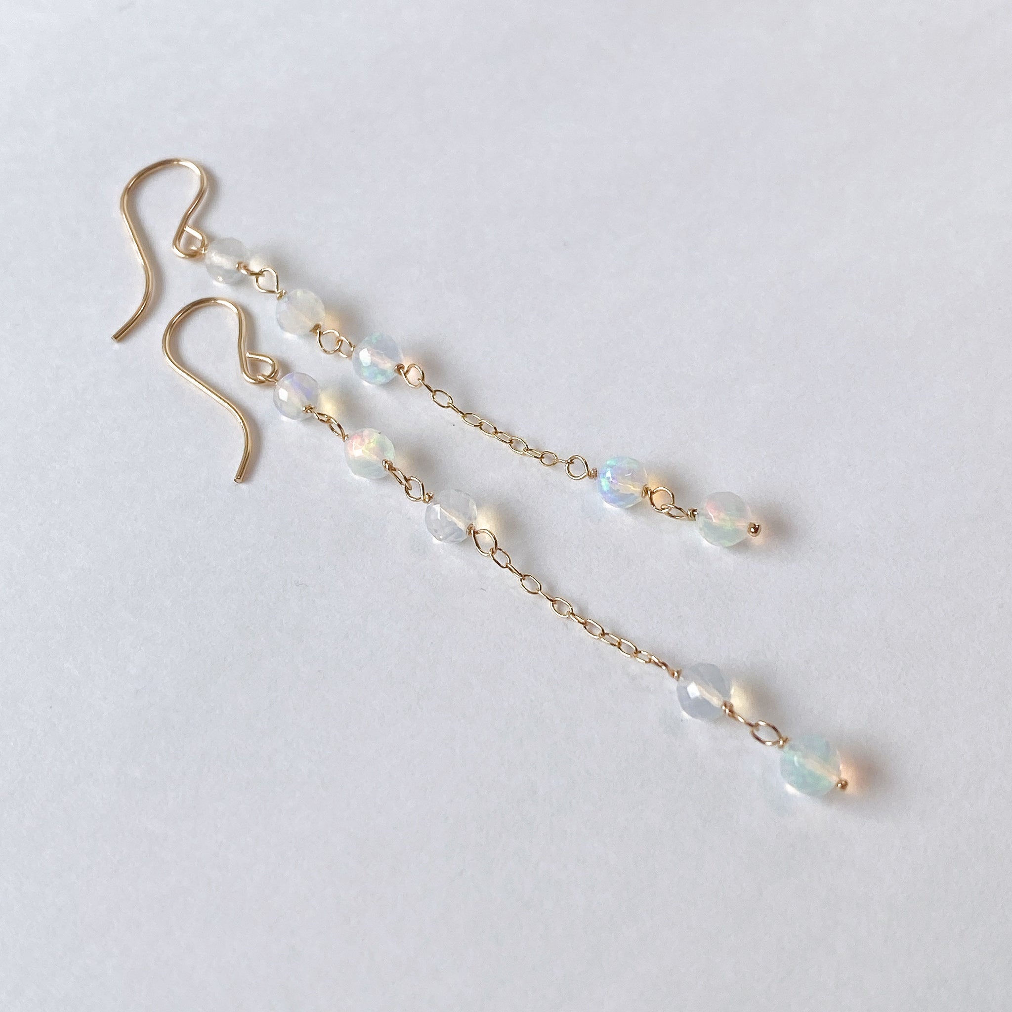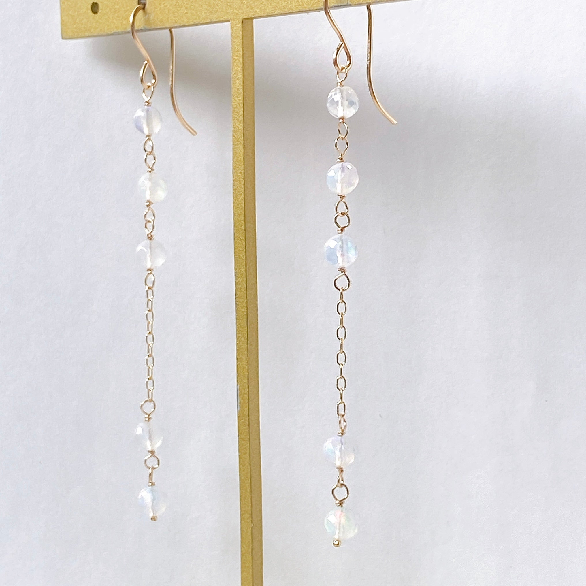 表面にカットの入ったミラーボールのようなオパールを片耳5粒ずつ、14kgf製の華奢なチェーンに繋いでデザインしました。