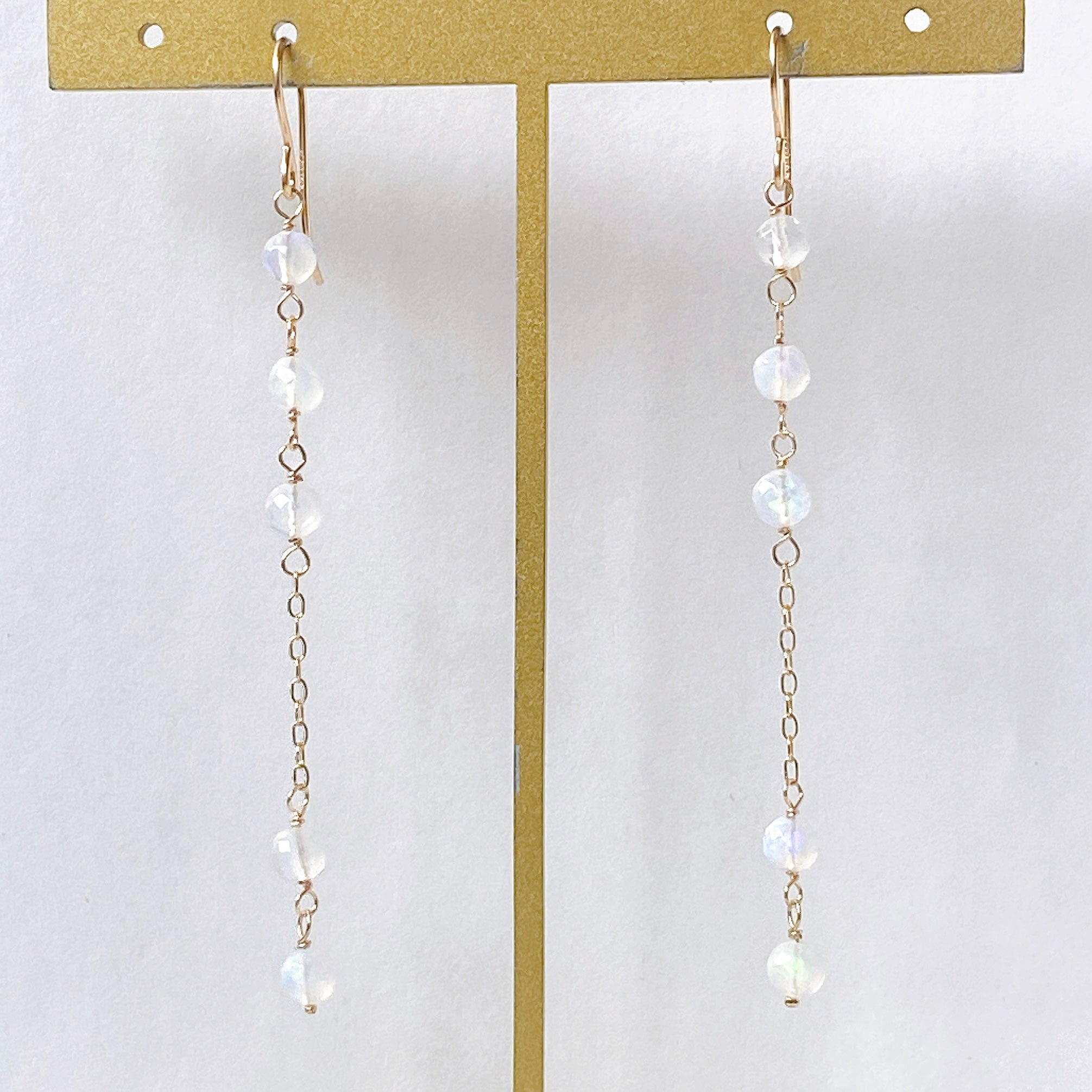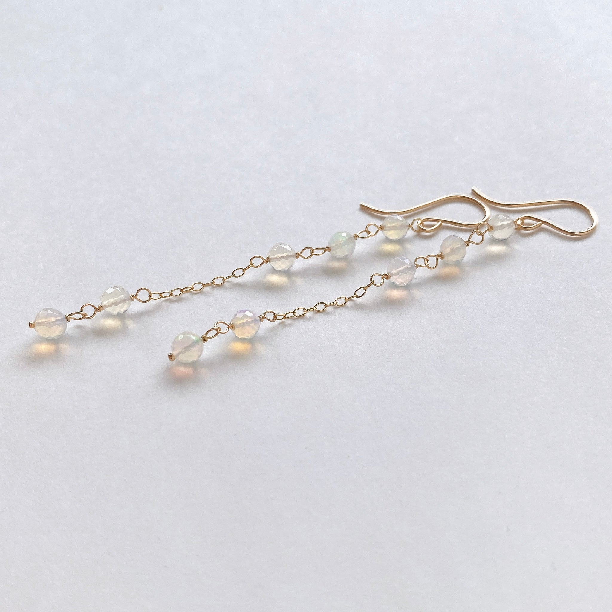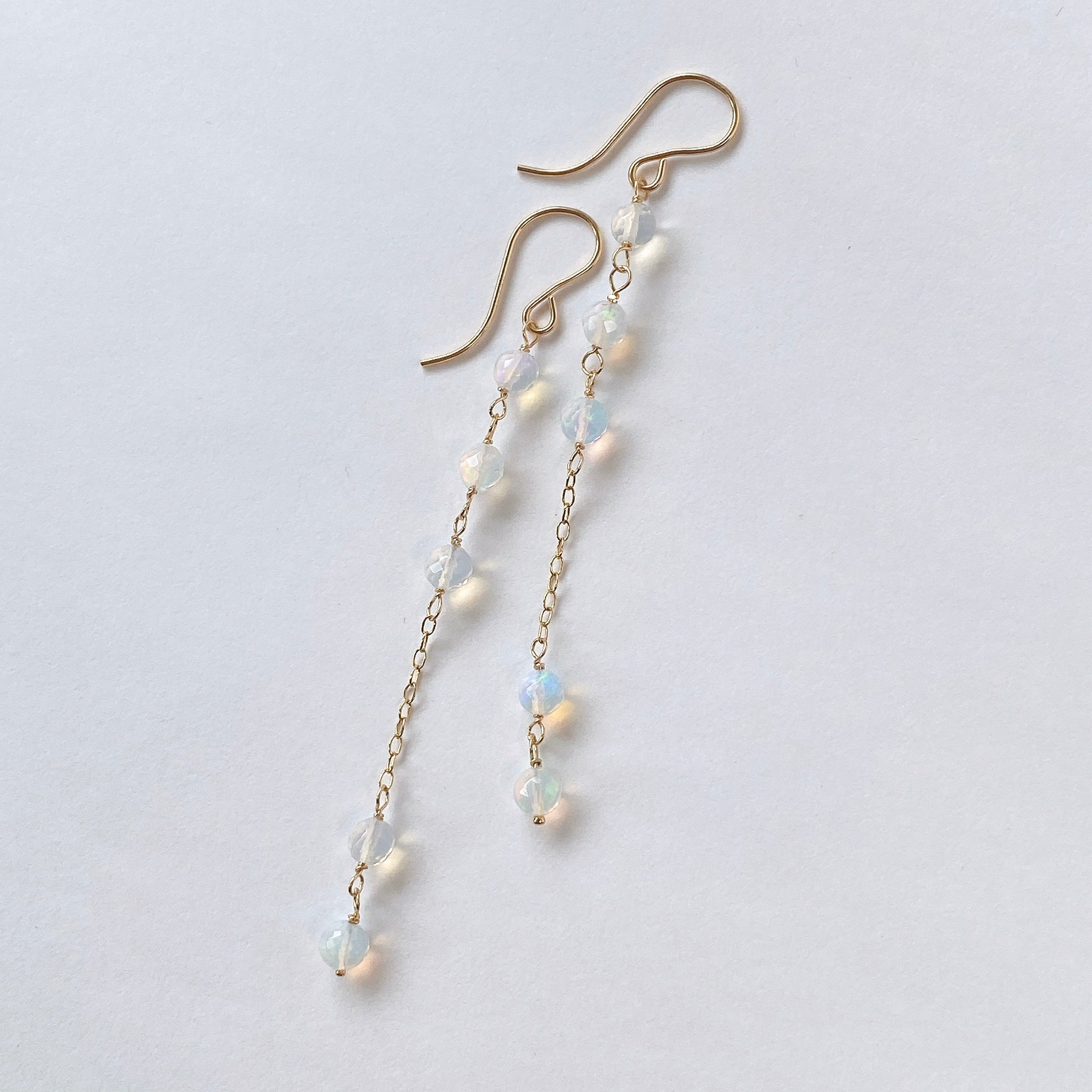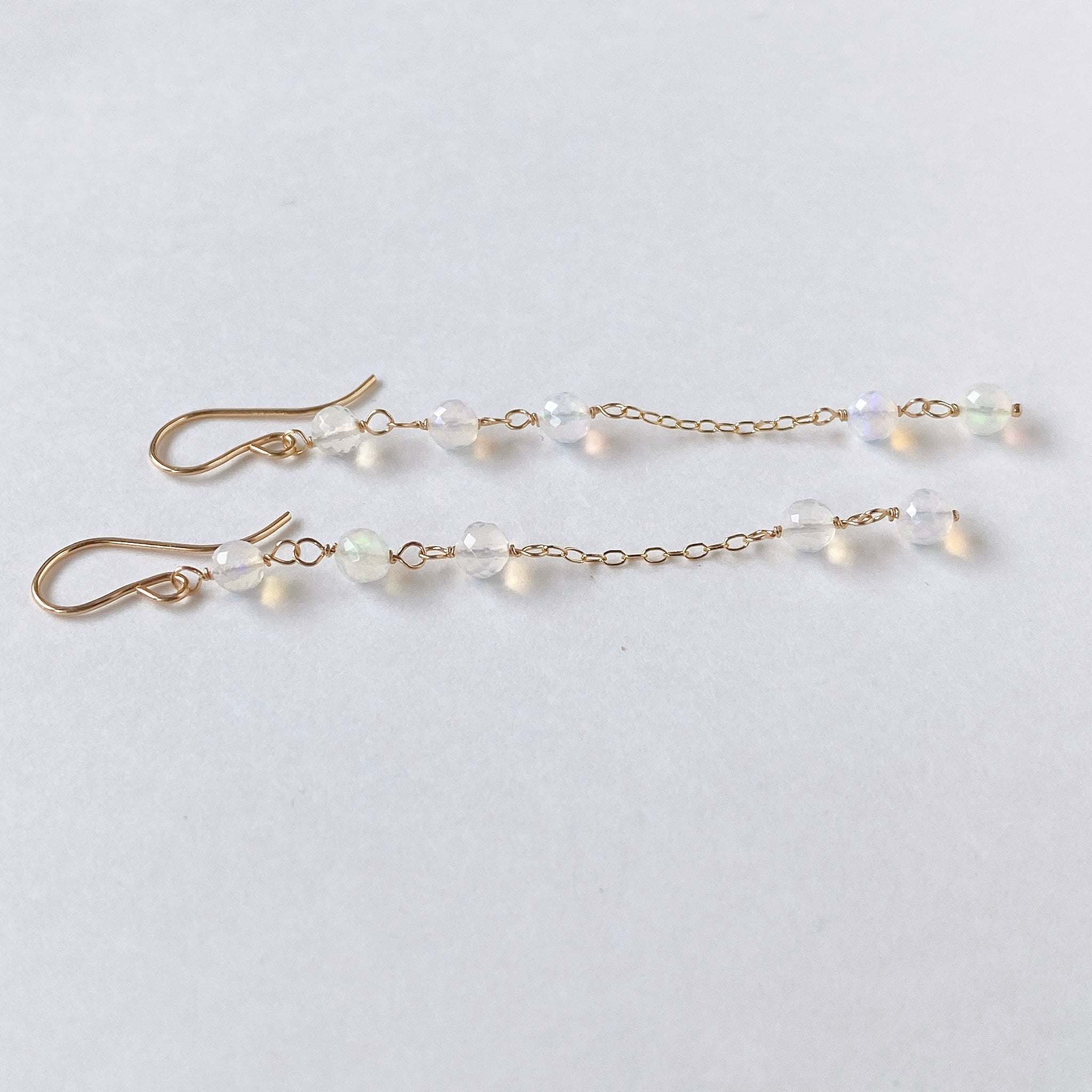 表面にカットの入ったミラーボールのようなオパールを片耳5粒ずつ、14kgf製の華奢なチェーンに繋いでデザインしました。