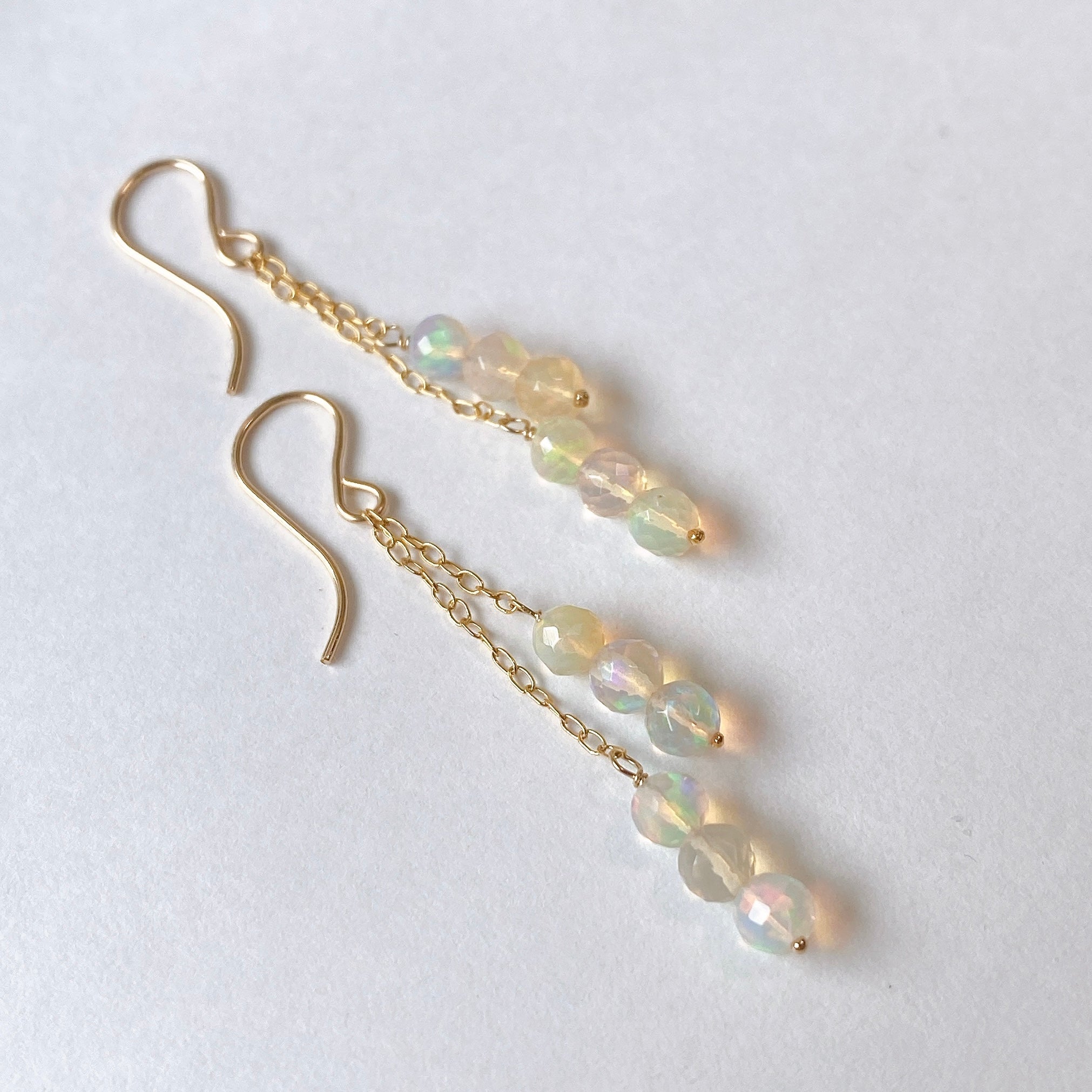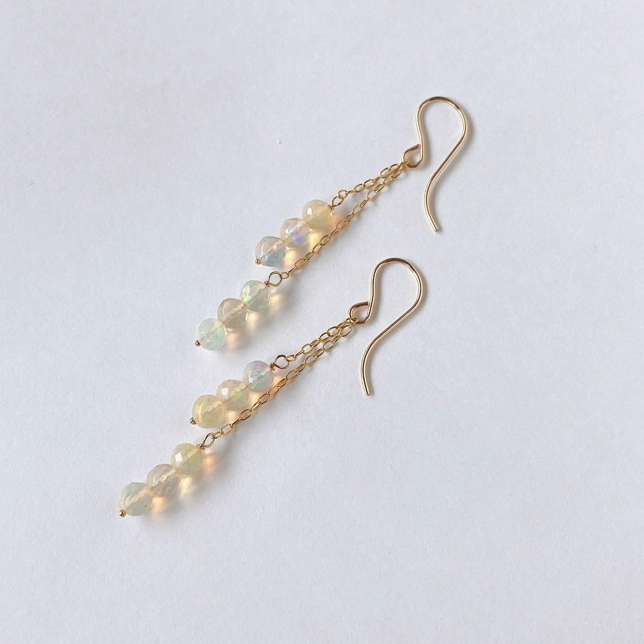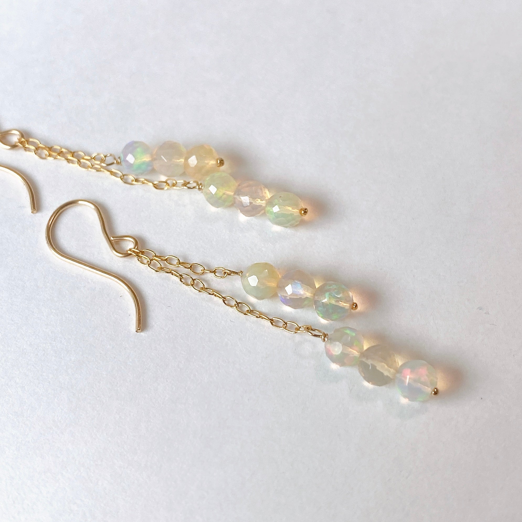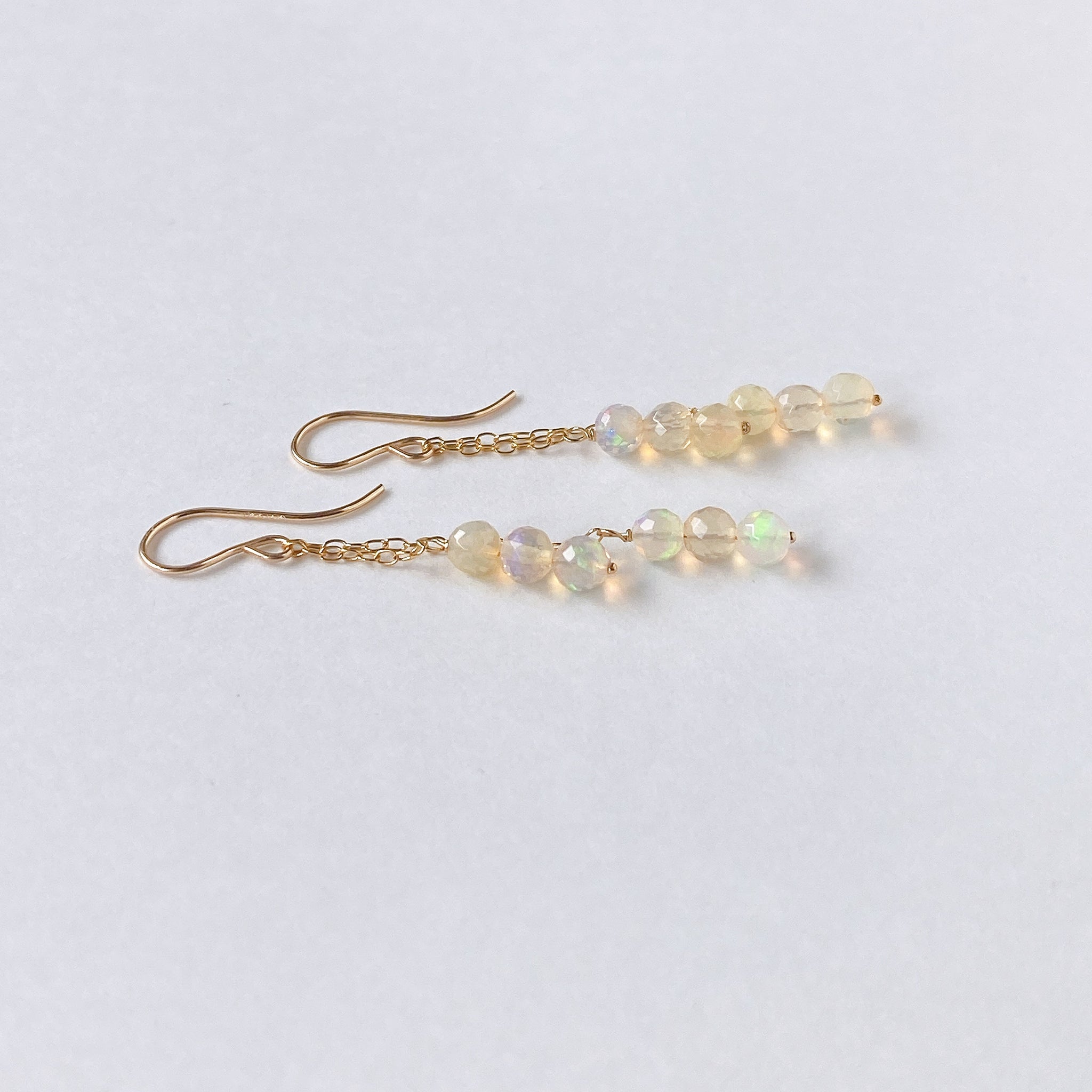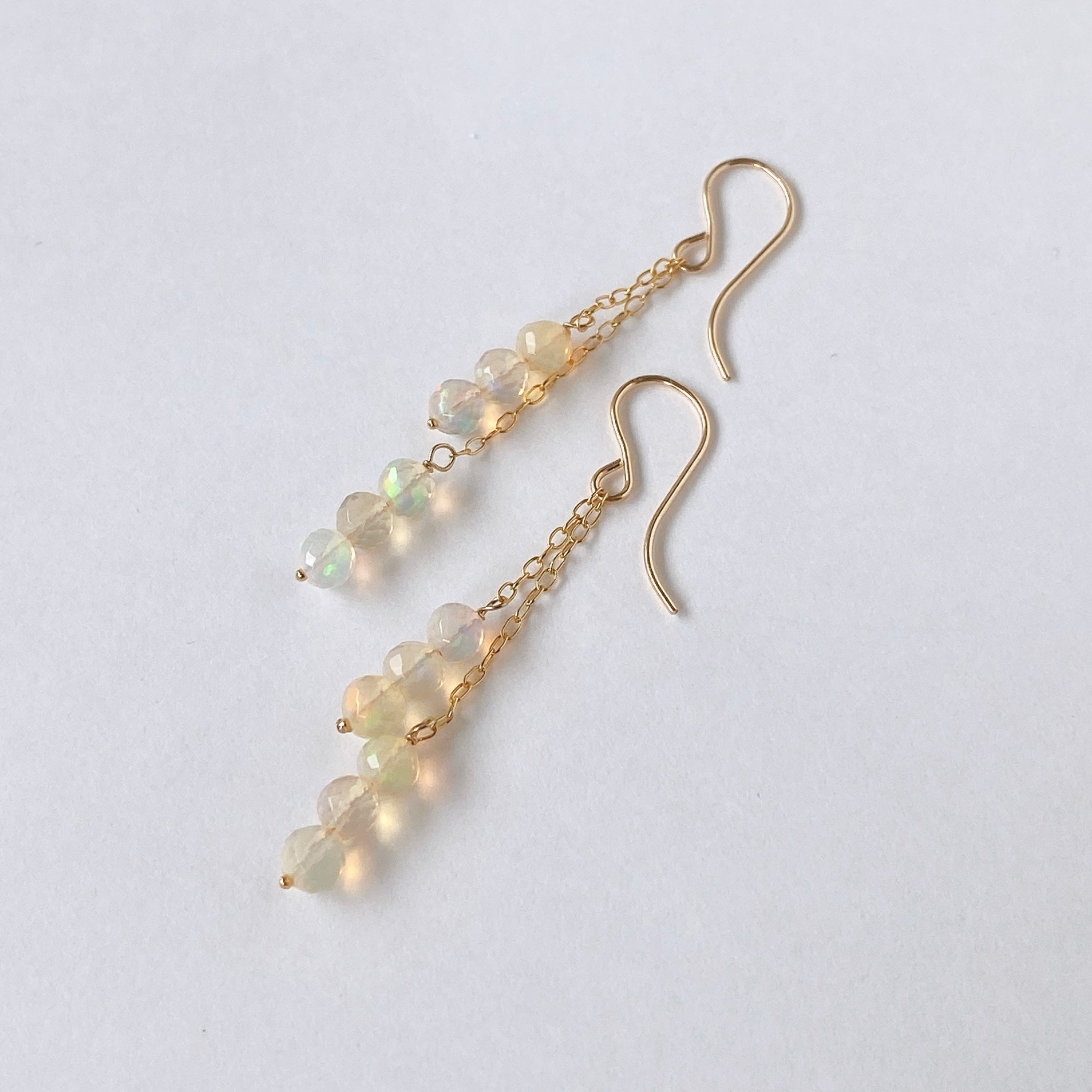 表面にカットの入ったミラーボールのようなオパールを片耳6粒ずつ、14kgf製の華奢なチェーンに繋いでデザインしました。