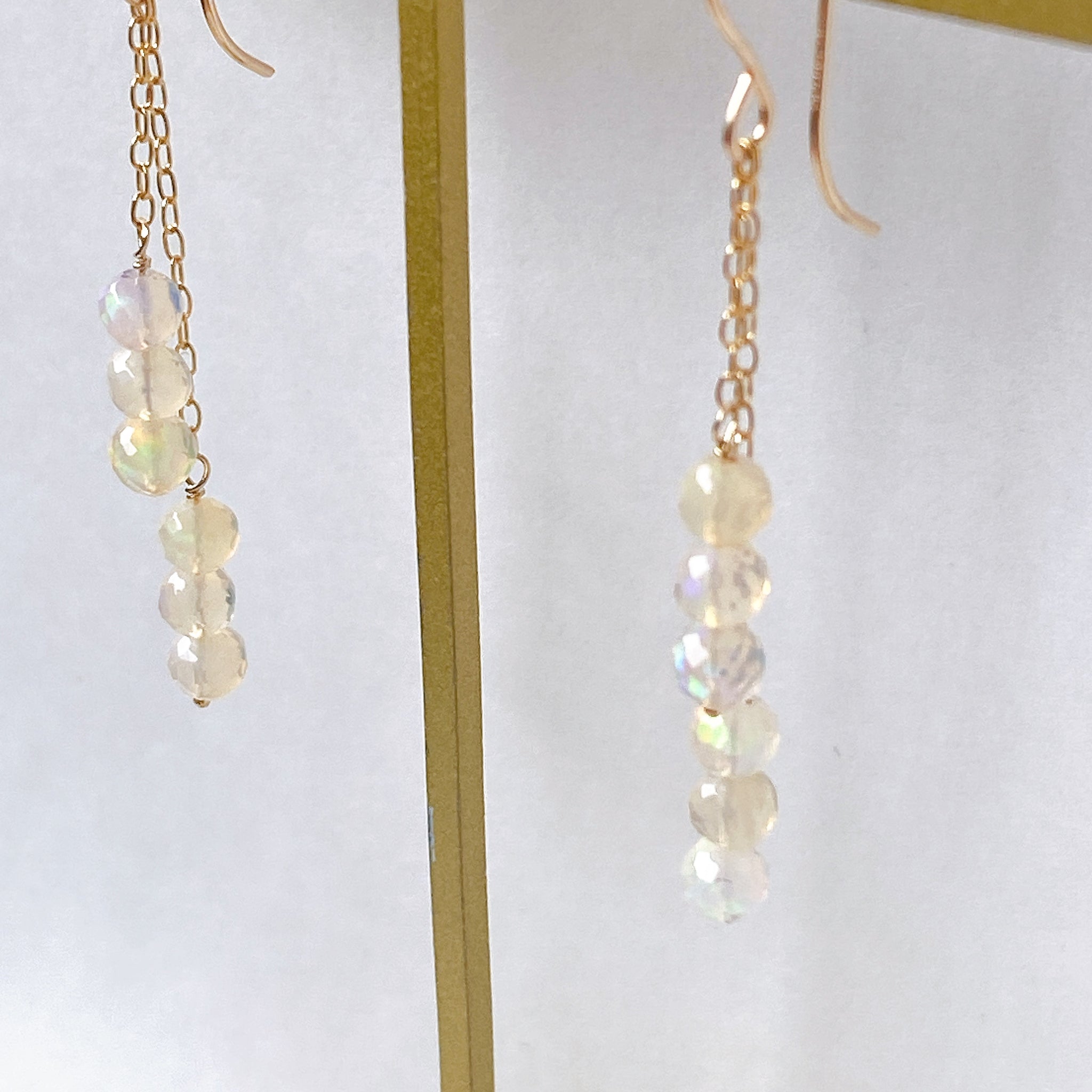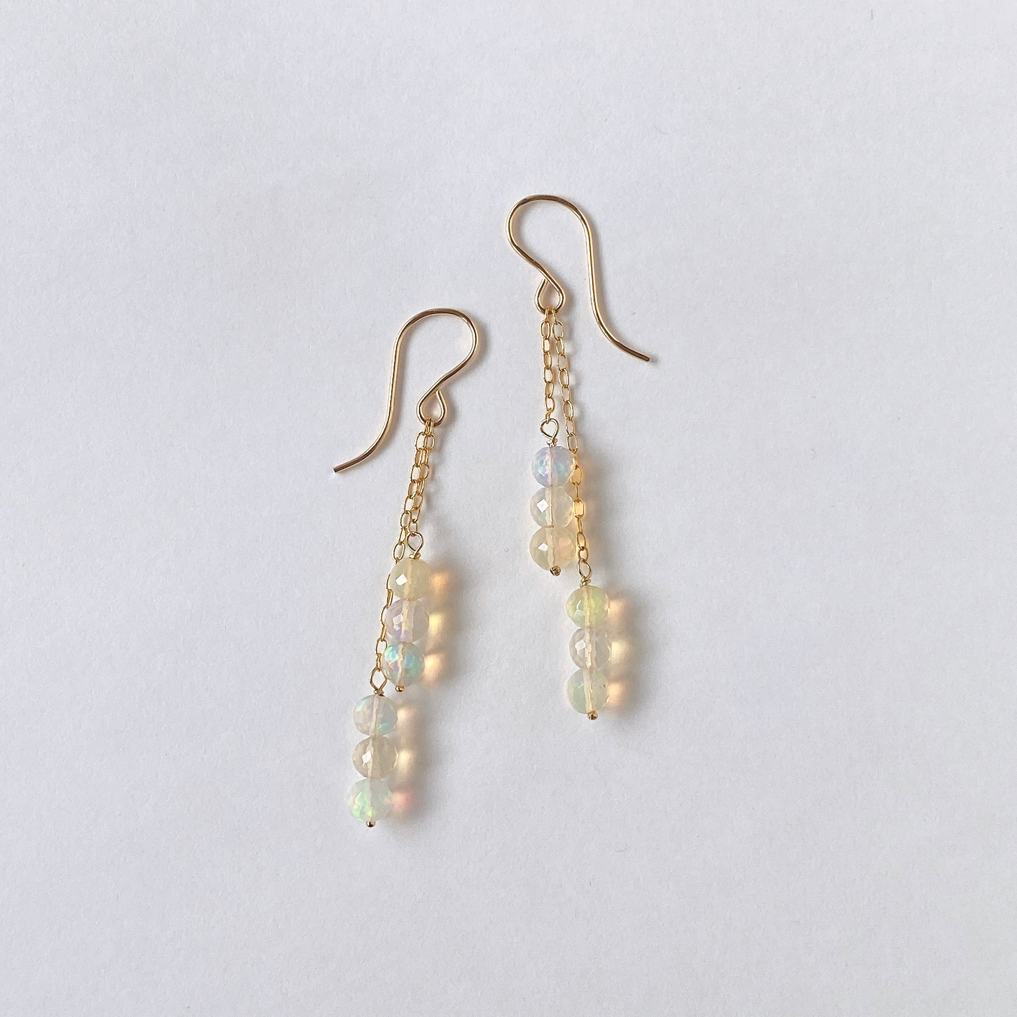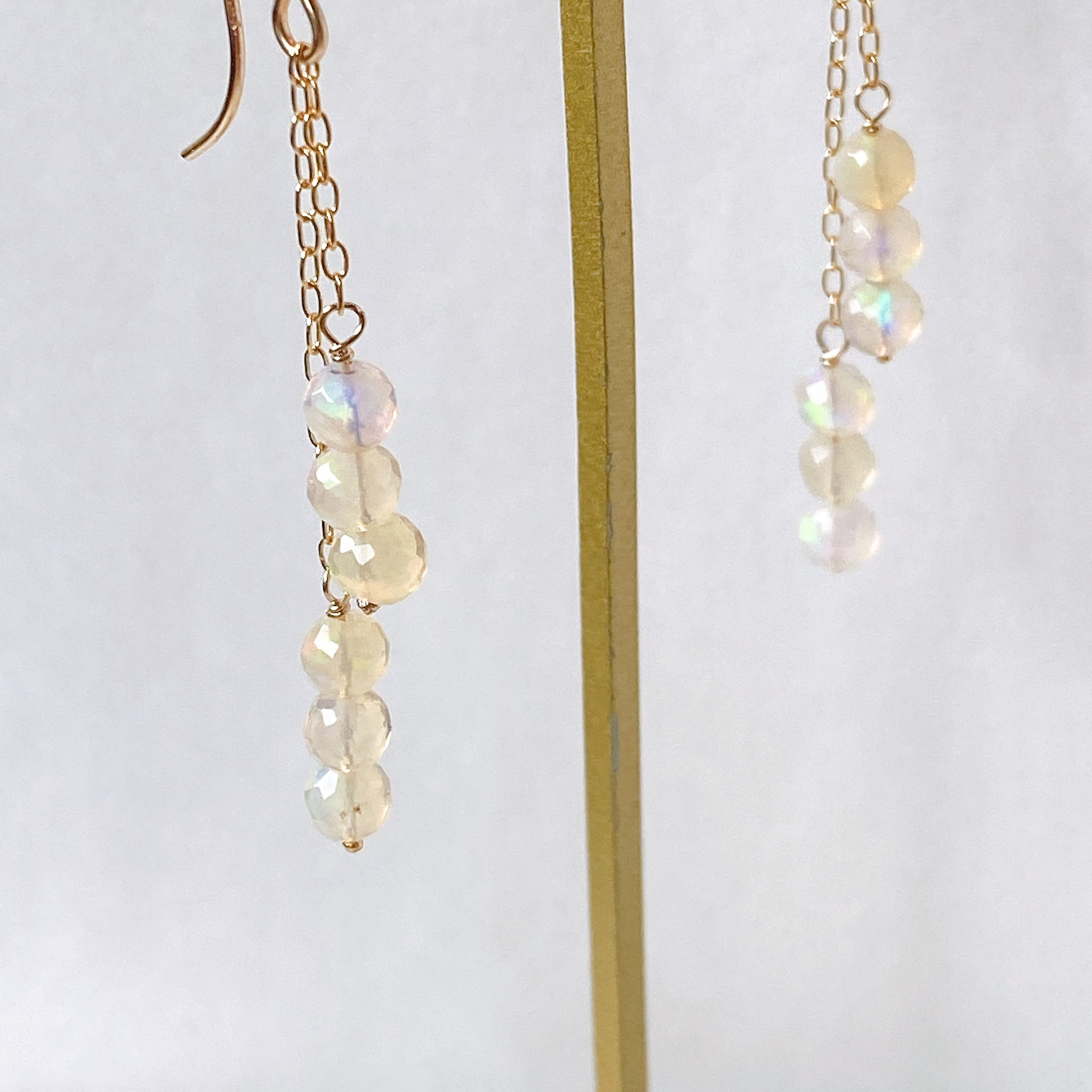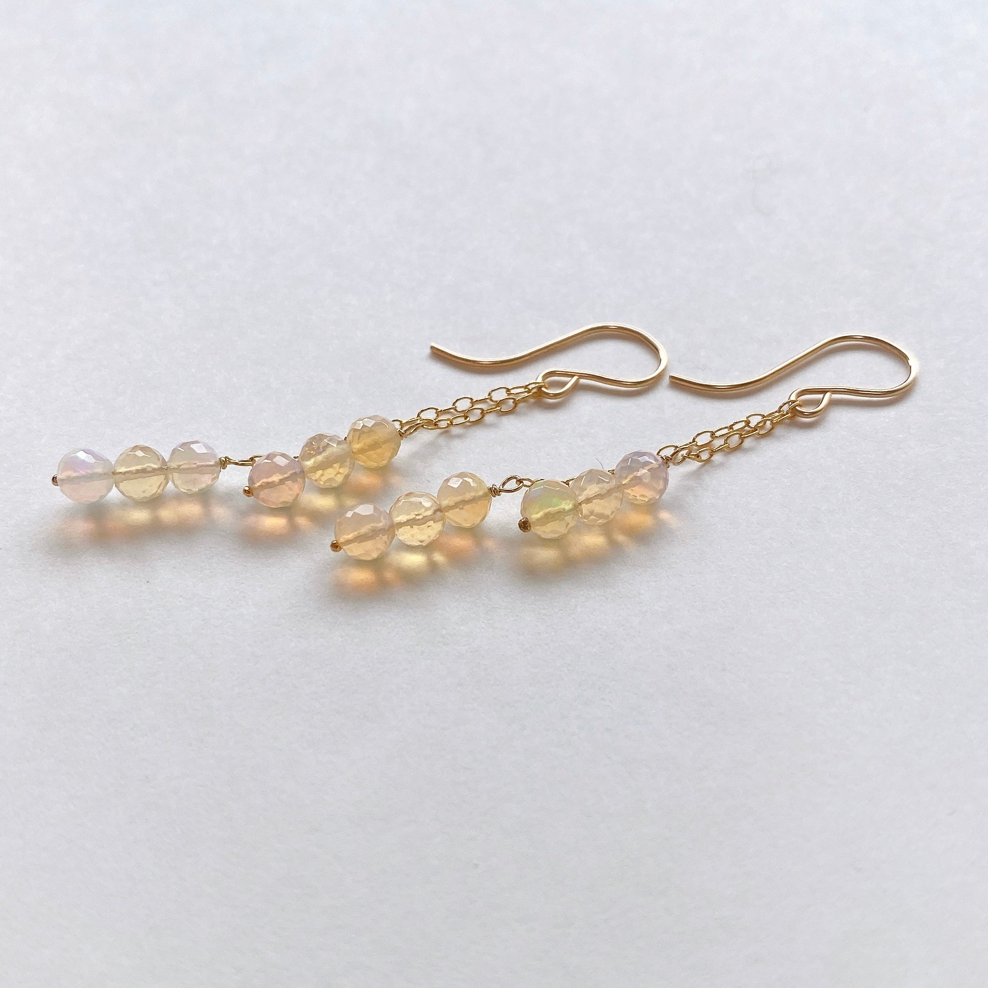 表面にカットの入ったミラーボールのようなオパールを片耳6粒ずつ、14kgf製の華奢なチェーンに繋いでデザインしました。