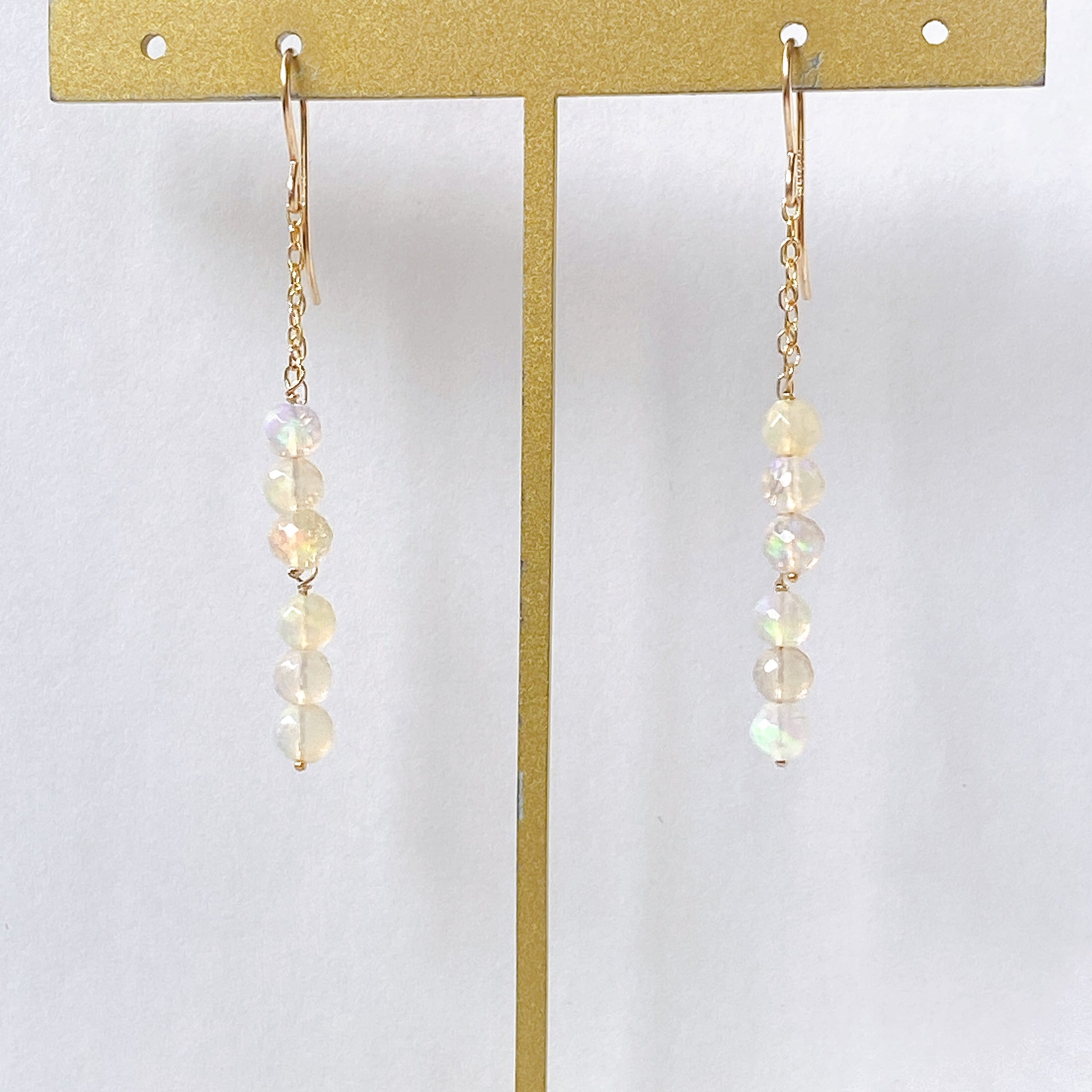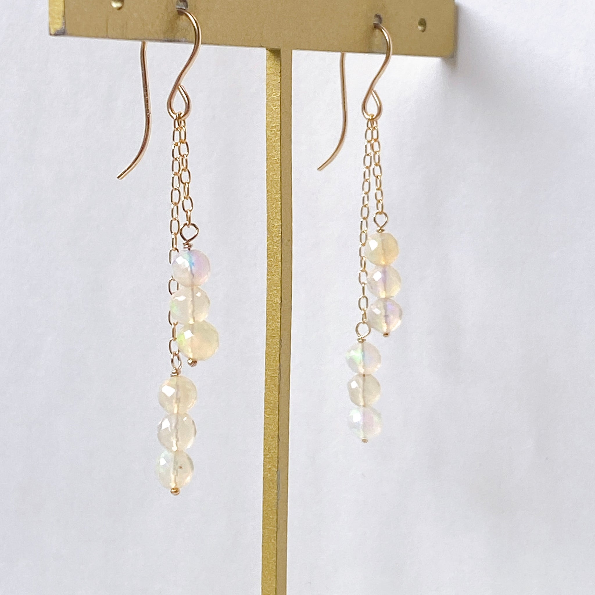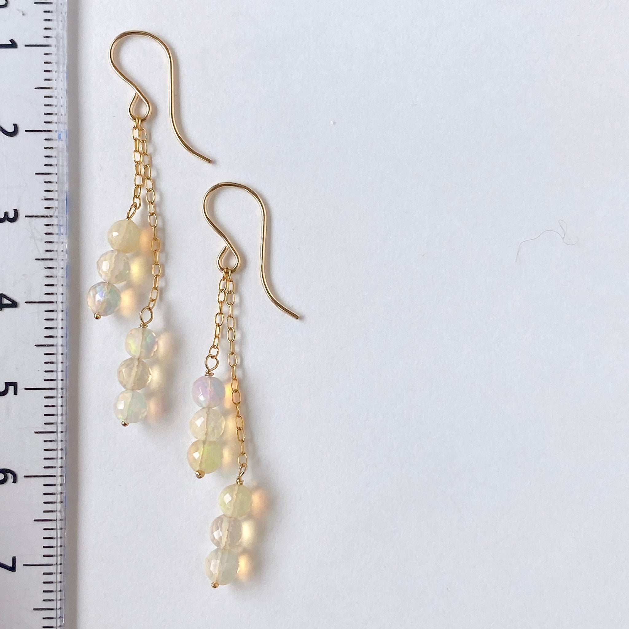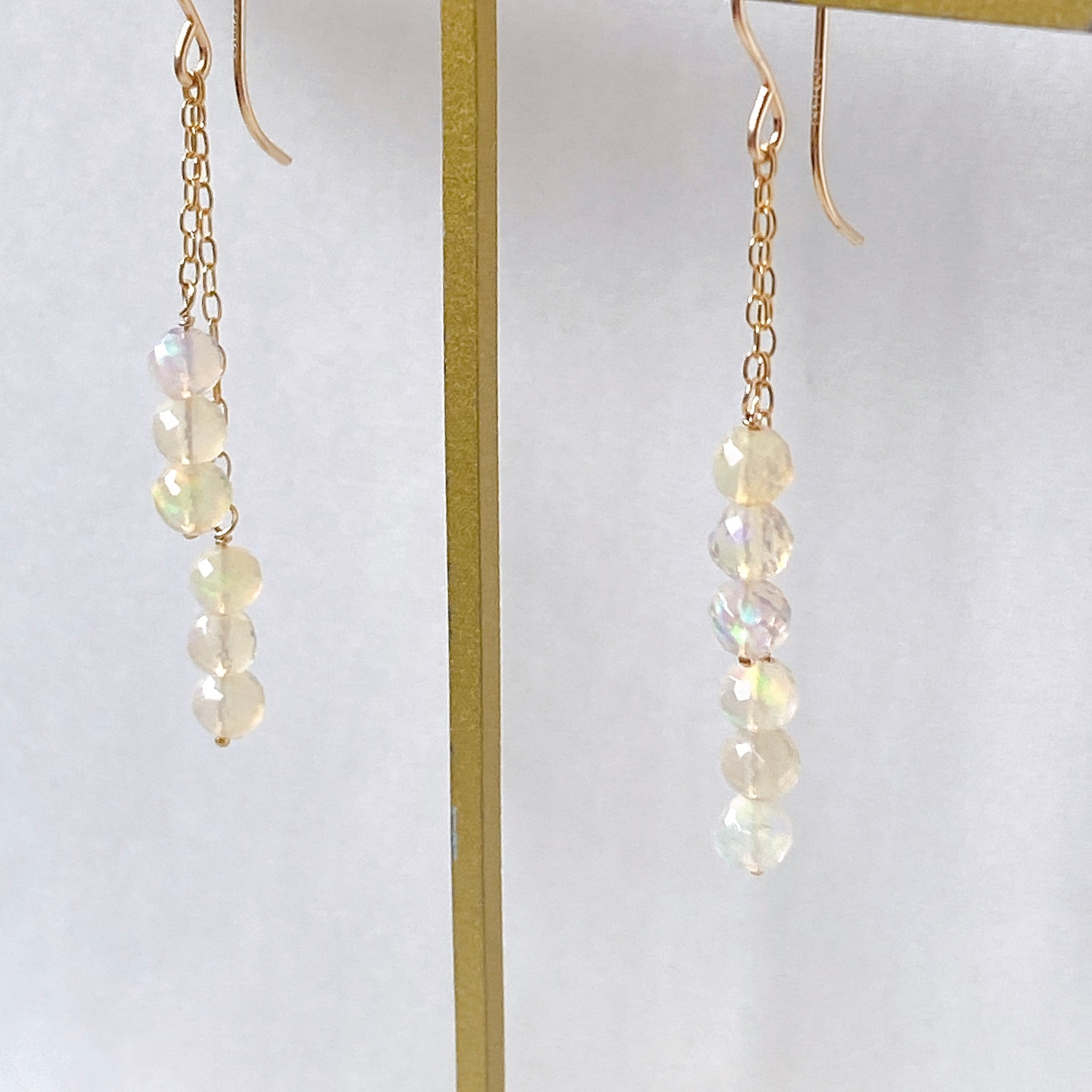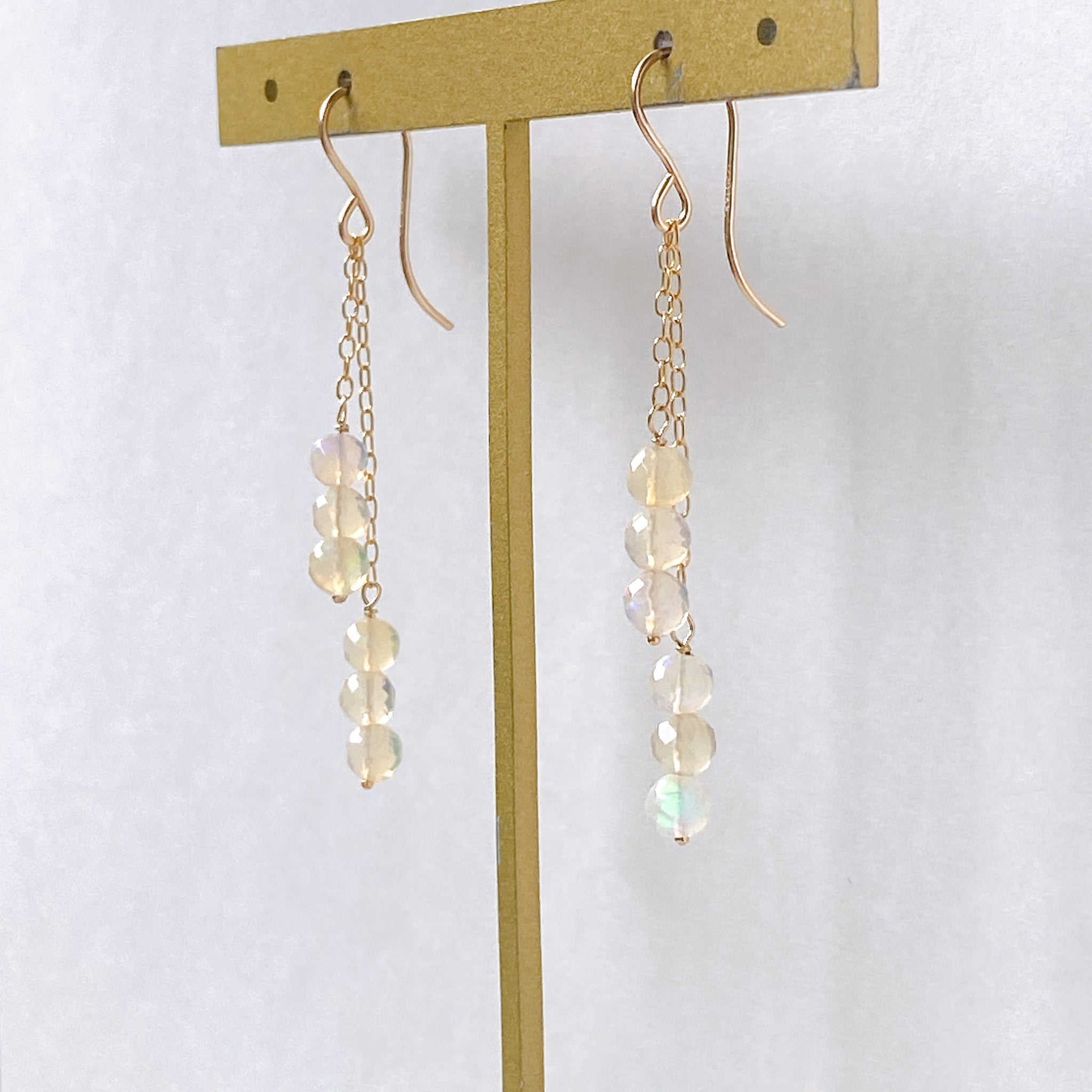 表面にカットの入ったミラーボールのようなオパールを片耳6粒ずつ、14kgf製の華奢なチェーンに繋いでデザインしました。