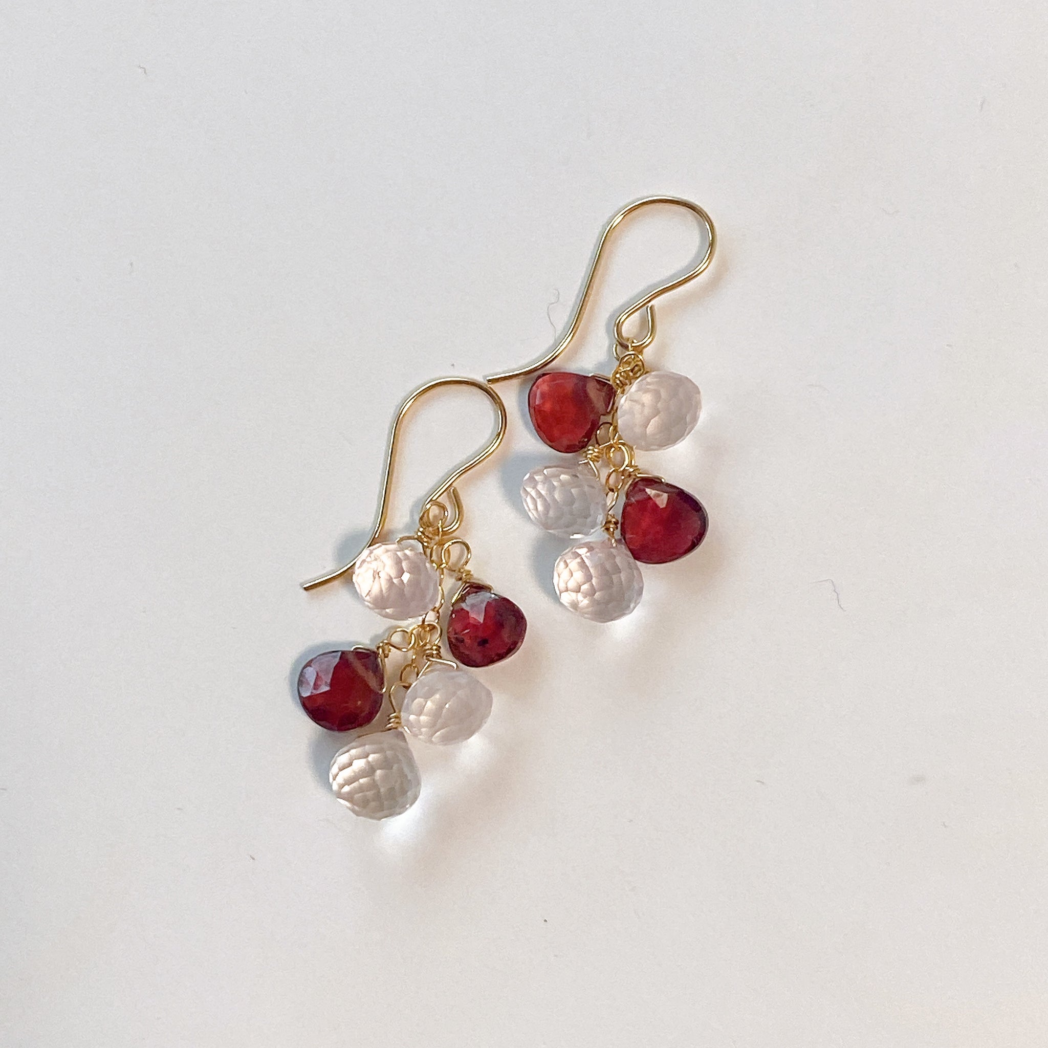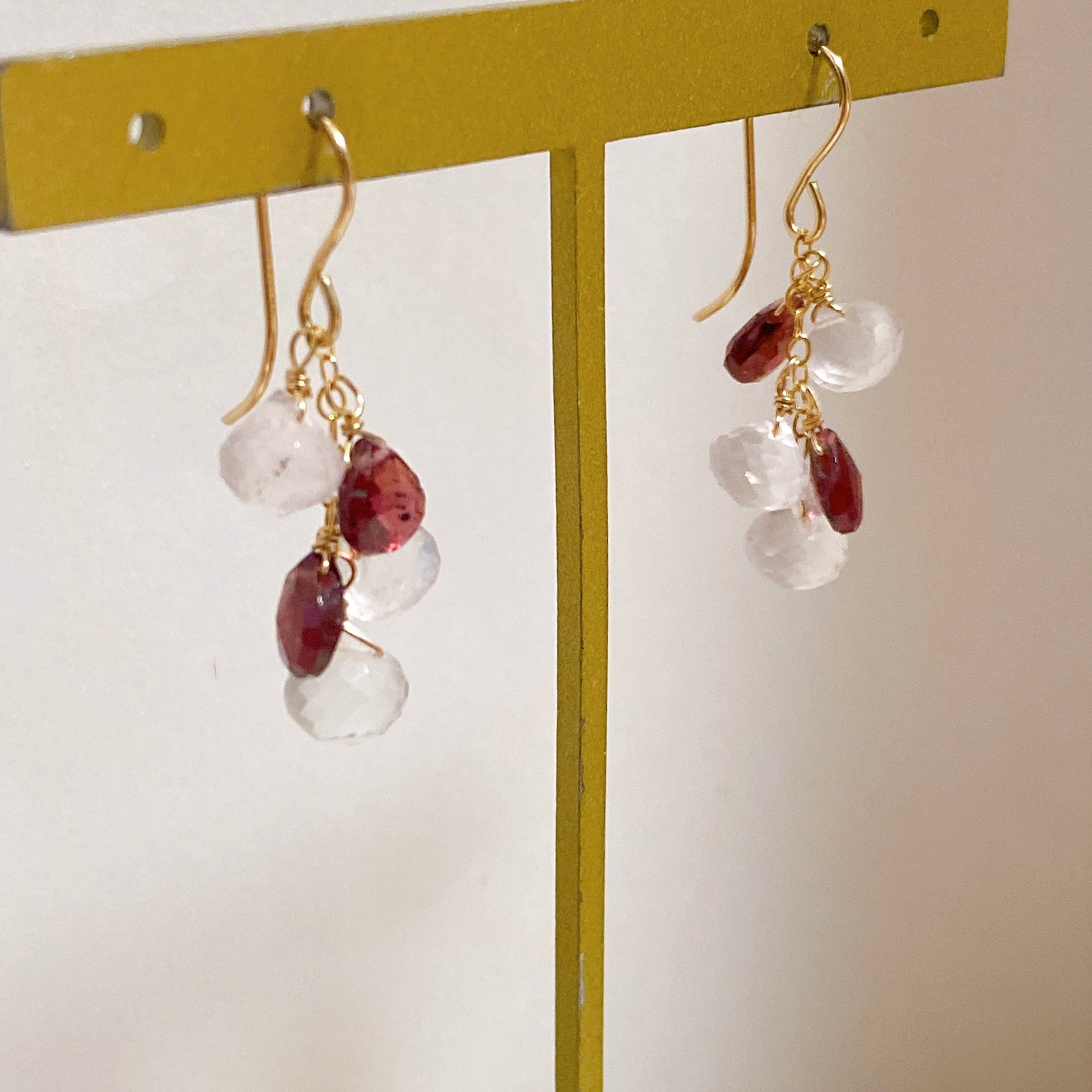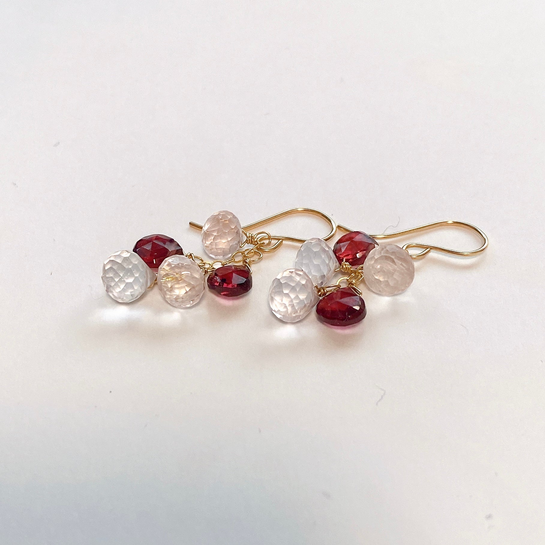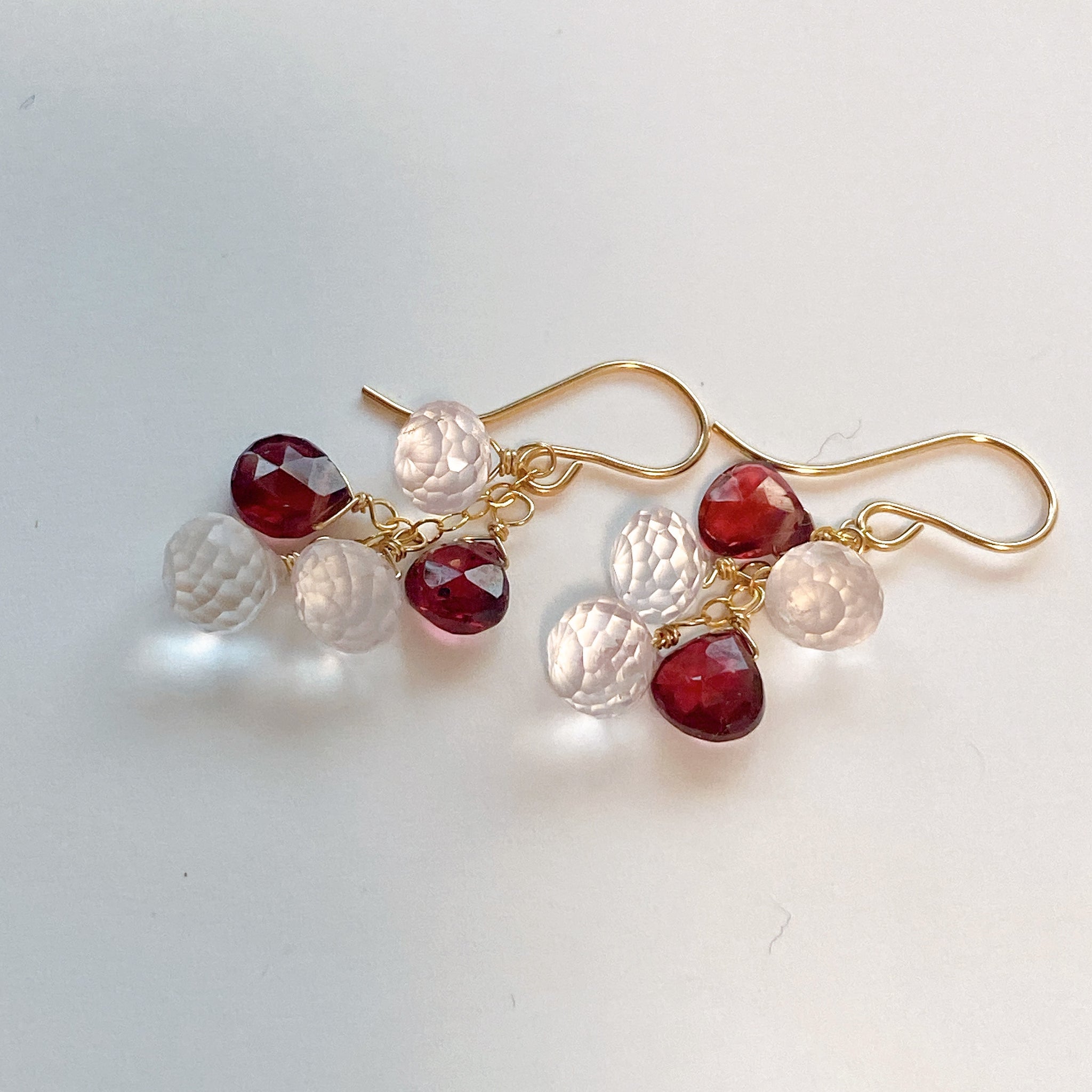 オニオンカットのローズクォーツとマロンカットのロードライトガーネットを使ってデザインした耳飾りです。