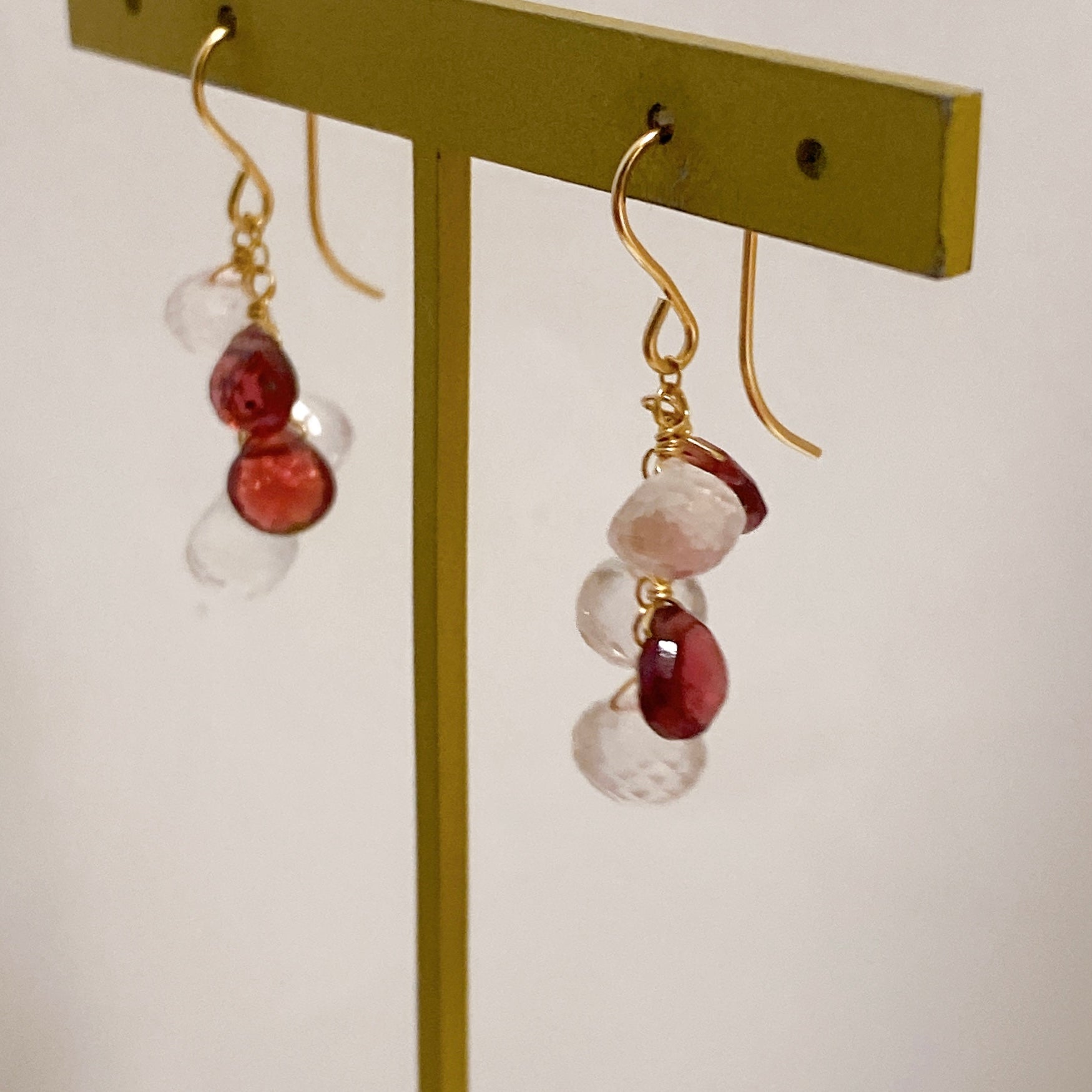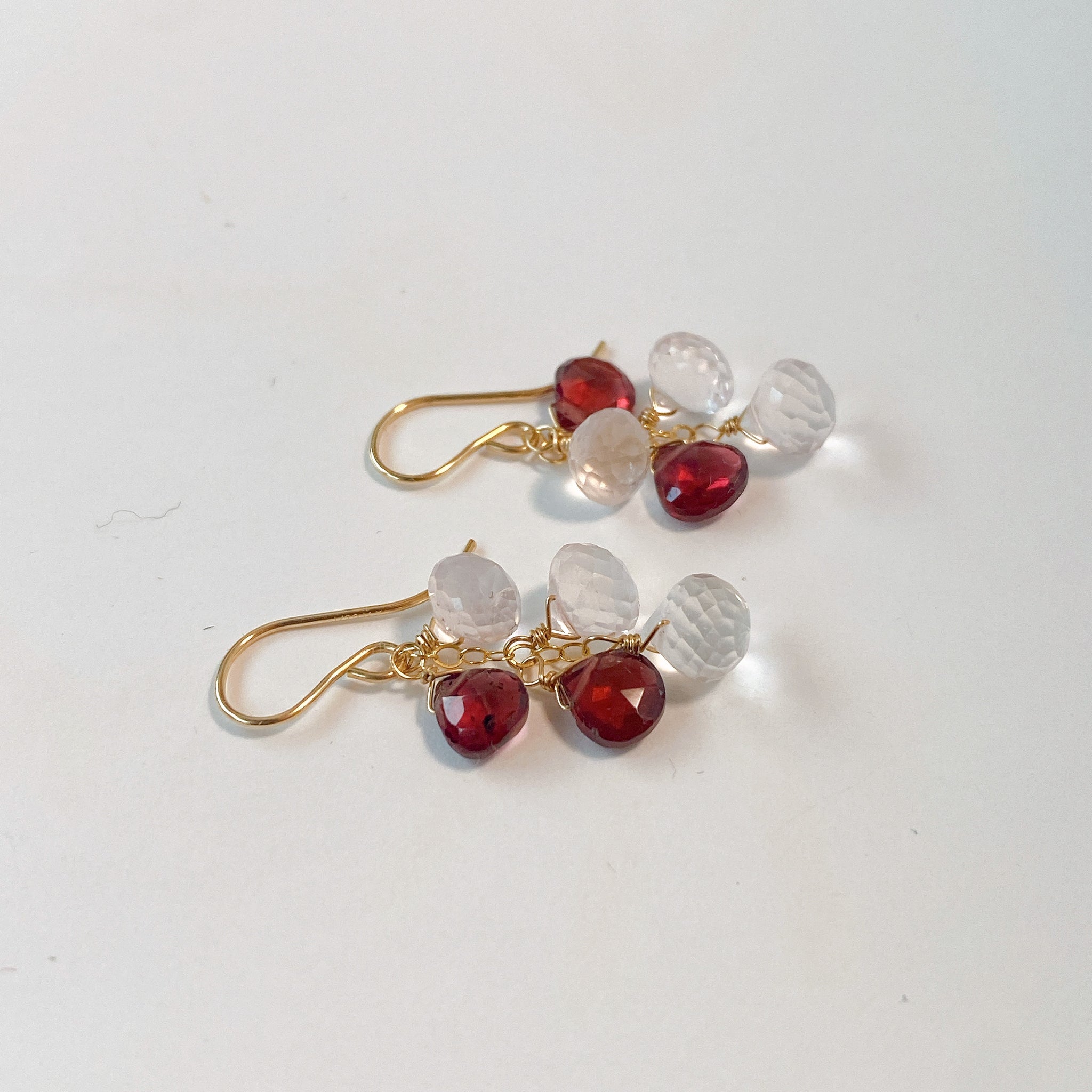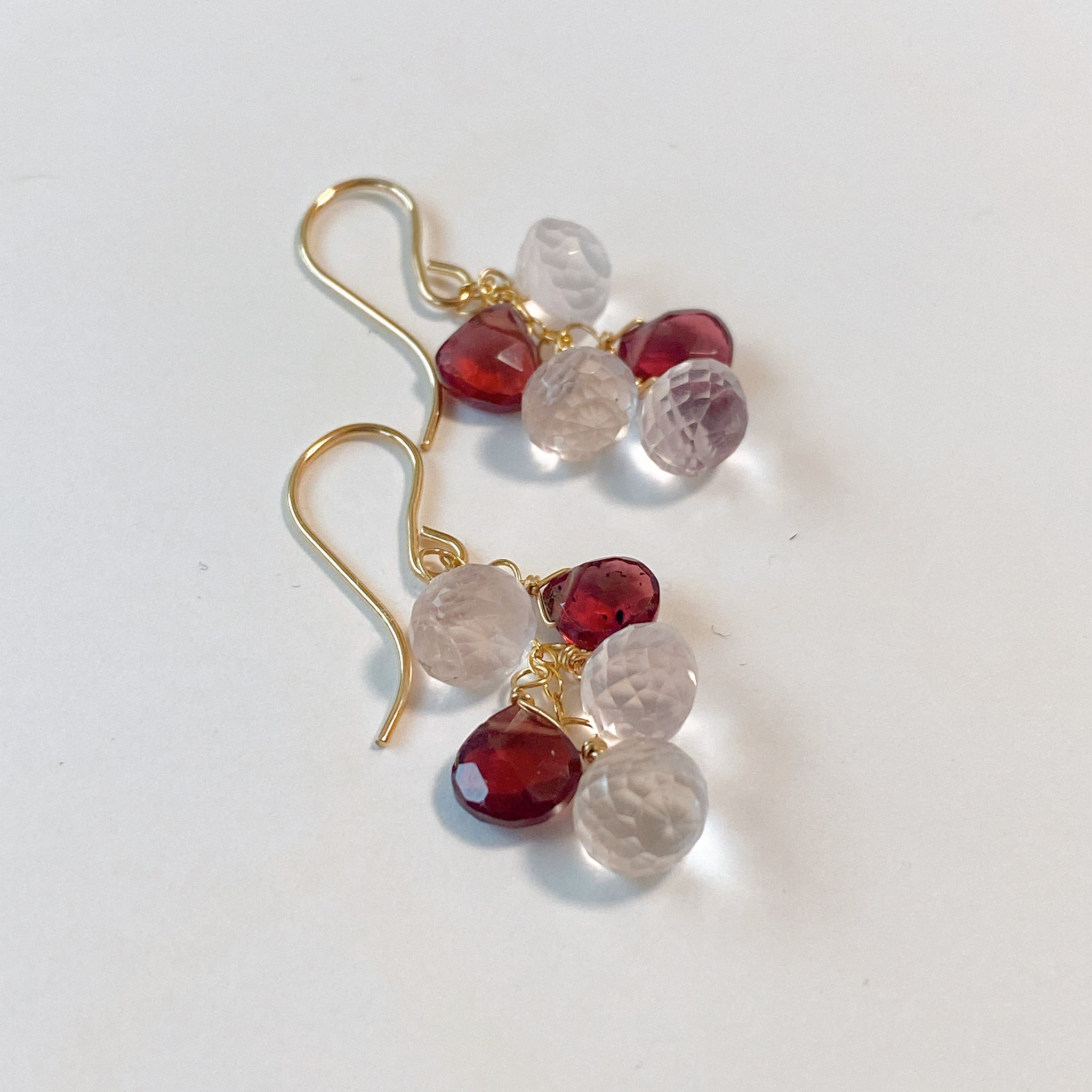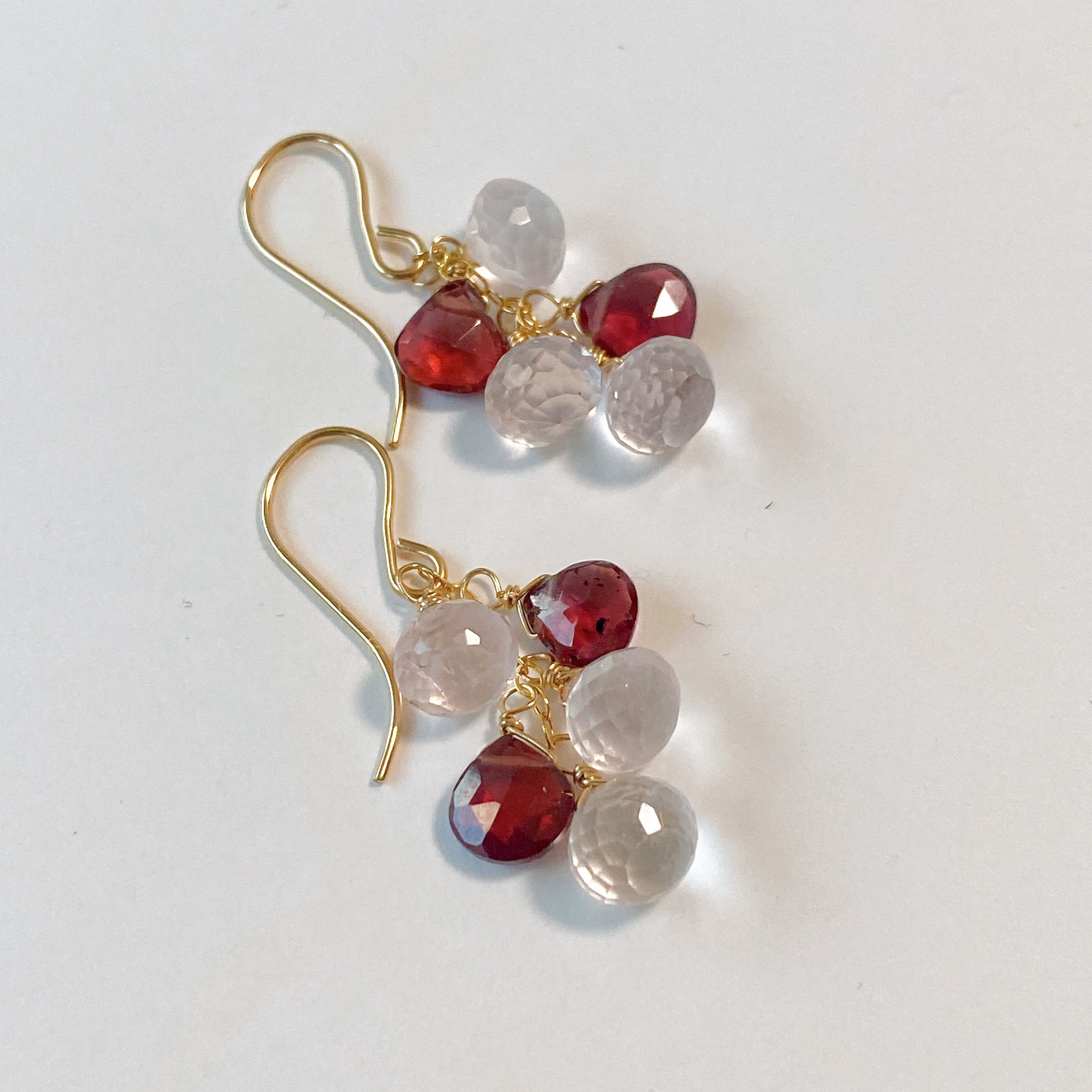 オニオンカットのローズクォーツとマロンカットのロードライトガーネットを使ってデザインした耳飾りです。