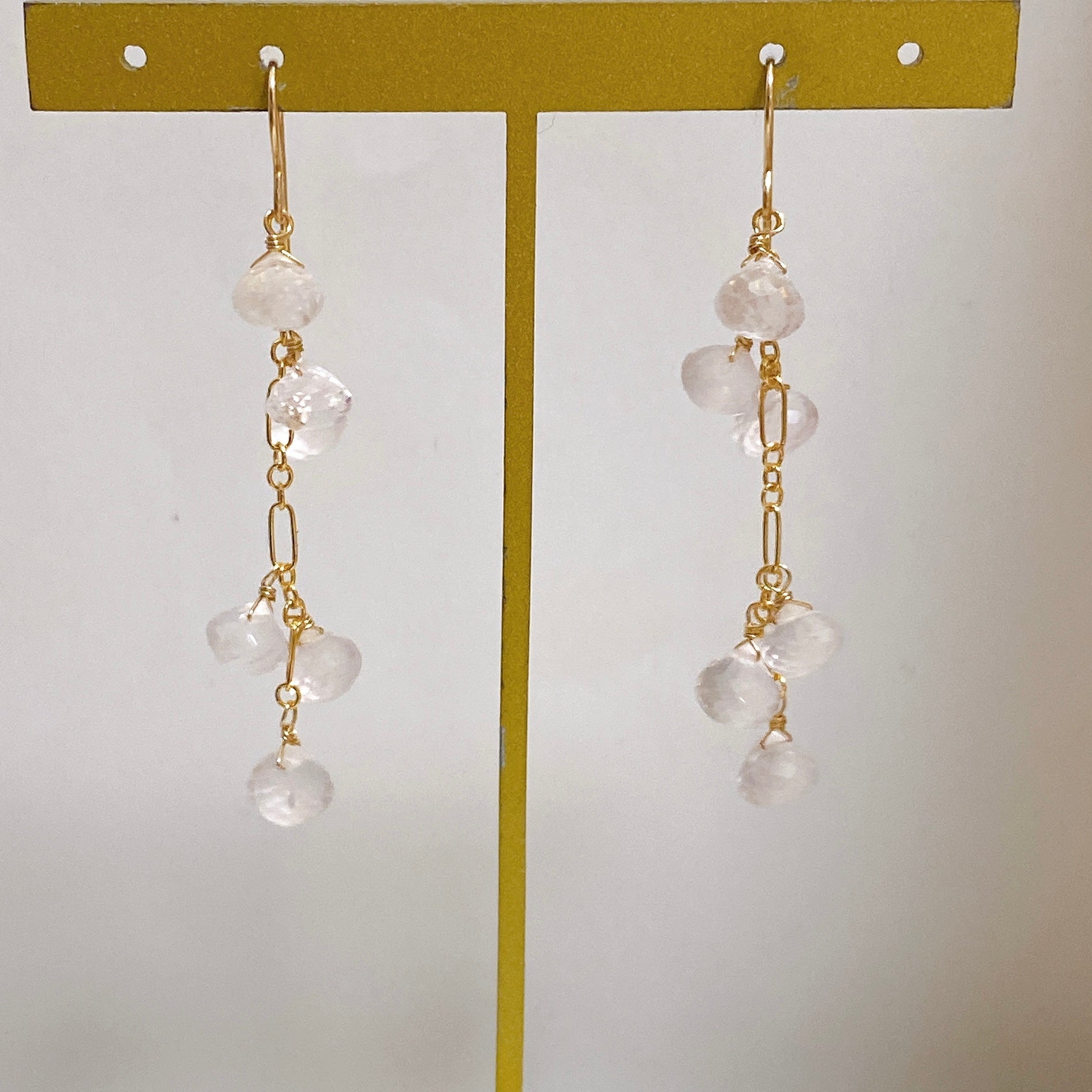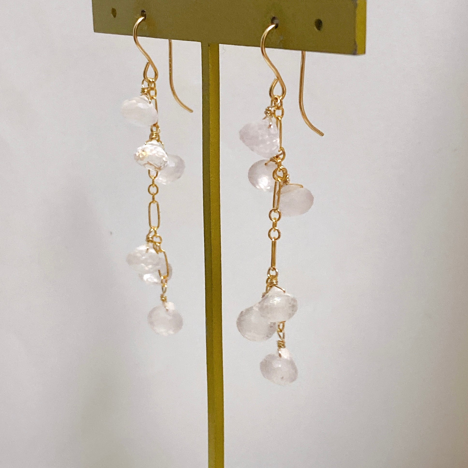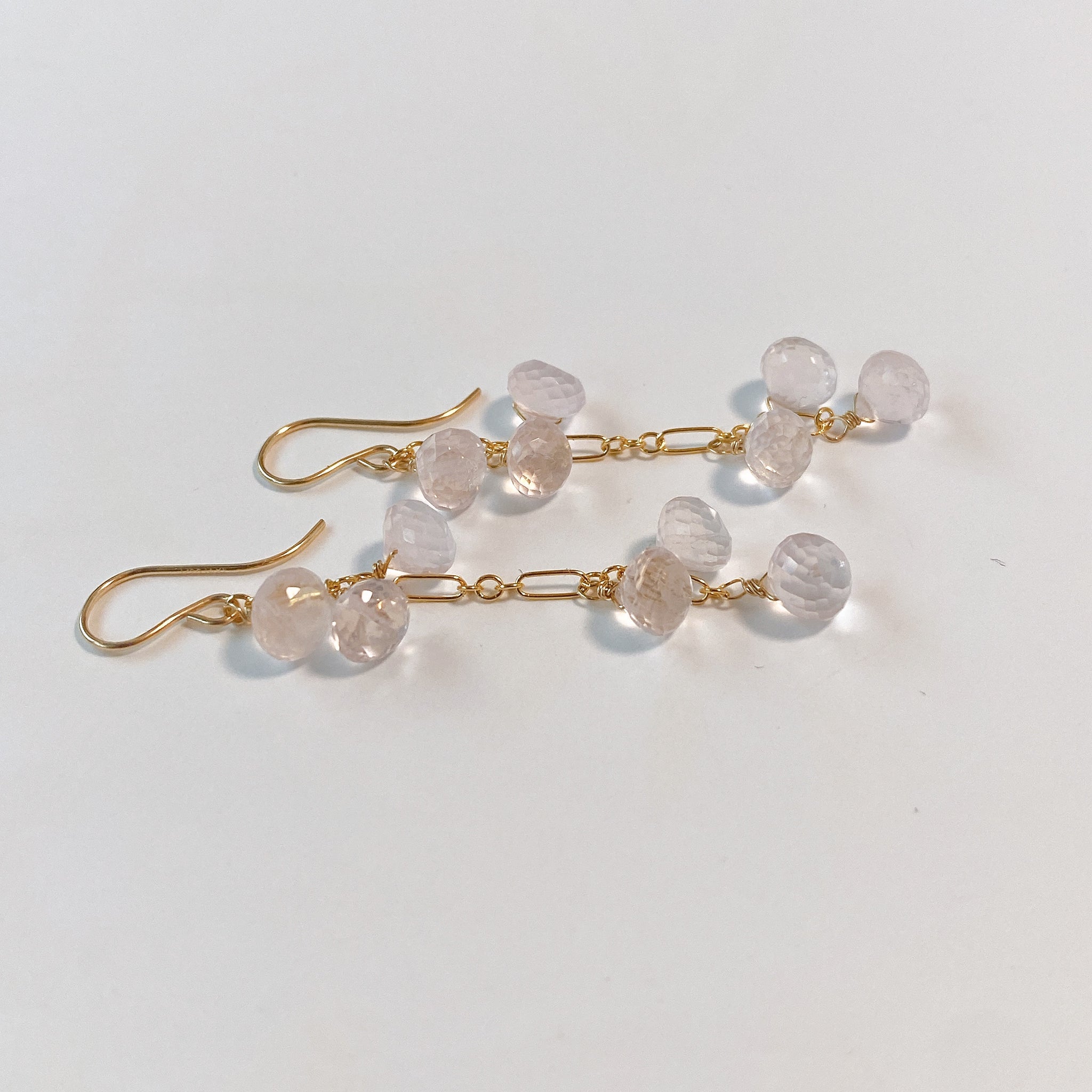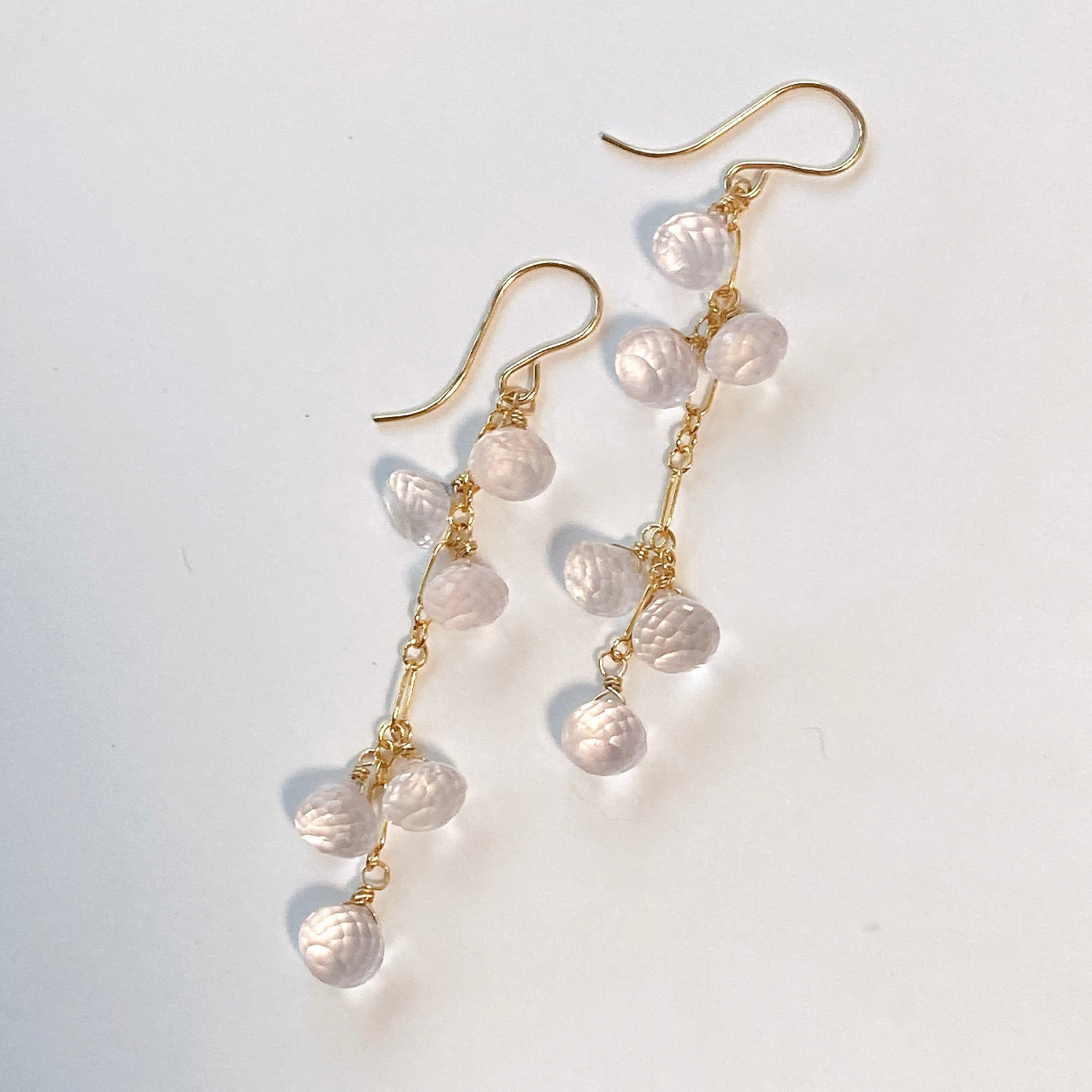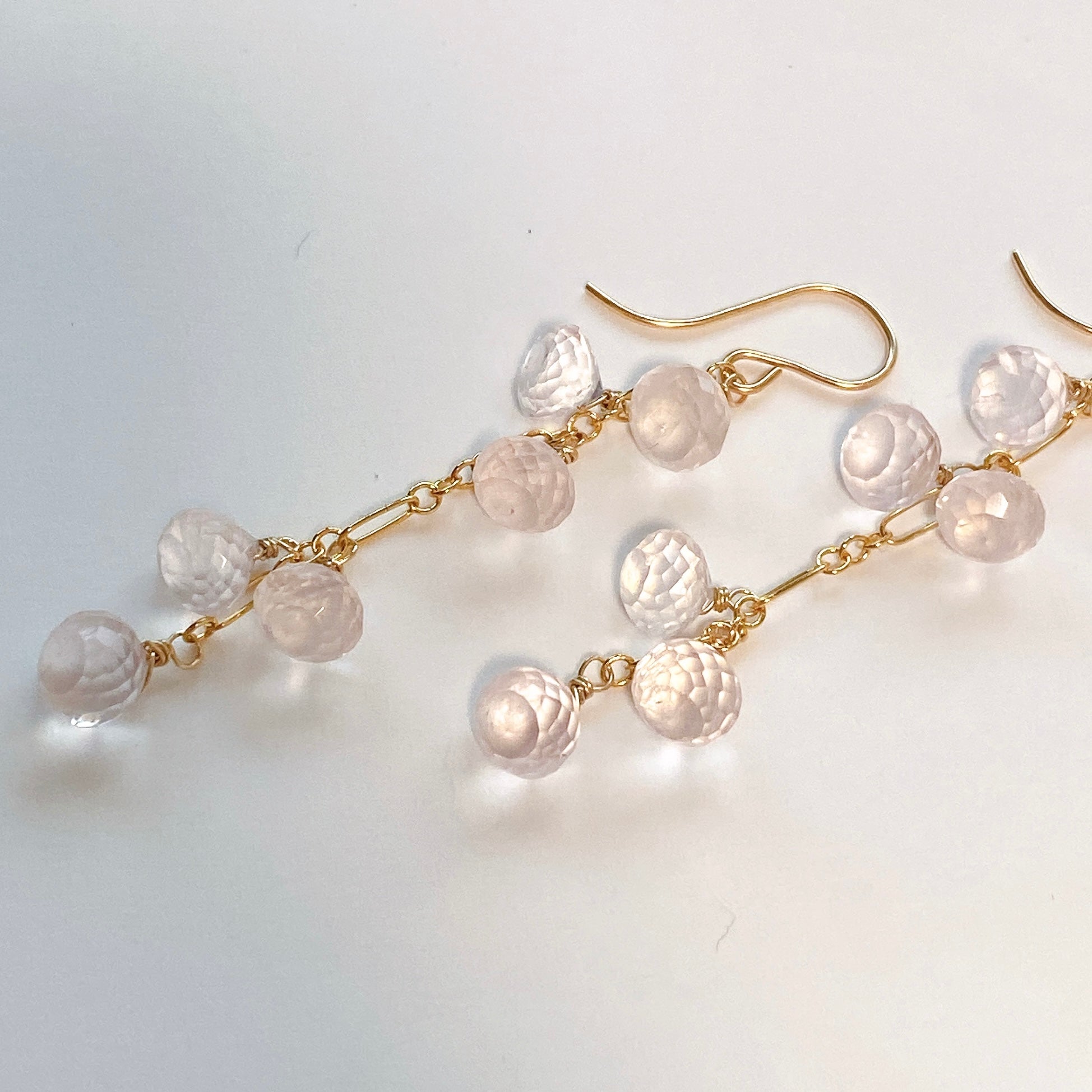 ころころとしたローズクォーツが可愛らしいロングピアスです。