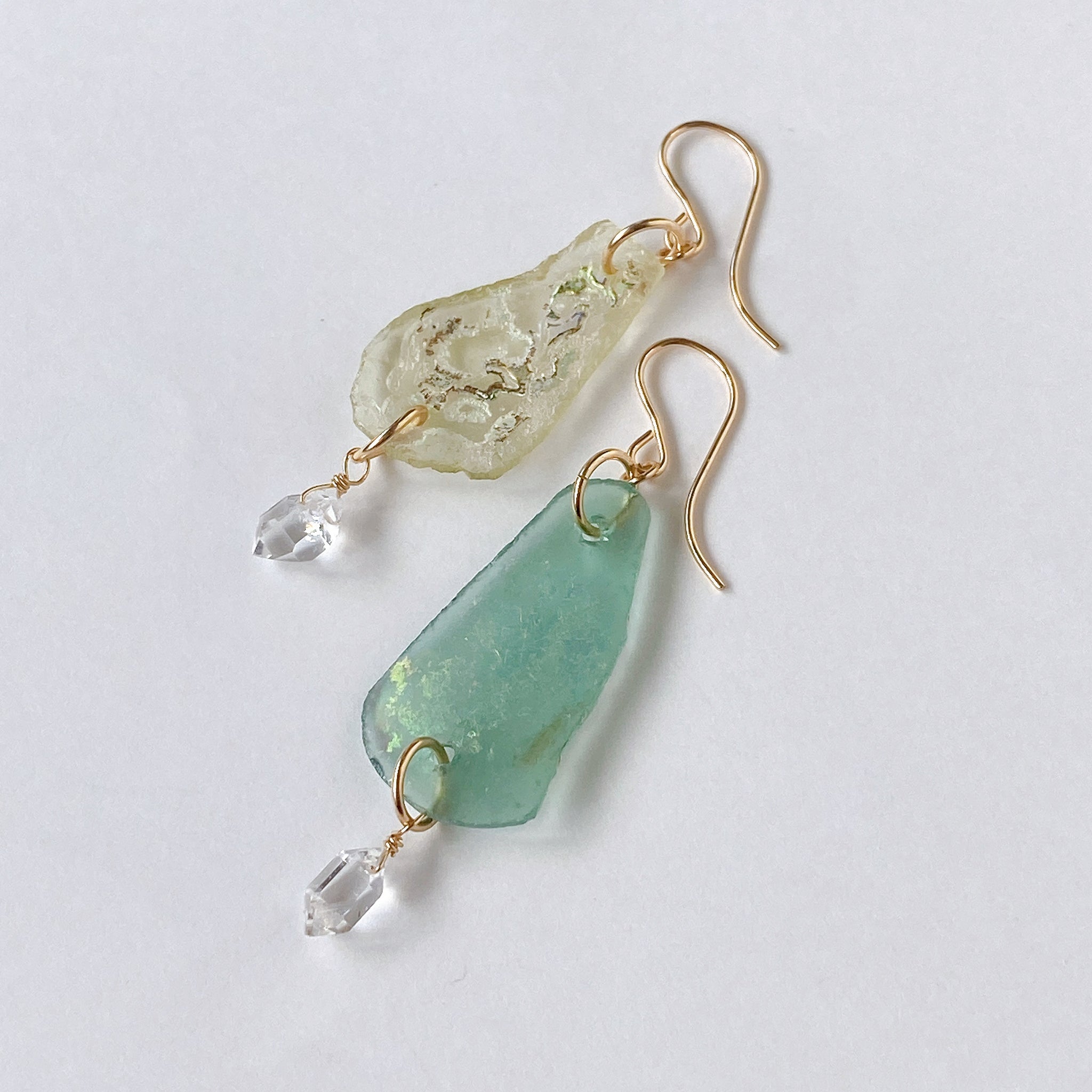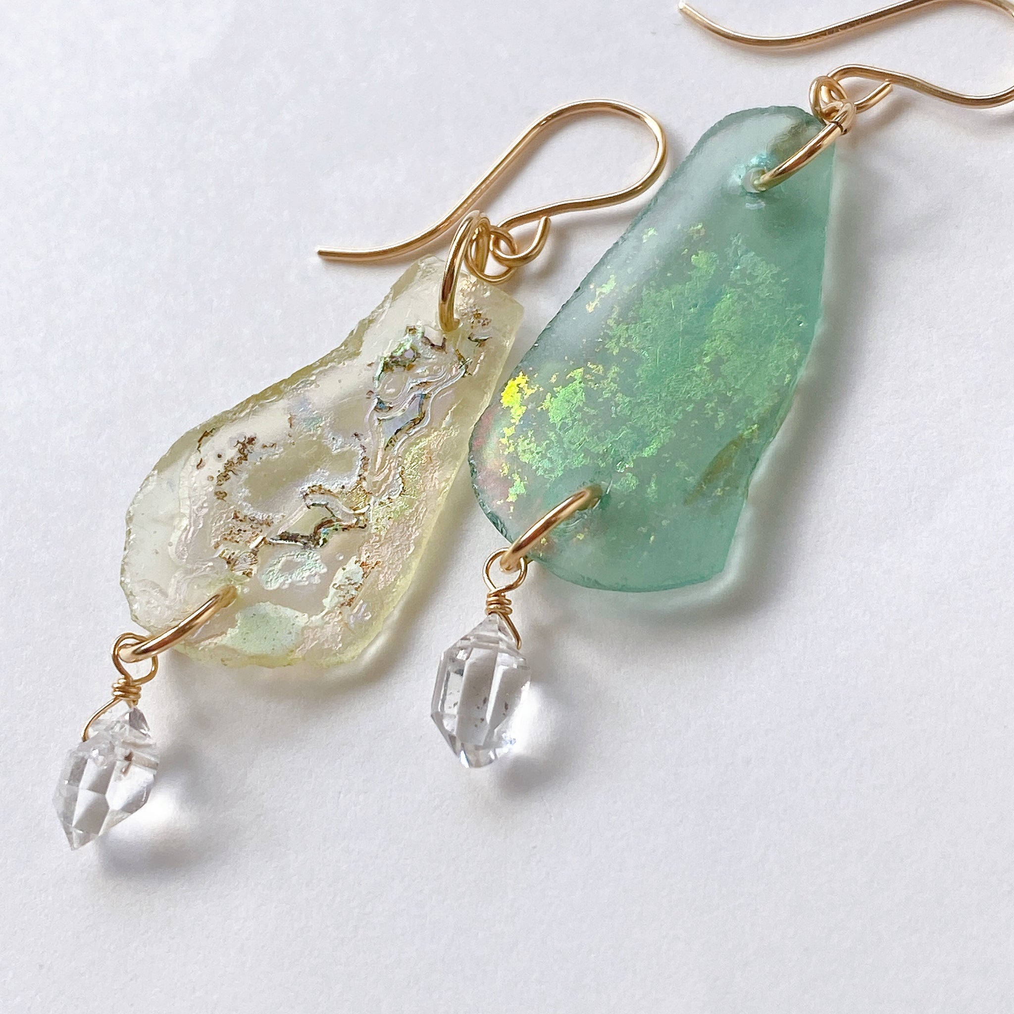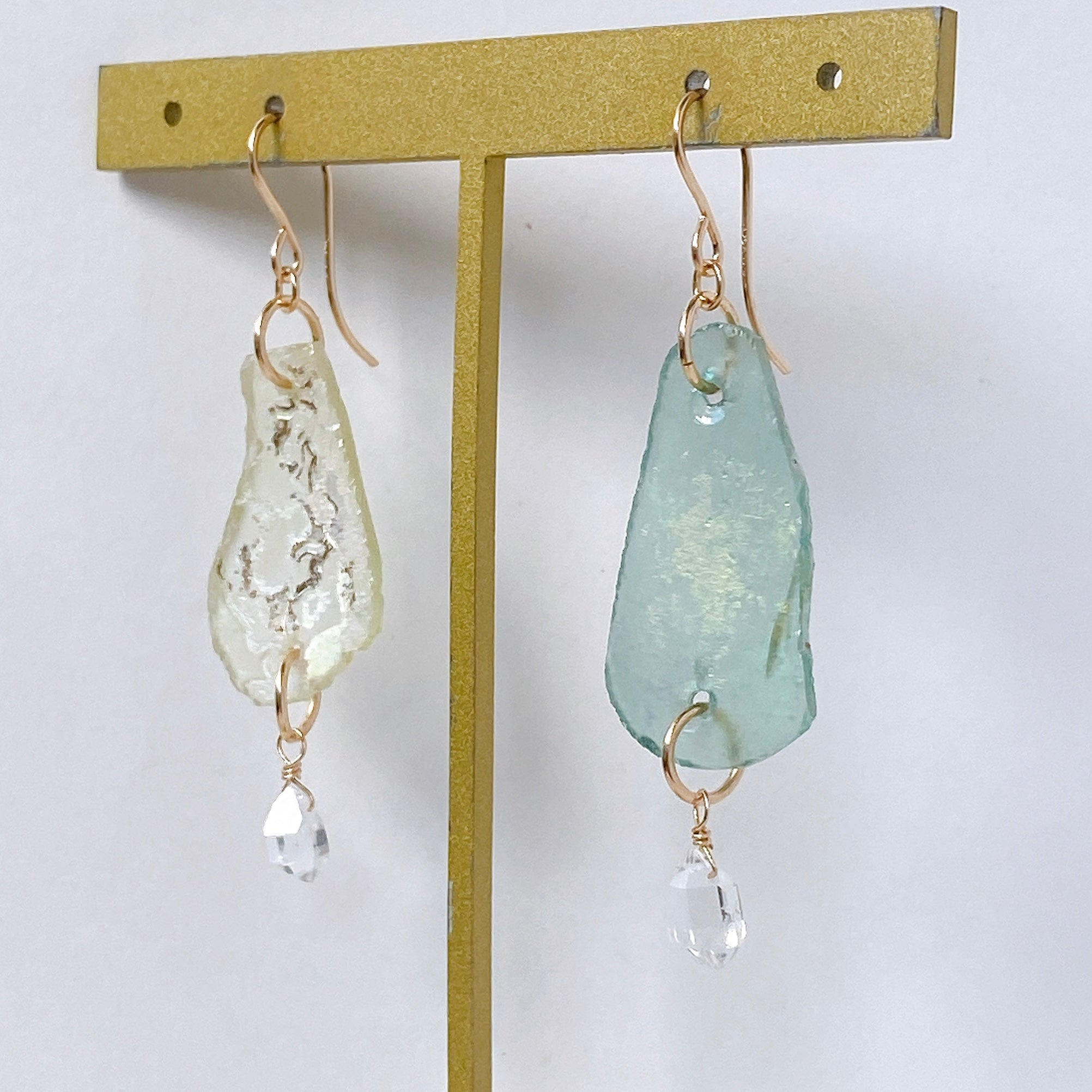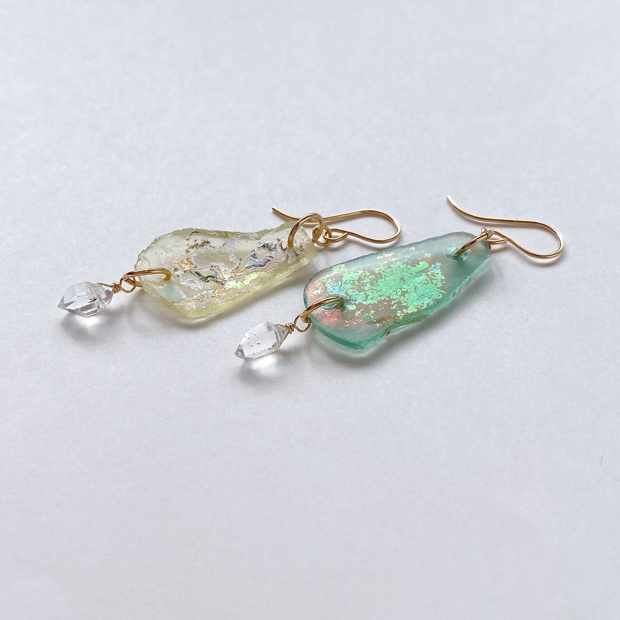 ローマンガラスとハーキマークォーツを使ってデザインした耳飾りです。
