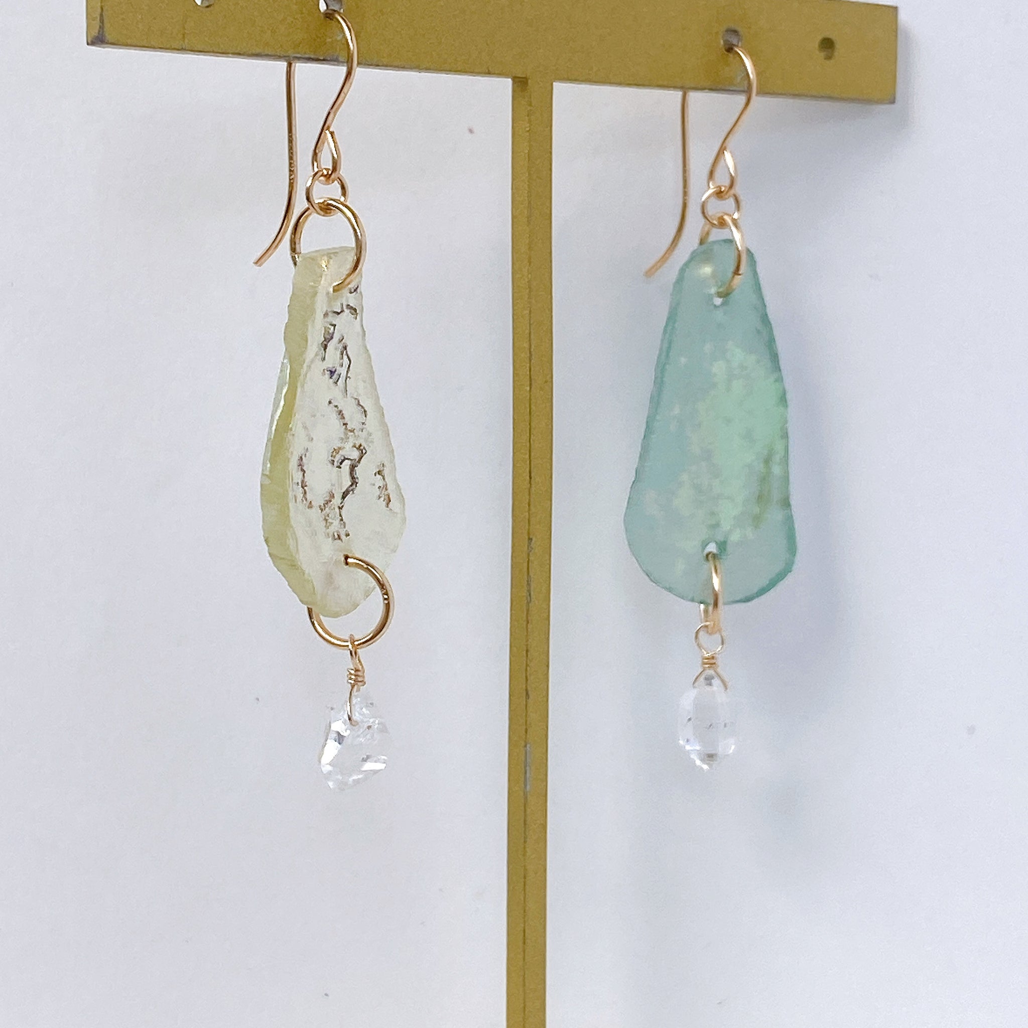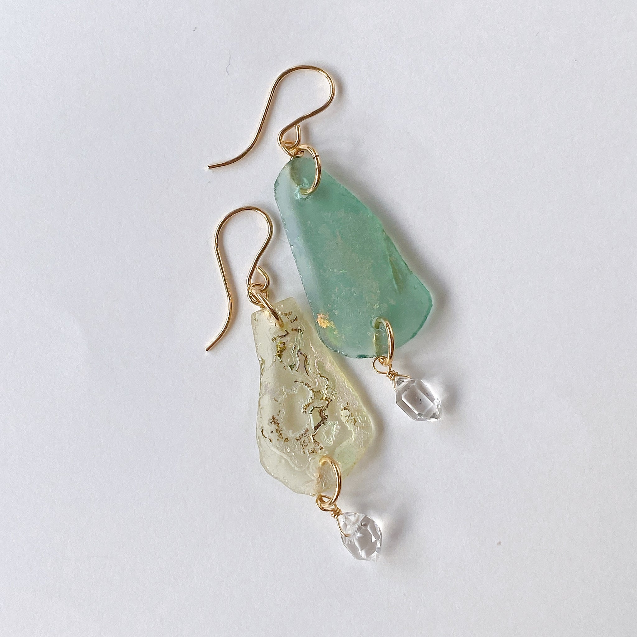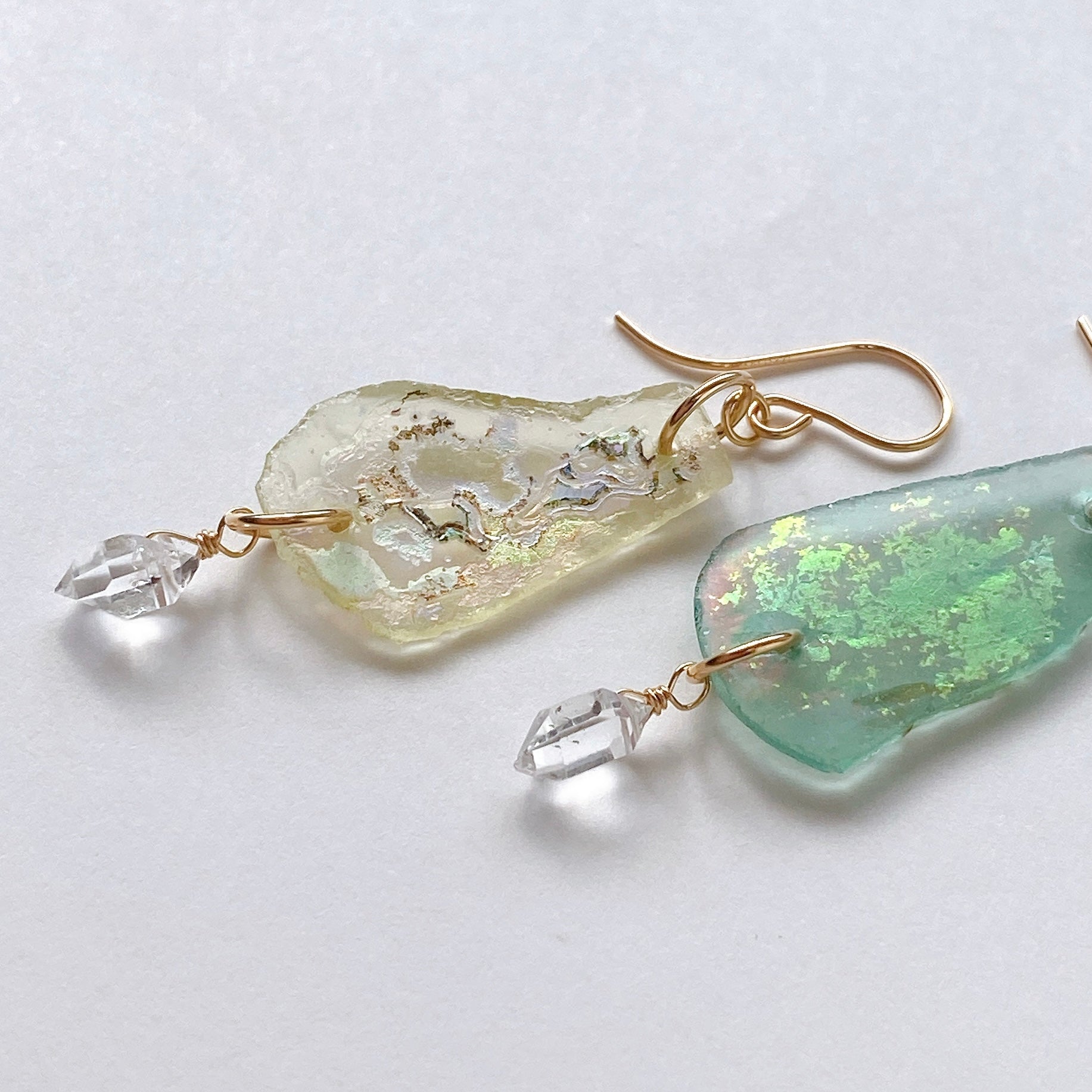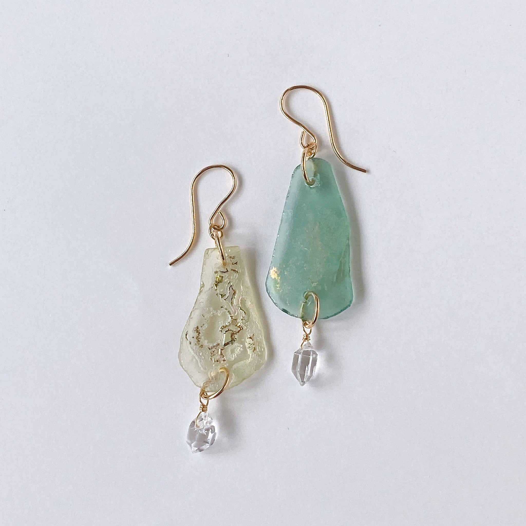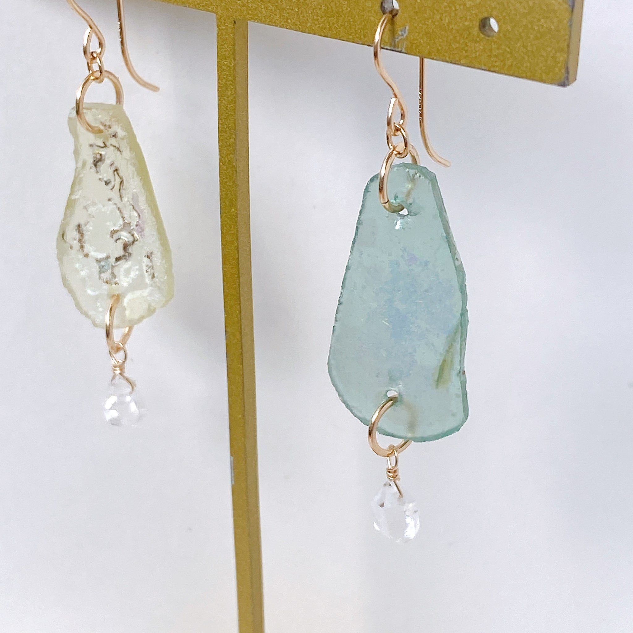 ローマンガラスとハーキマークォーツを使ってデザインした耳飾りです。