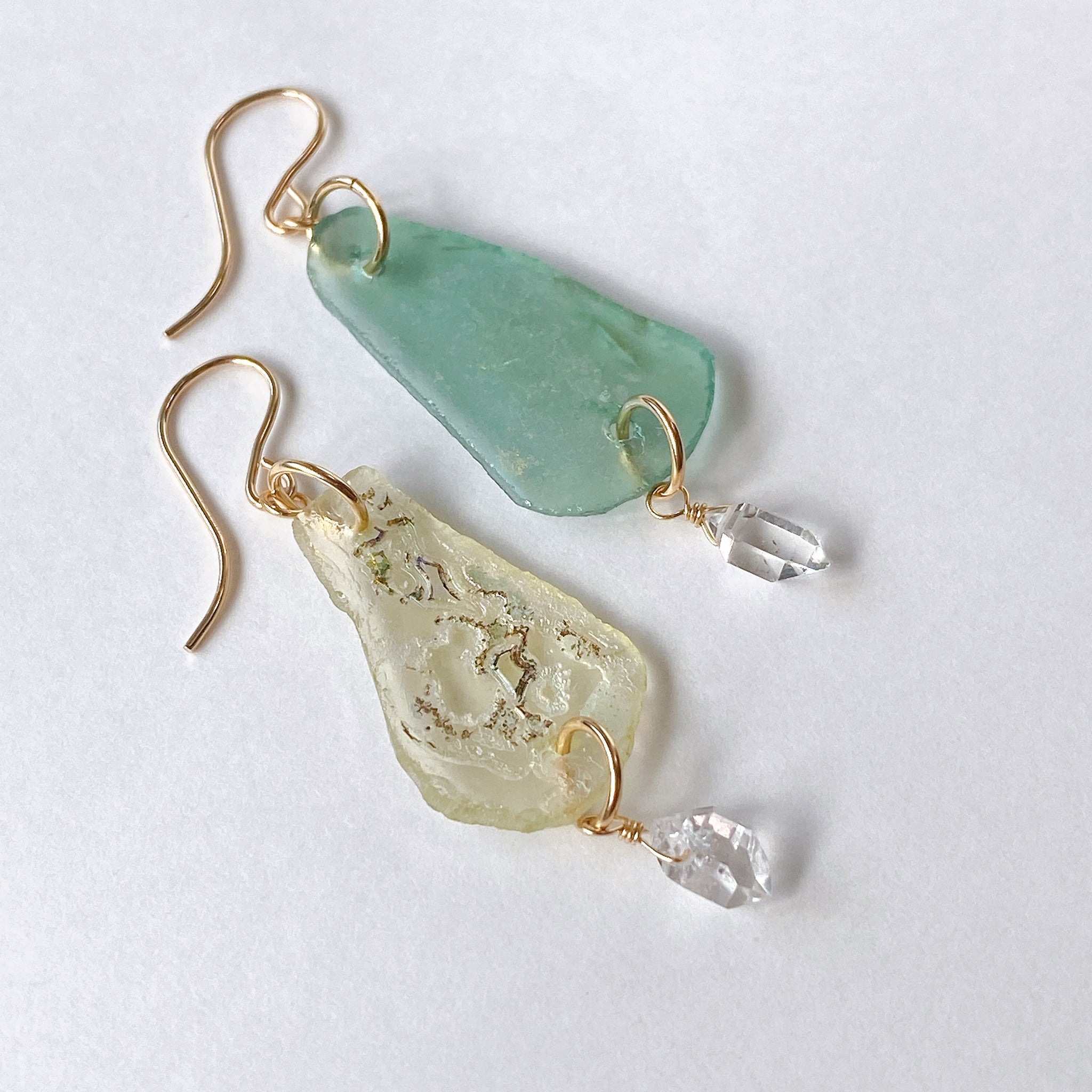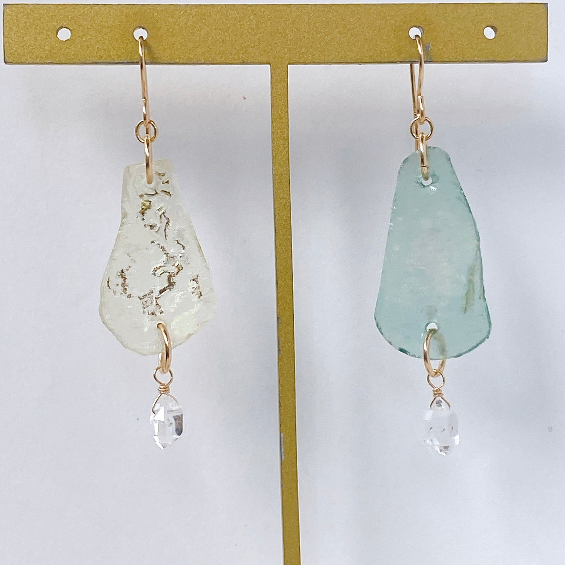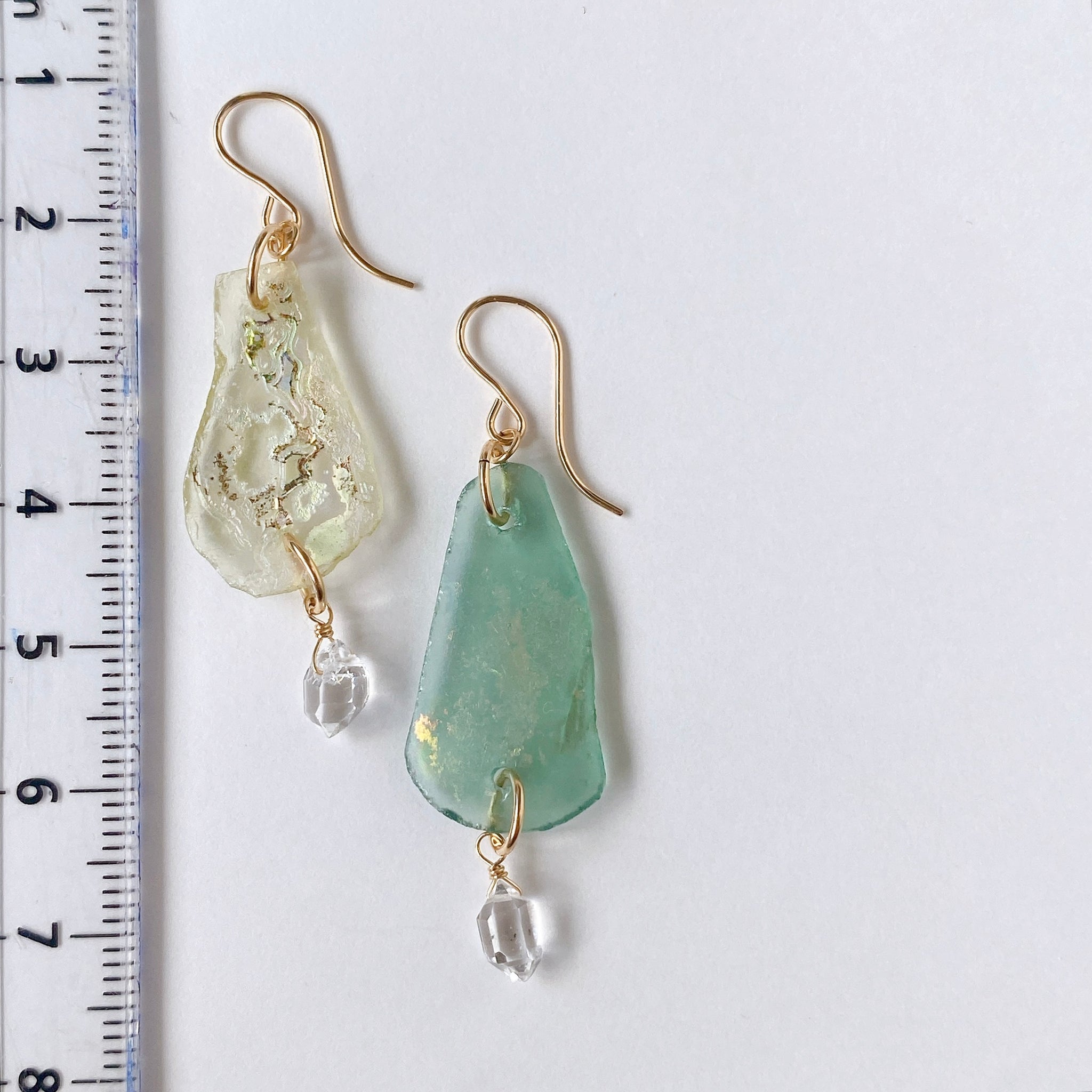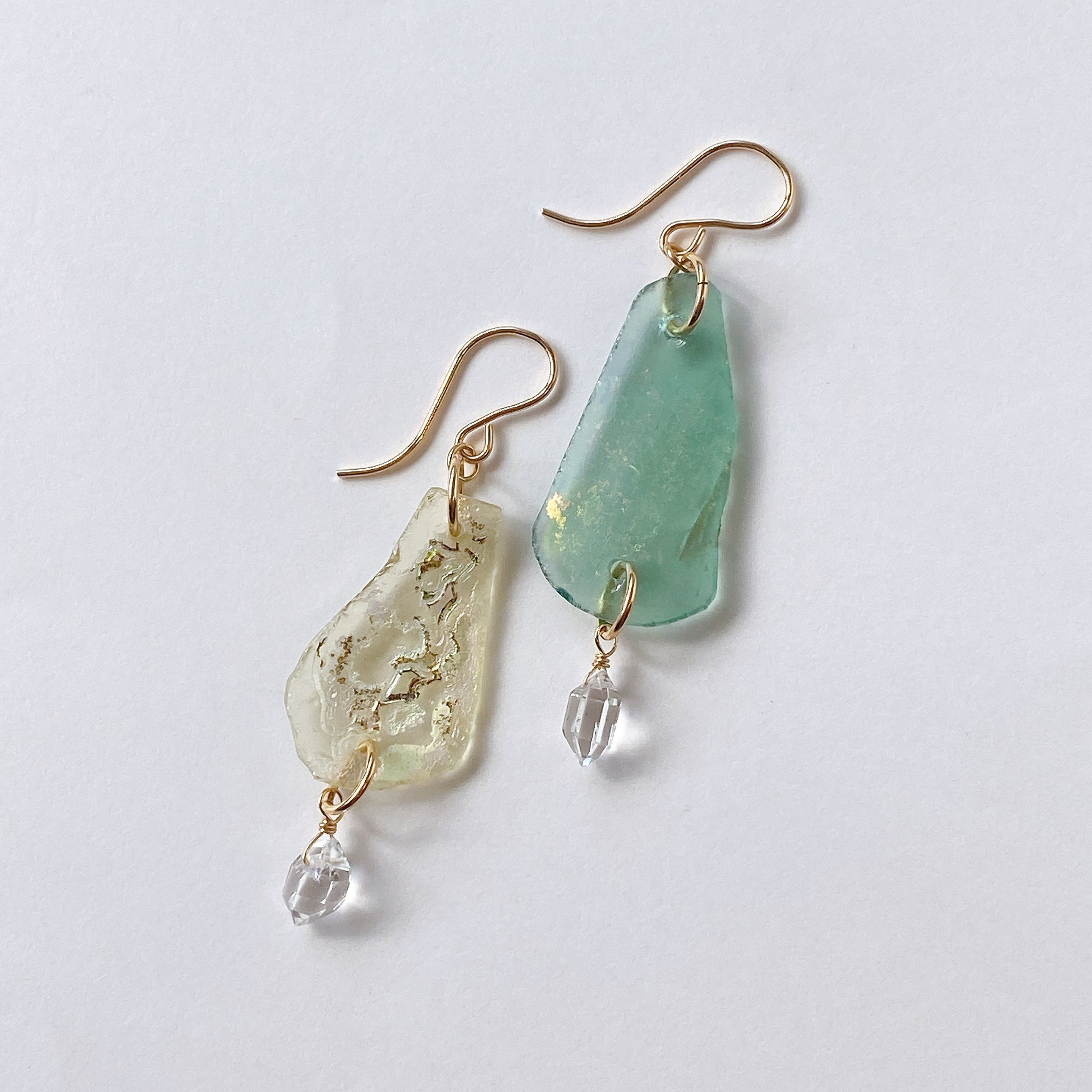 ローマンガラスとハーキマークォーツを使ってデザインした耳飾りです。