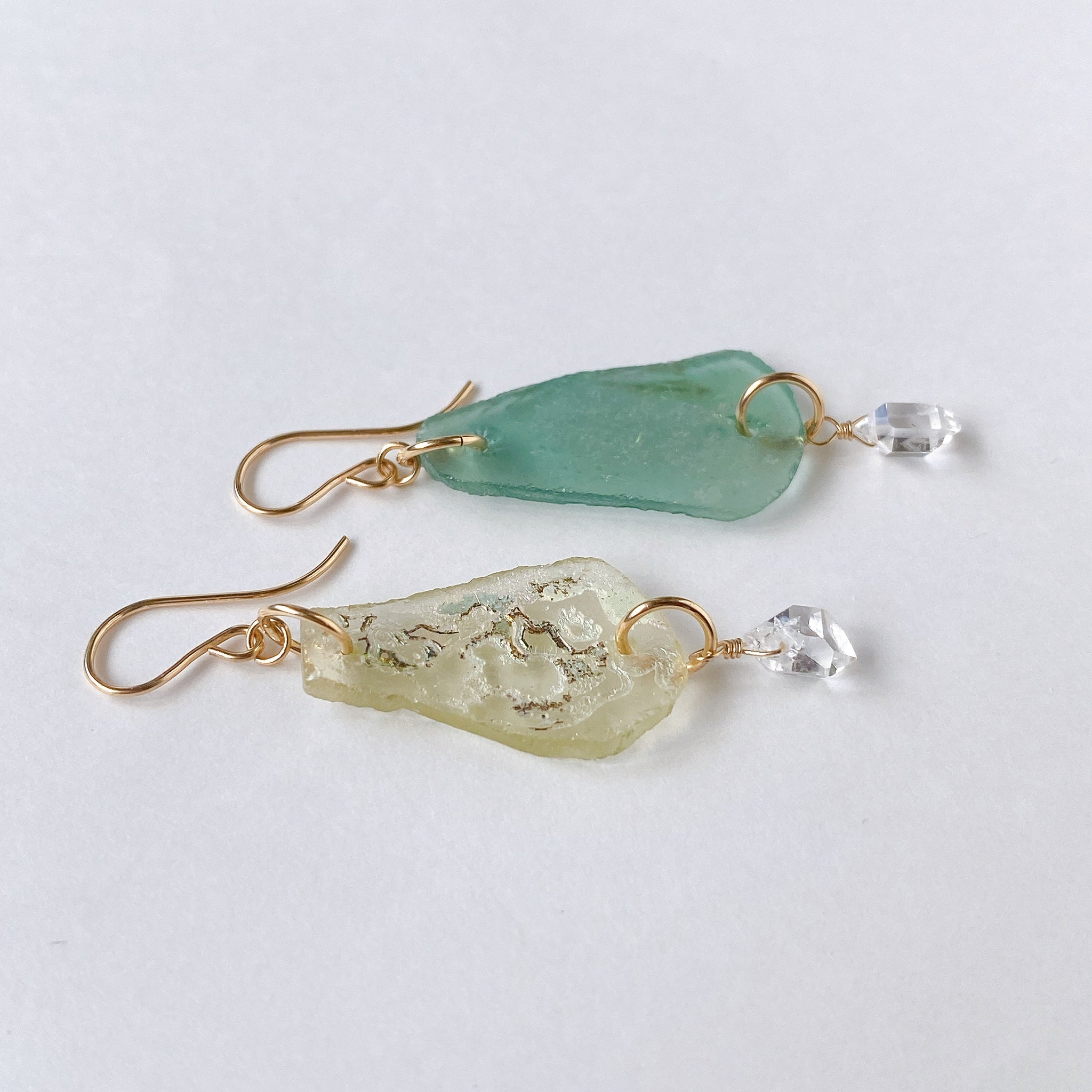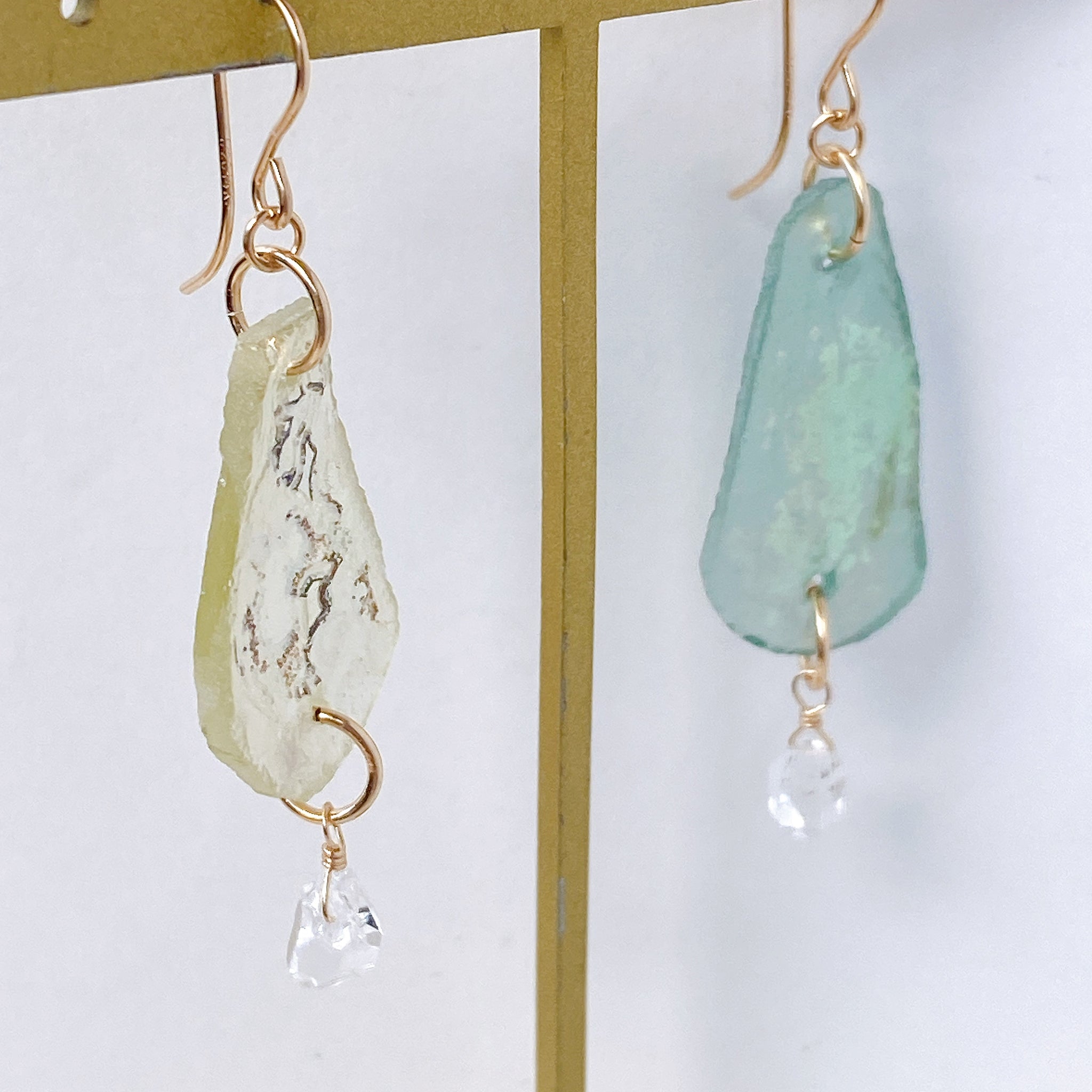 淡い色味のローマガラスのペアに一粒のクォーツを合わせた涼しげなデザインです。