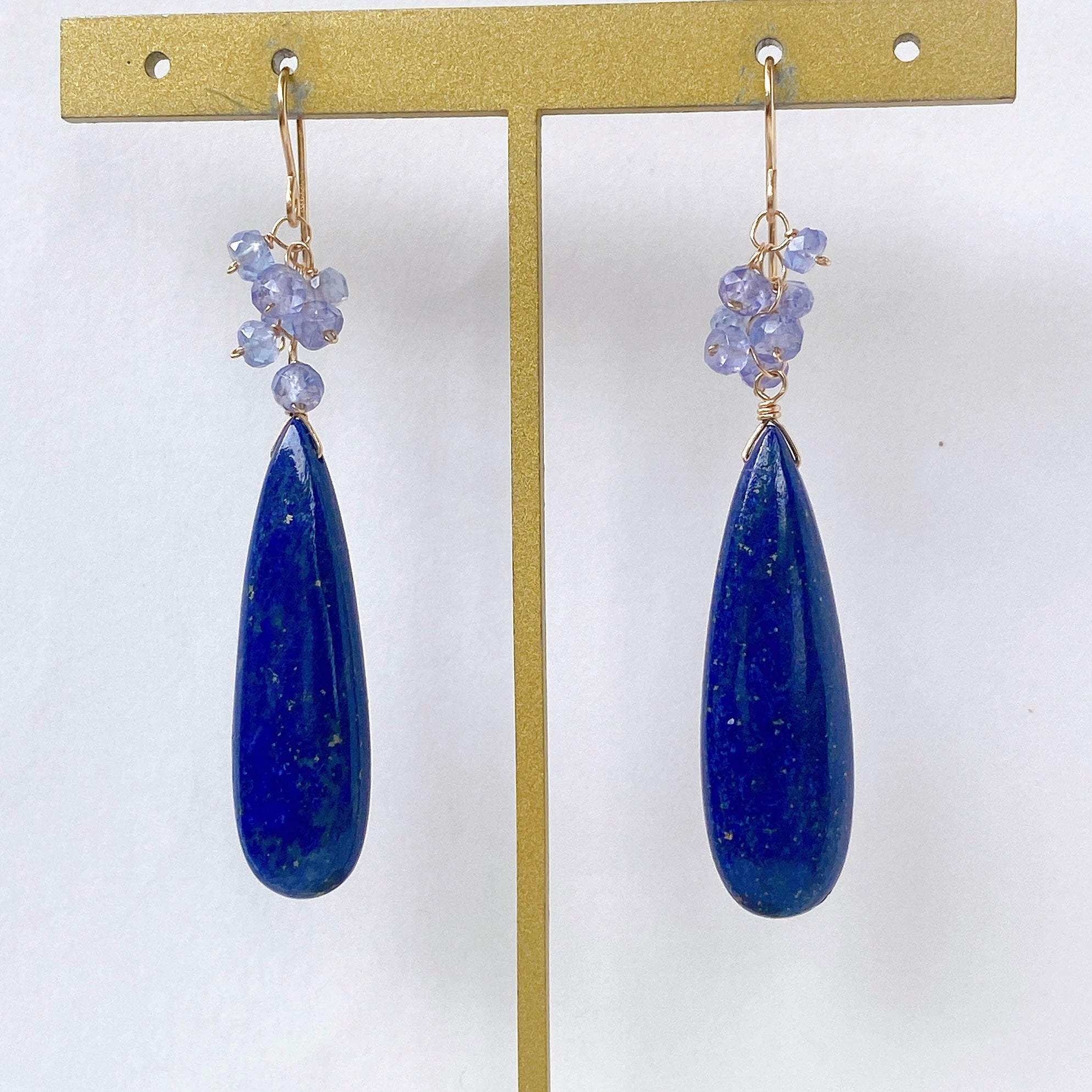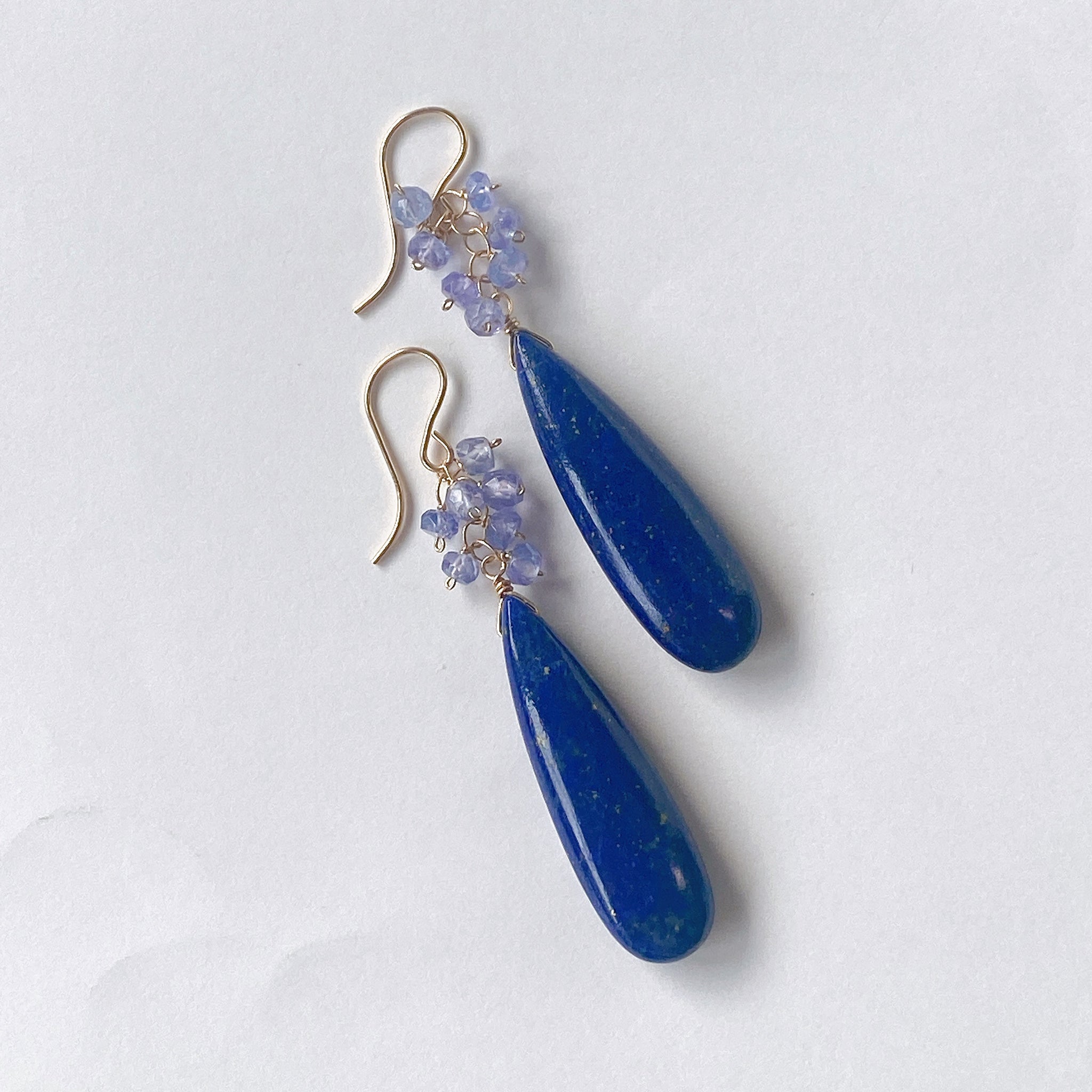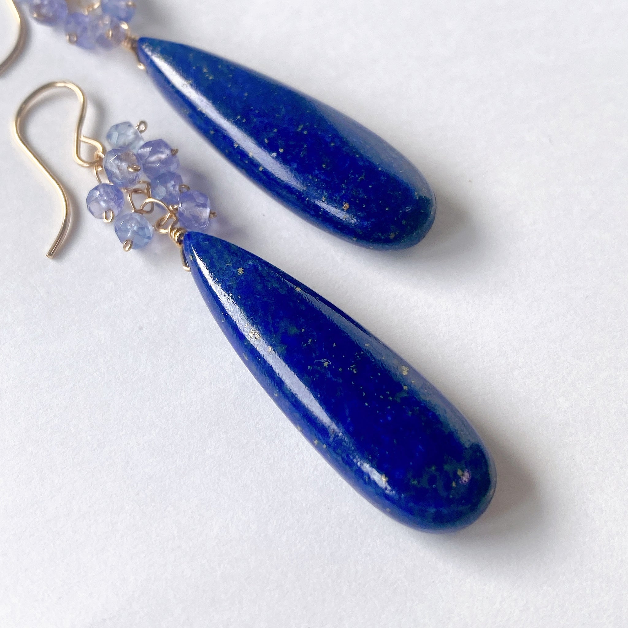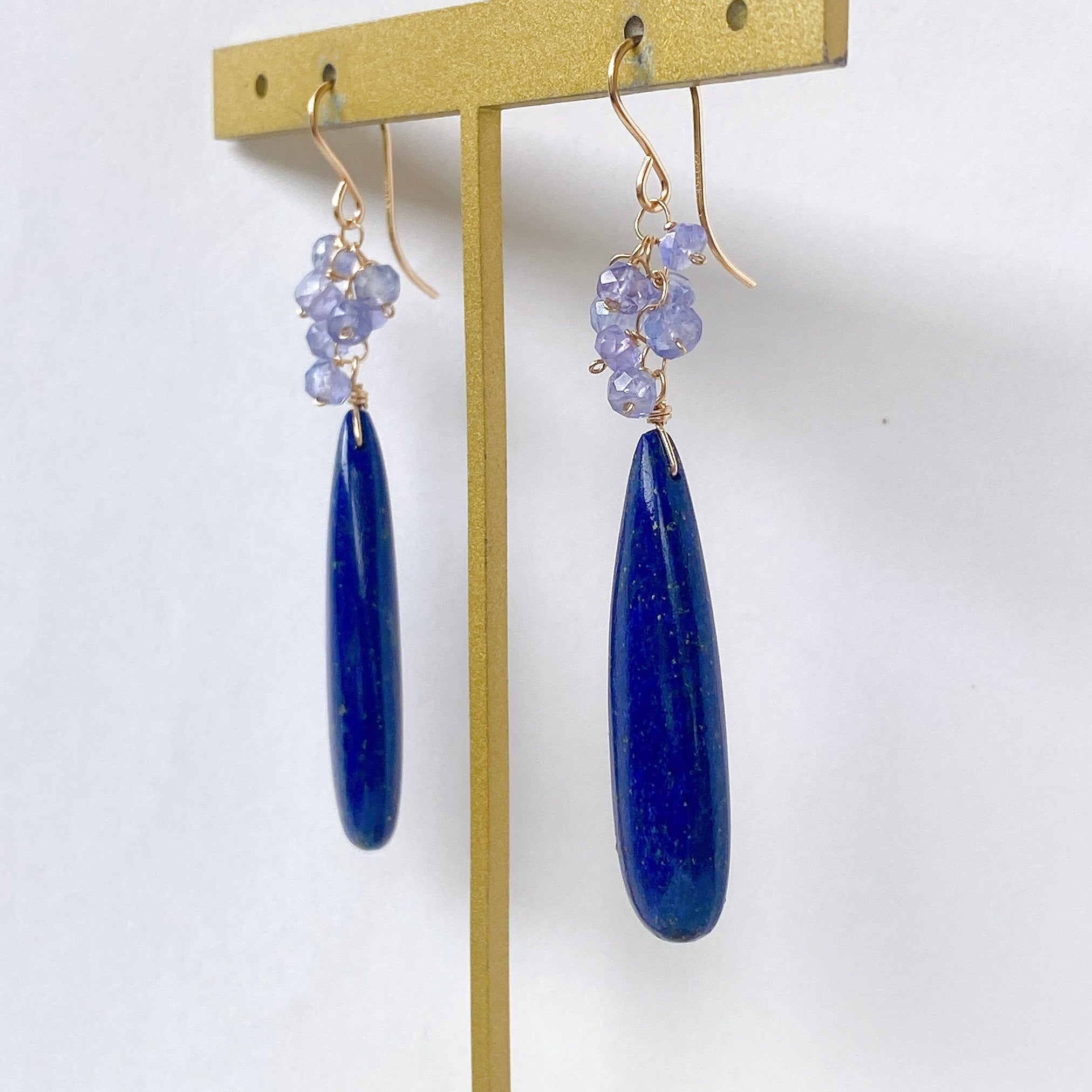 ロングペアシェイプカットのラピスラズリとボタンカットのタンザナイトを使ってデザインした耳飾りです。