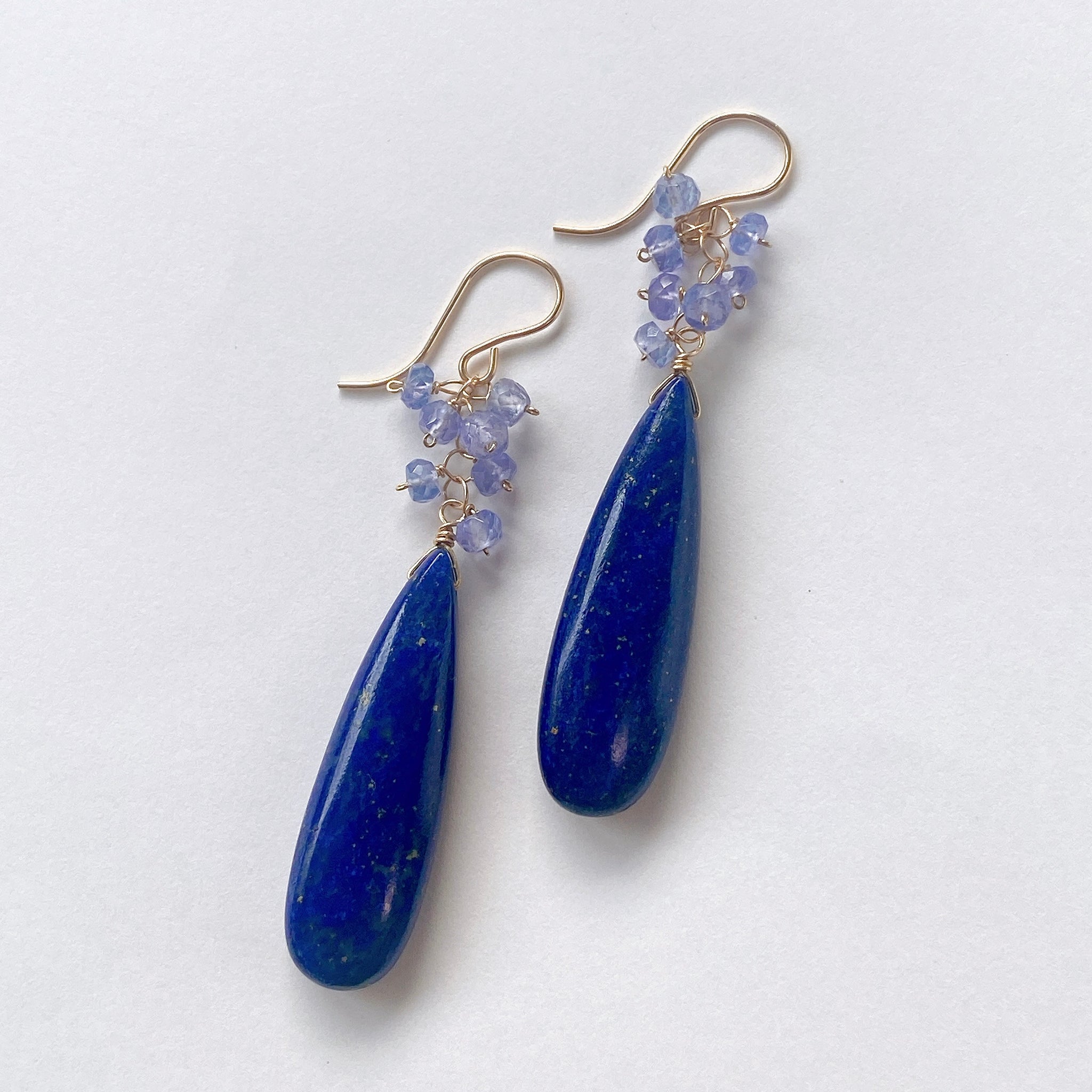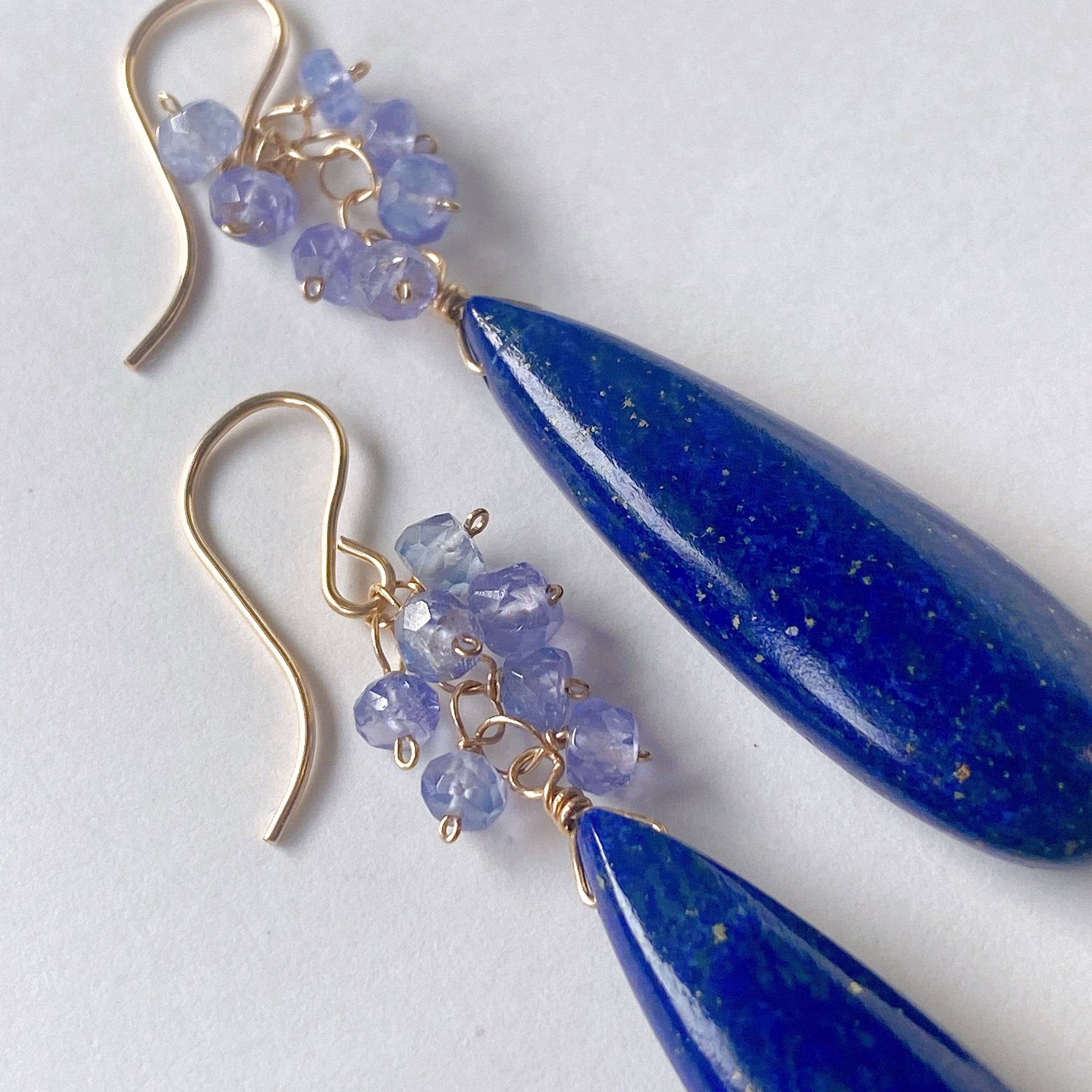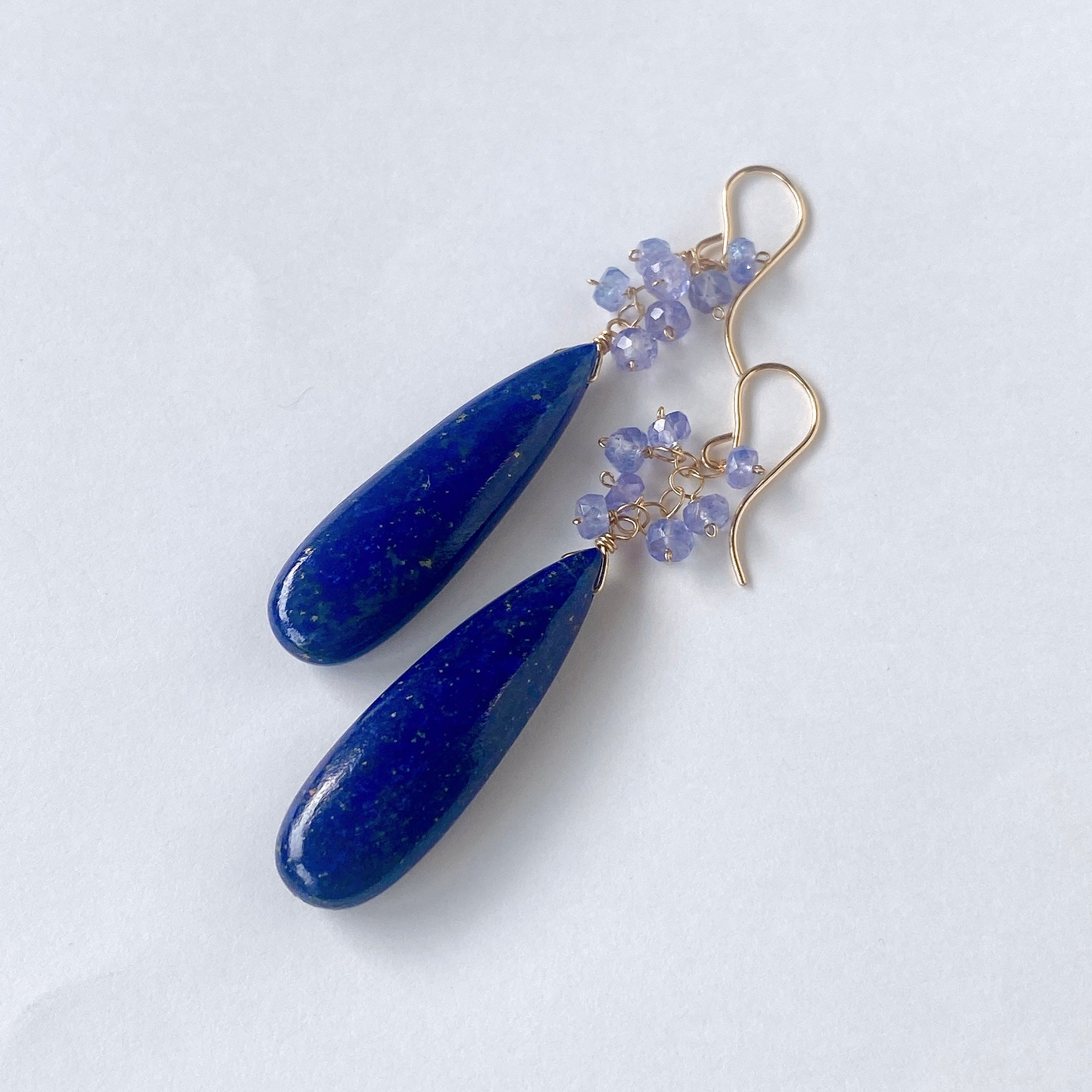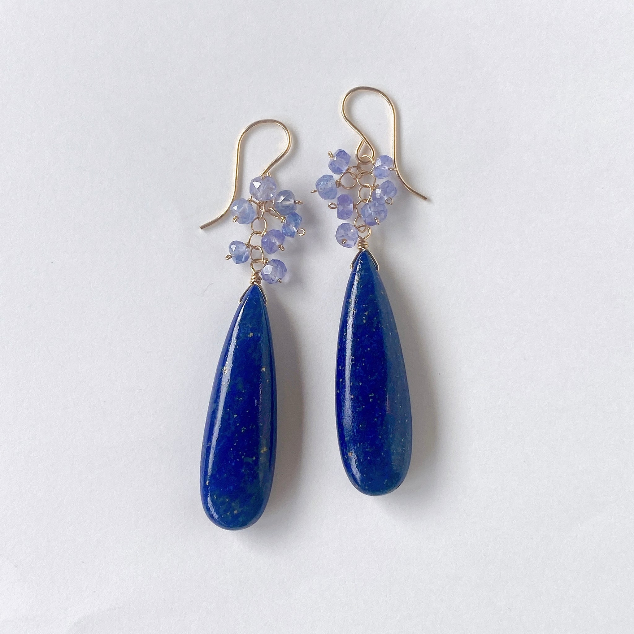ロングペアシェイプカットのラピスラズリとボタンカットのタンザナイトを使ってデザインした耳飾りです。