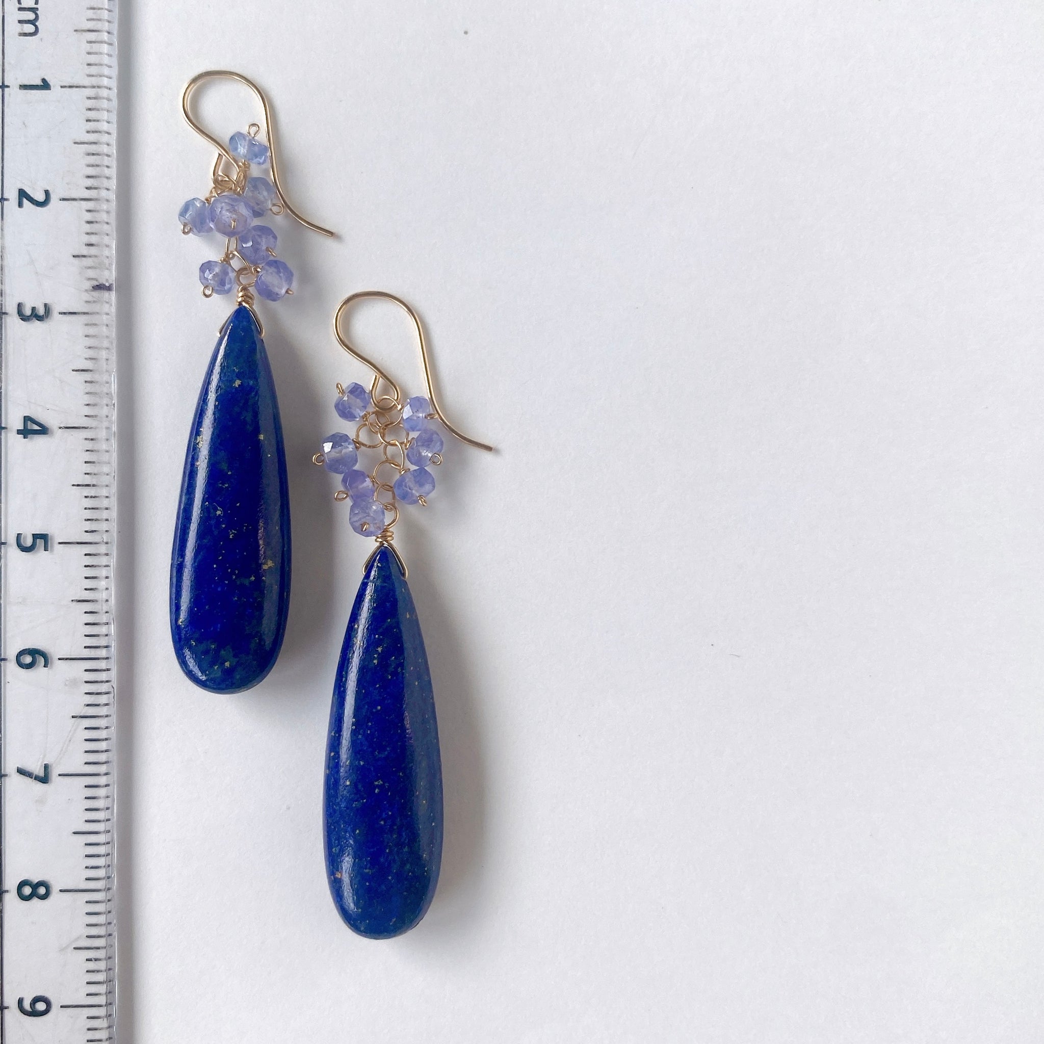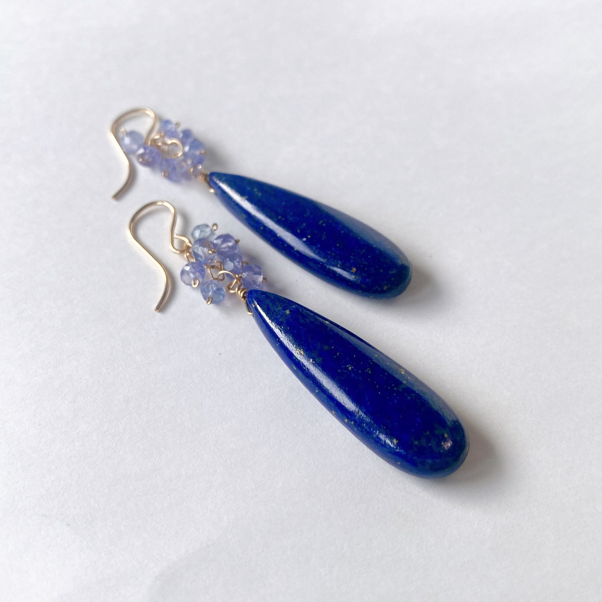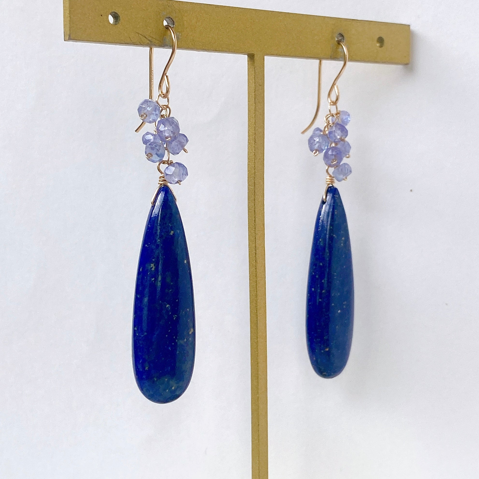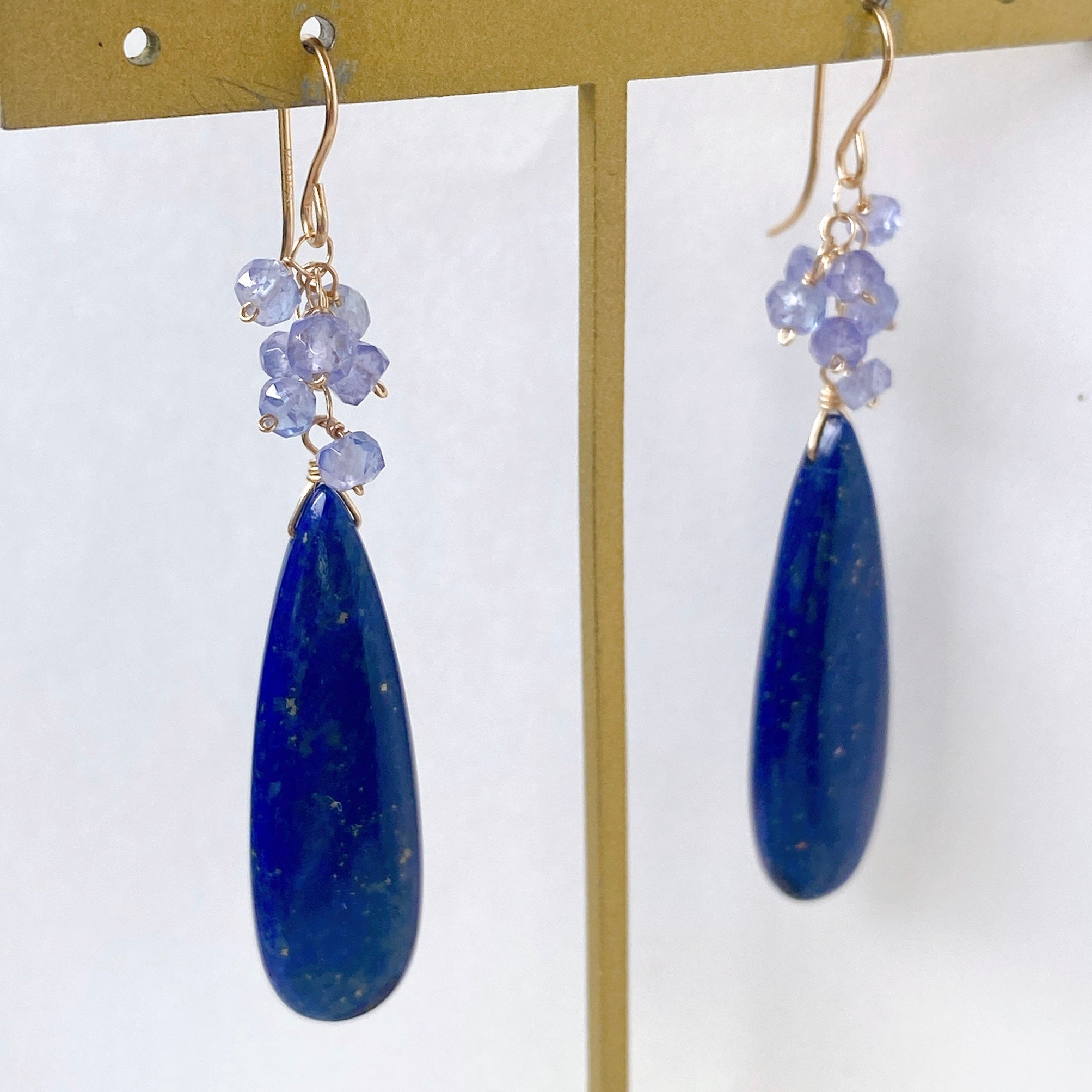 ロングペアシェイプカットのラピスラズリとボタンカットのタンザナイトを使ってデザインした耳飾りです。
