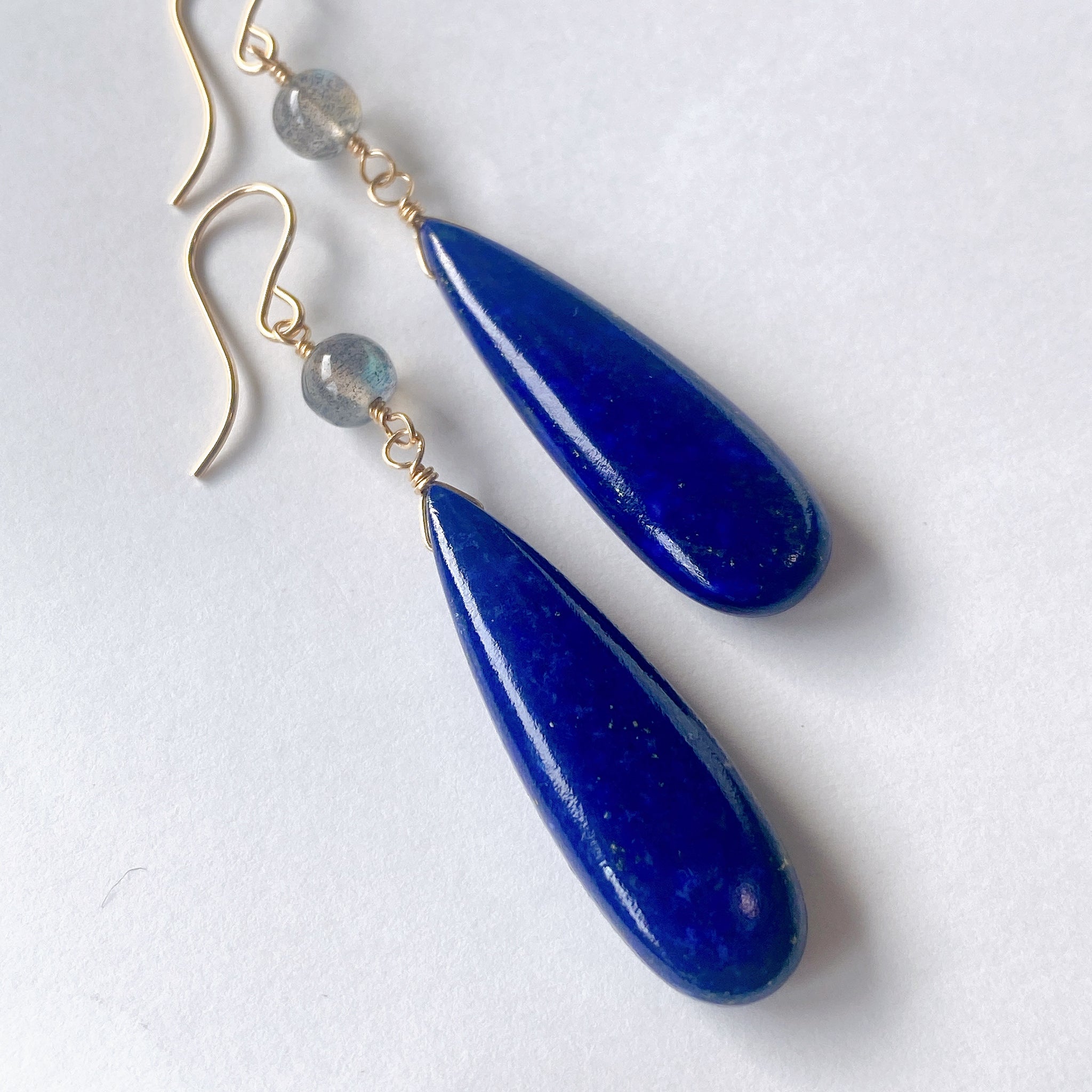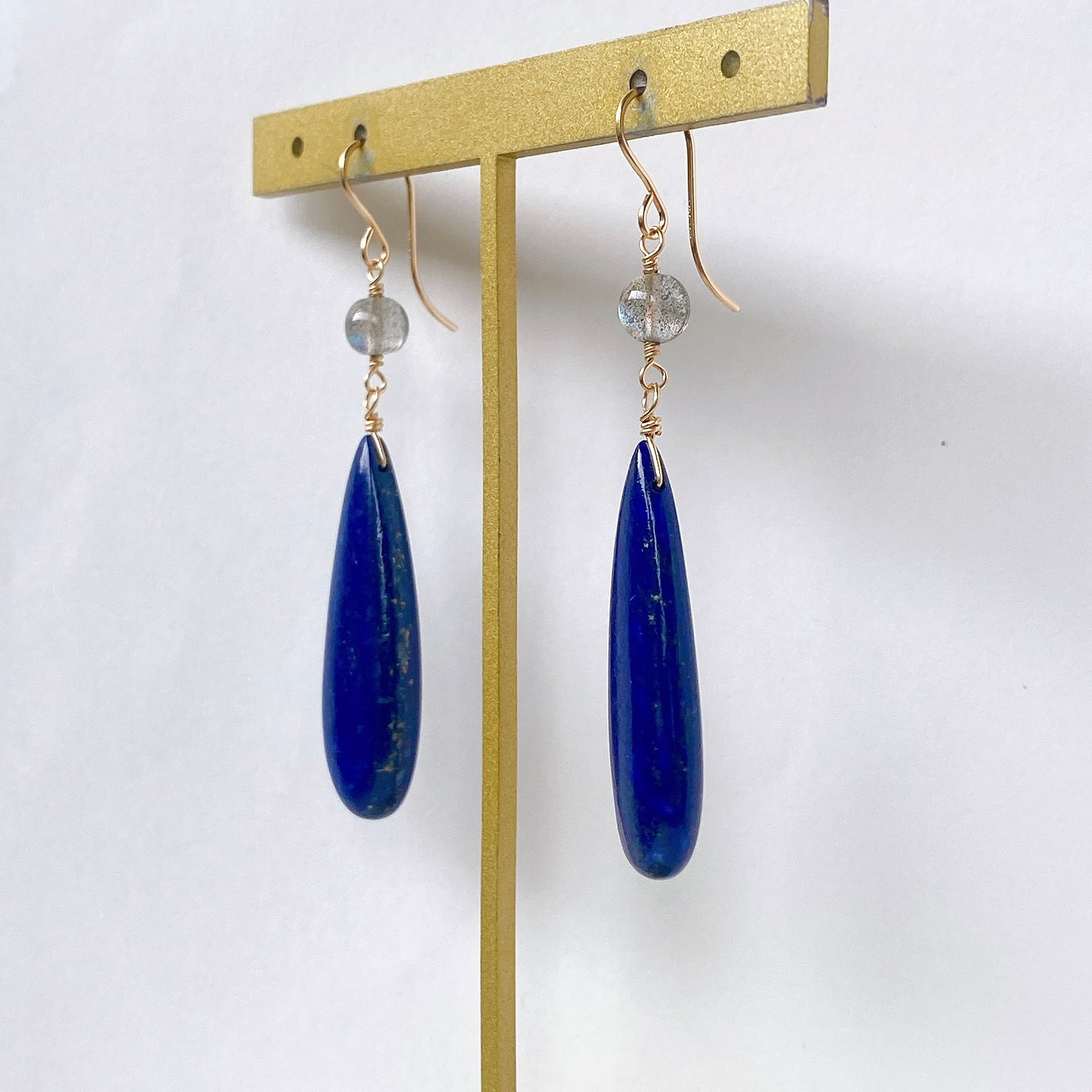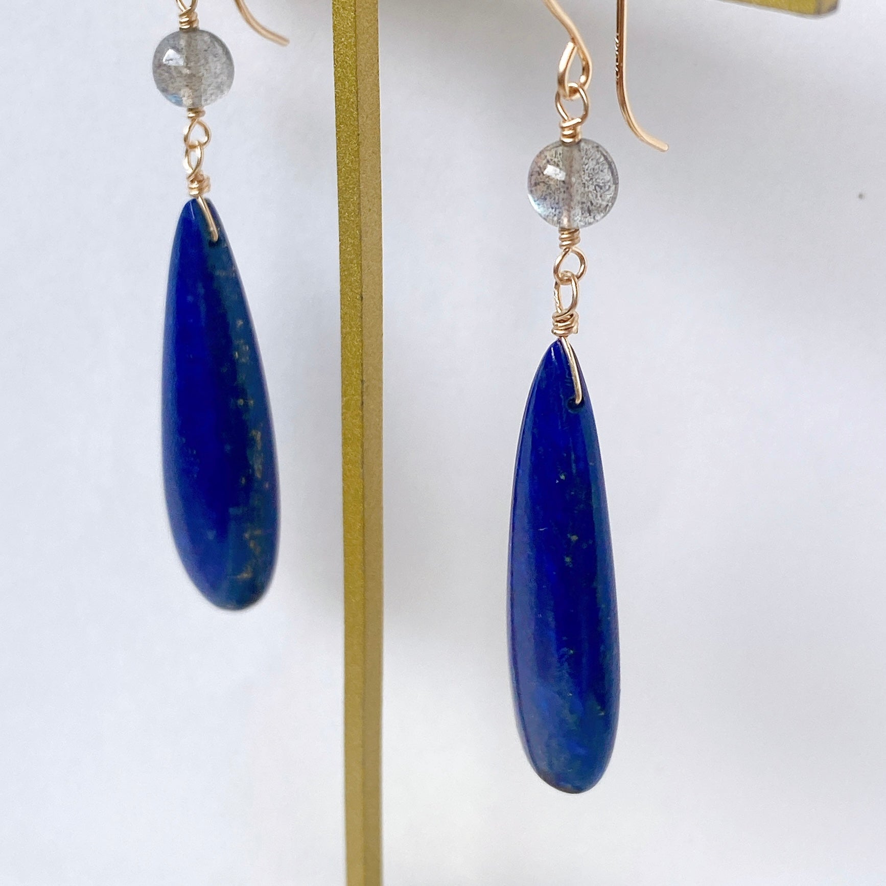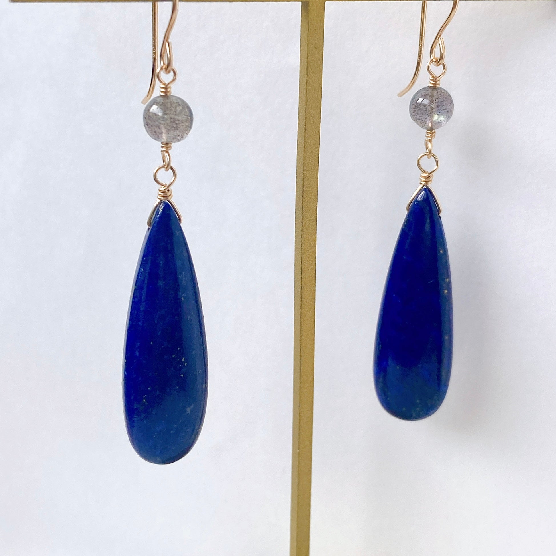 ロングペアシェイプカットのラピスラズリとラウンドのラブラドライトを使ってデザインした耳飾りです。