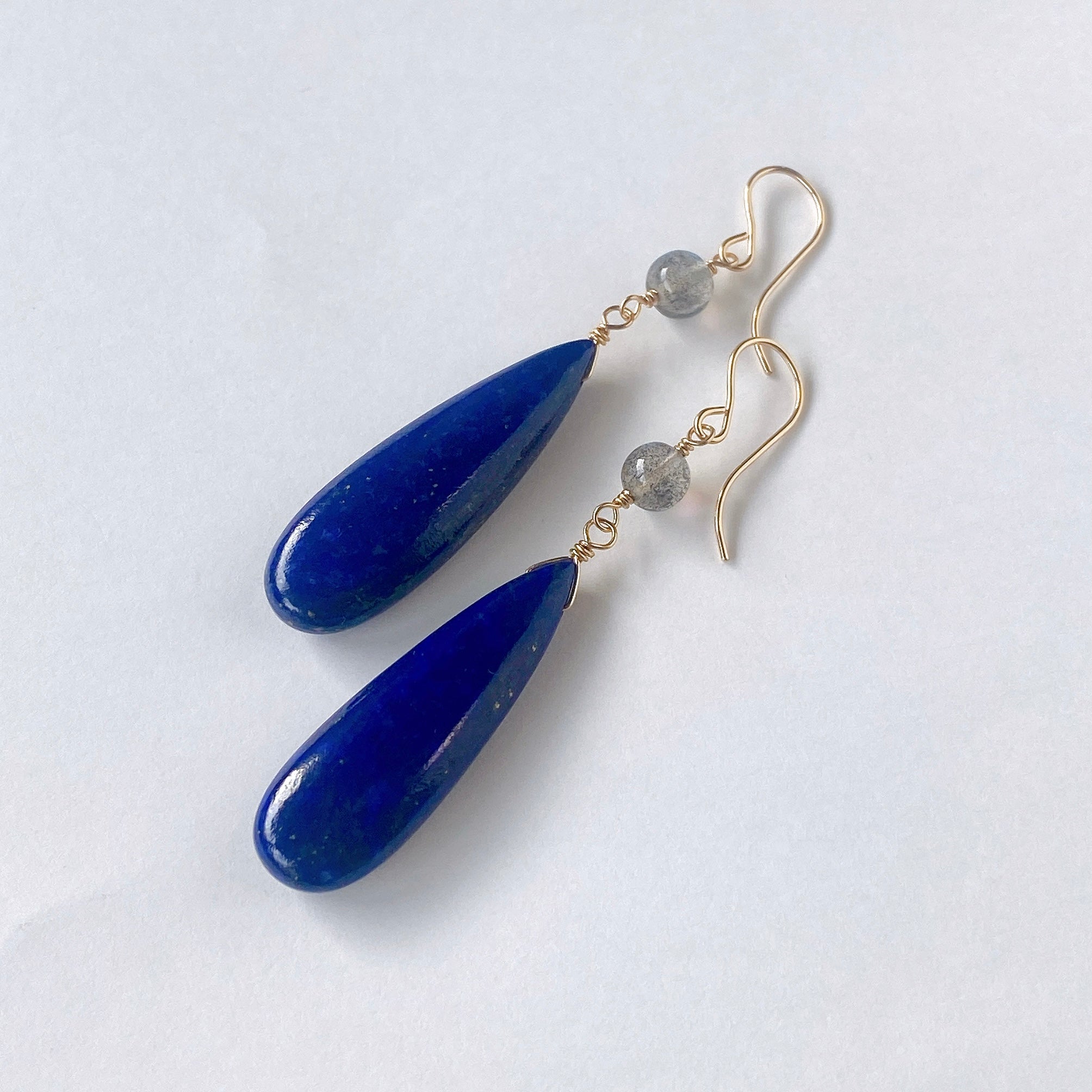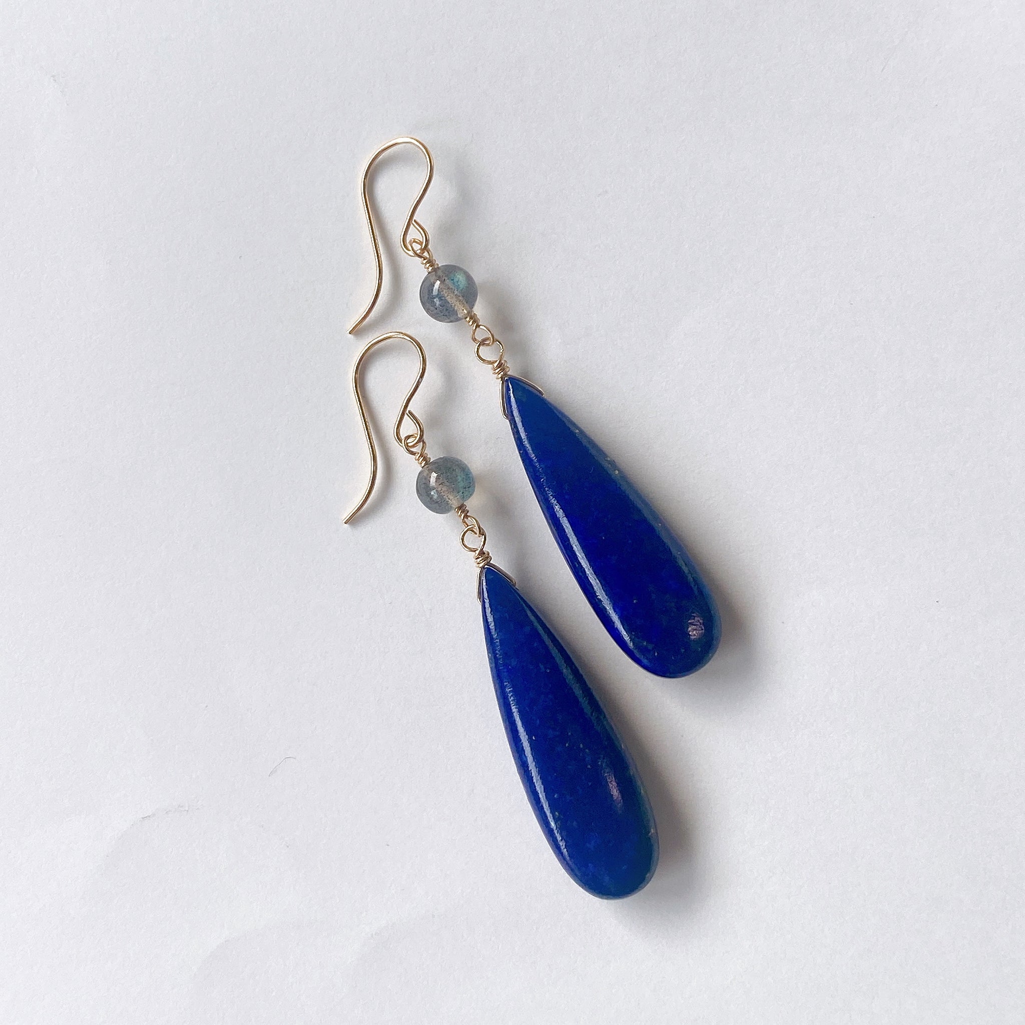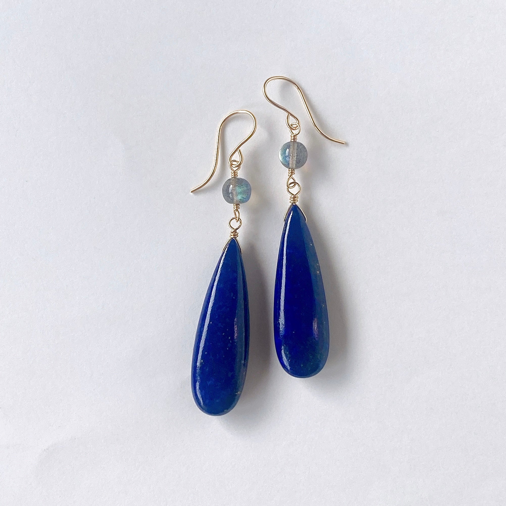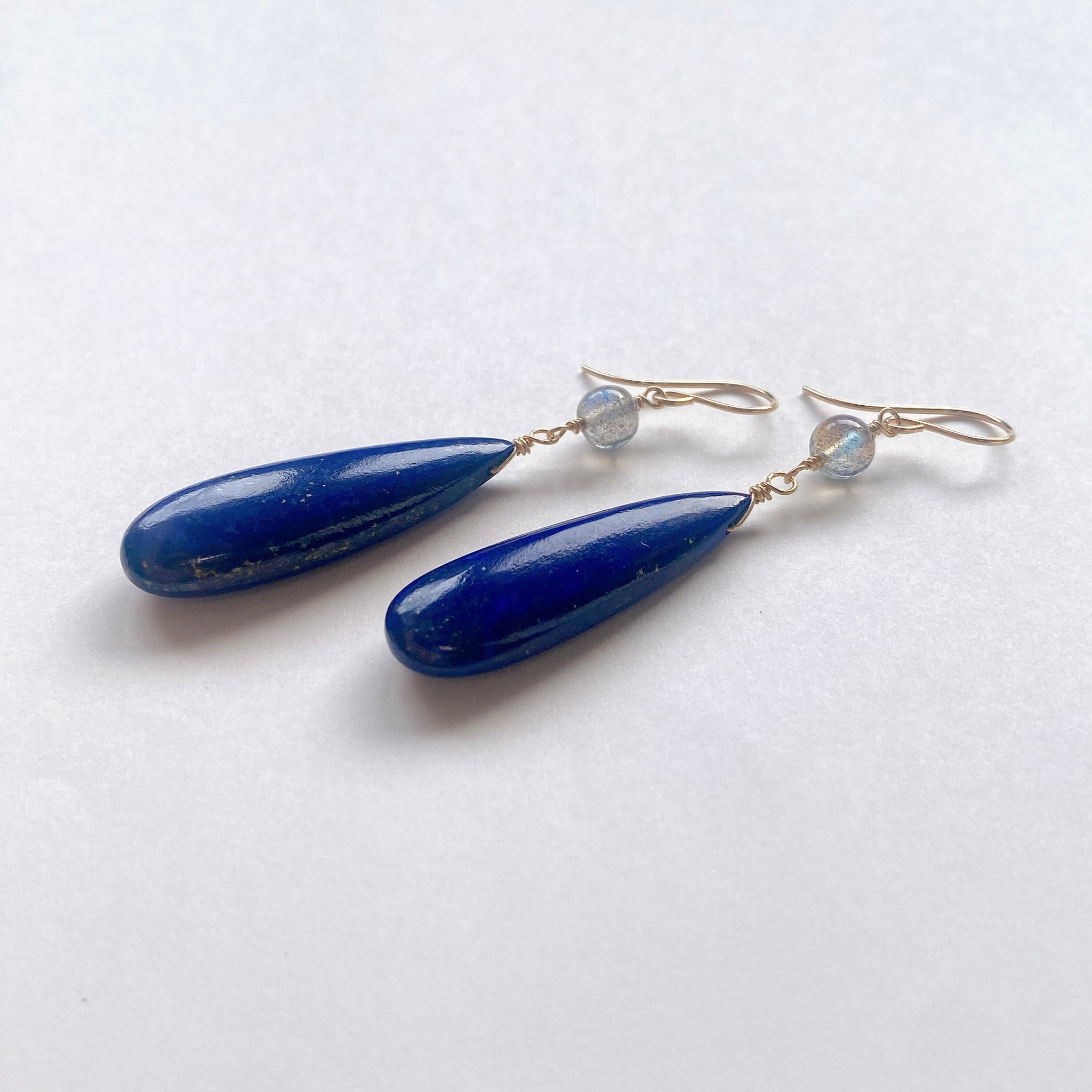 ロングペアシェイプカットのラピスラズリとラウンドのラブラドライトを使ってデザインした耳飾りです。