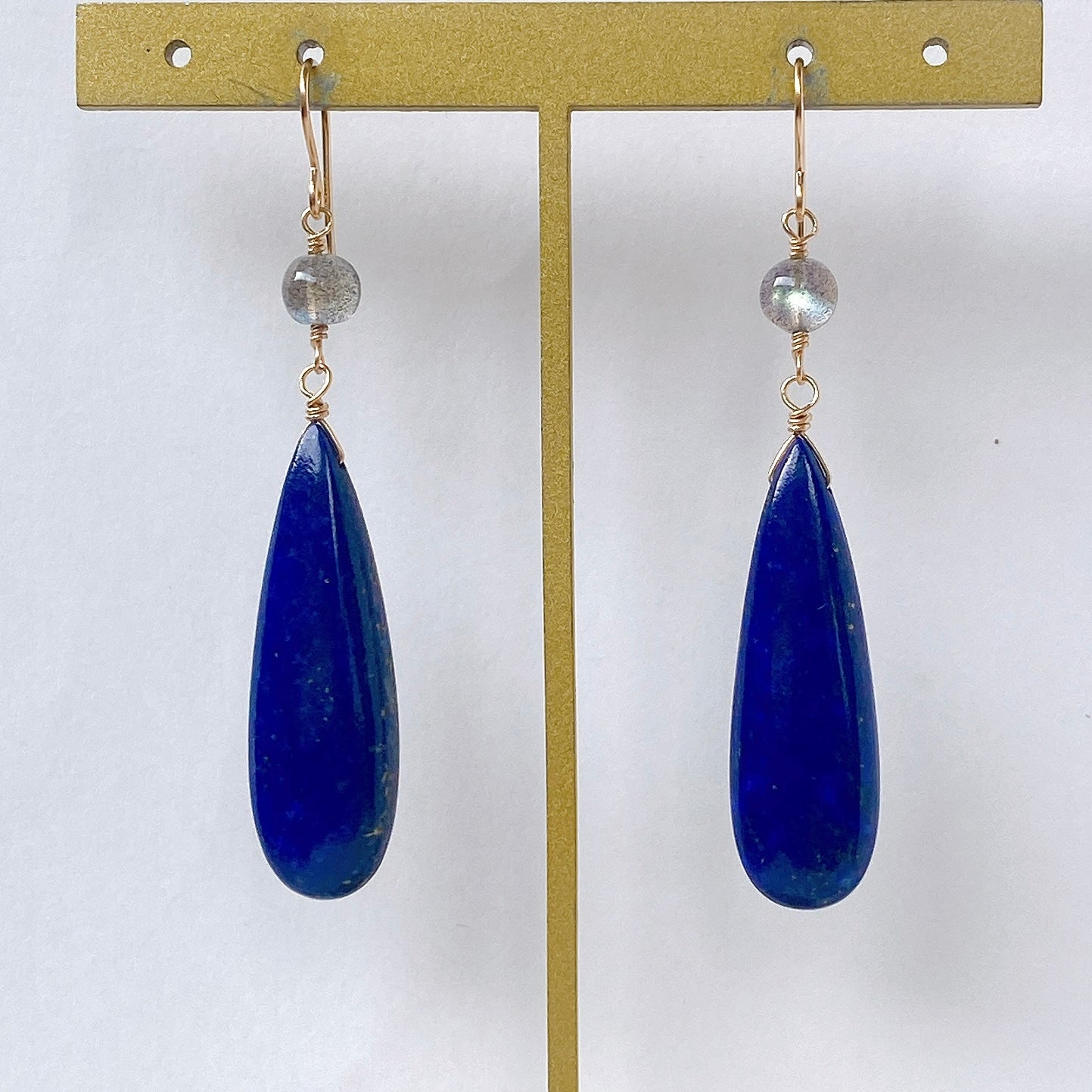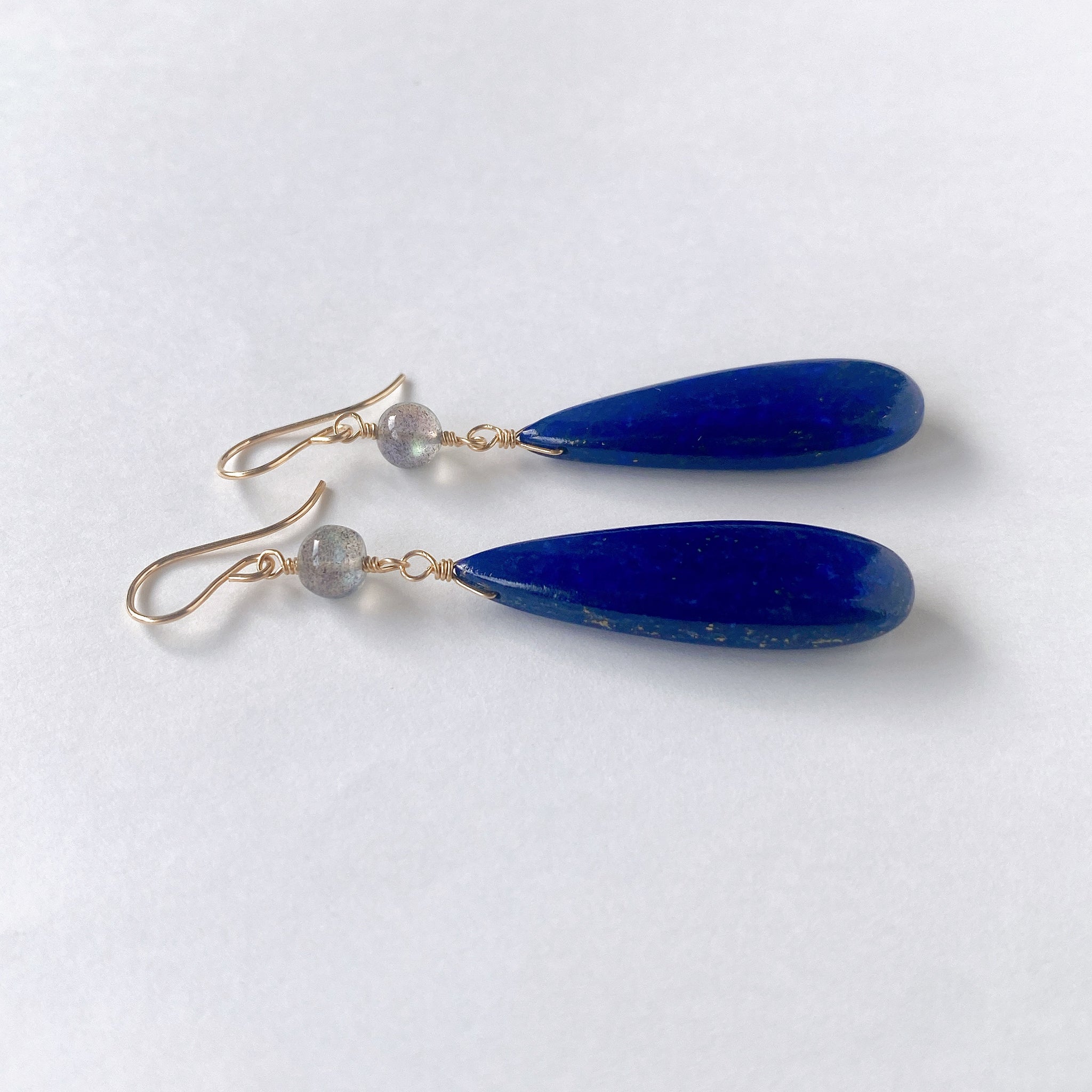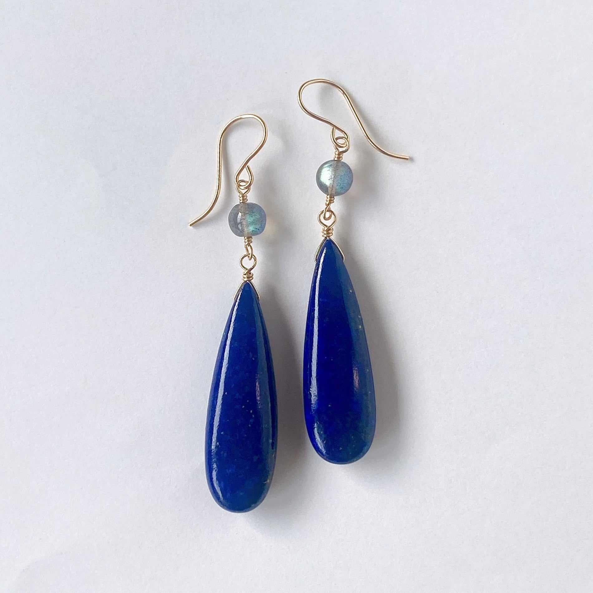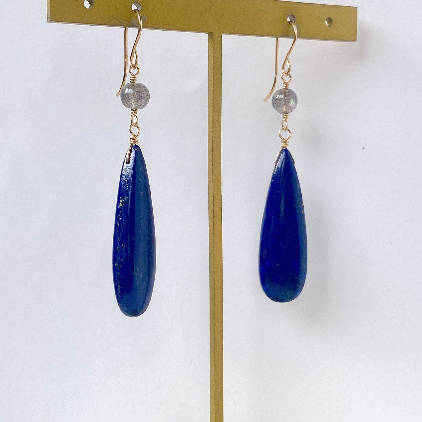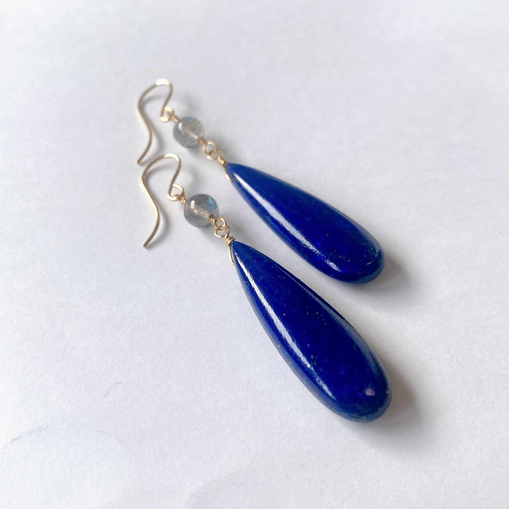 ロングペアシェイプカットのラピスラズリとラウンドのラブラドライトを使ってデザインした耳飾りです。
