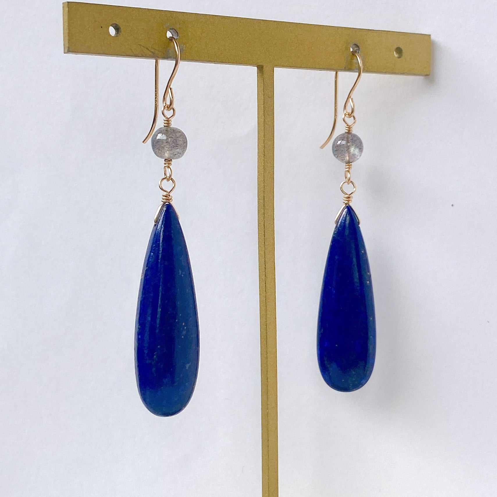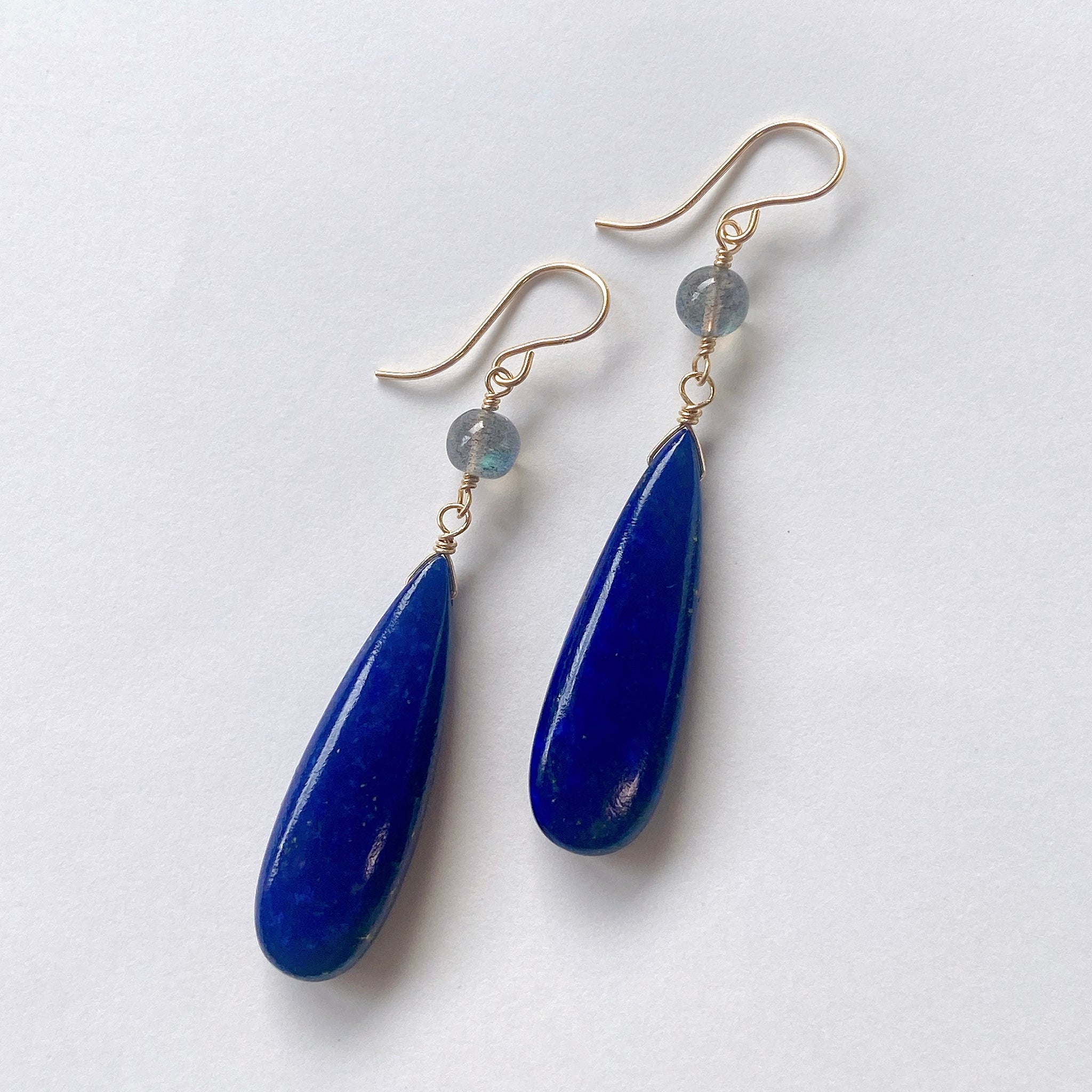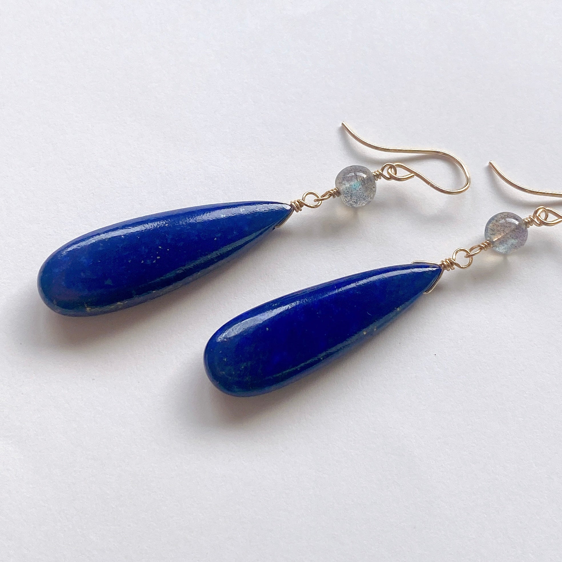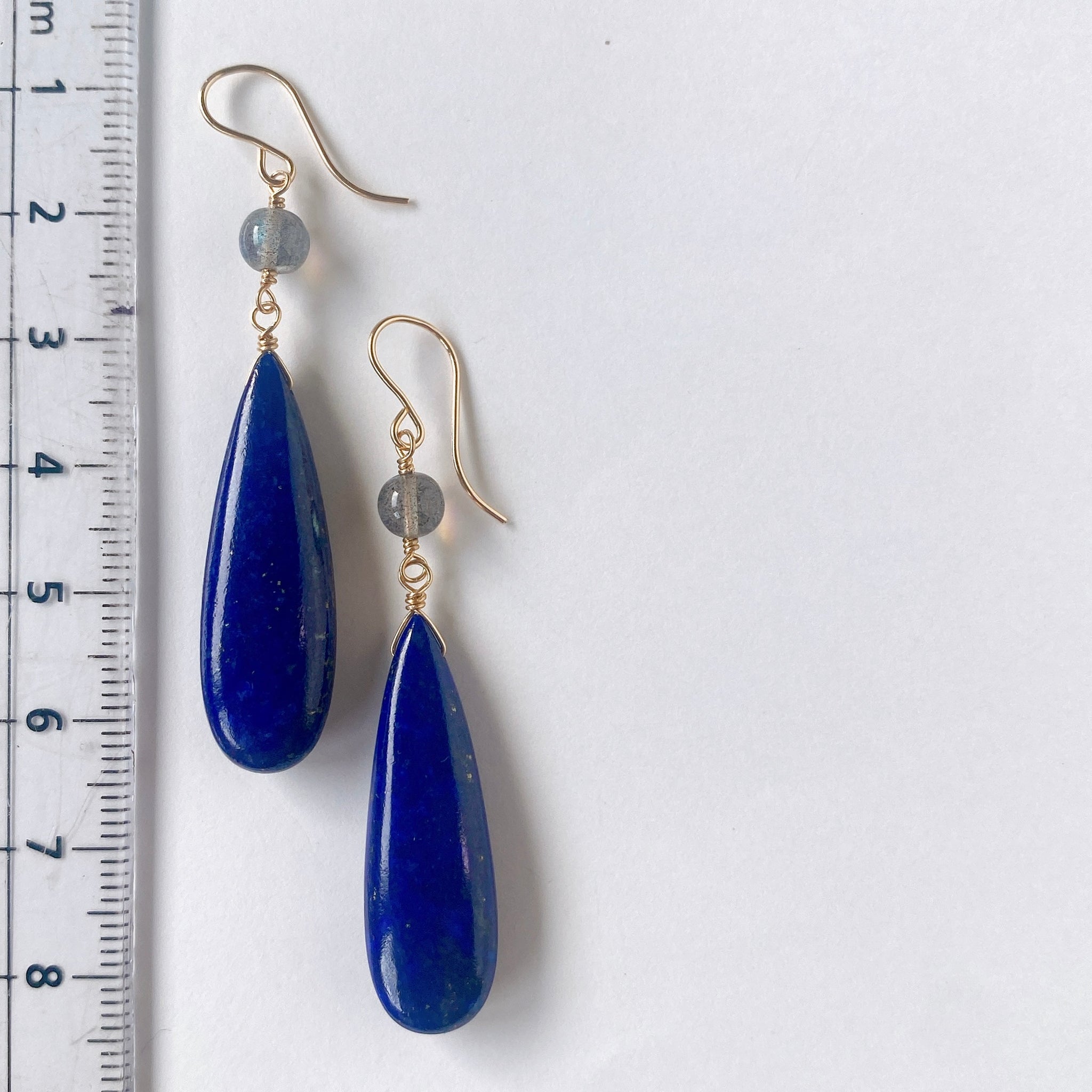 ロングペアシェイプカットのラピスラズリとラウンドのラブラドライトを使ってデザインした耳飾りです。