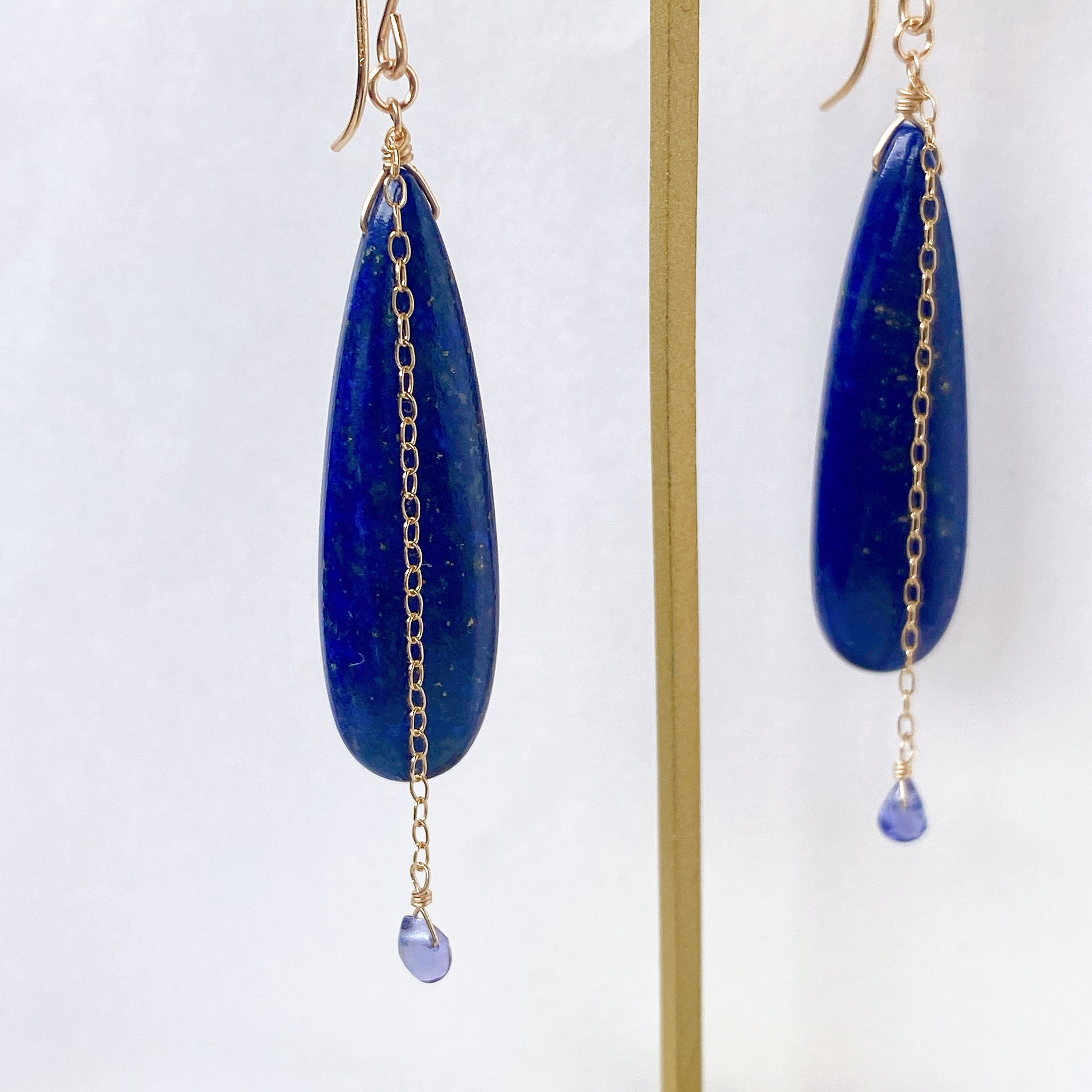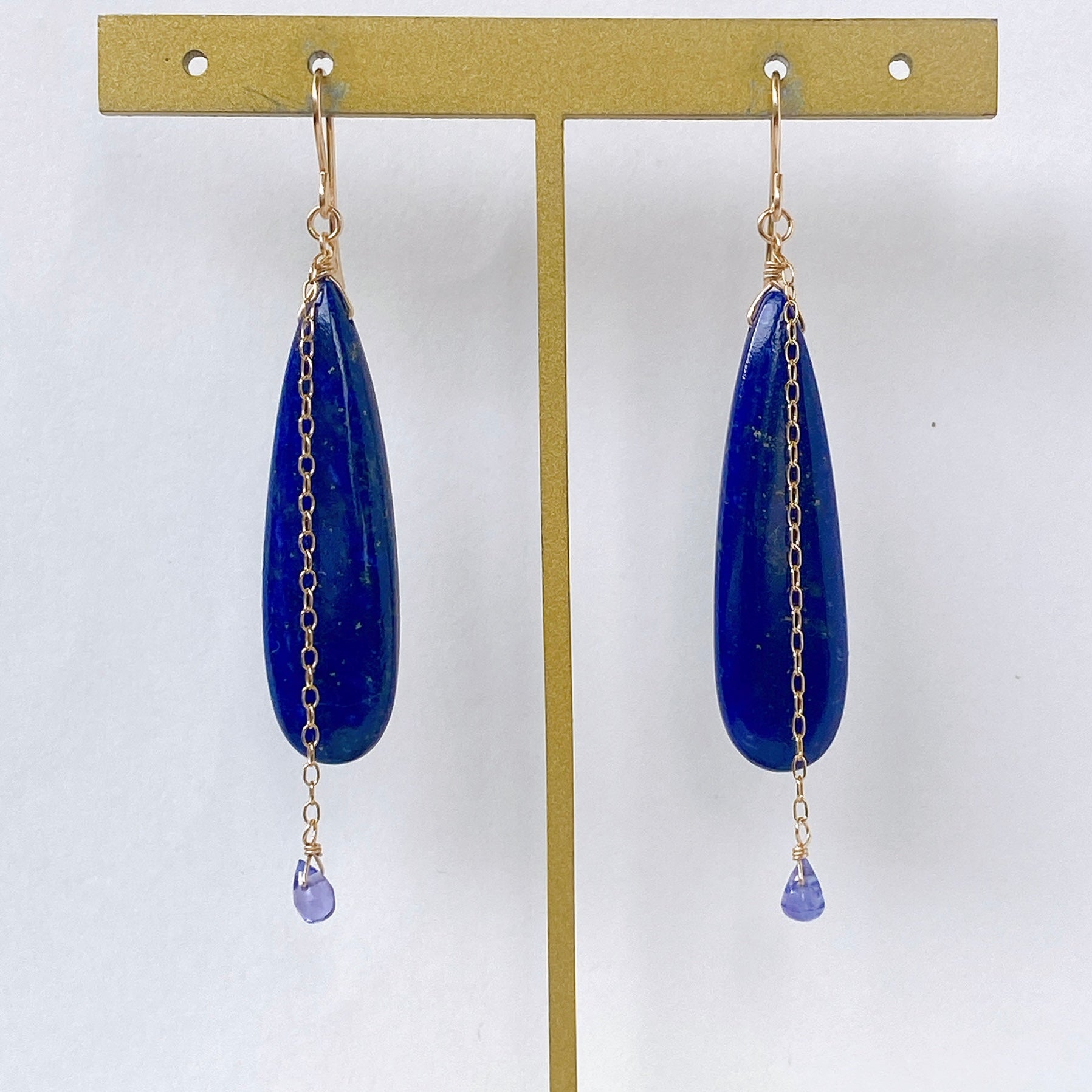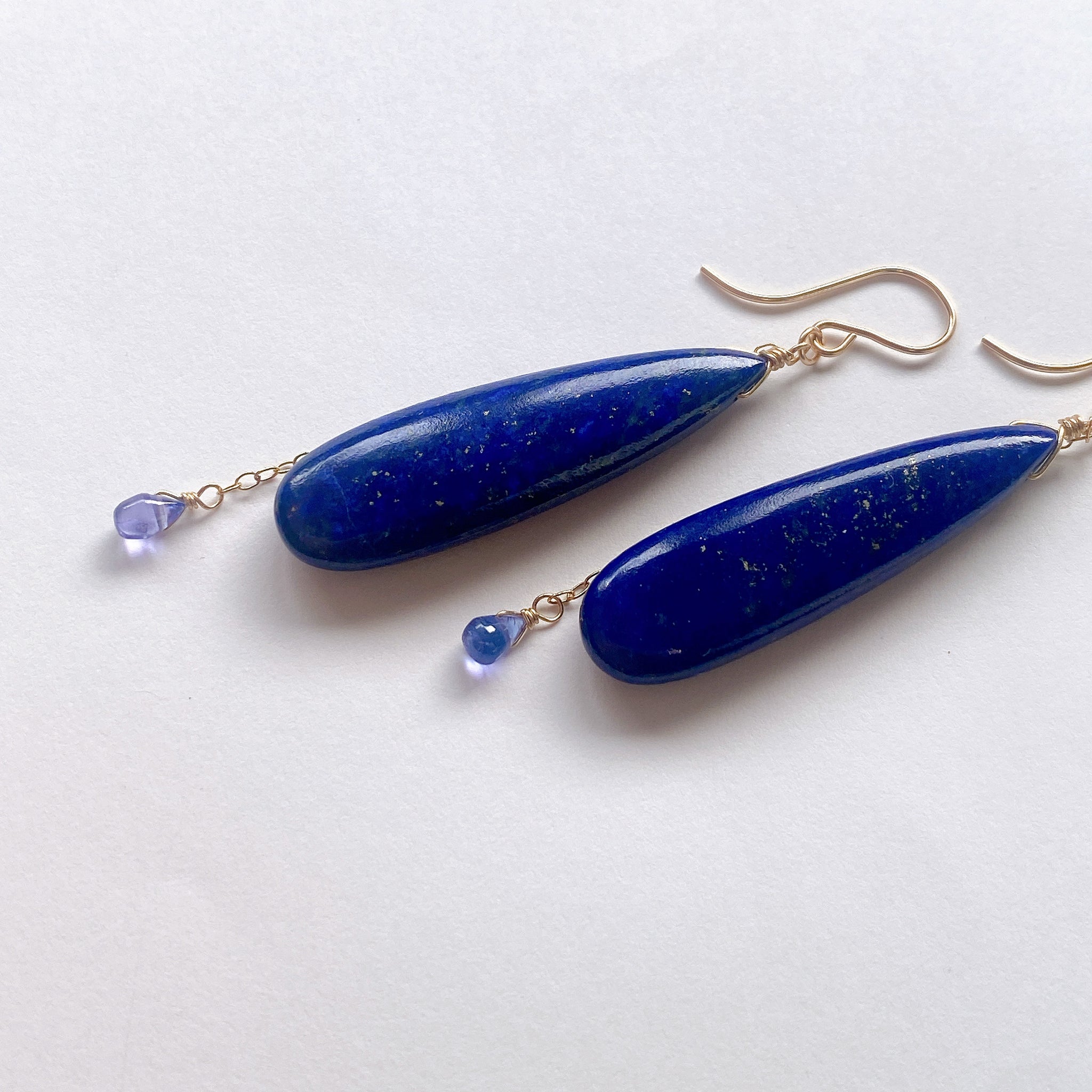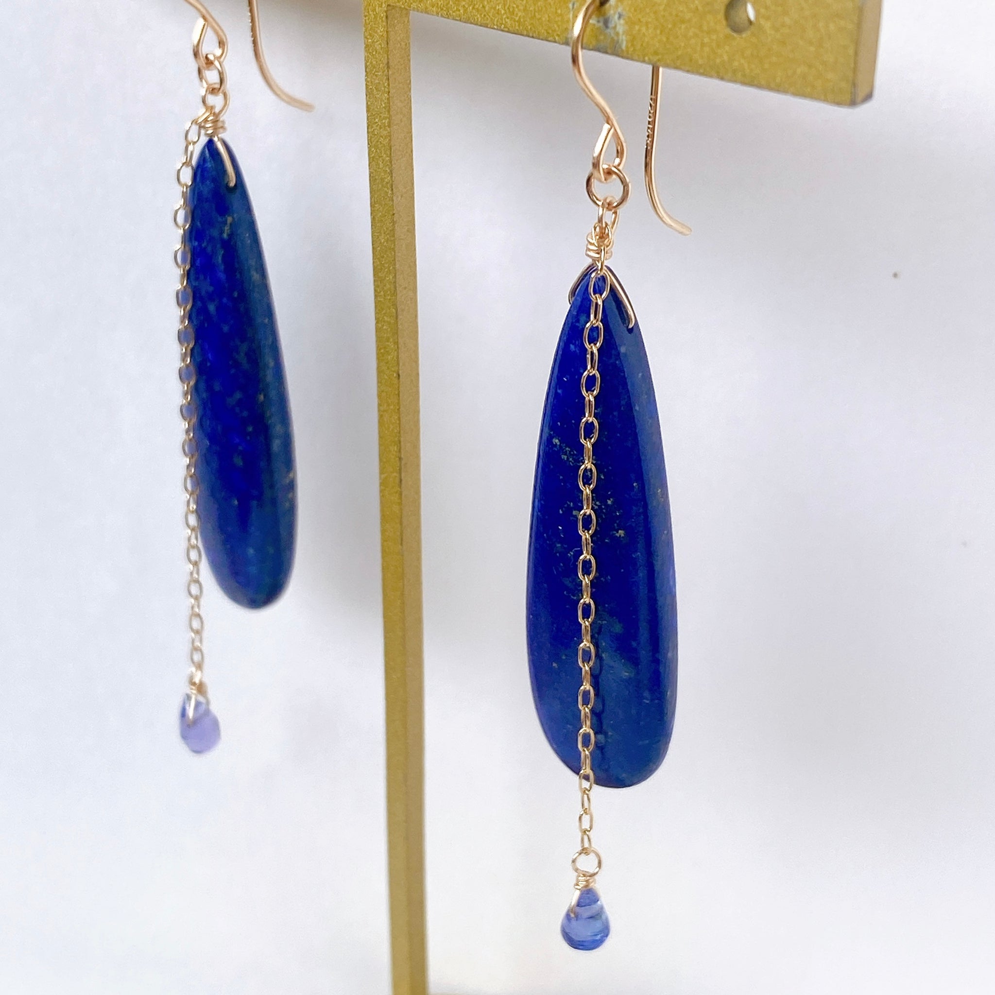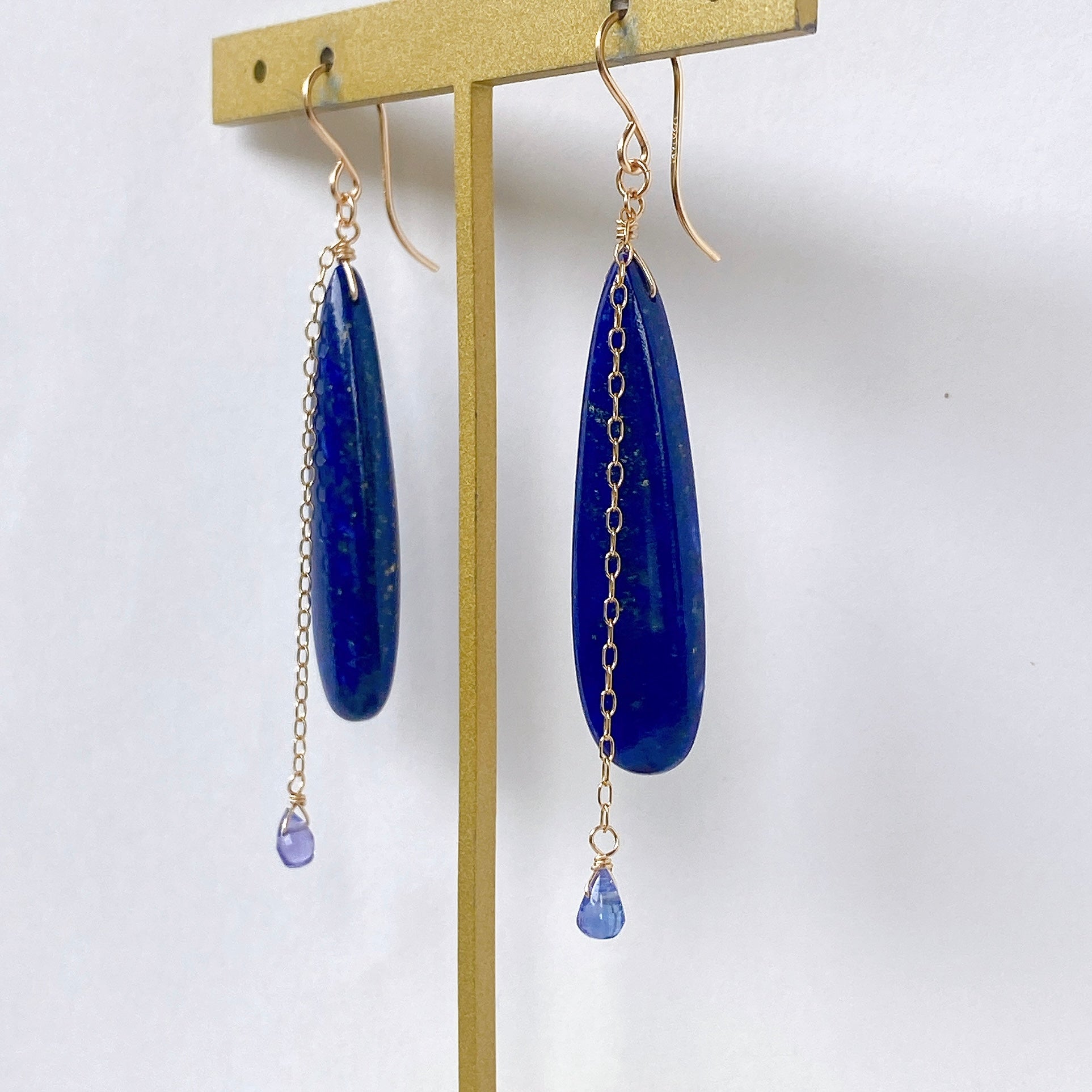 ロングペアシェイプカットのラピスラズリとつるんとしたドロップカットのタンザナイトを使ってデザインした耳飾りです。