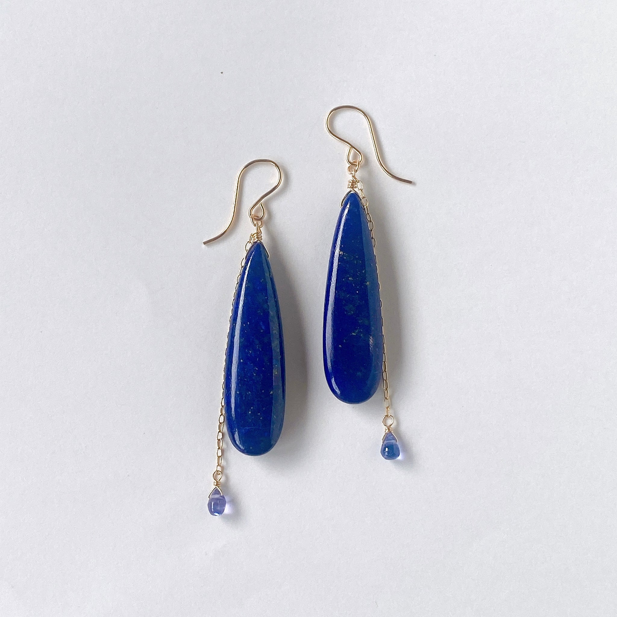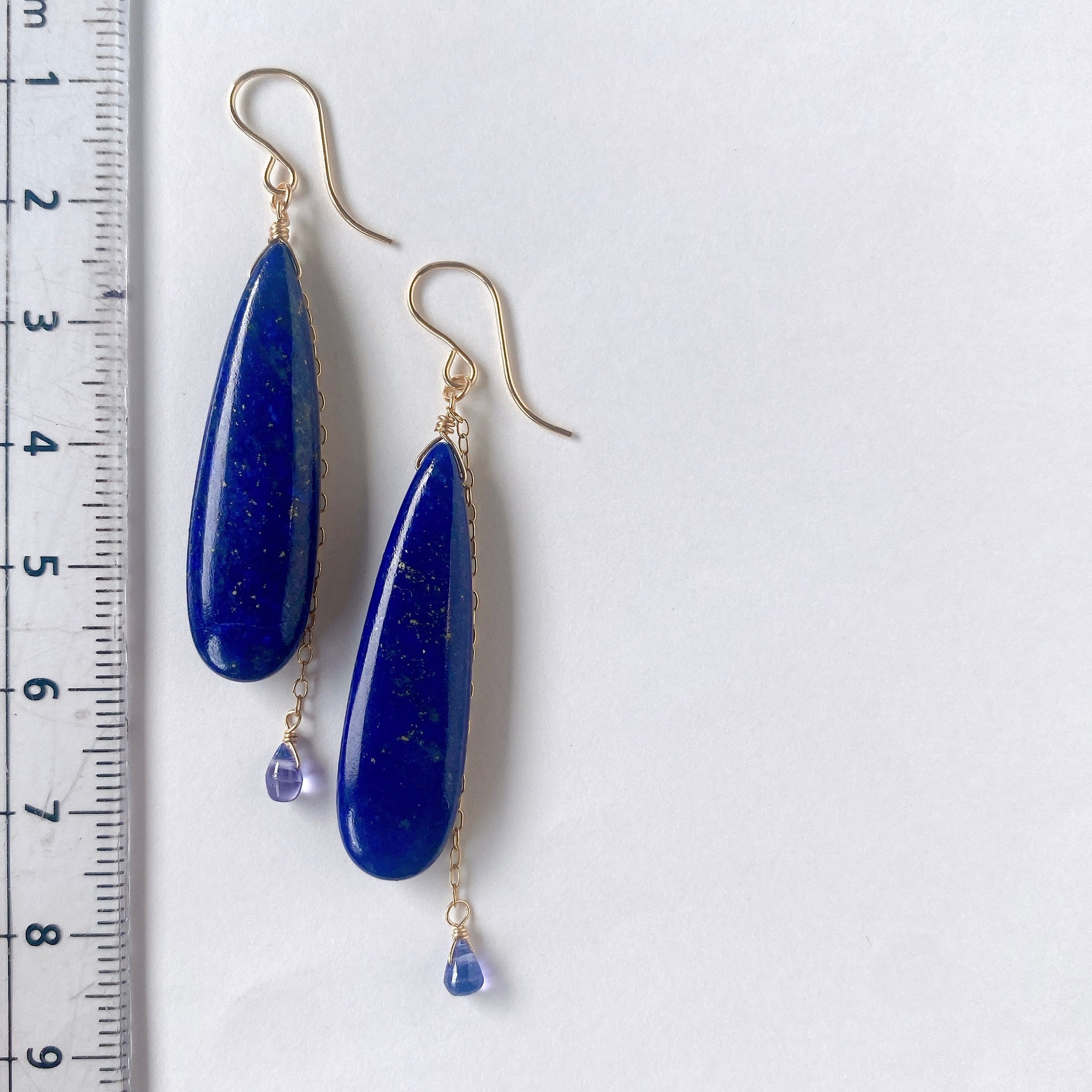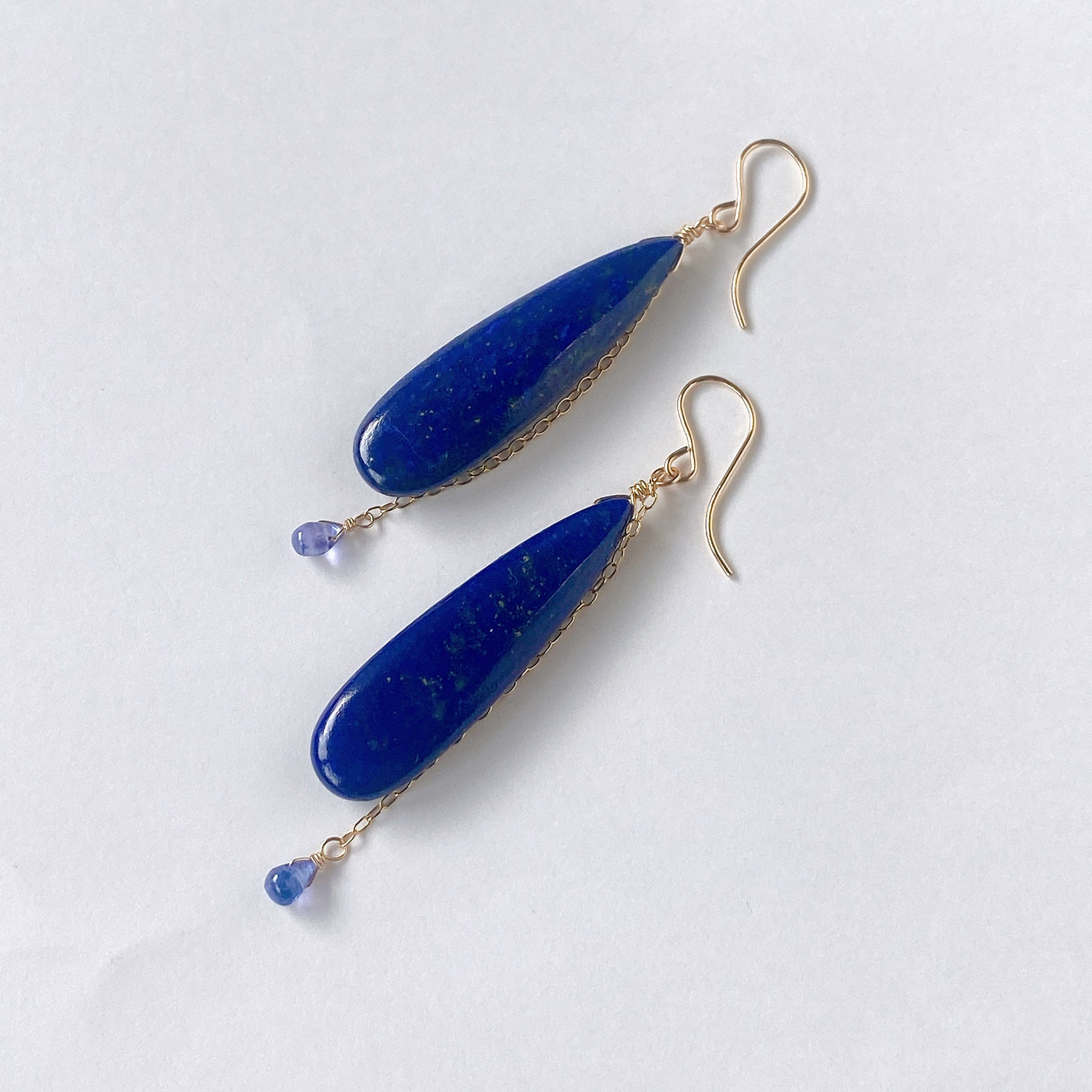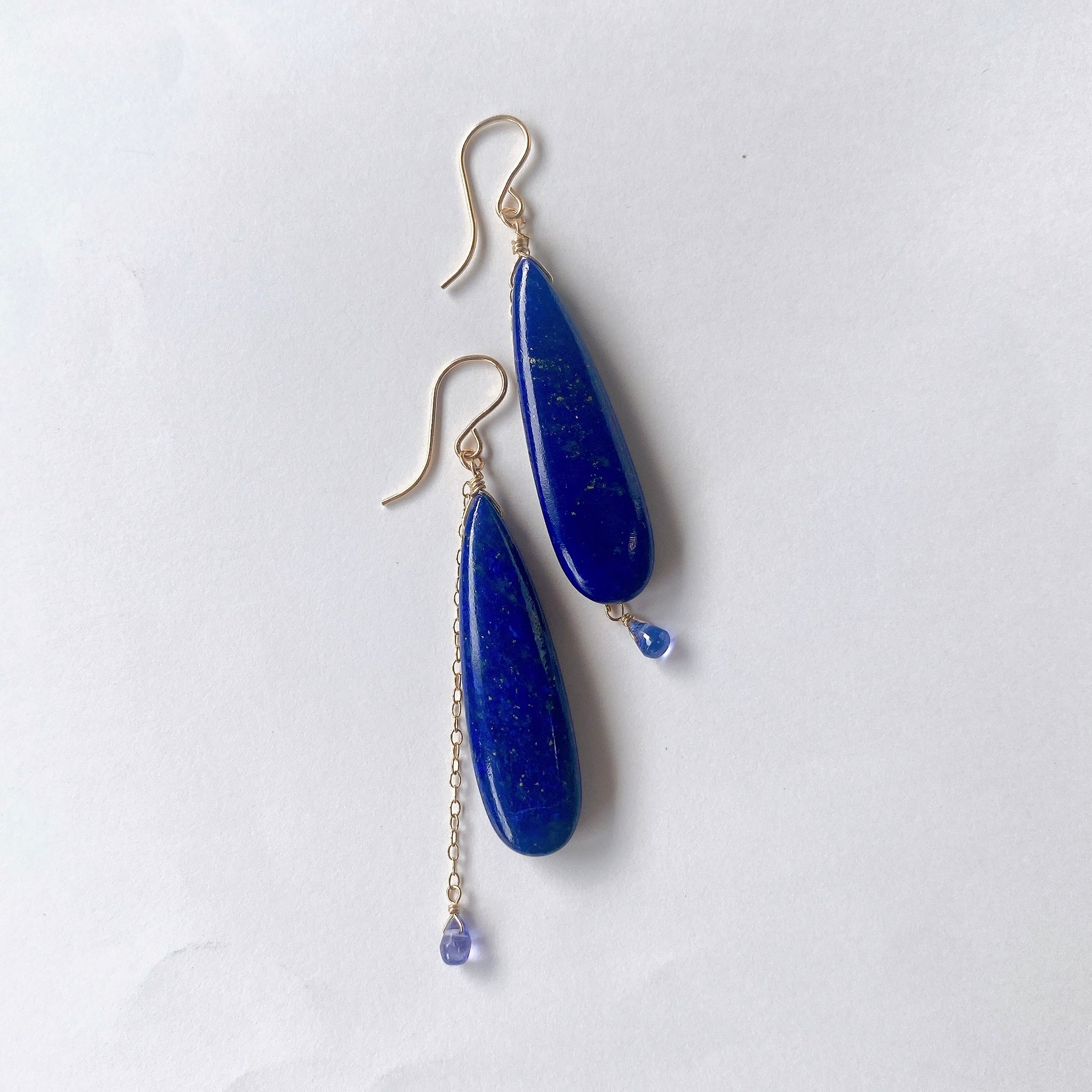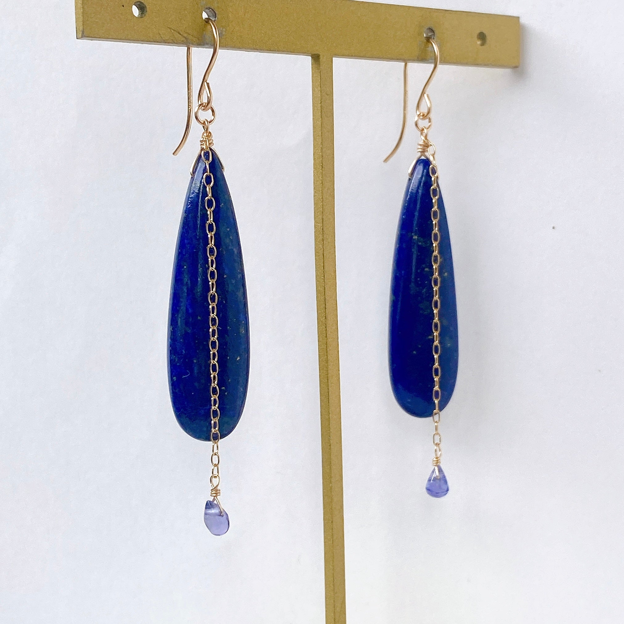 ロングペアシェイプカットのラピスラズリとつるんとしたドロップカットのタンザナイトを使ってデザインした耳飾りです。