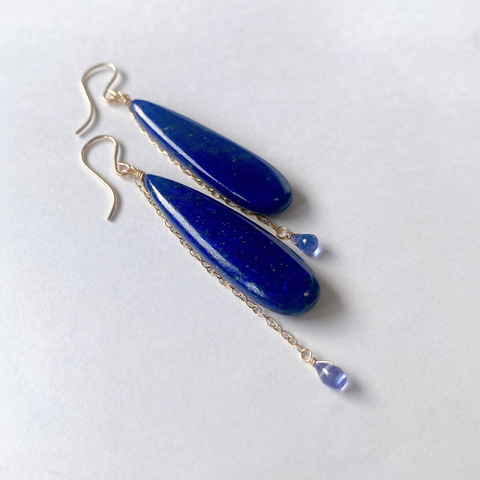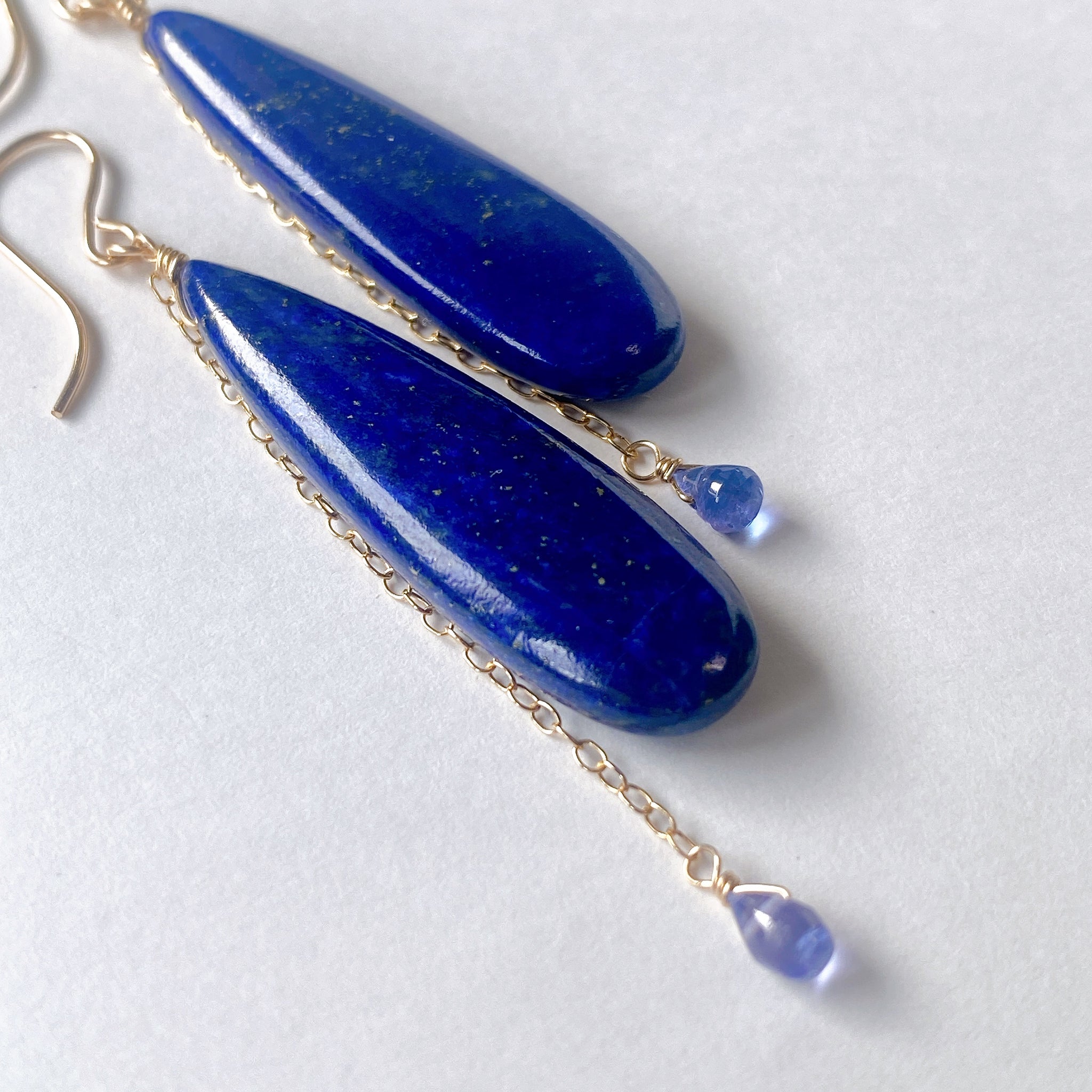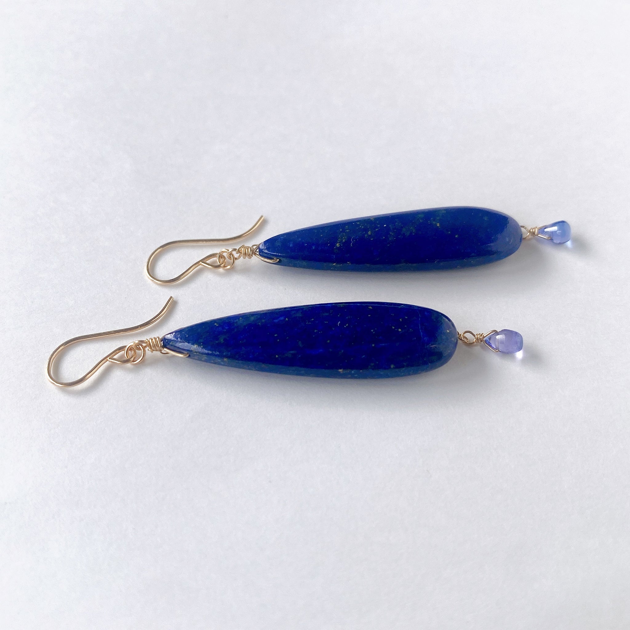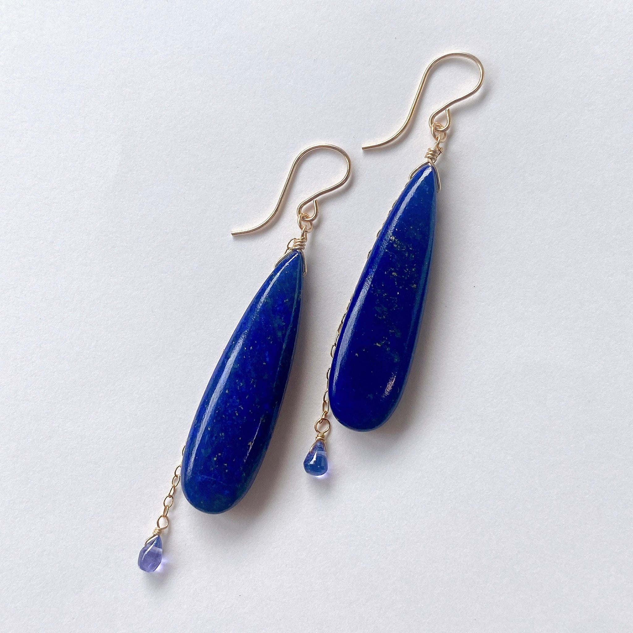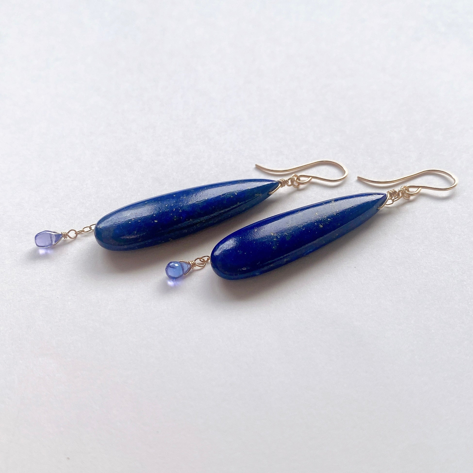 ロングペアシェイプカットのラピスラズリとつるんとしたドロップカットのタンザナイトを使ってデザインした耳飾りです。