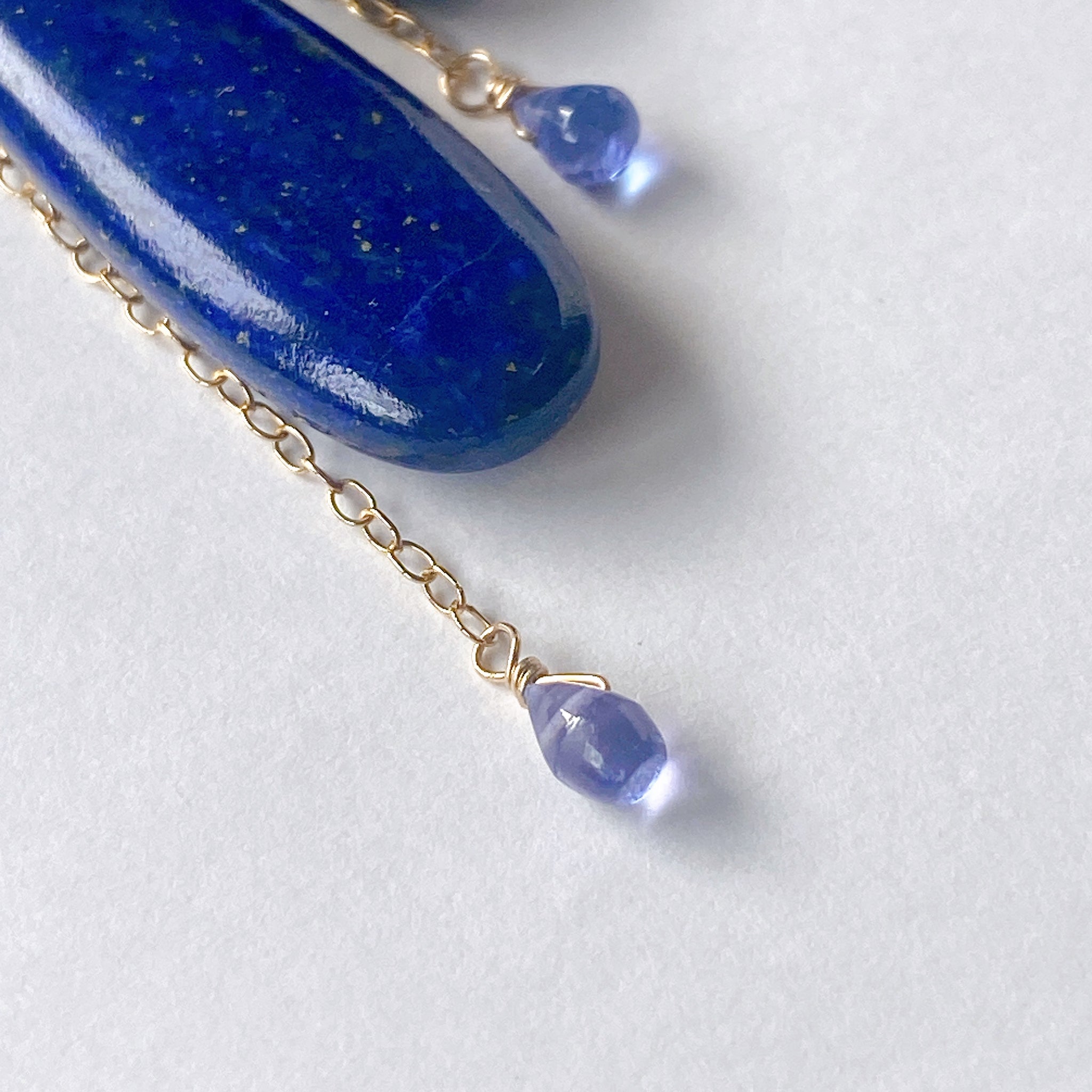大胆なラピスラズリに華奢なチェーンと小さなタンザナイトのドロップが揺れ、繊細な雰囲気も併せ持ったピアスです。